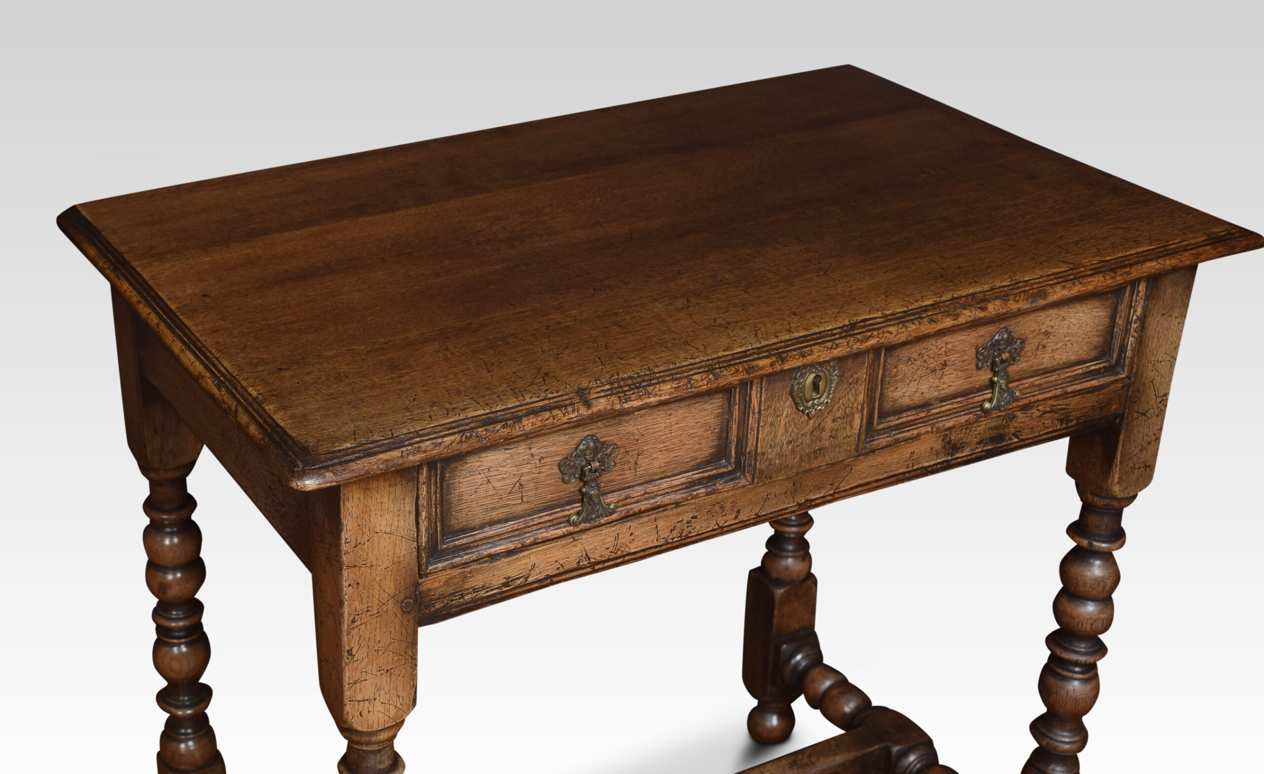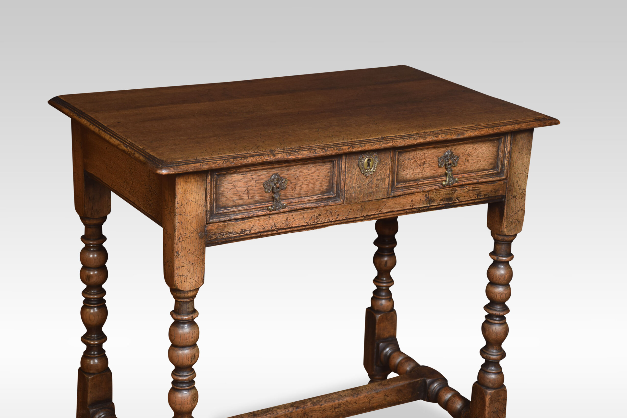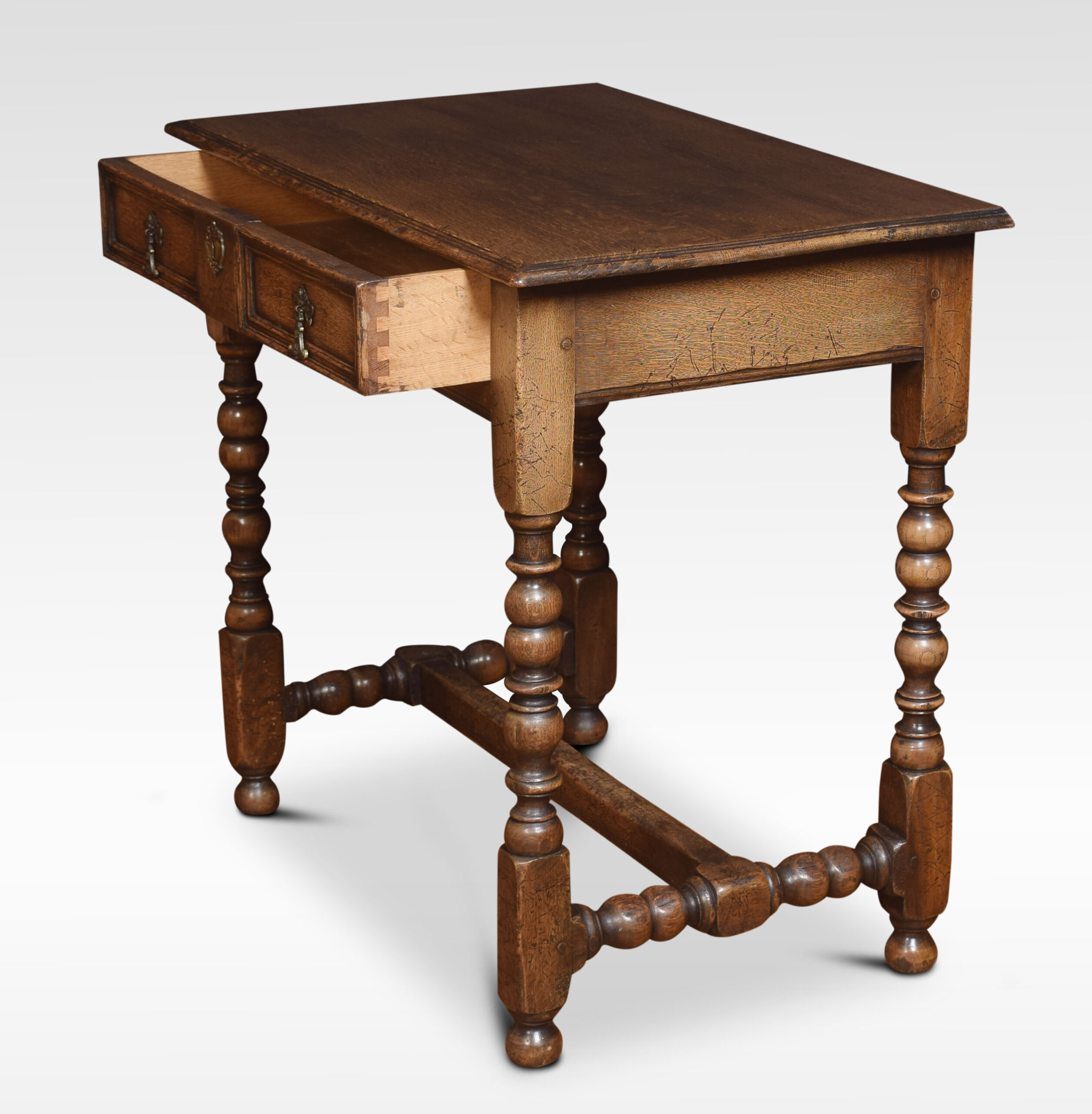 17th Century style side table the rectangular oak top above a single frieze drawer on turned legs joined by an H stretcher.