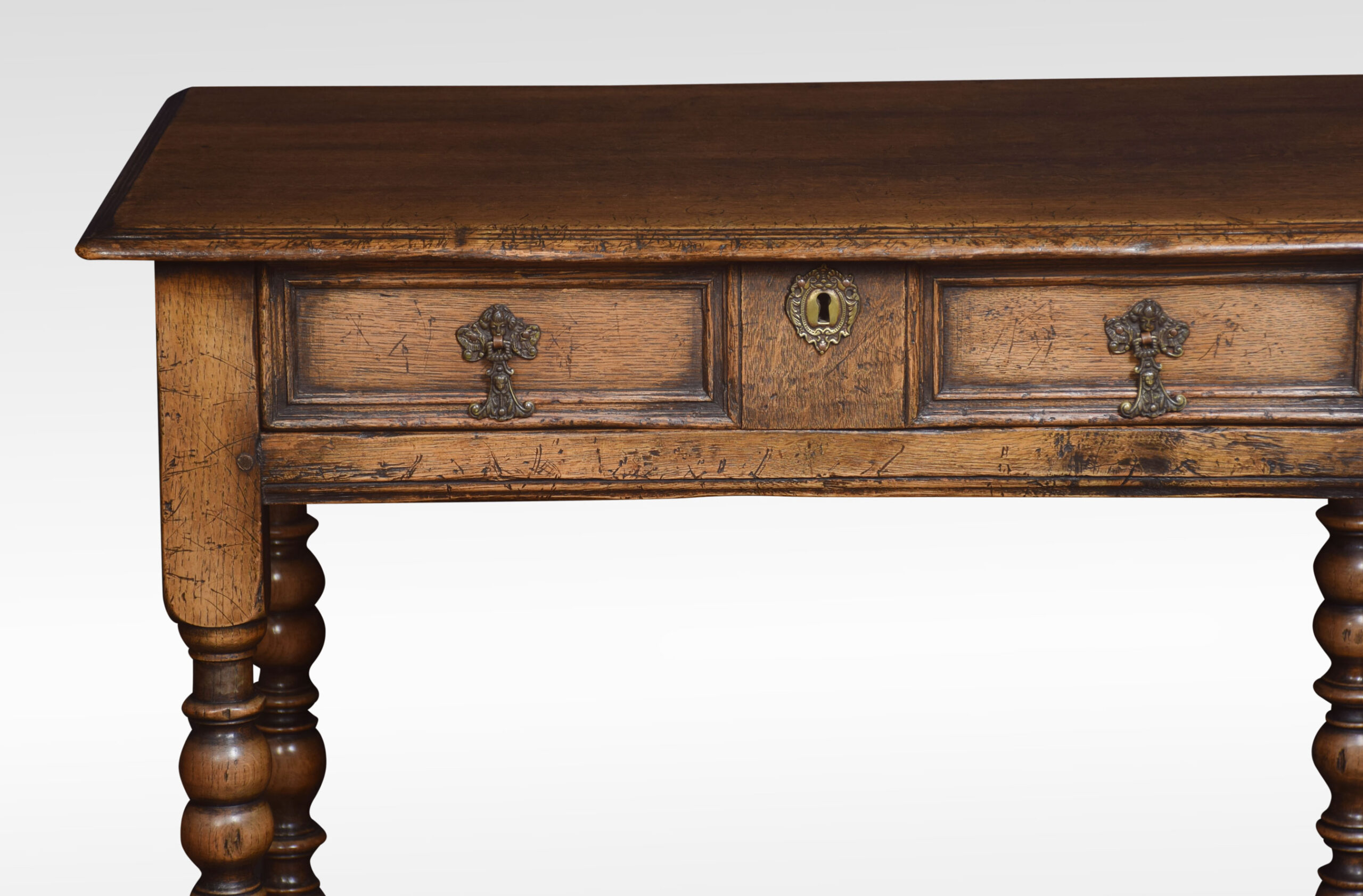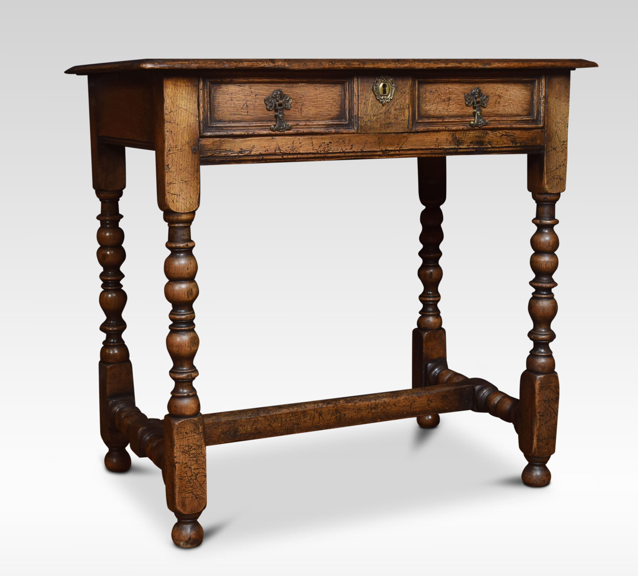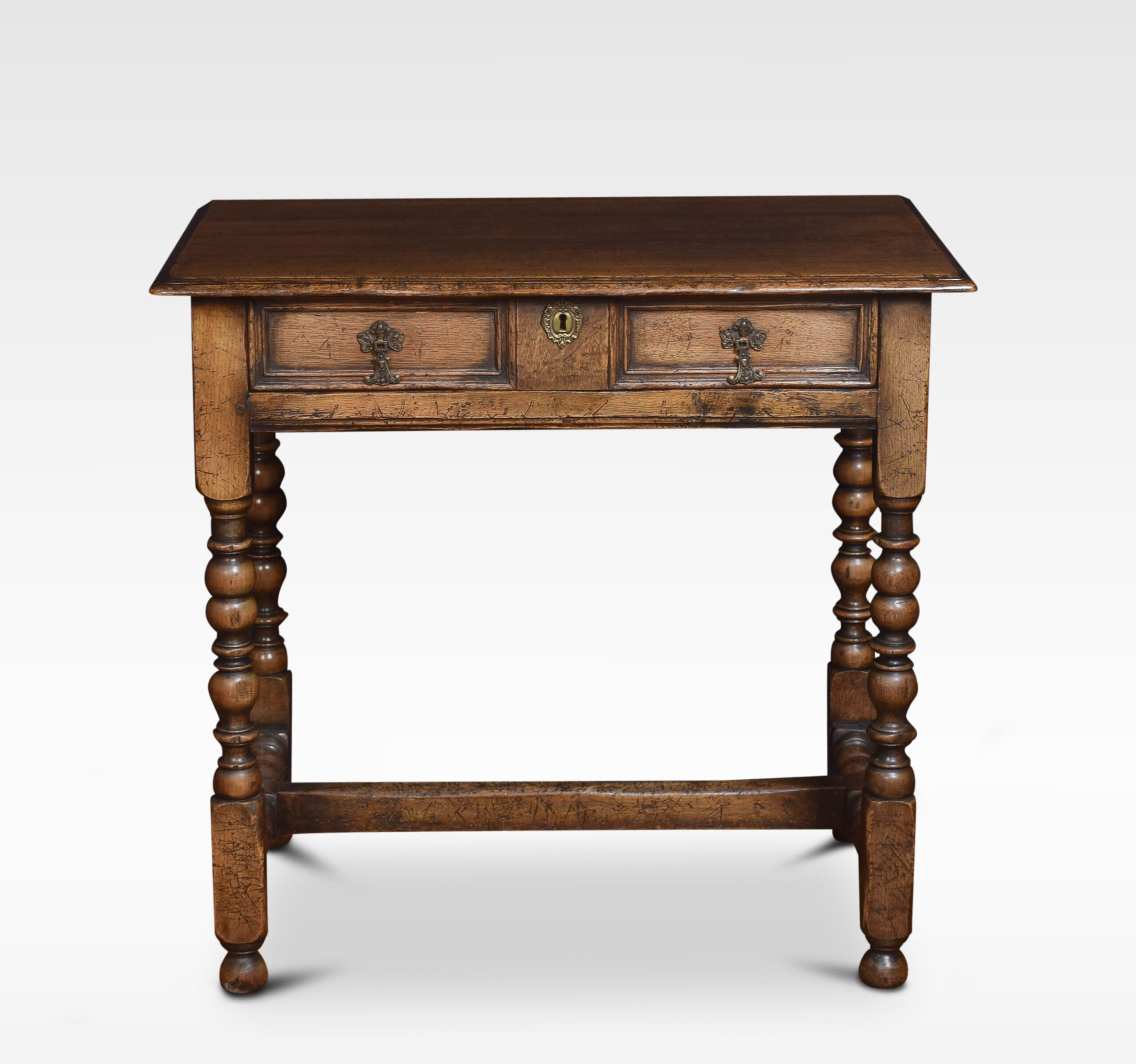17th Century style side table the rectangular oak top above a single frieze drawer on turned legs joined by an H stretcher.