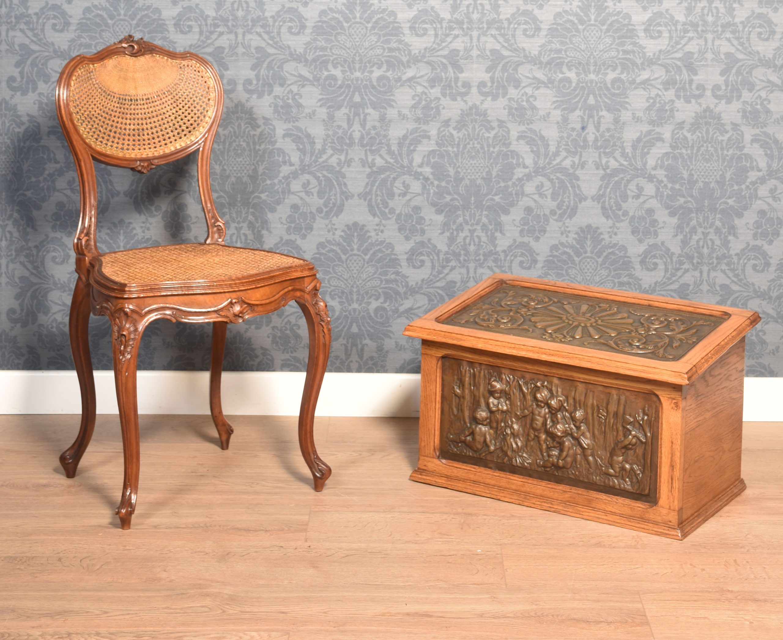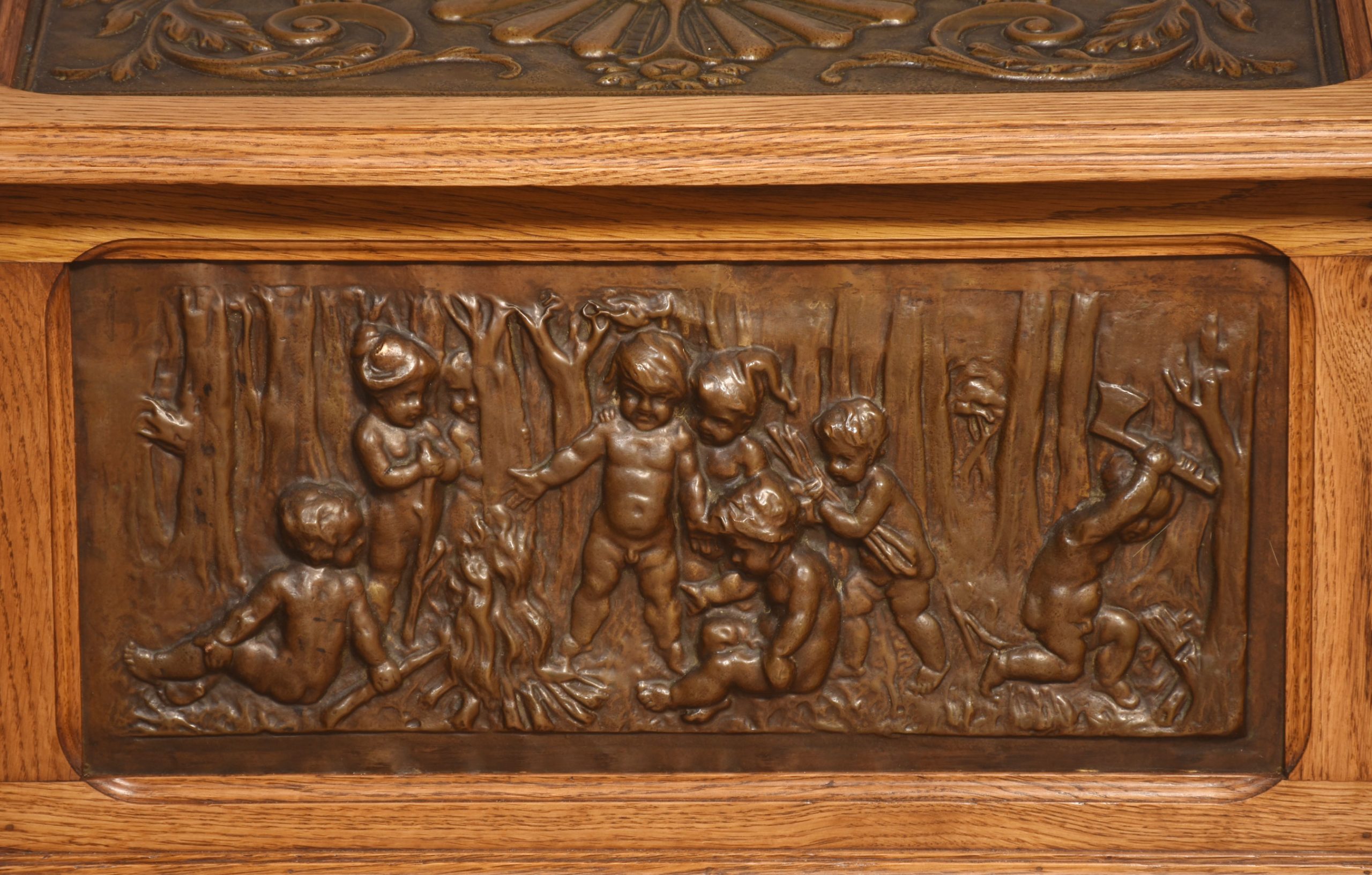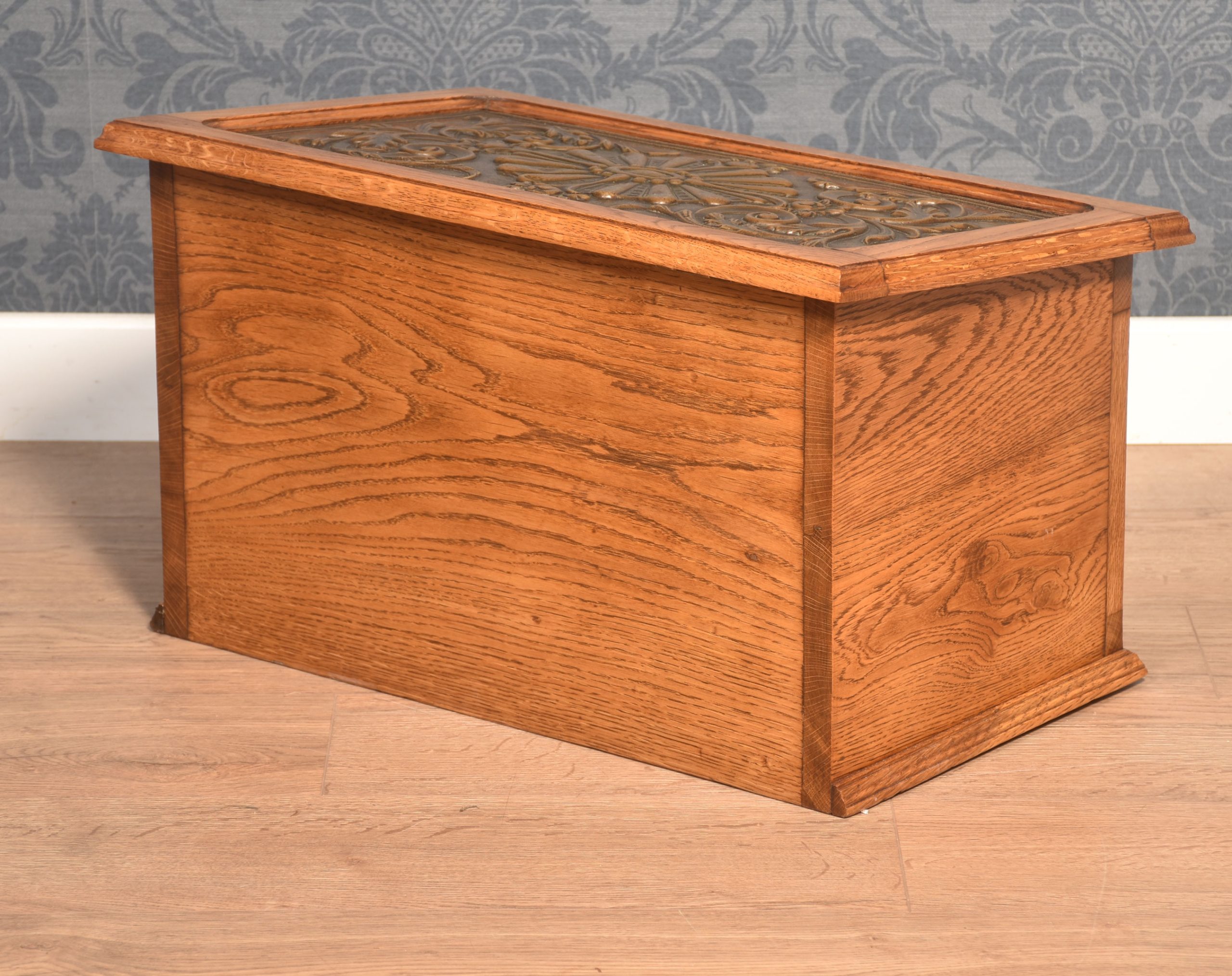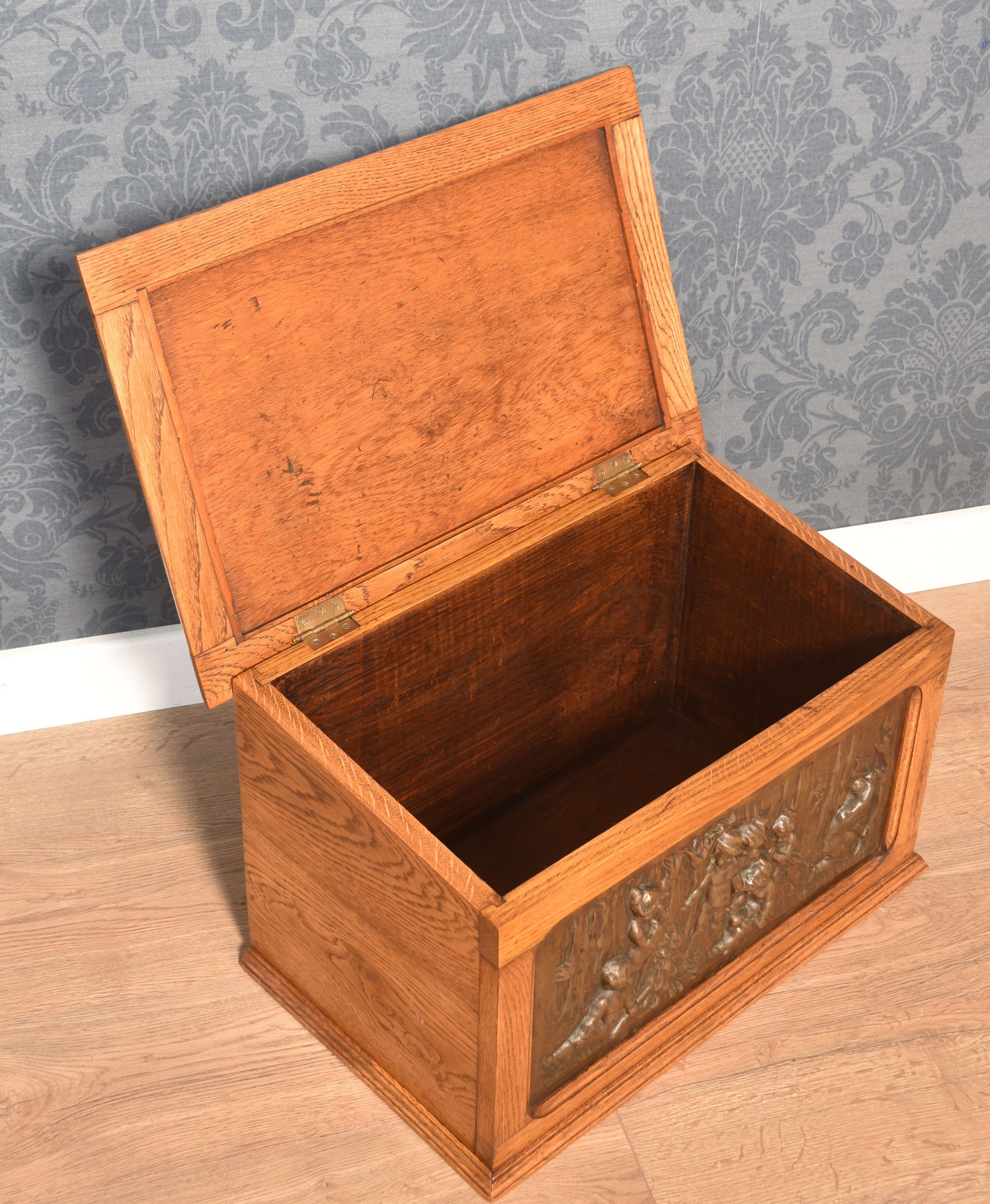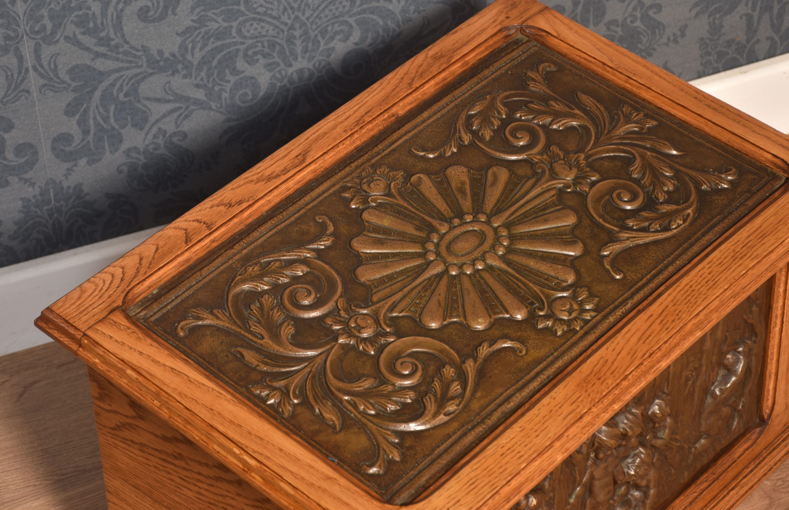 19th-century oak slipper box having embossed copper panels opening to reveal a large storage compartment.