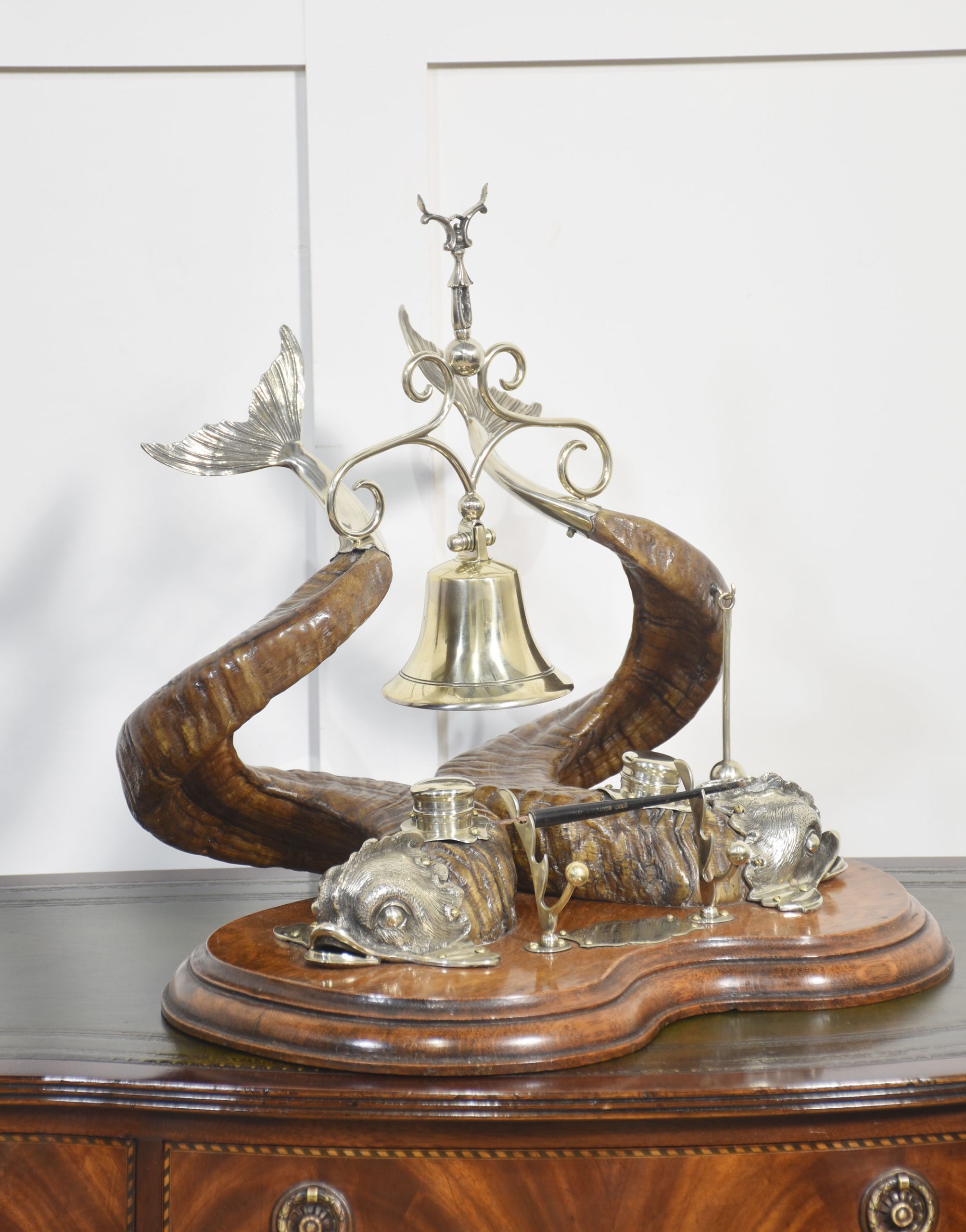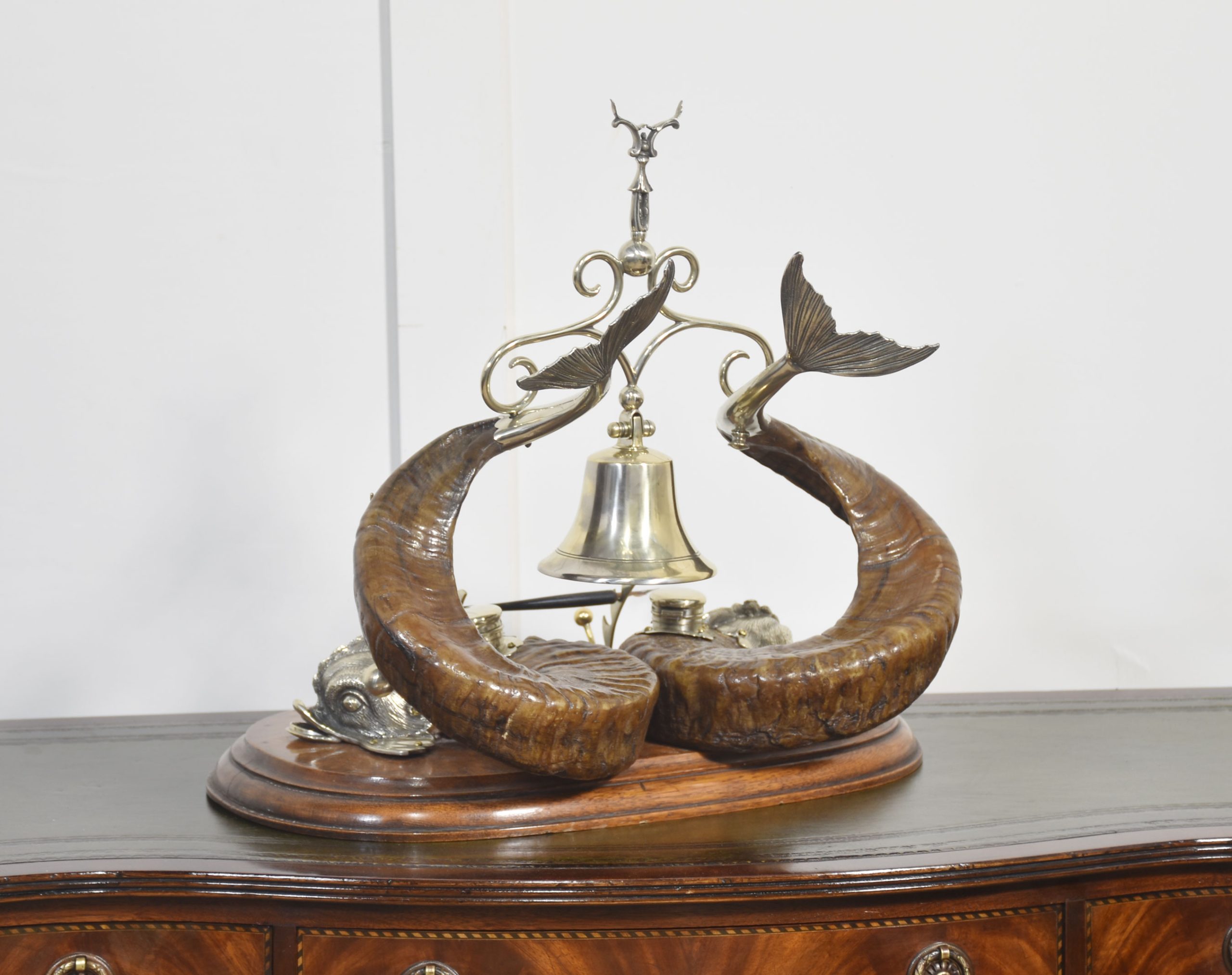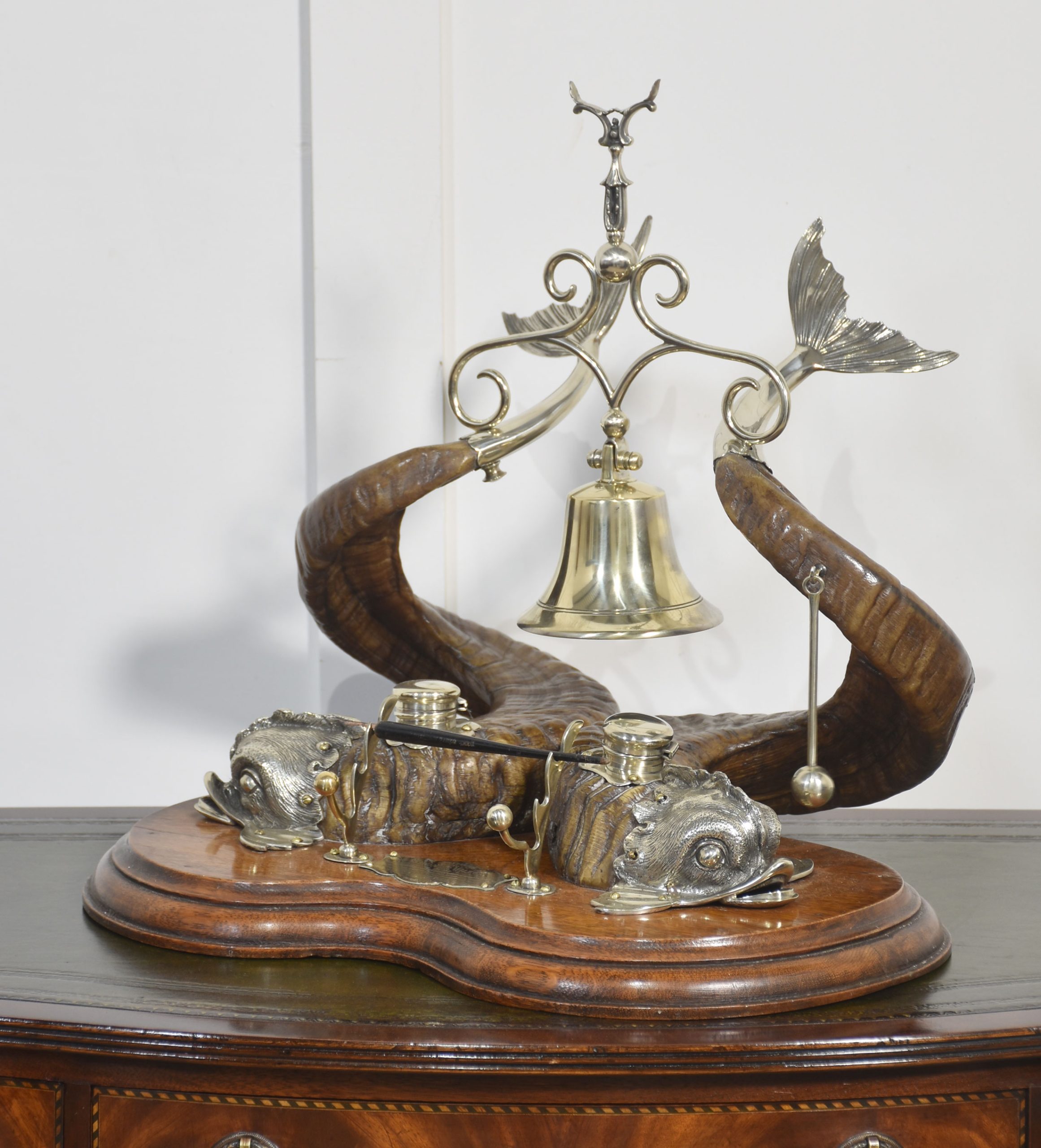 Ram Horn and Silver Plate Dolphin Inkwell, bearing a pair of ram’s horns, mounted with plated dolphin mounts, the tail suspending a bell, the beater for which is on mounts to the front near the pen well. All raised up on oak base
