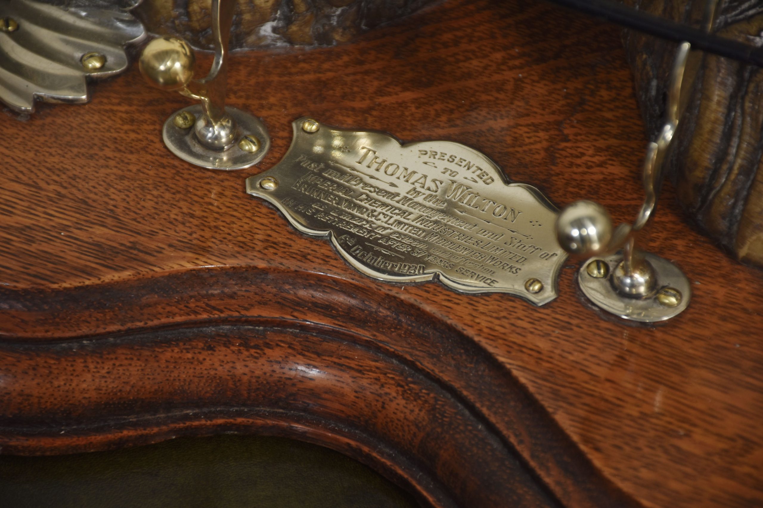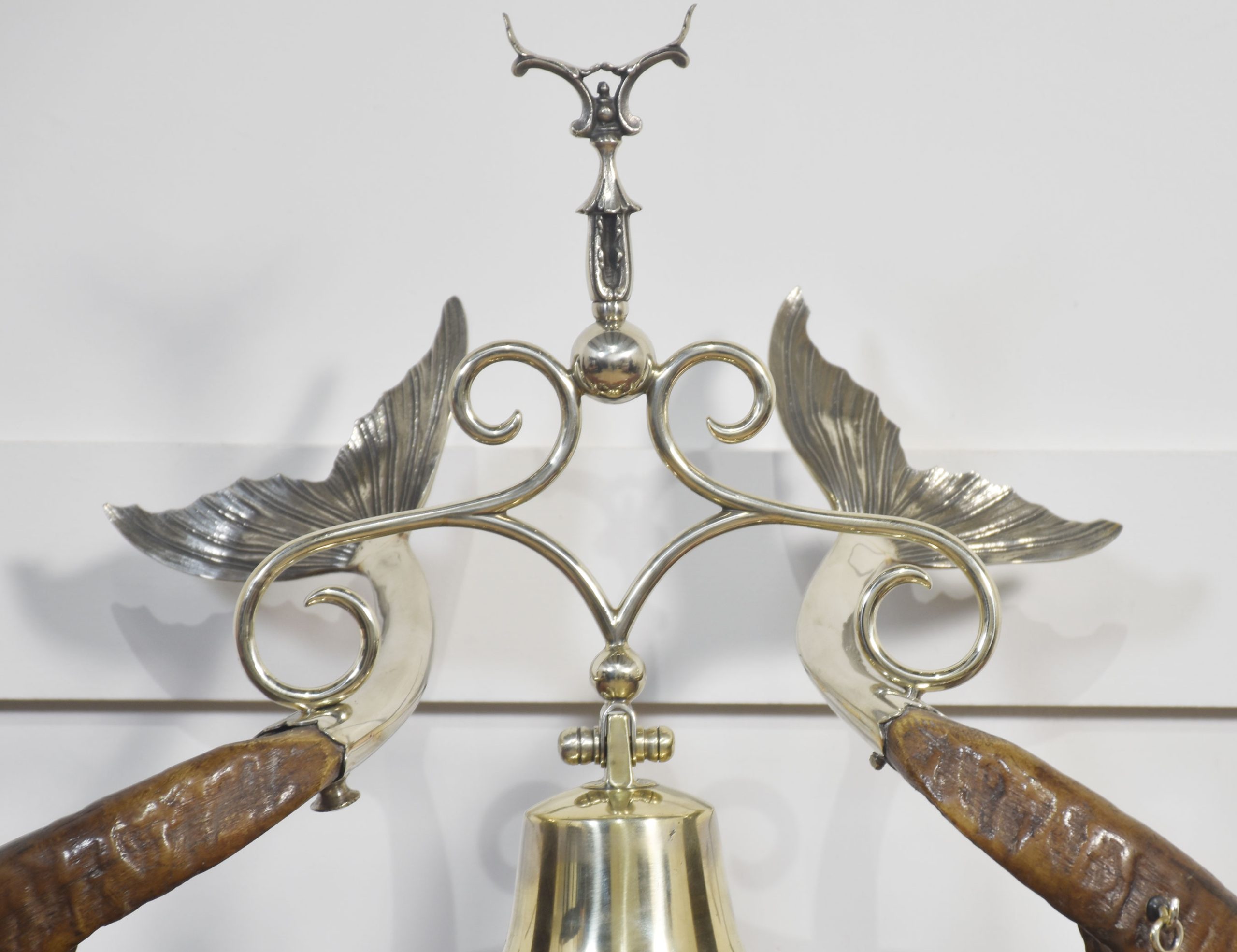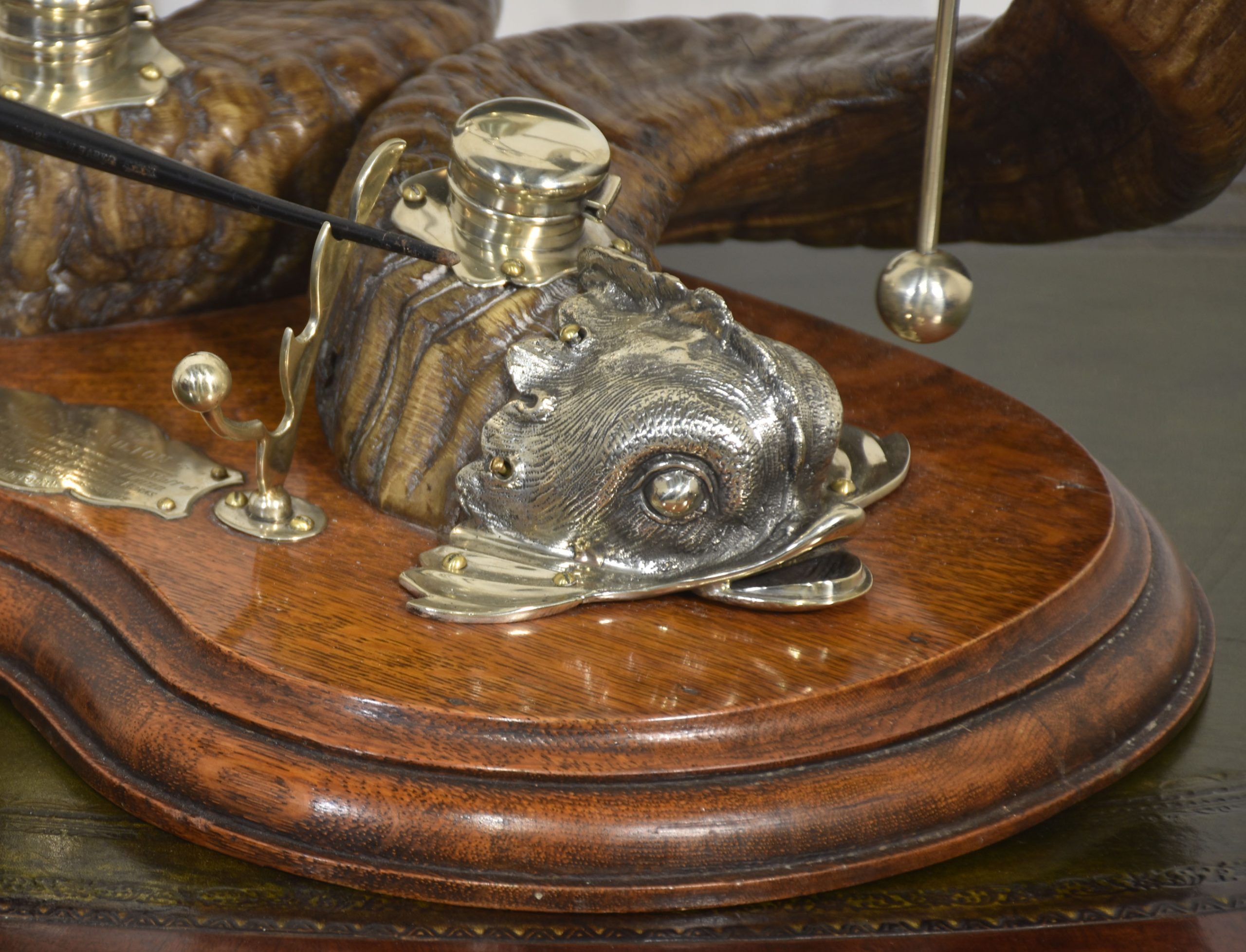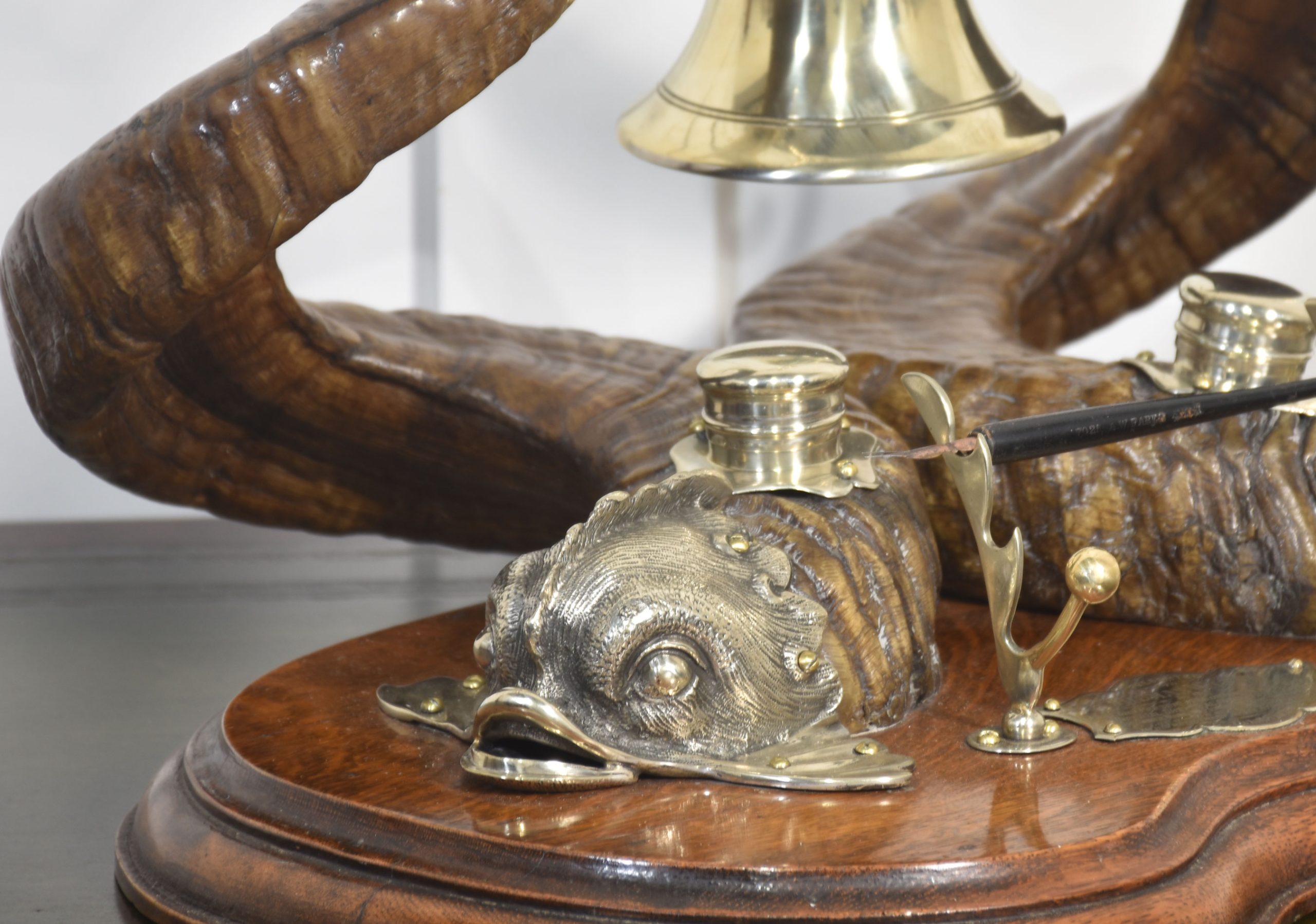 Ram Horn and Silver Plate Dolphin Inkwell, bearing a pair of ram’s horns, mounted with plated dolphin mounts, the tail suspending a bell, the beater for which is on mounts to the front near the pen well. All raised up on oak base