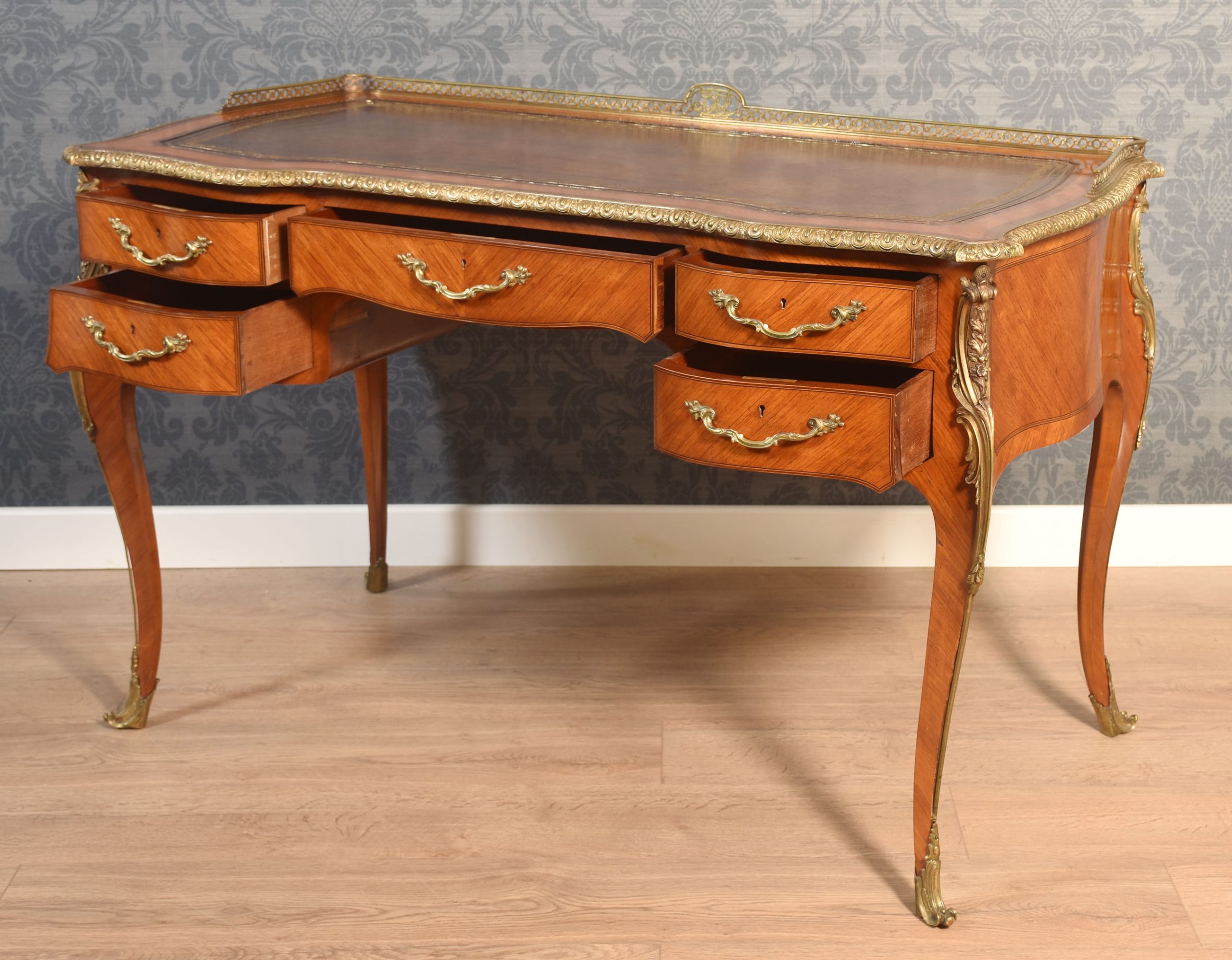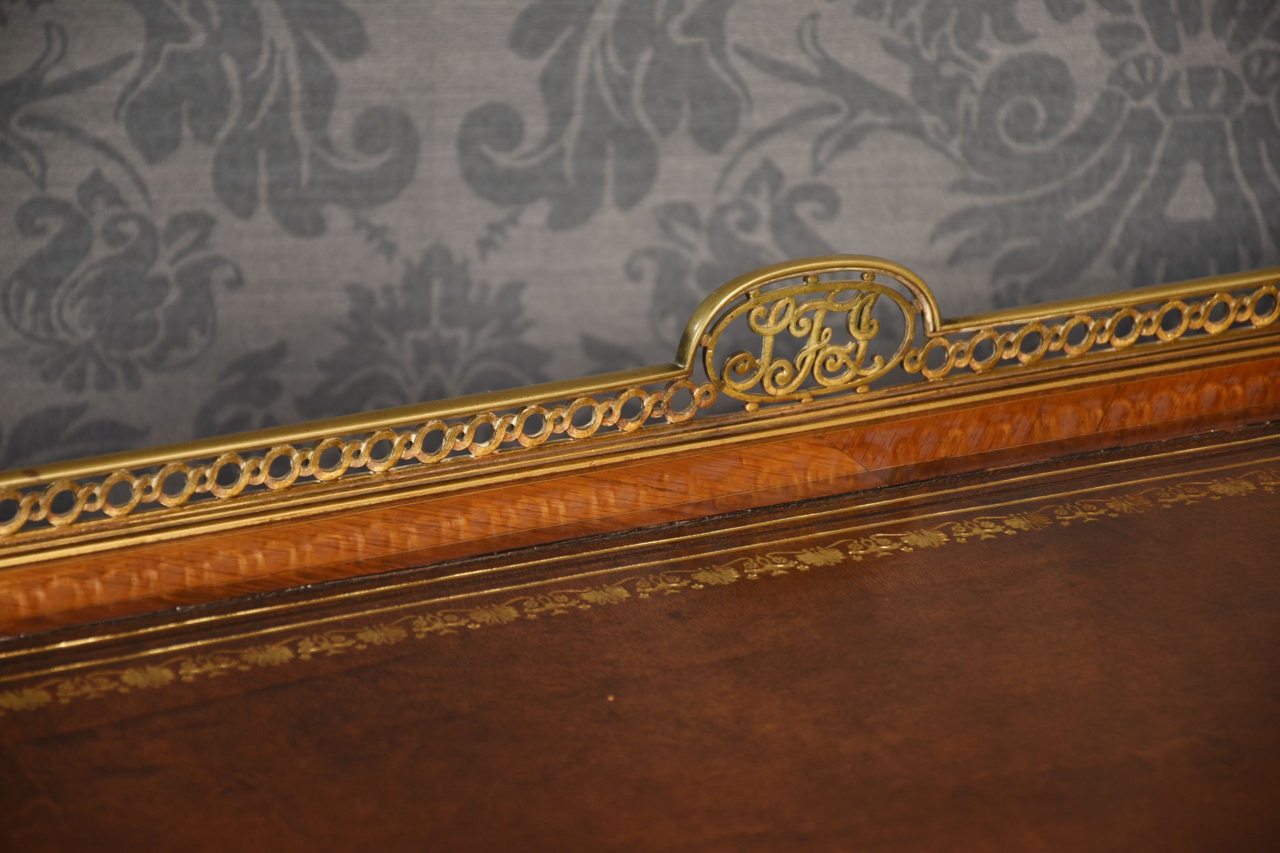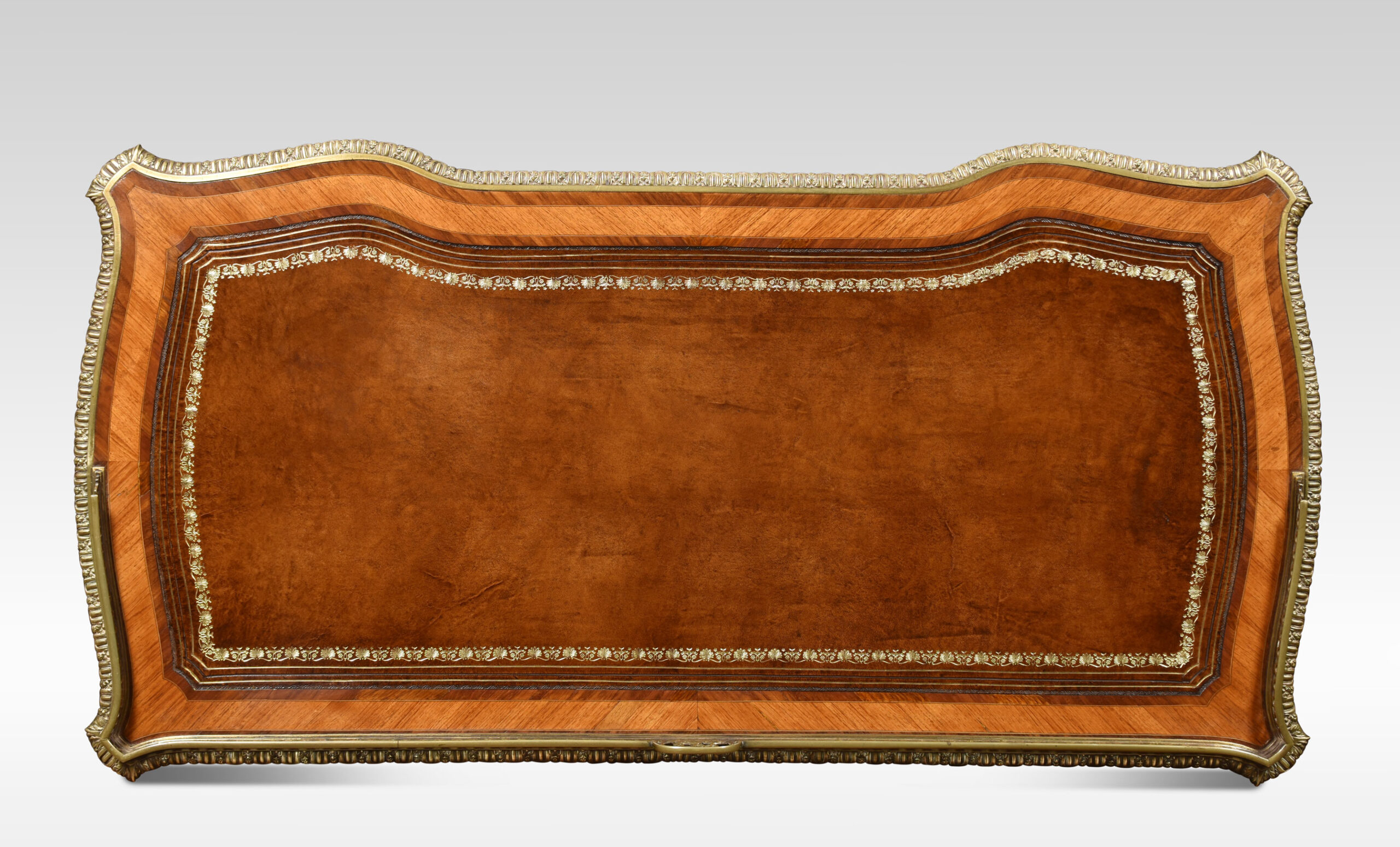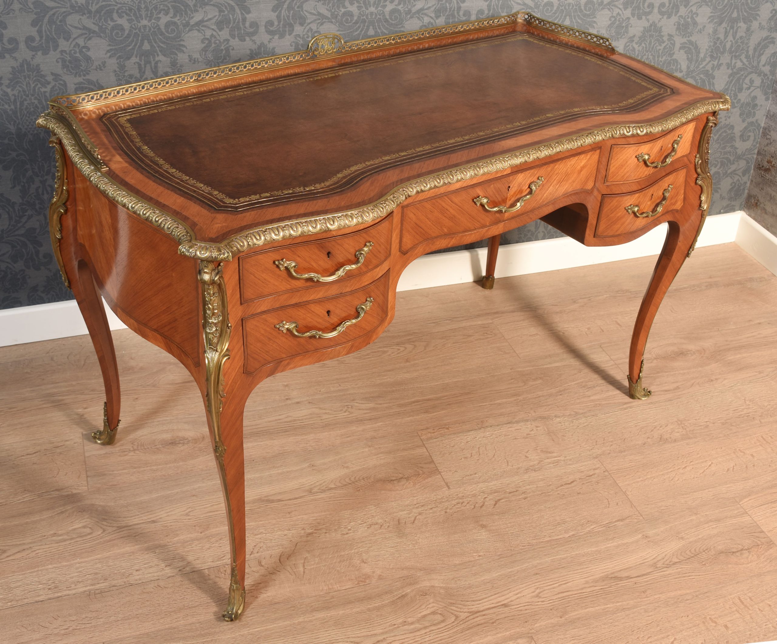 19th-century kingwood writing table, the raised three-quarter pierced gallery with SFJ monogram, to the inset leather top enclosed by a tooled brass border. Above an arrangement go five drawers, all raised up on slender cabriole supports.
