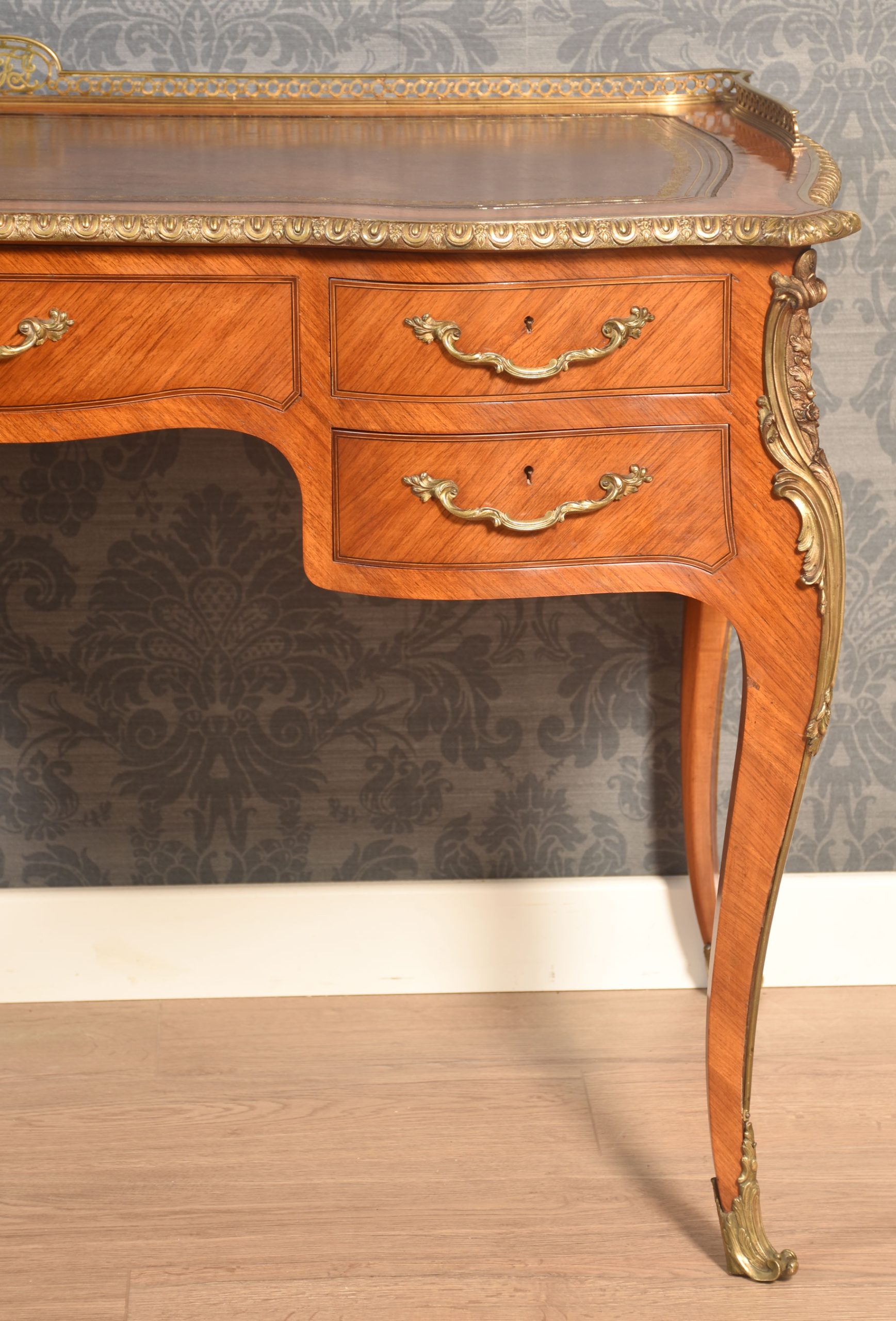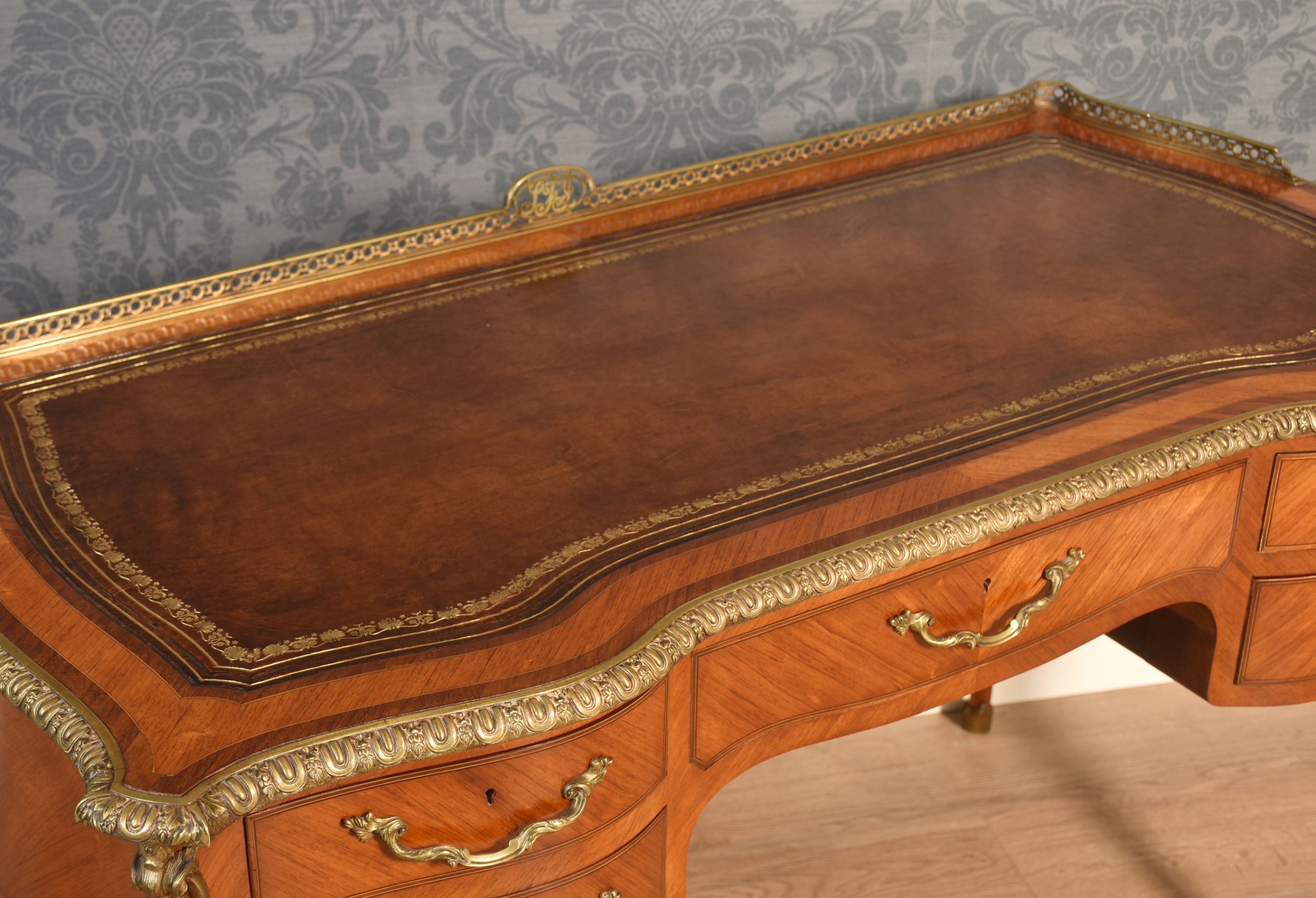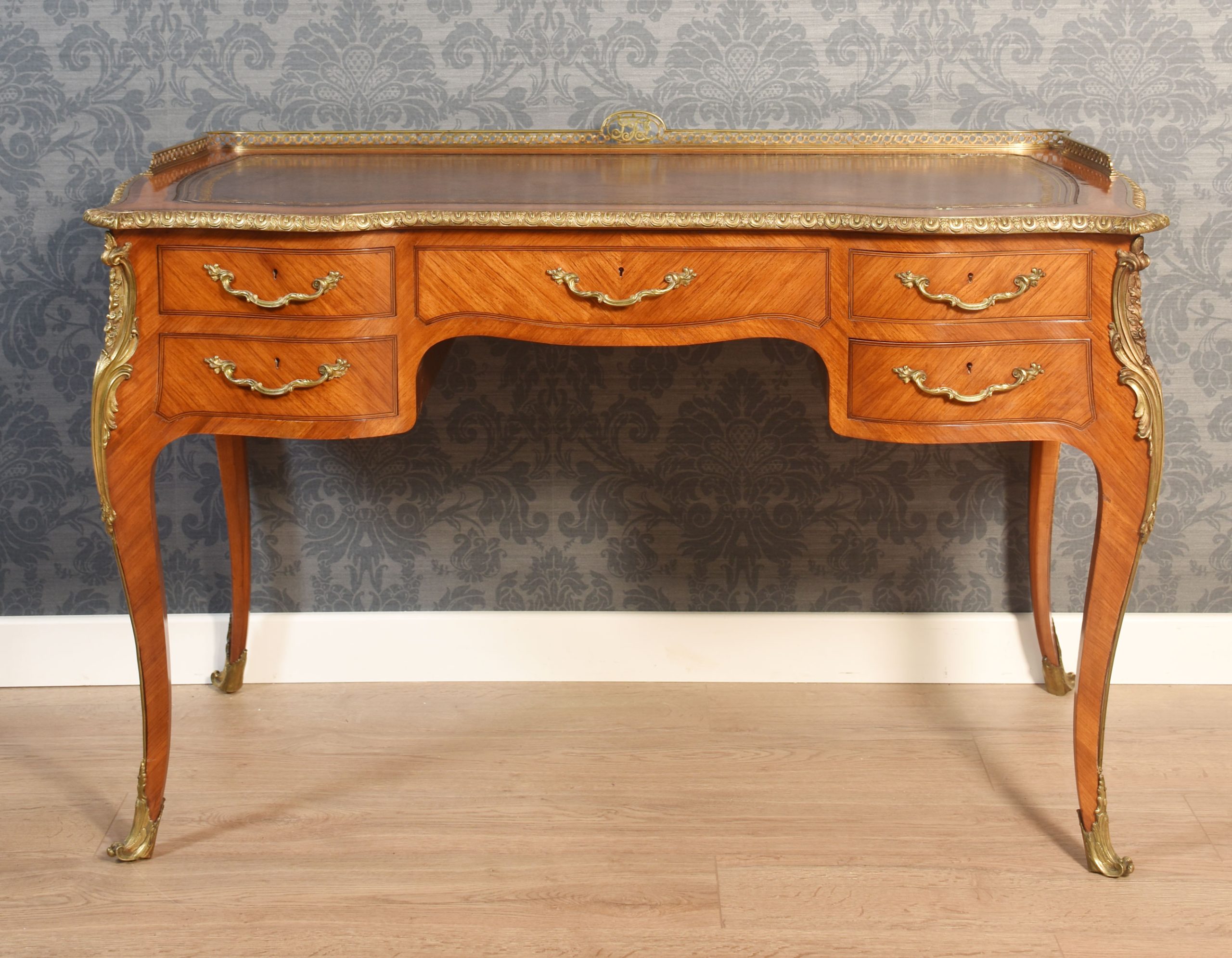 19th-century kingwood writing table, the raised three-quarter pierced gallery with SFJ monogram, to the inset leather top enclosed by a tooled brass border. Above an arrangement go five drawers, all raised up on slender cabriole supports.