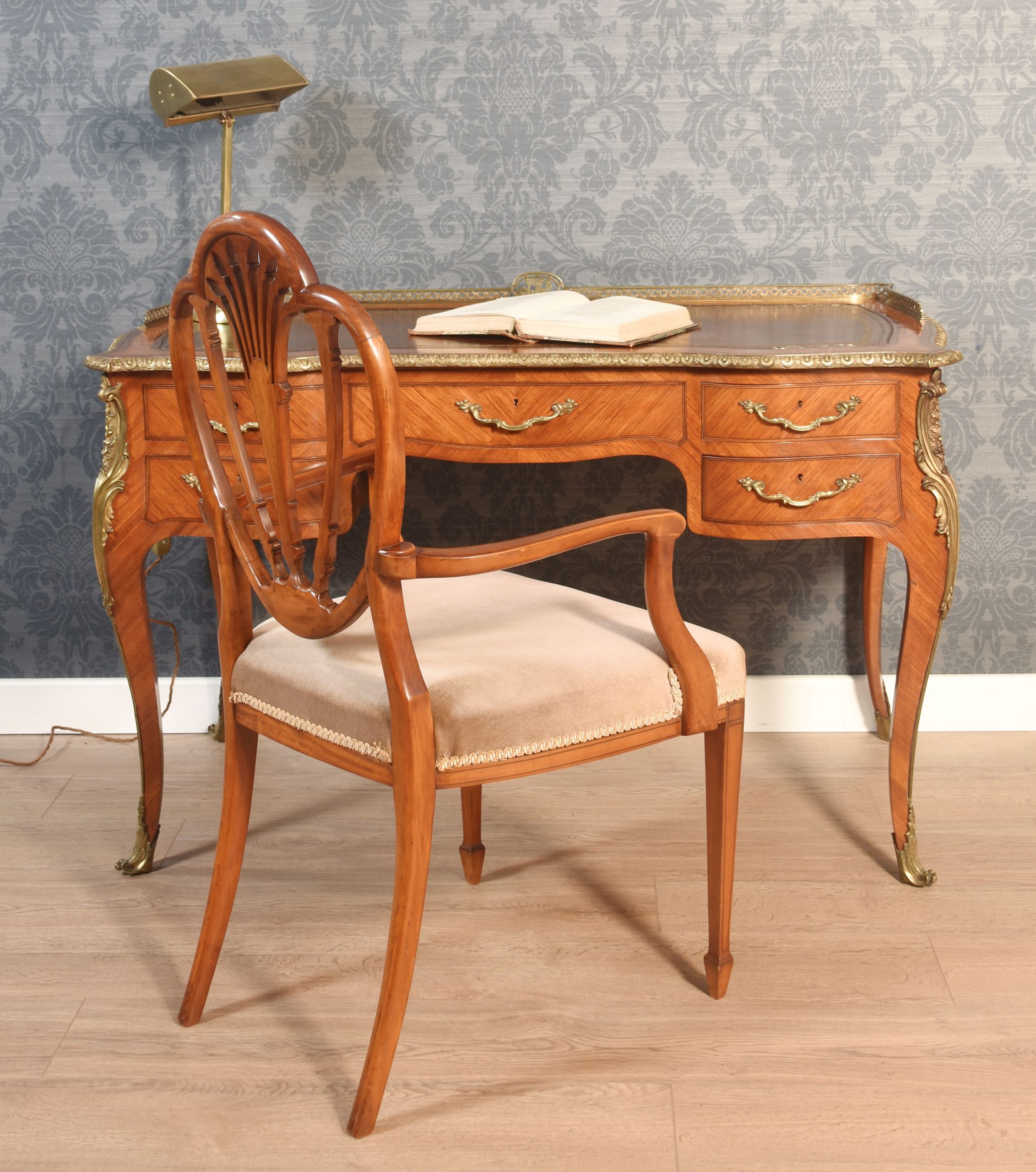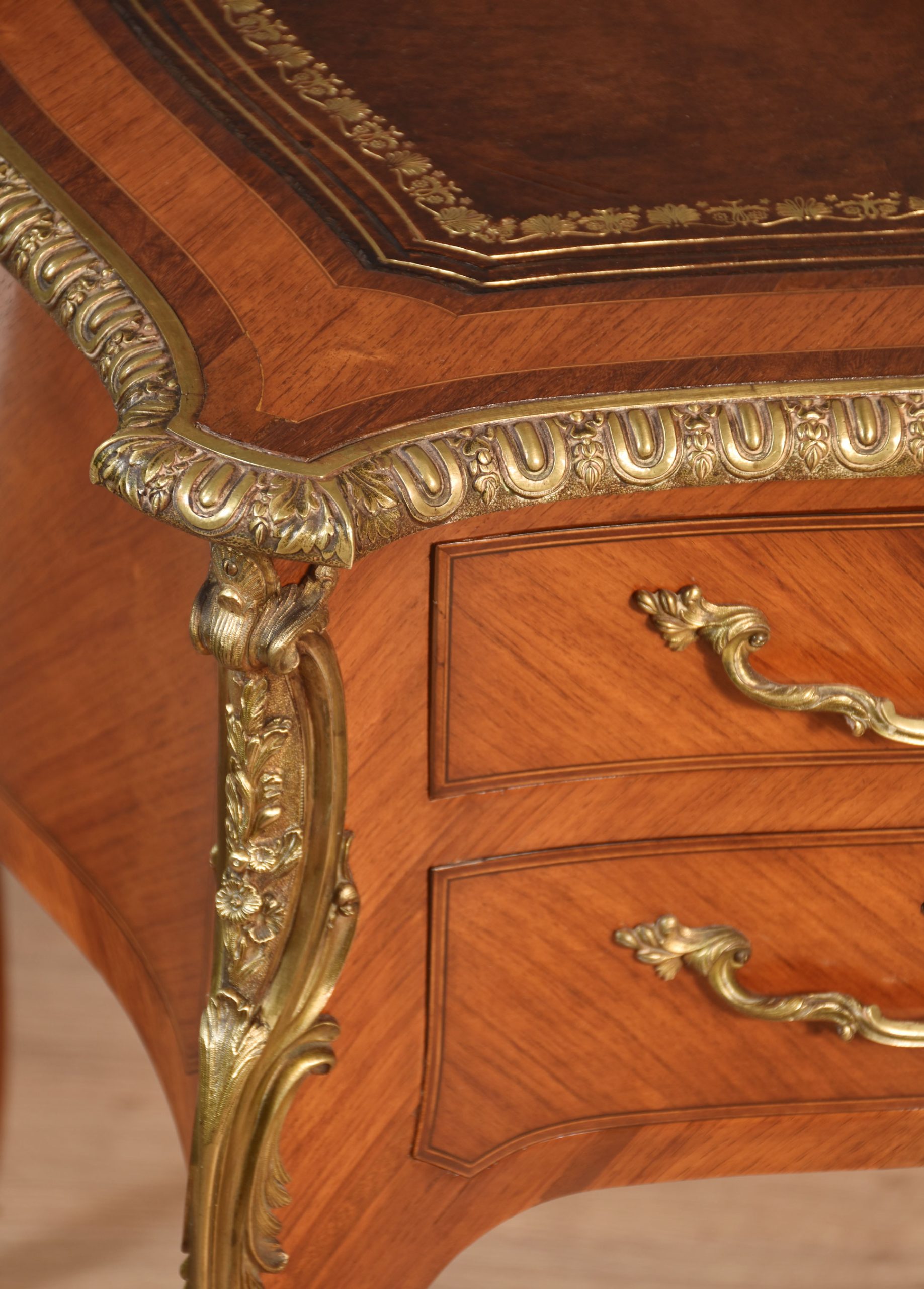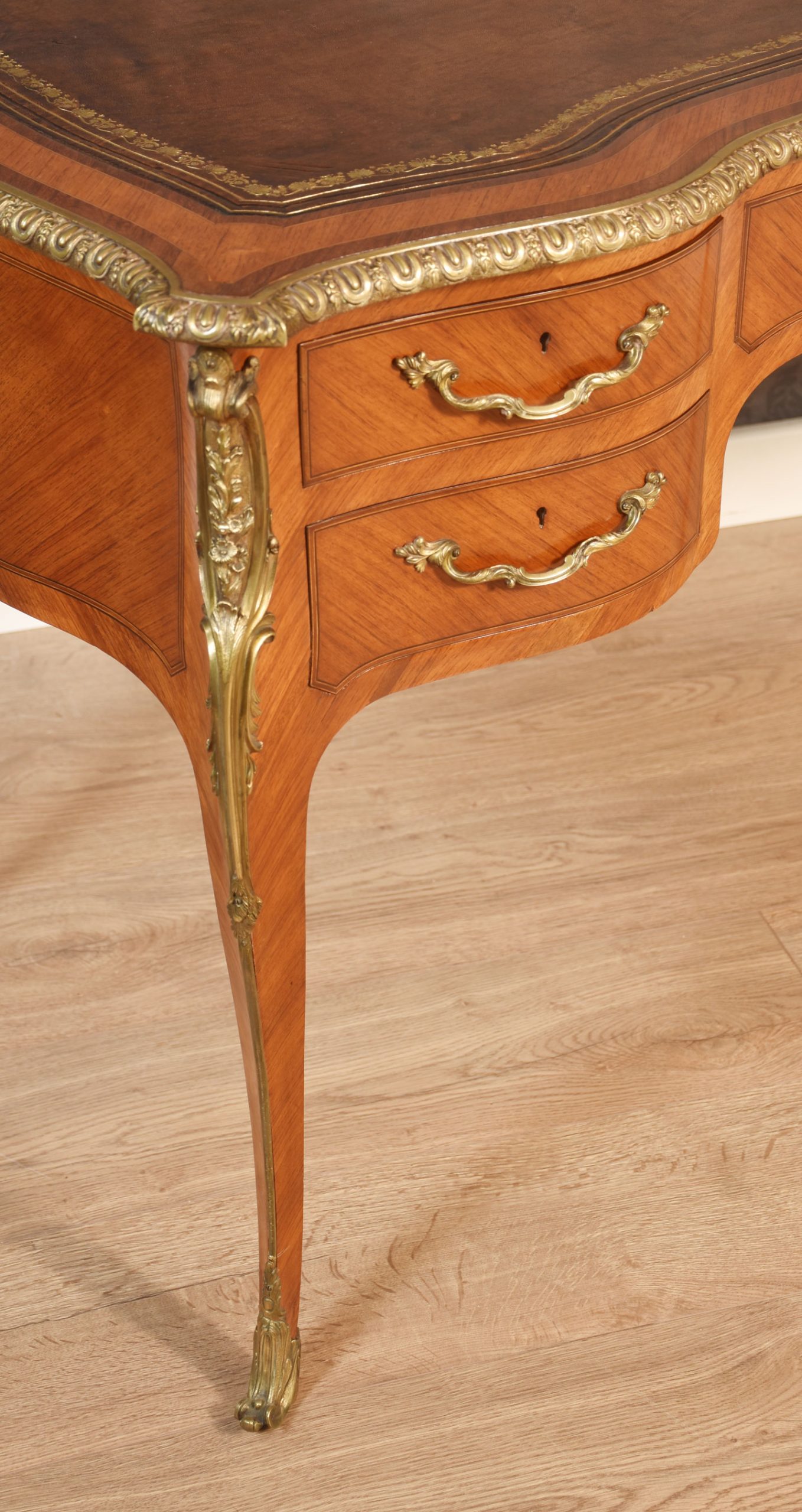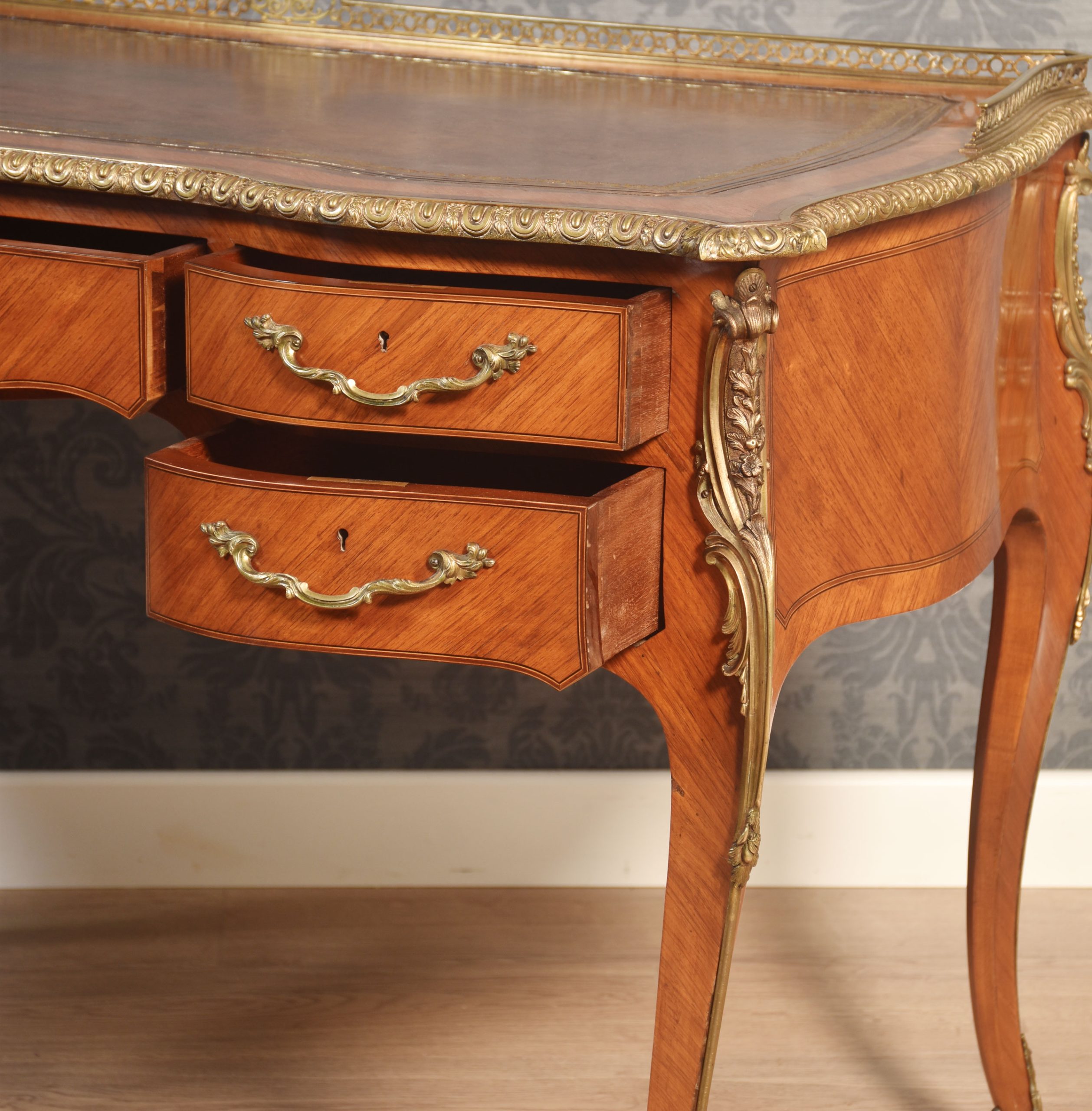19th-century kingwood writing table, the raised three-quarter pierced gallery with SFJ monogram, to the inset leather top enclosed by a tooled brass border. Above an arrangement go five drawers, all raised up on slender cabriole supports.