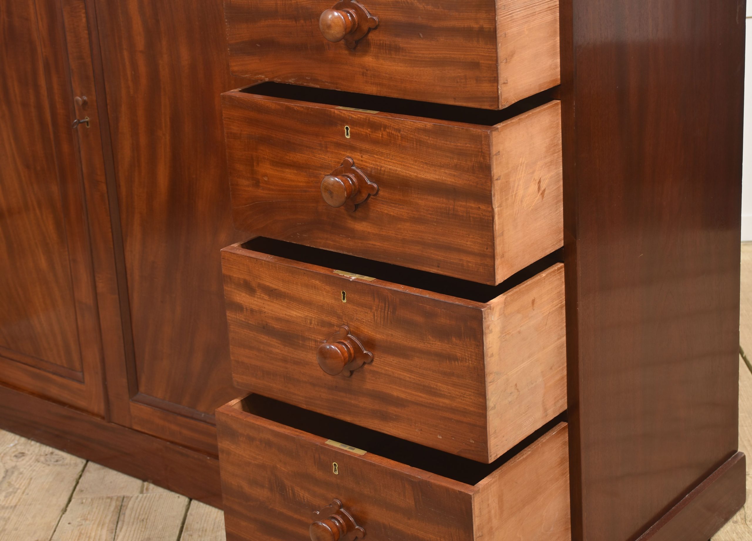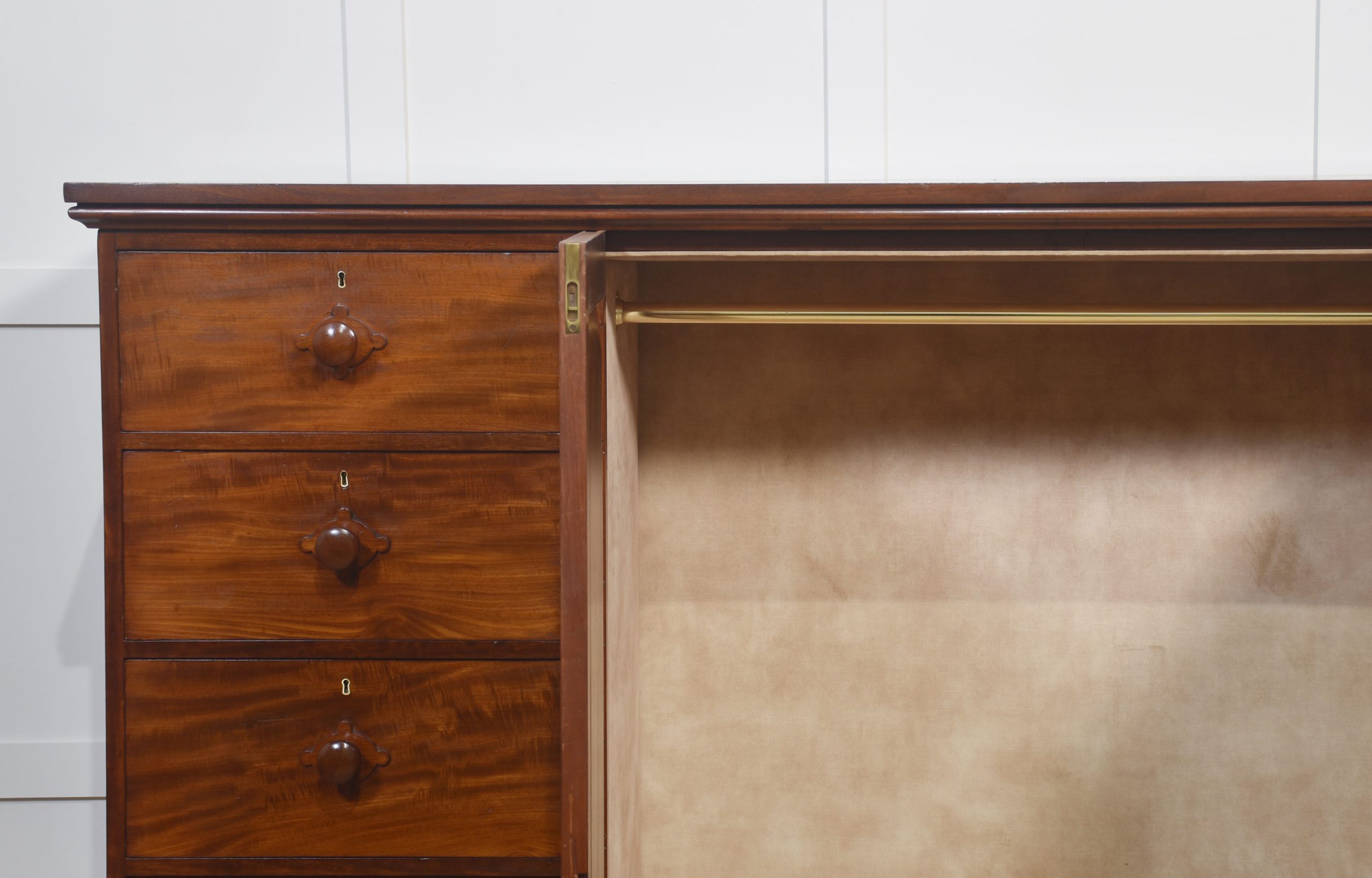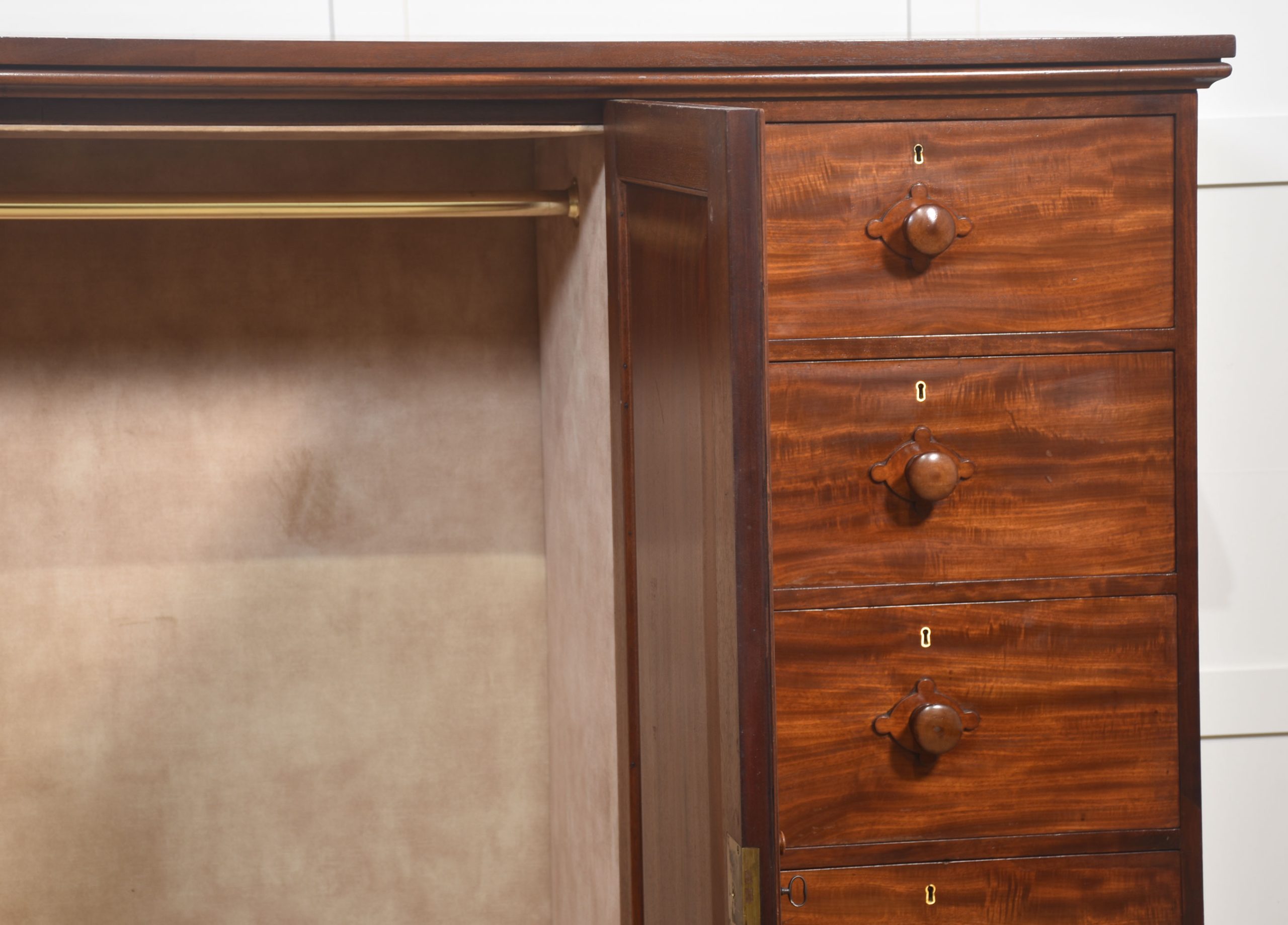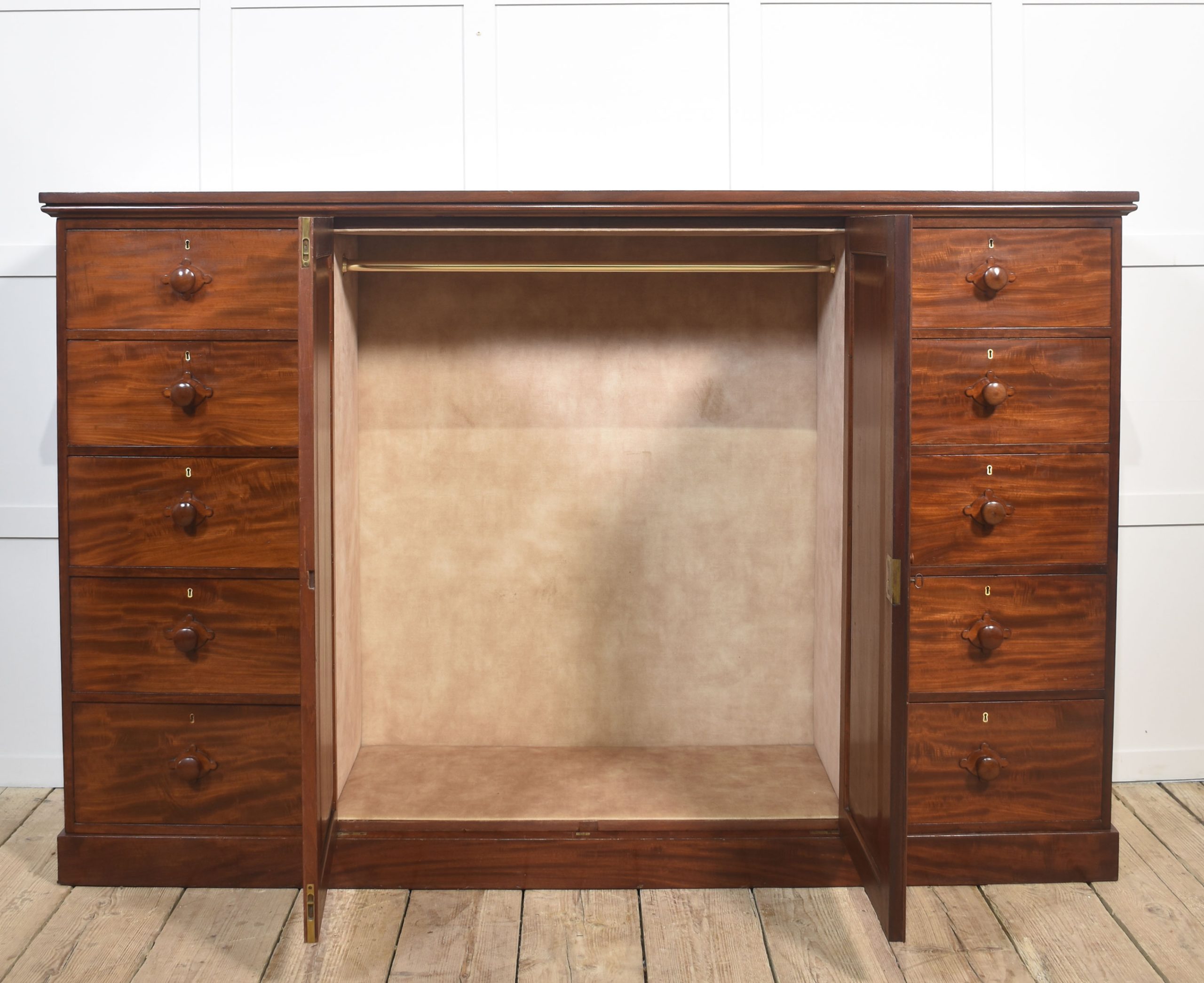 Regency mahogany, dwarf press cupboard, the large rectangular moulded top above two flame mahogany panelled centre doors. Opening to reveal a converted interior with suede upholstery and a long hanging rail. Flanked by a bank of five drawers on either side with turned handles. All raised up on a plinth base.