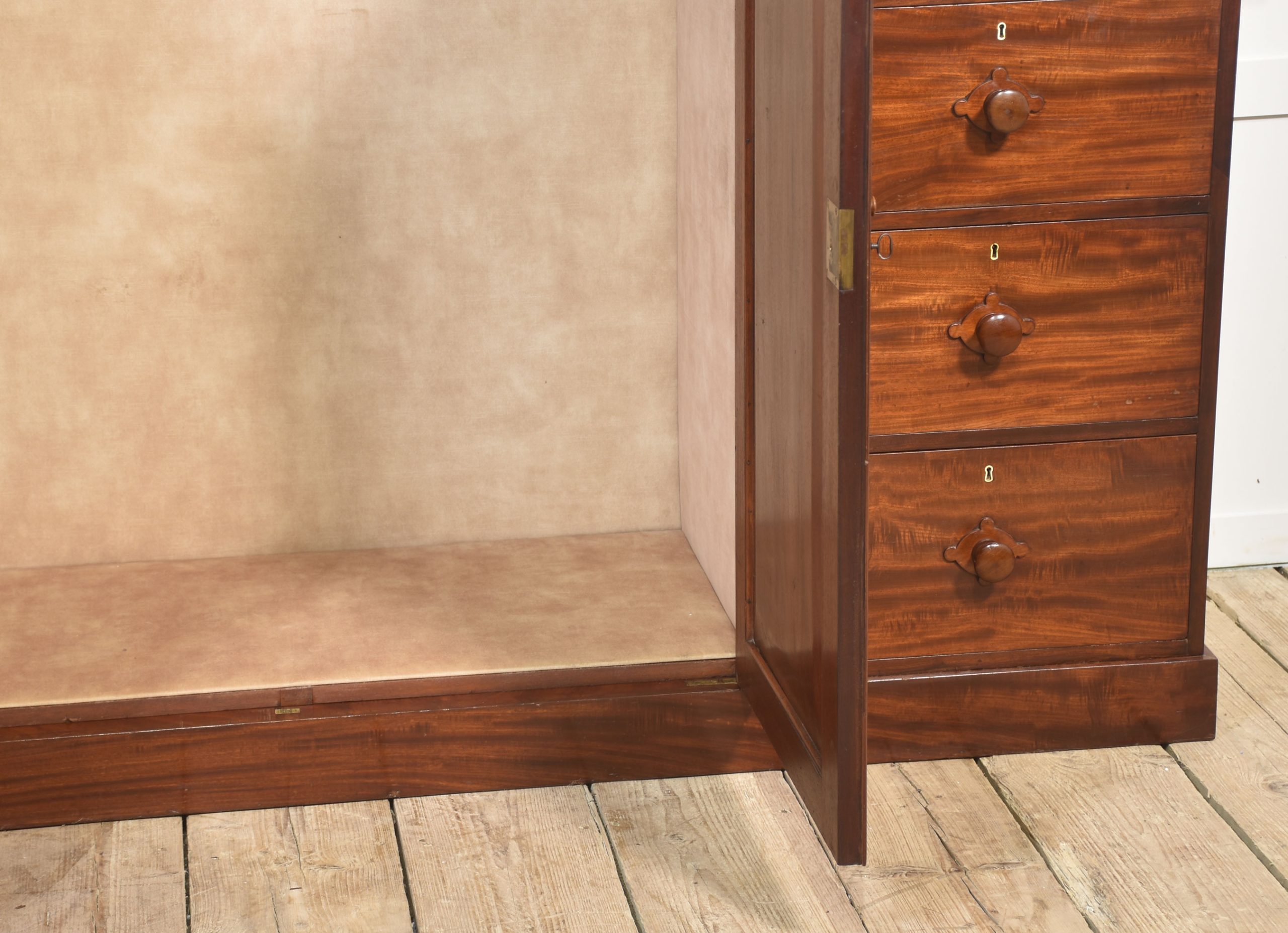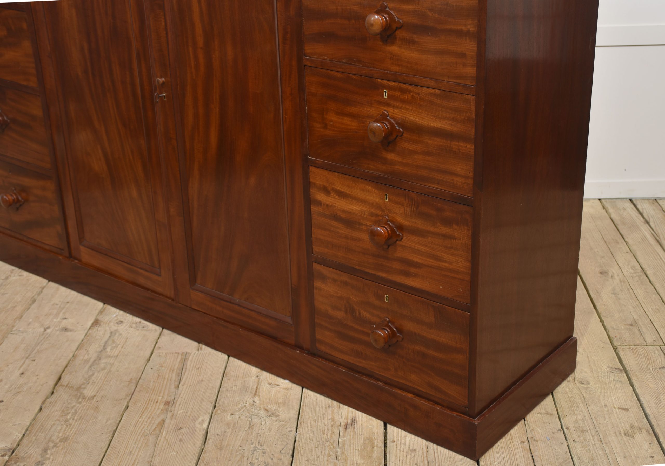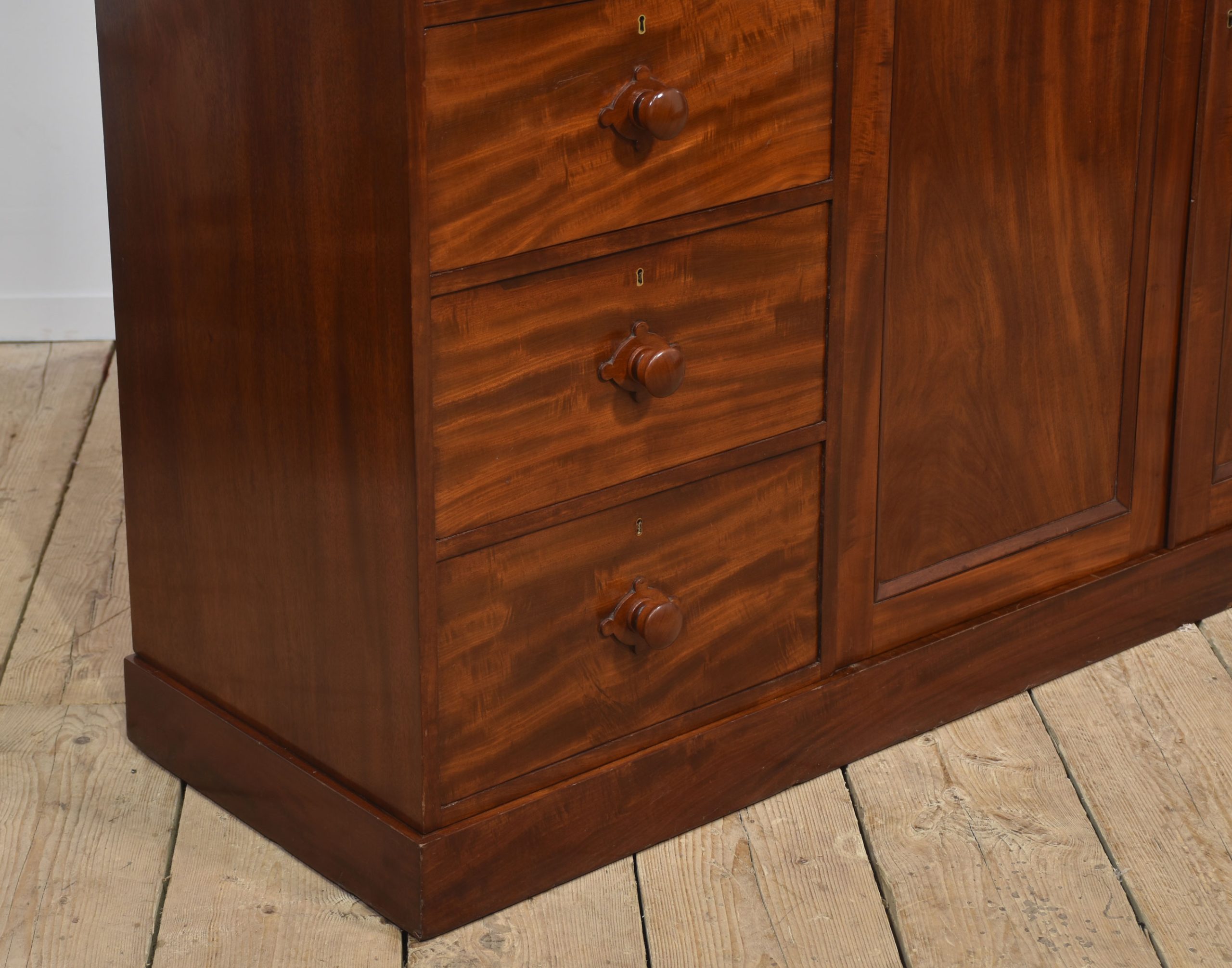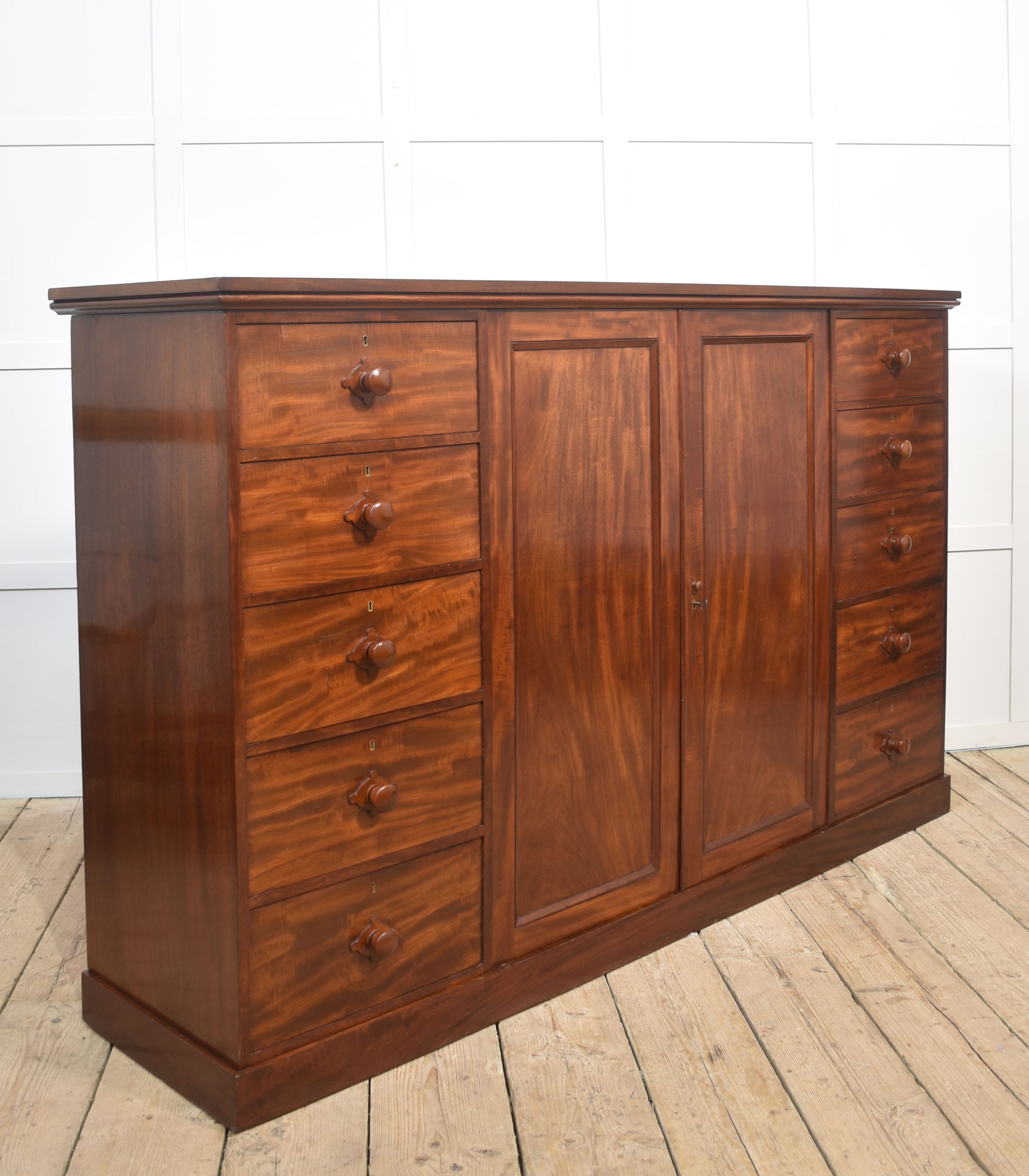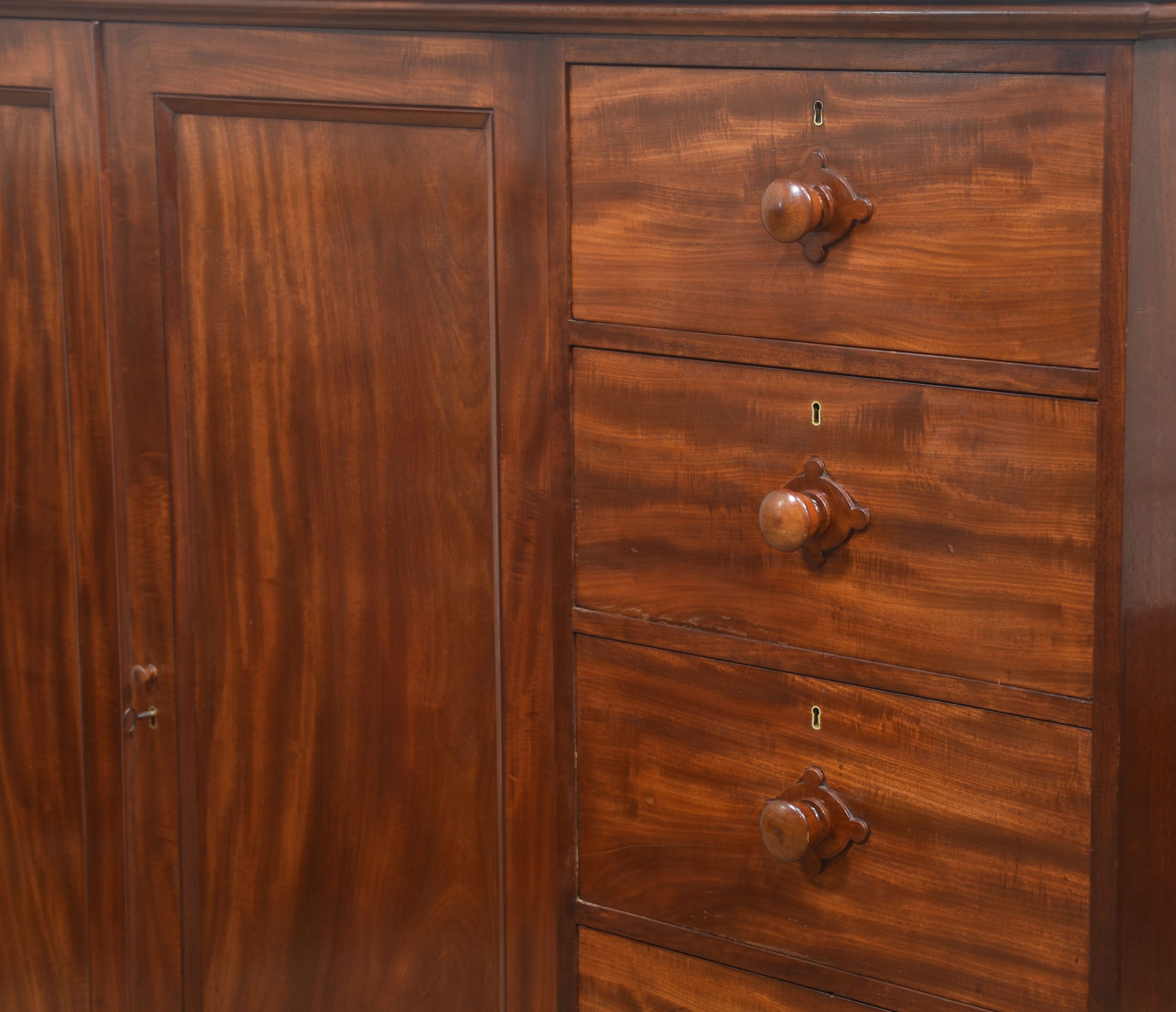 Regency mahogany, dwarf press cupboard, the large rectangular moulded top above two flame mahogany panelled centre doors. Opening to reveal a converted interior with suede upholstery and a long hanging rail. Flanked by a bank of five drawers on either side with turned handles. All raised up on a plinth base.