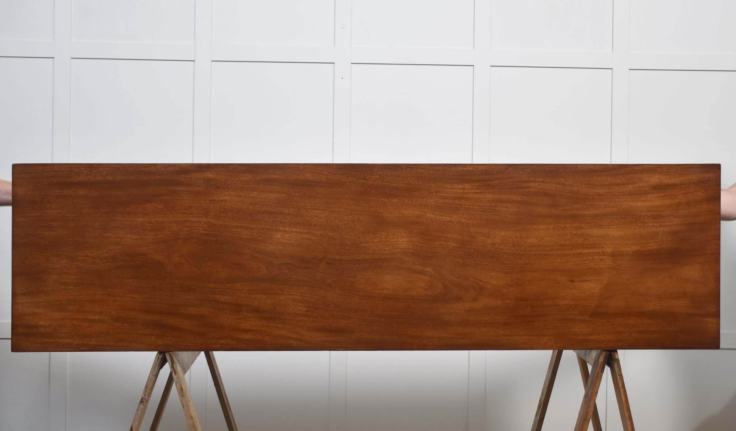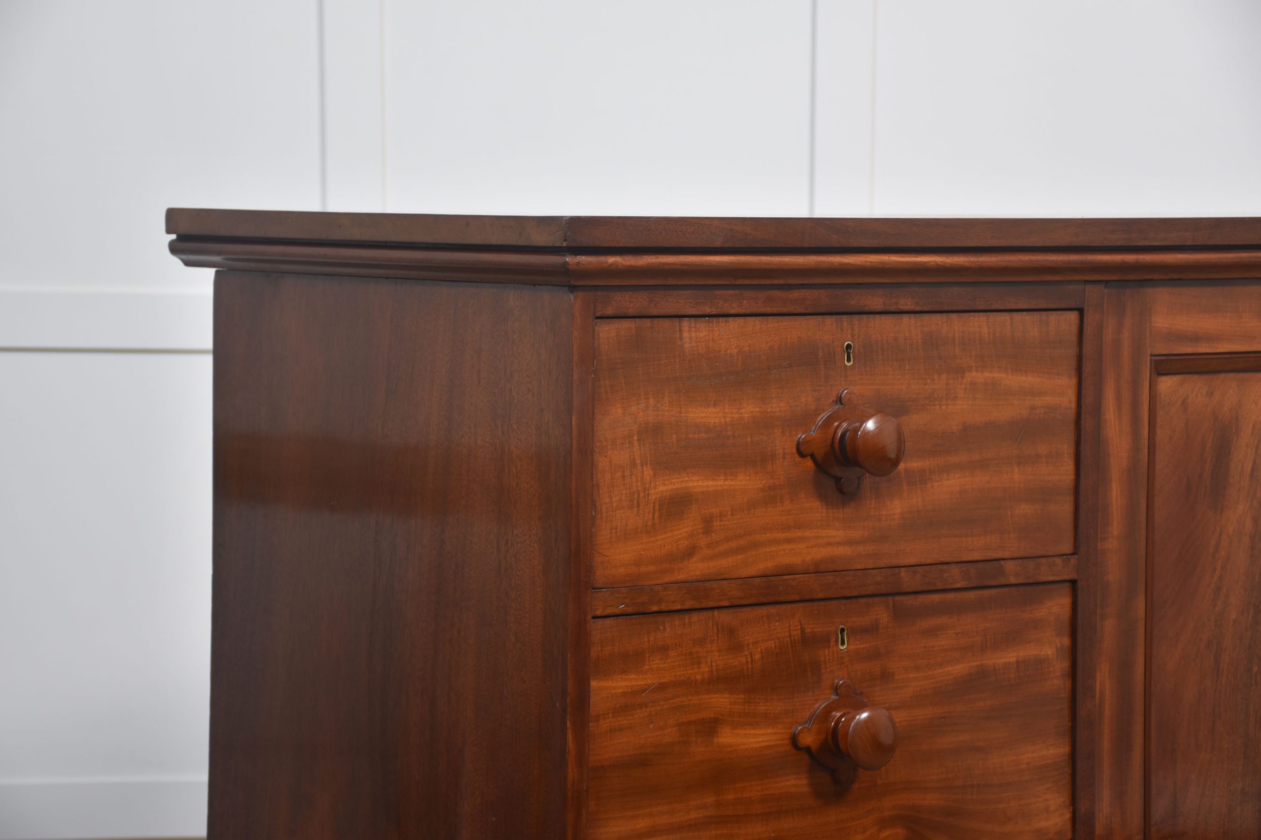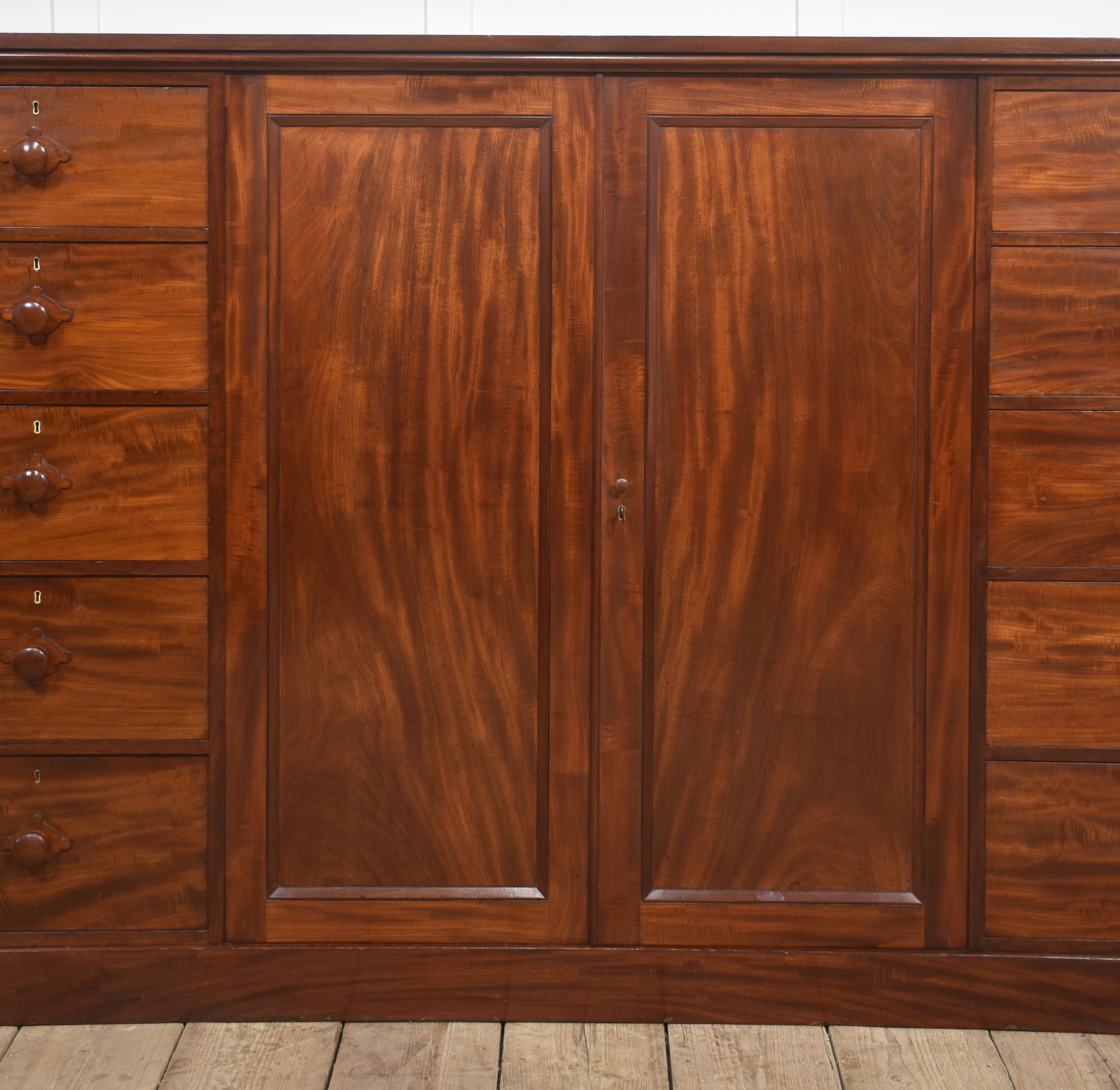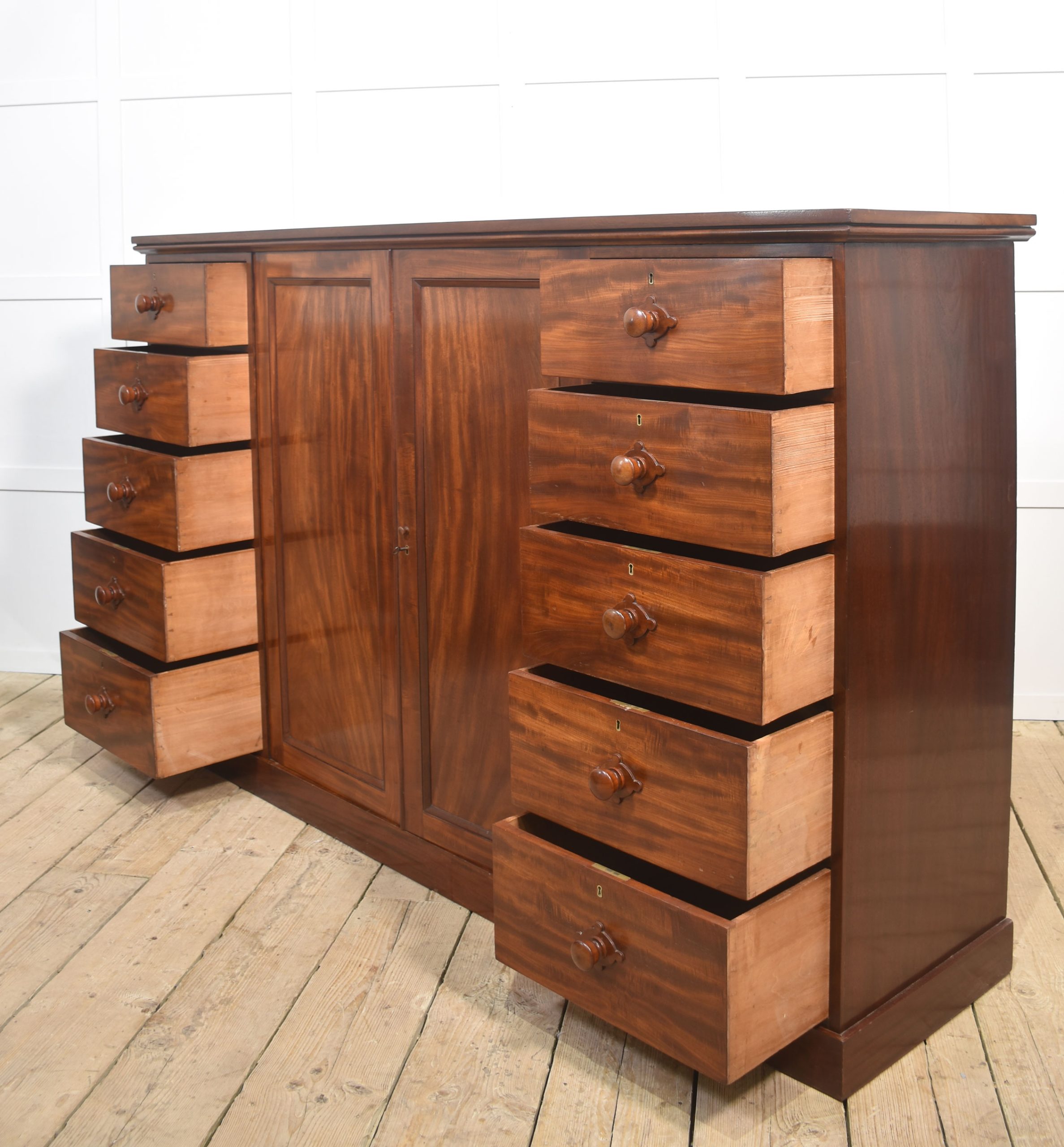 Regency mahogany, dwarf press cupboard, the large rectangular moulded top above two flame mahogany panelled centre doors. Opening to reveal a converted interior with suede upholstery and a long hanging rail. Flanked by a bank of five drawers on either side with turned handles. All raised up on a plinth base.