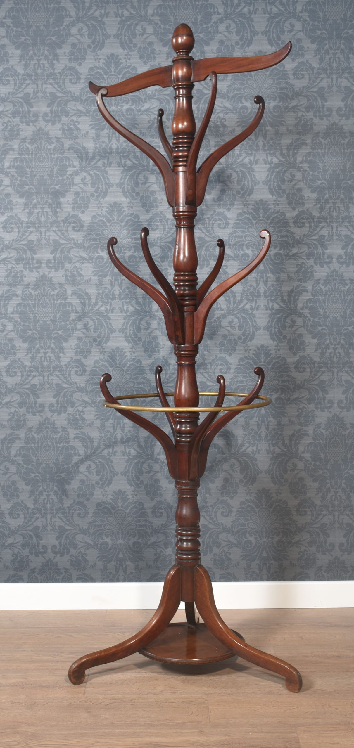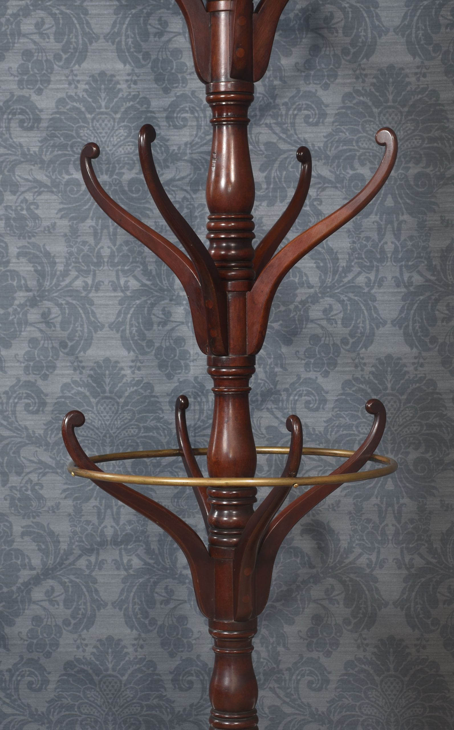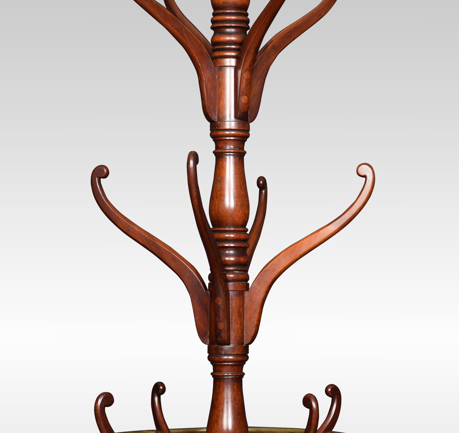 19th Century mahogany coat and umbrella stand. The top having two flat arms above two sets of four shaped coat hooks. The centre fitted with unusual with brass circular rail and four hooks below. All raised up on splayed legs united by under tier.