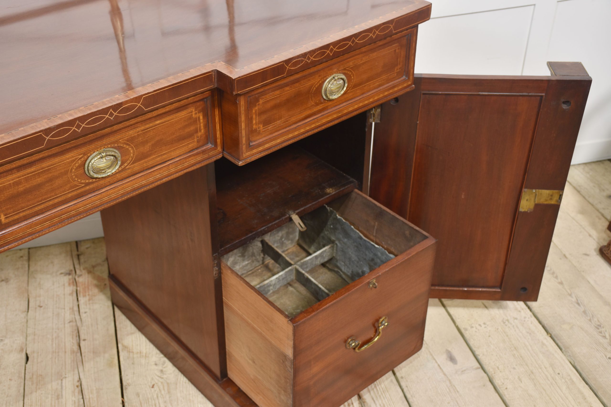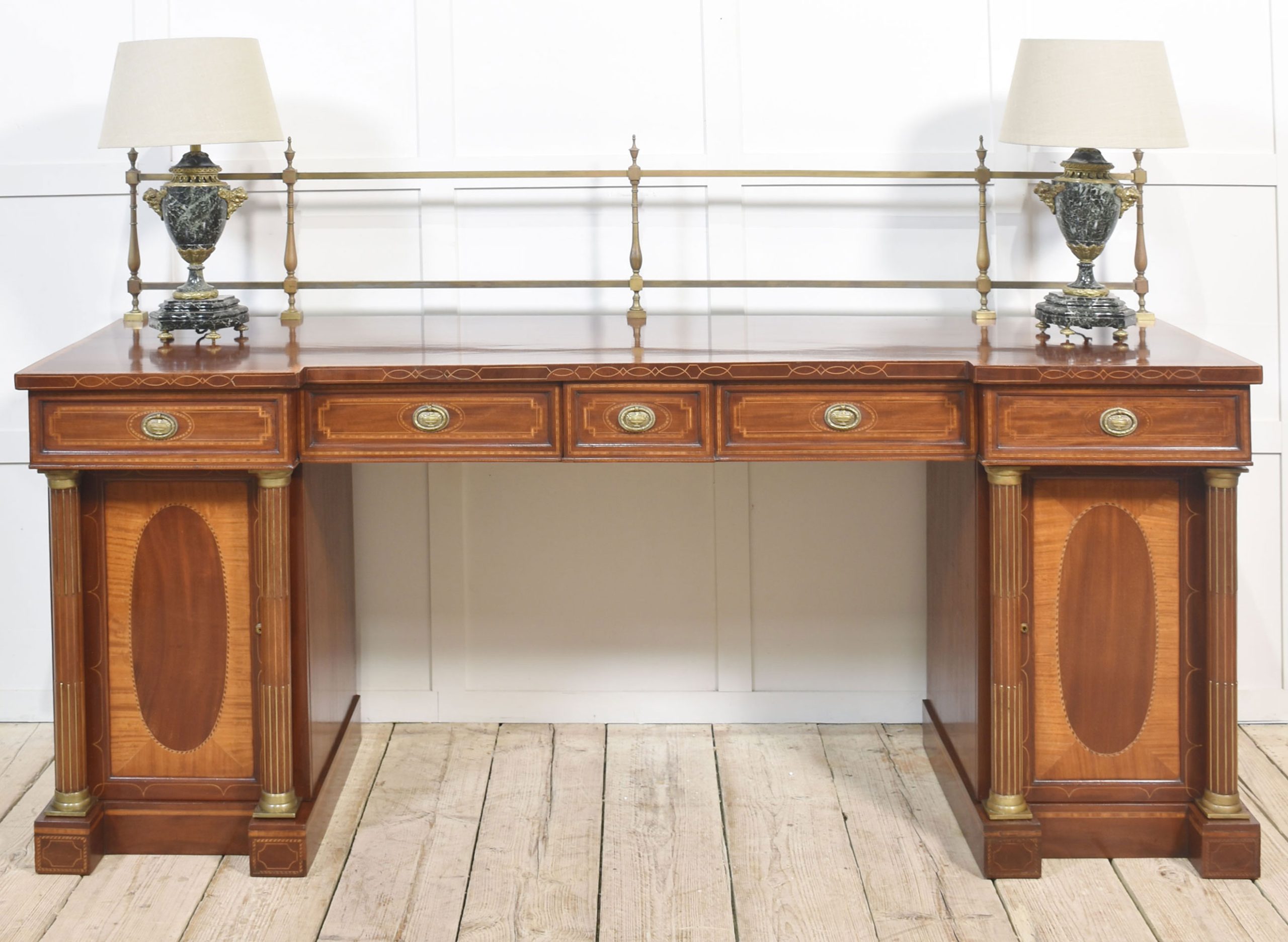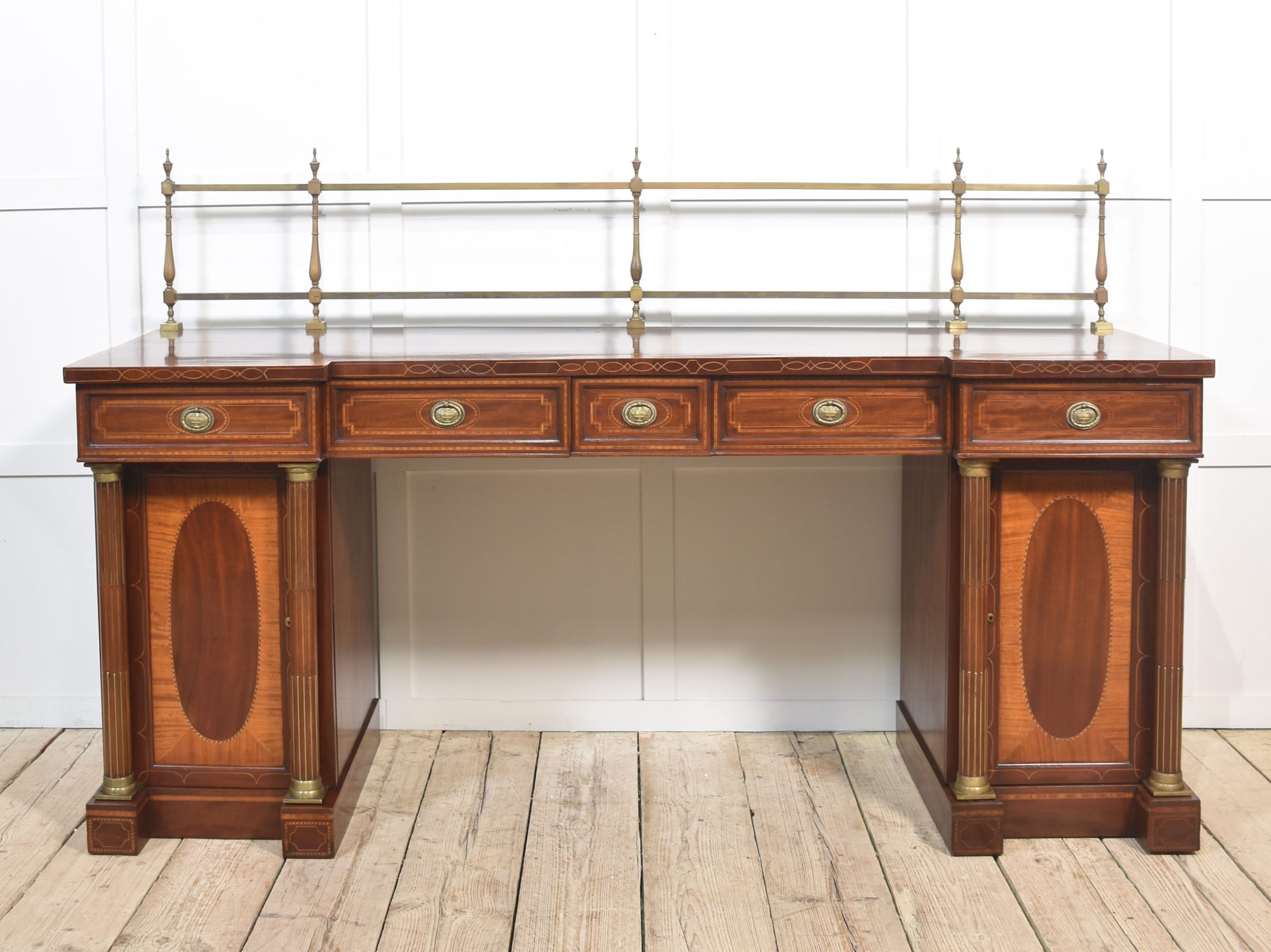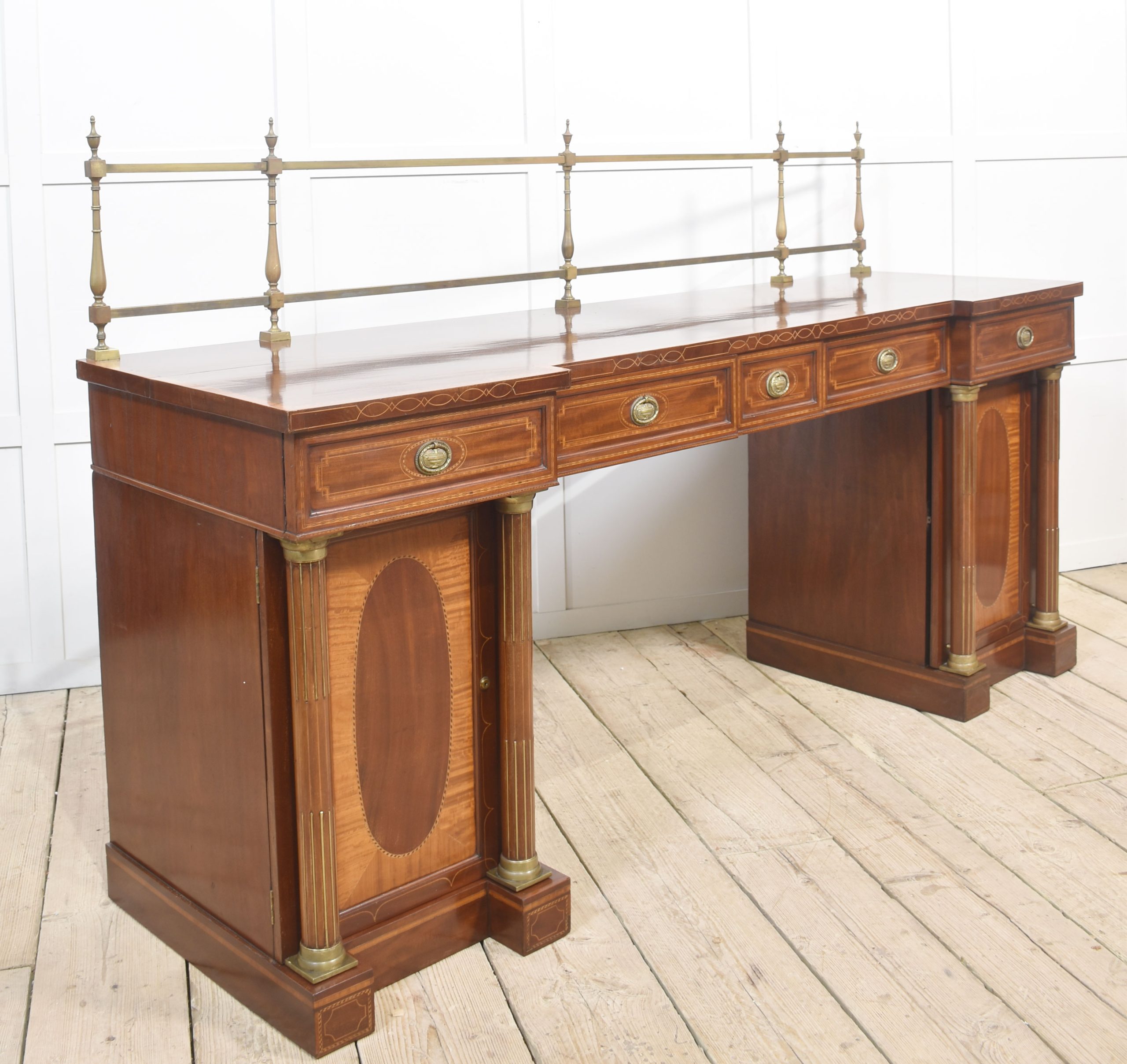 Sheraton revival mahogany inlaid sideboard. The raised brass gallery back above large mahogany inverted breakfront top with satinwood crossbanded edge to the frieze fitted with an arrangement of drawers all having brass tooled handles. All raised up on a pair of pedestals with oval inlaid paneled doors flanked by brass inlaid columns. One pedestal fitted with the original lead-lined cellaret. Terminating in plinth base.