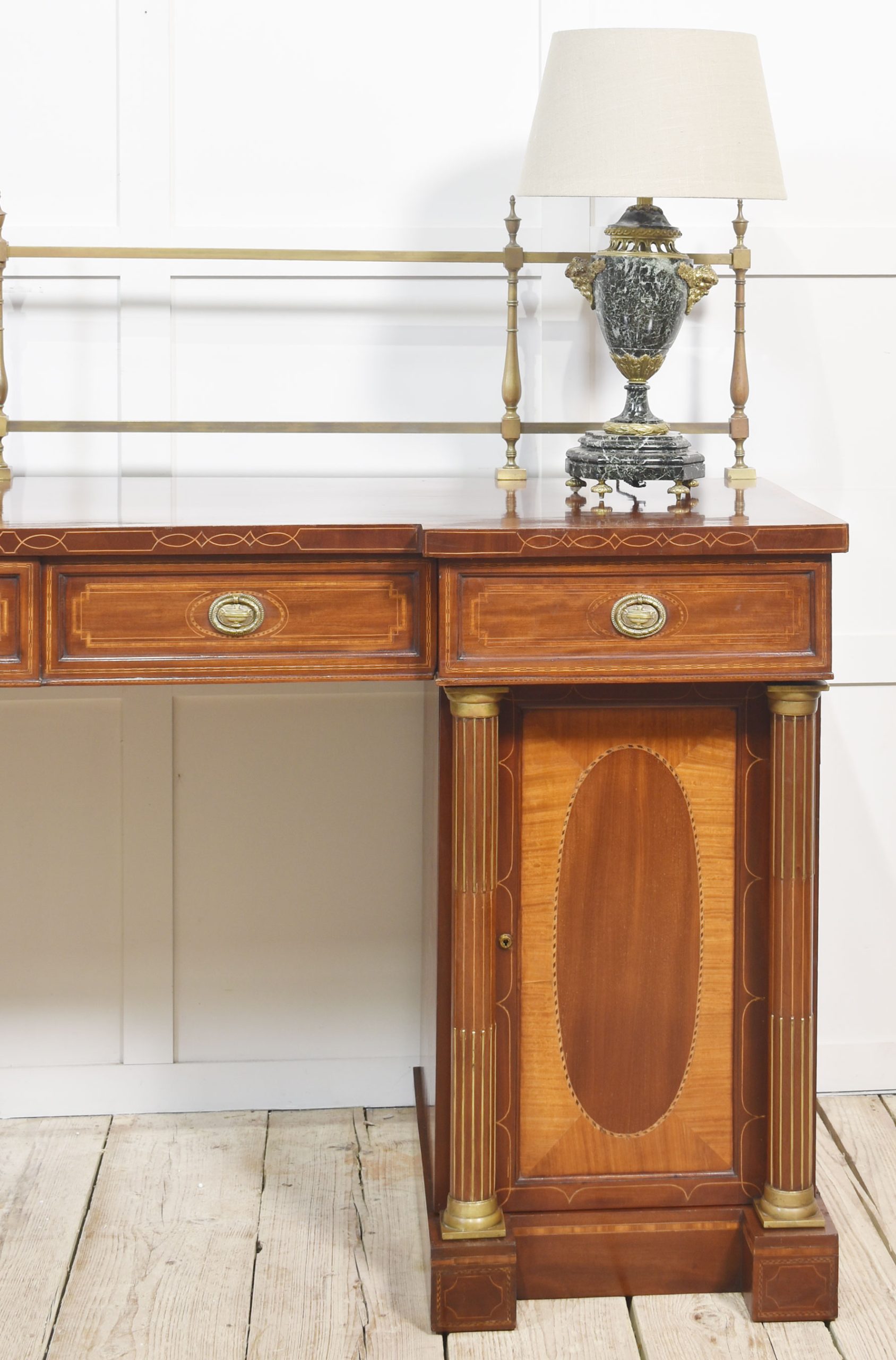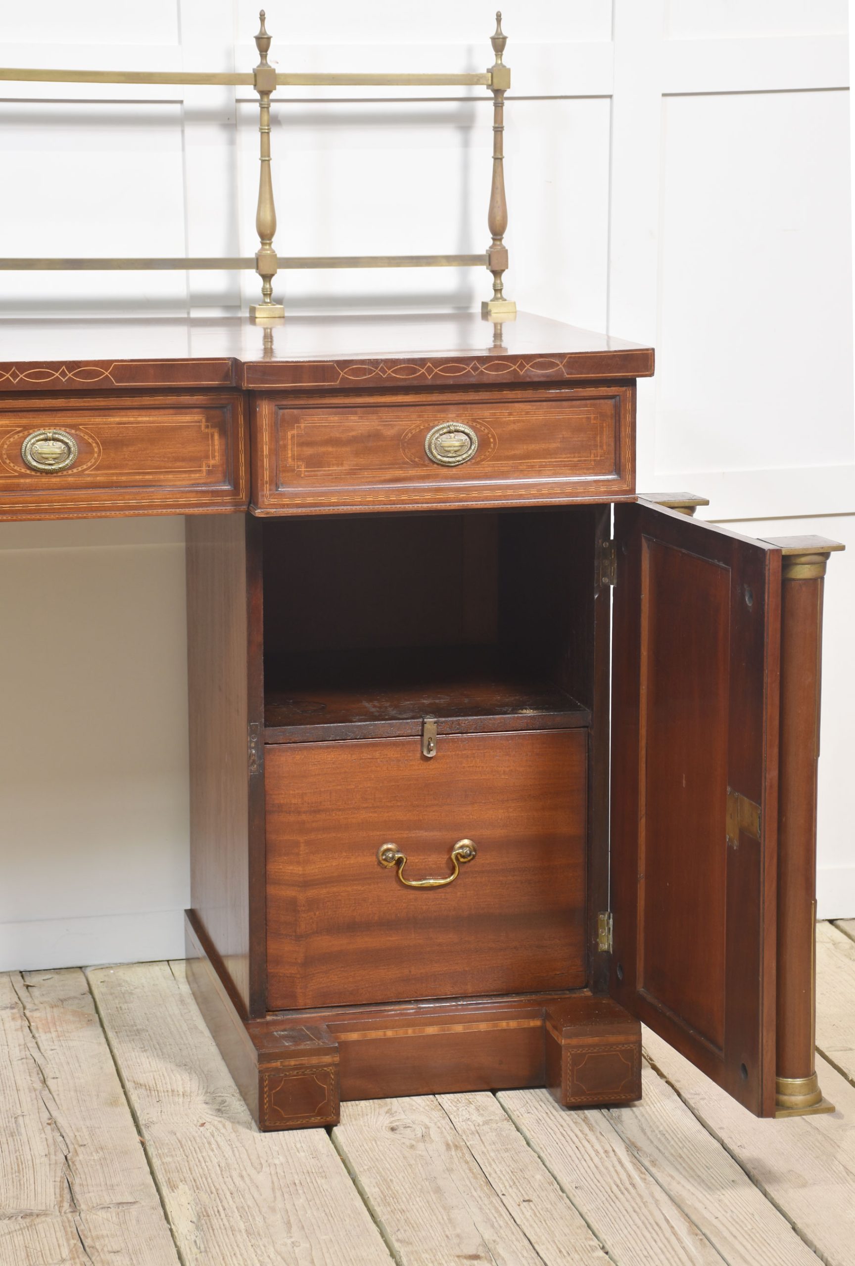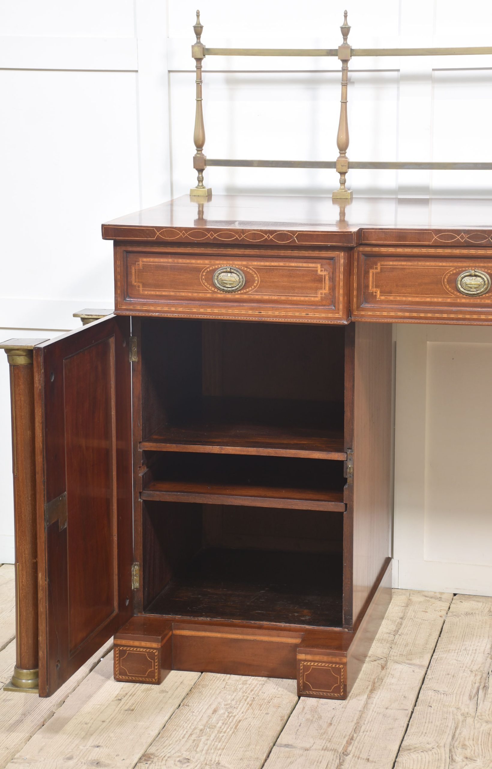 Sheraton revival mahogany inlaid sideboard. The raised brass gallery back above large mahogany inverted breakfront top with satinwood crossbanded edge to the frieze fitted with an arrangement of drawers all having brass tooled handles. All raised up on a pair of pedestals with oval inlaid paneled doors flanked by brass inlaid columns. One pedestal fitted with the original lead-lined cellaret. Terminating in plinth base.