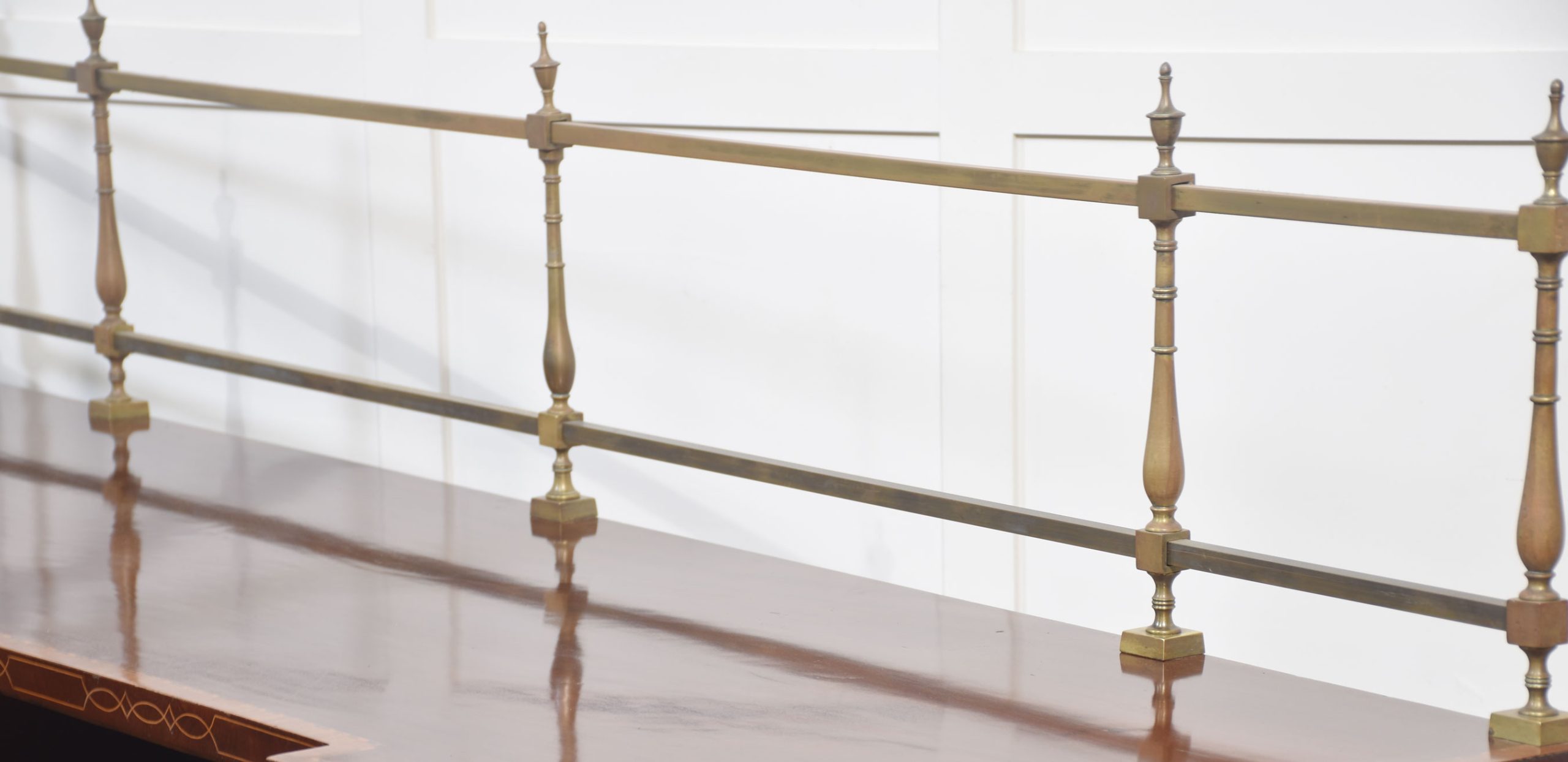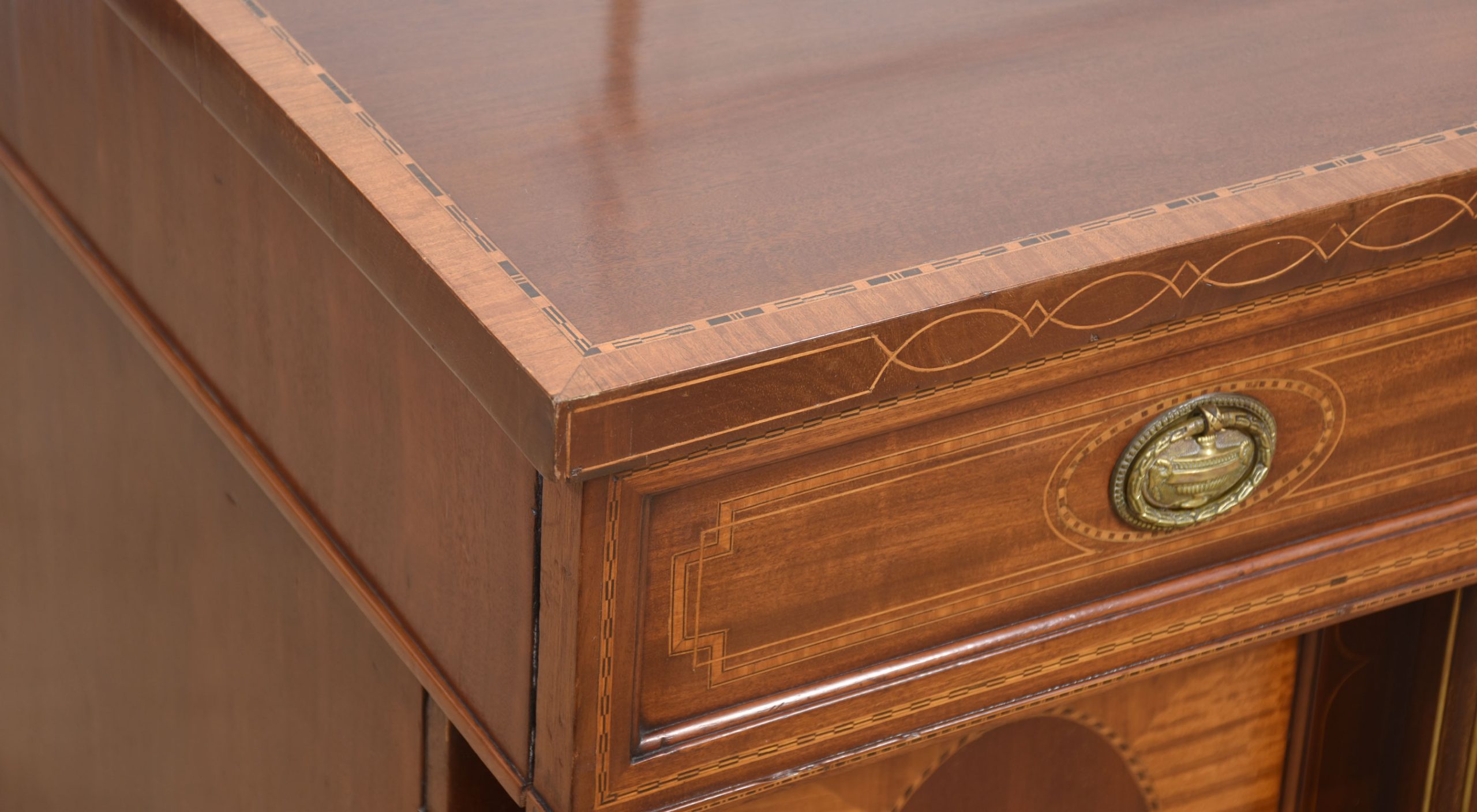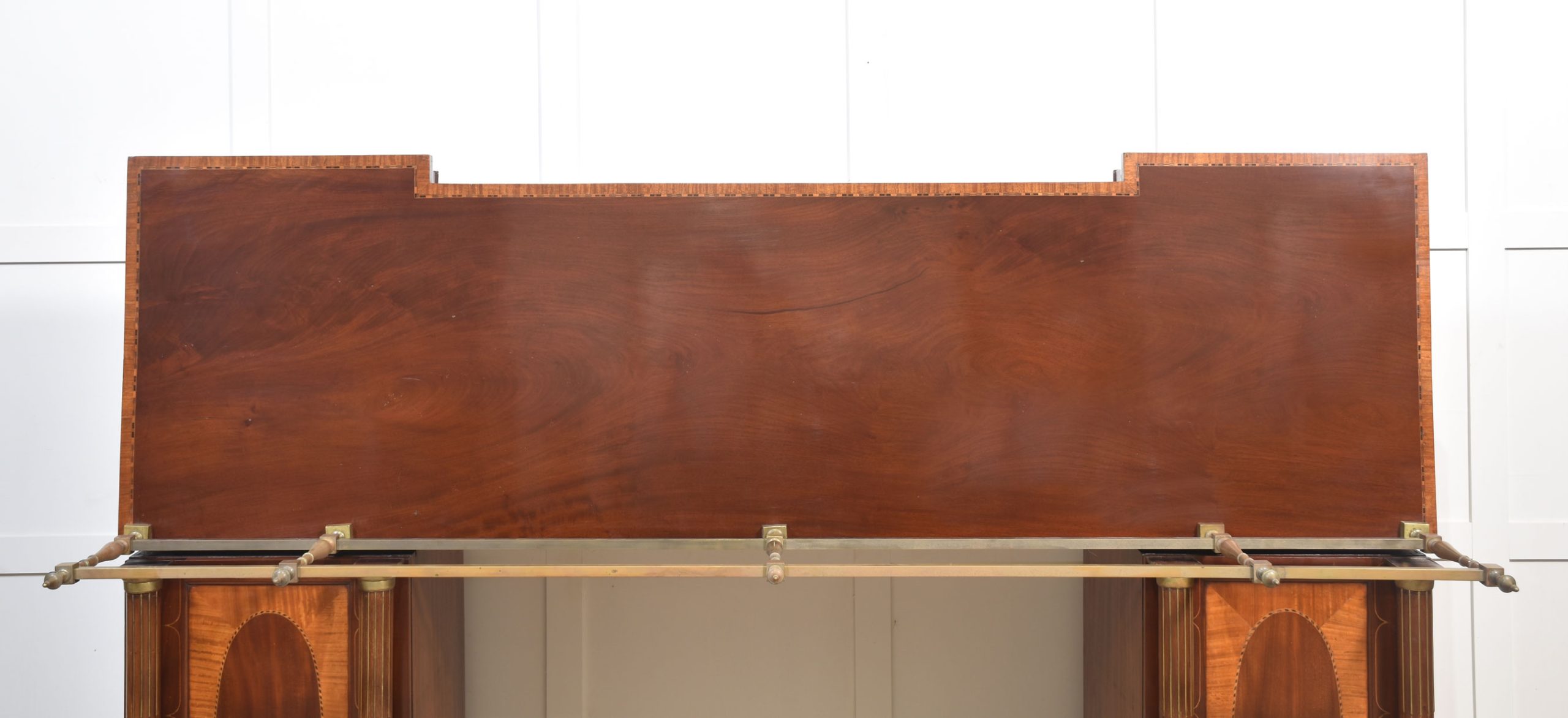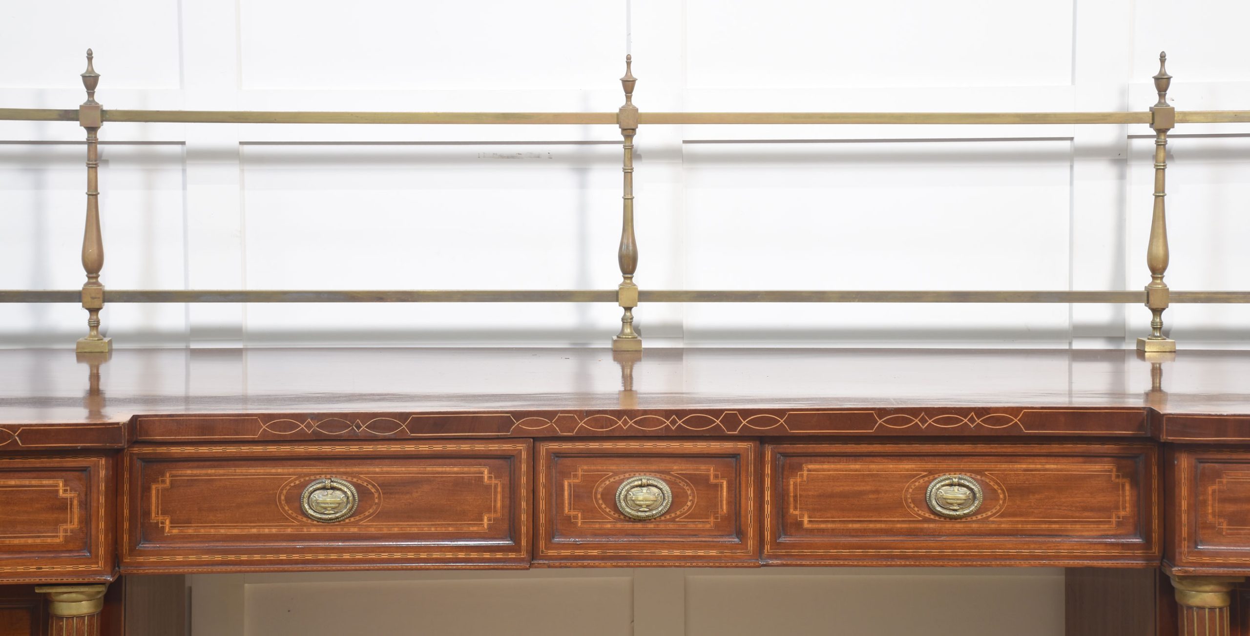 Sheraton revival mahogany inlaid sideboard. The raised brass gallery back above large mahogany inverted breakfront top with satinwood crossbanded edge to the frieze fitted with an arrangement of drawers all having brass tooled handles. All raised up on a pair of pedestals with oval inlaid paneled doors flanked by brass inlaid columns. One pedestal fitted with the original lead-lined cellaret. Terminating in plinth base.