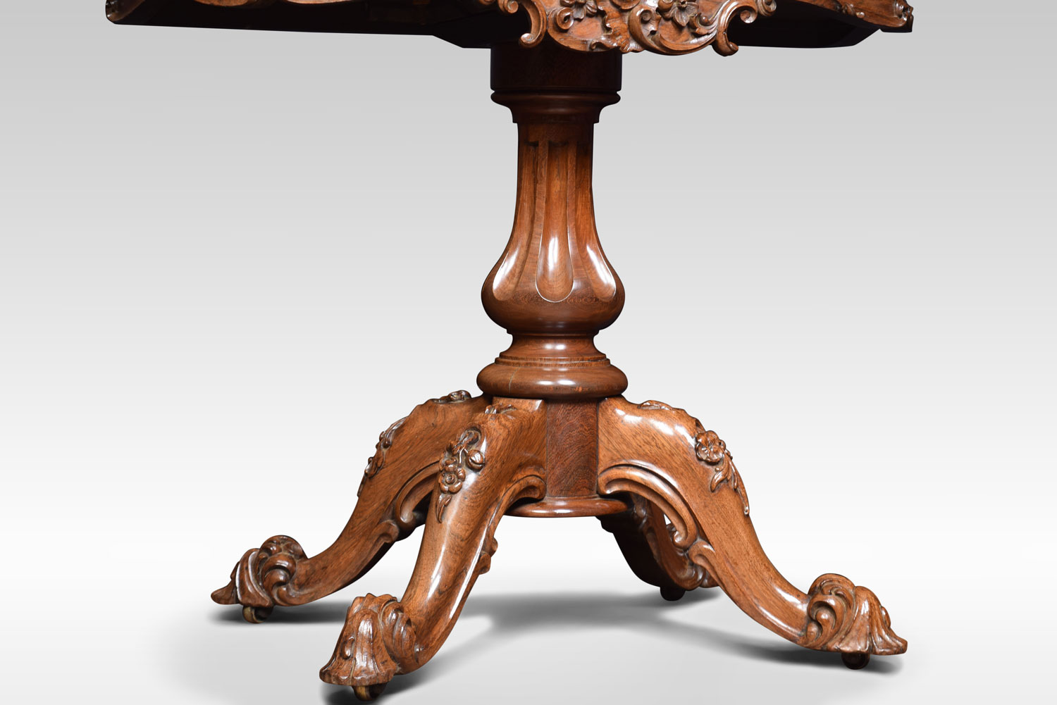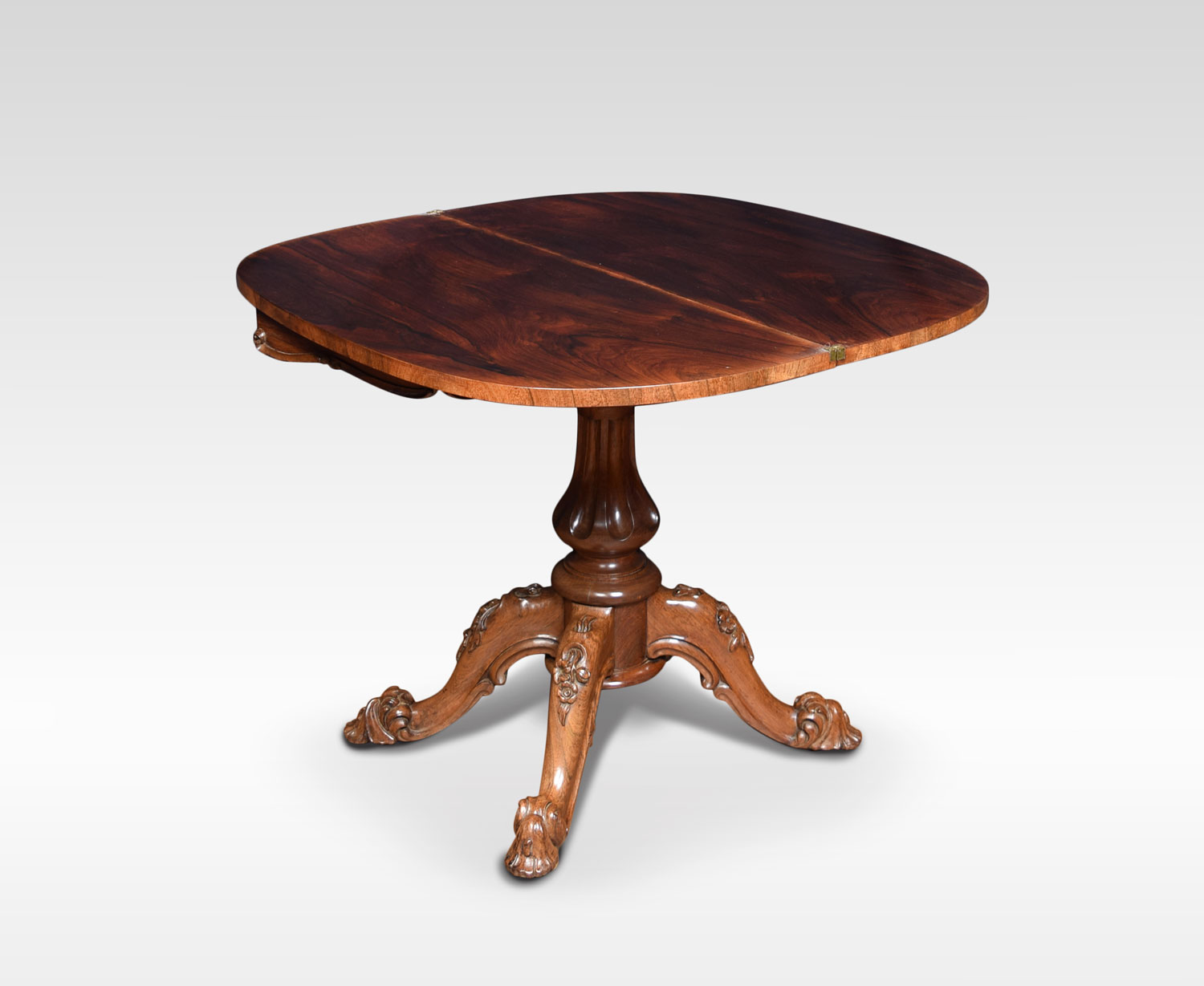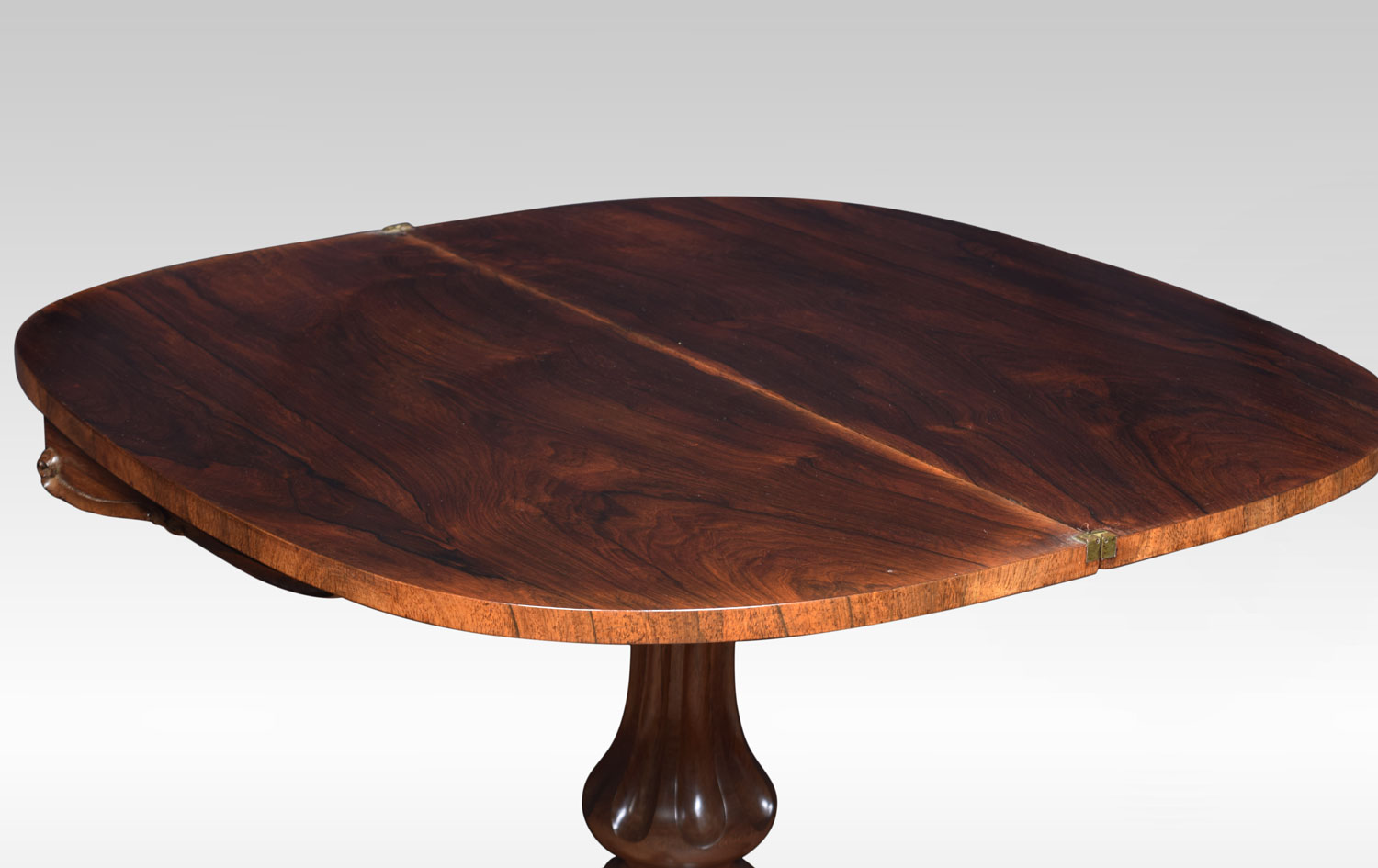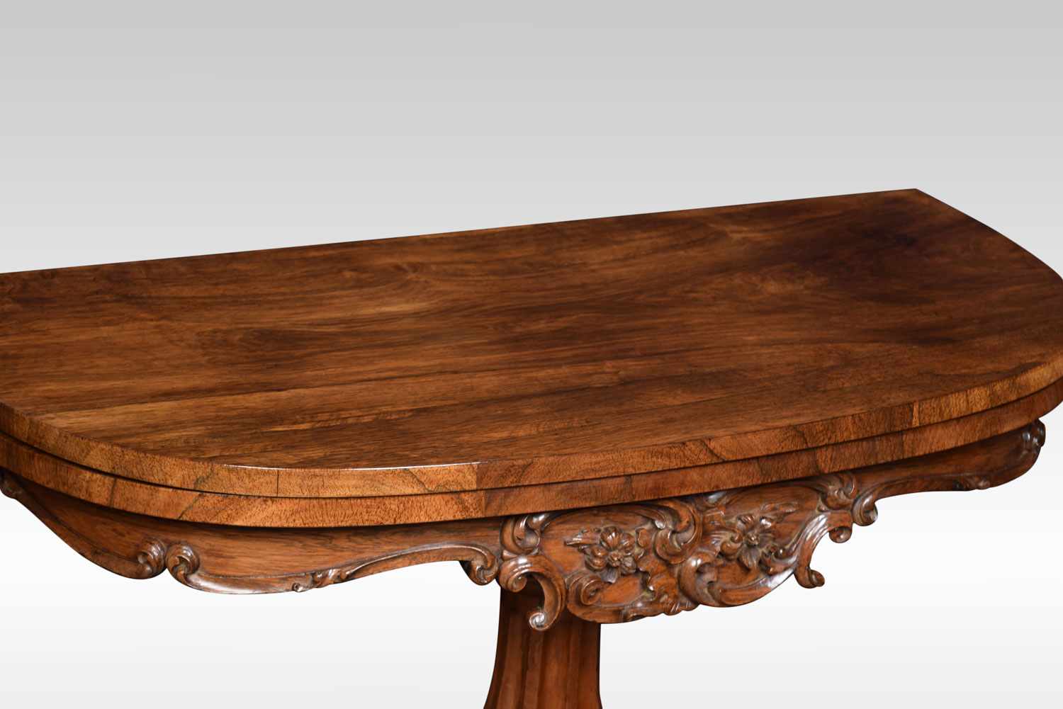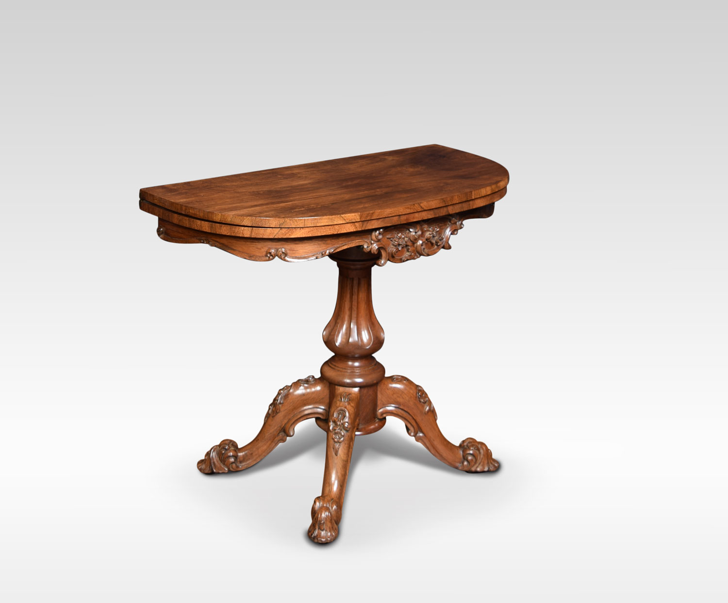 Victorian rosewood demi lune tea table, the folding and swivel rosewood top above carved freeze raised up on a turned and carved stem and conforming scroll legs terminating in brass castors.