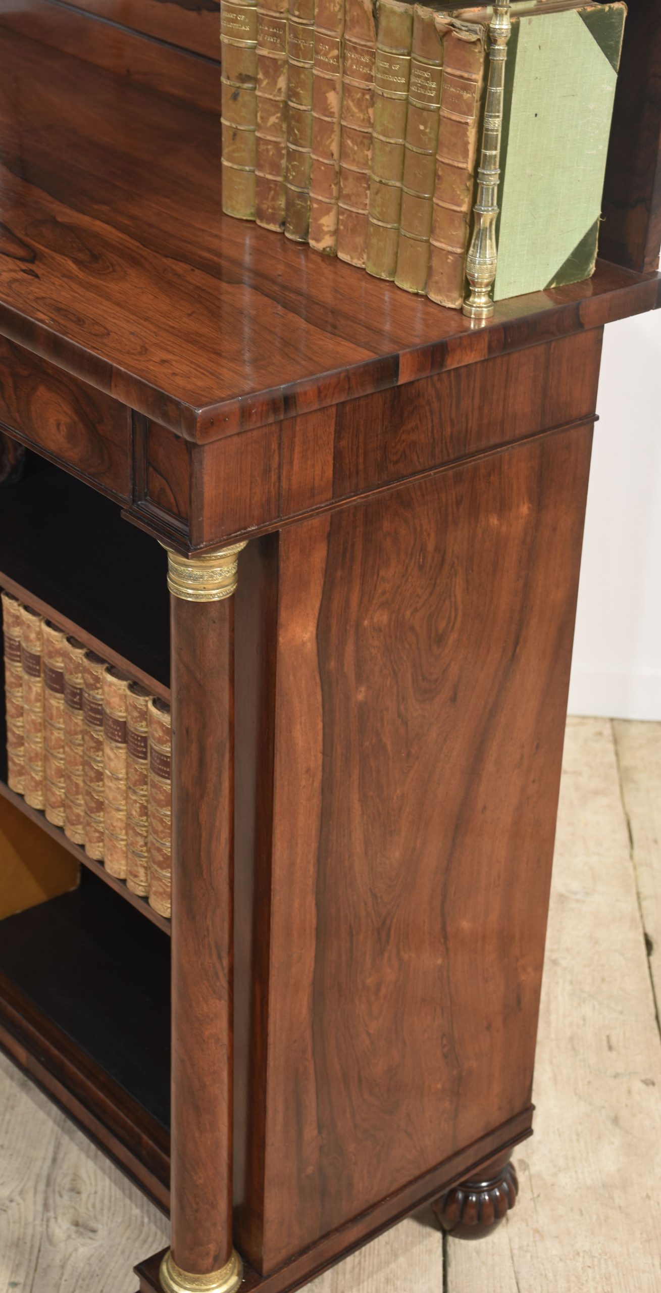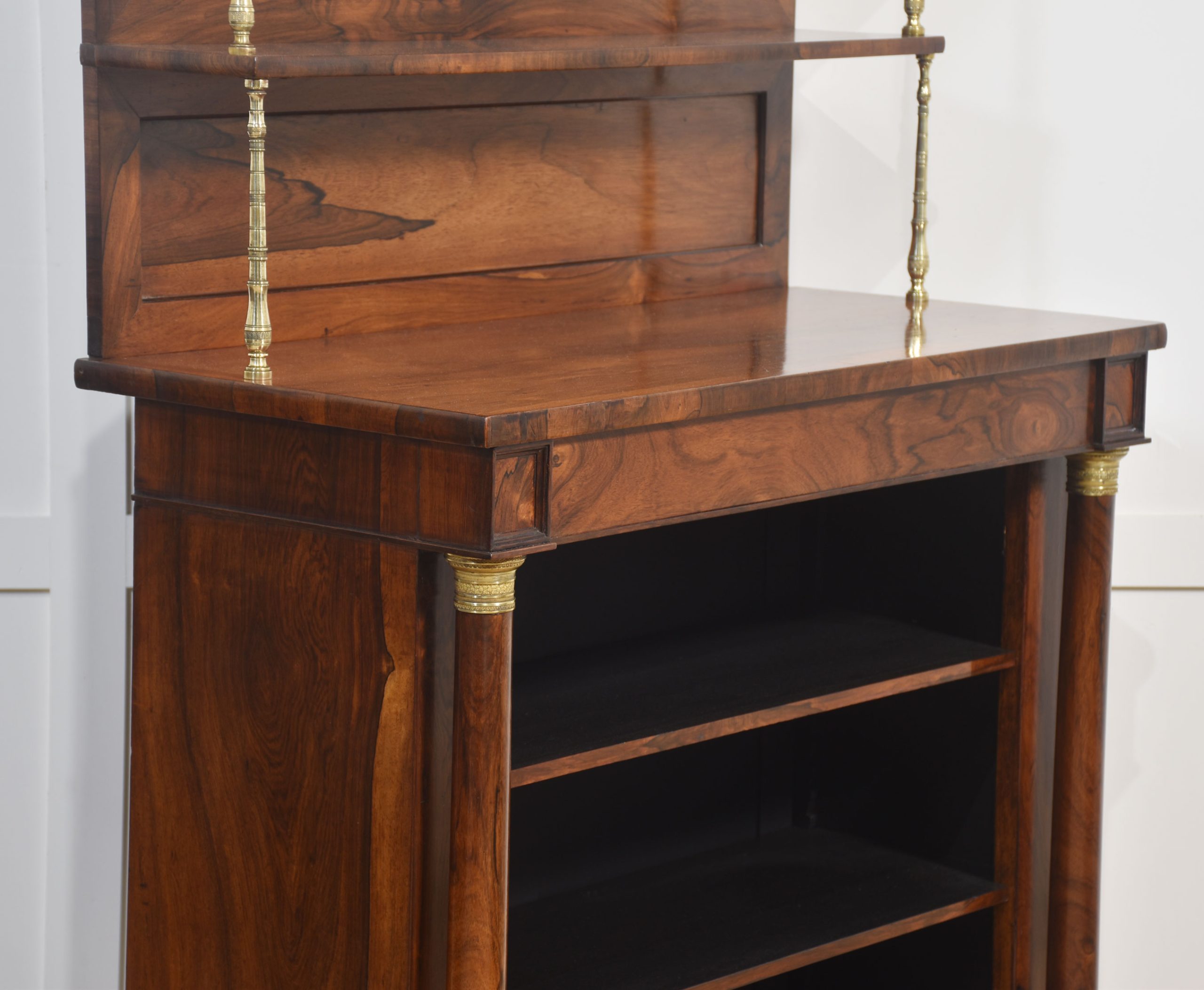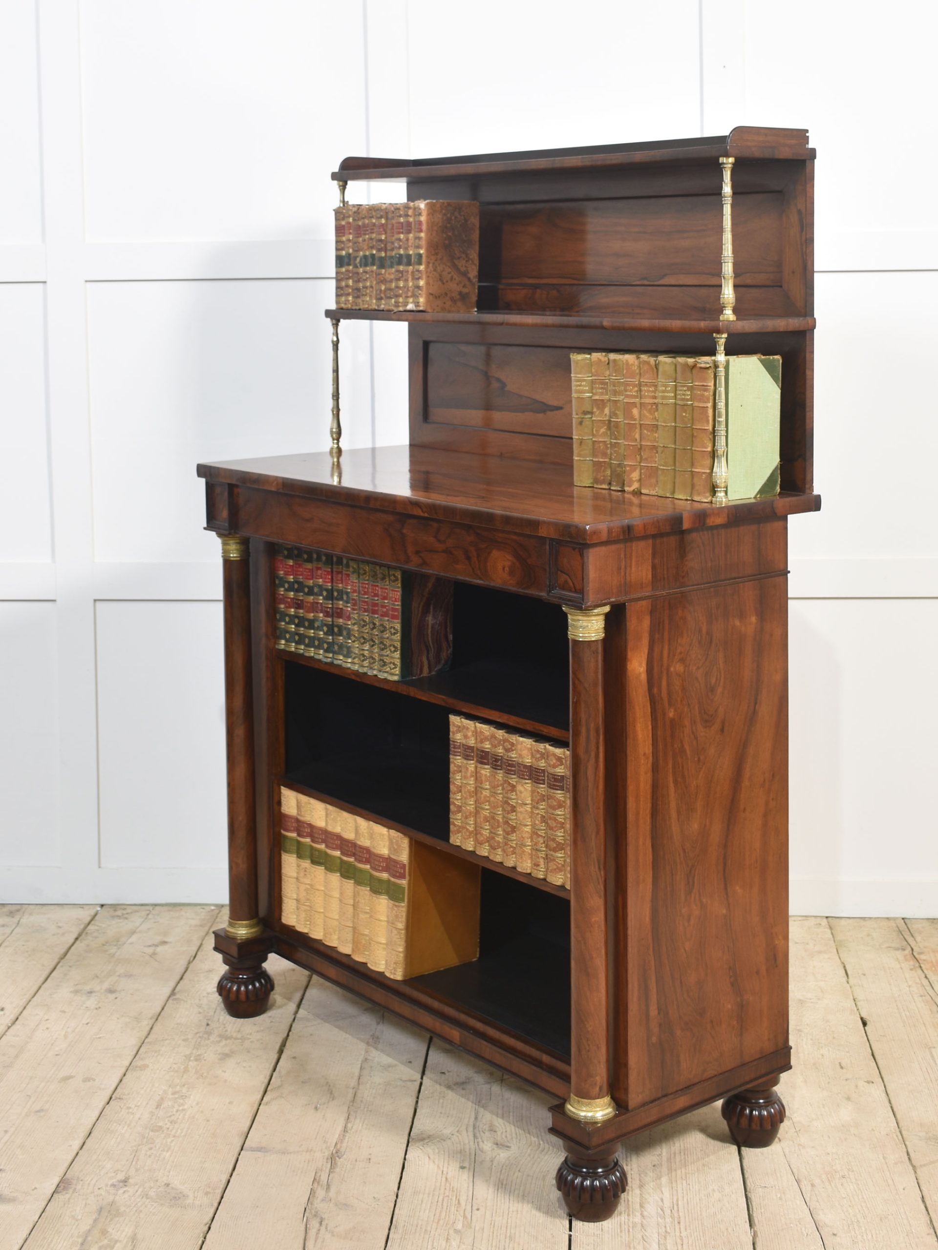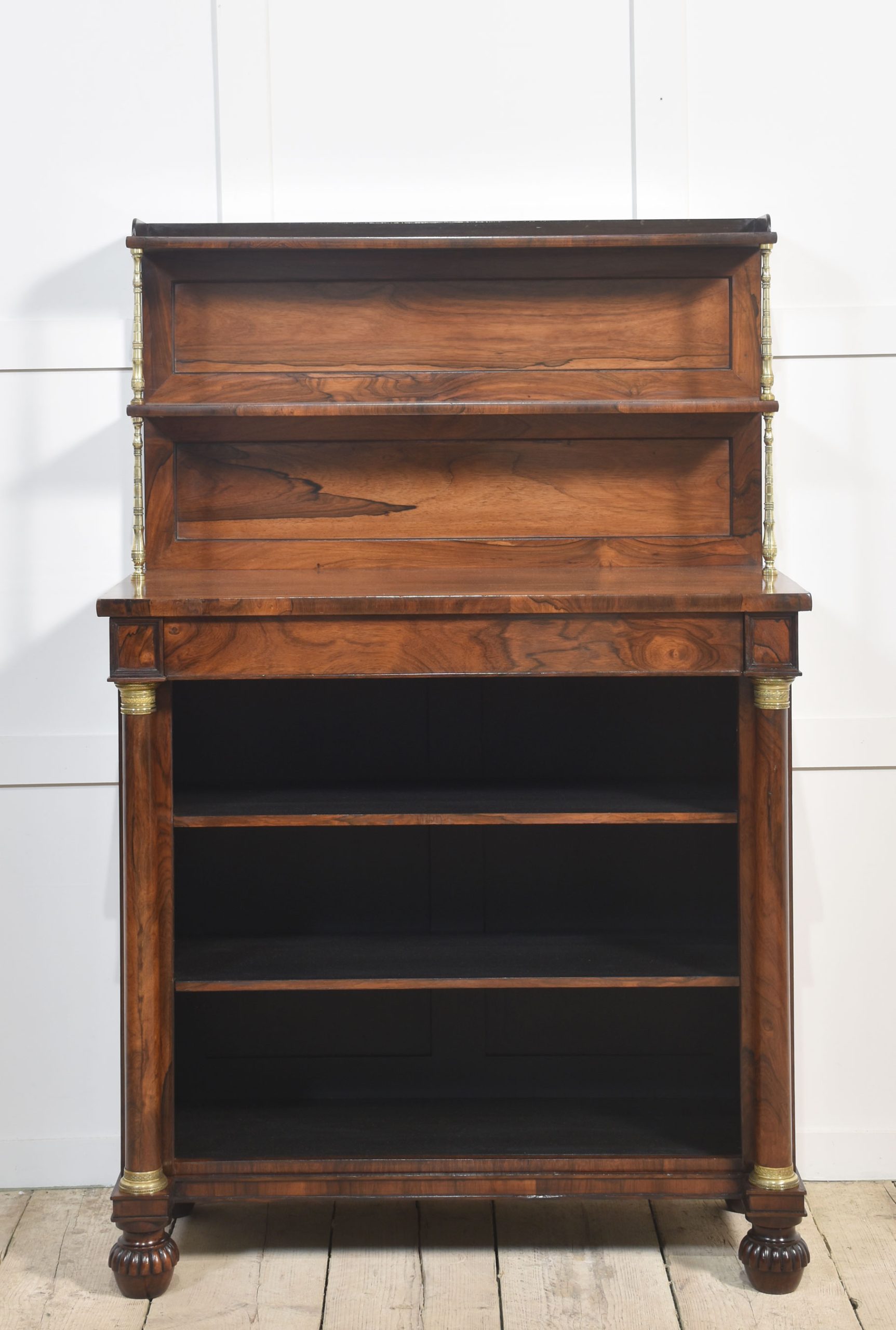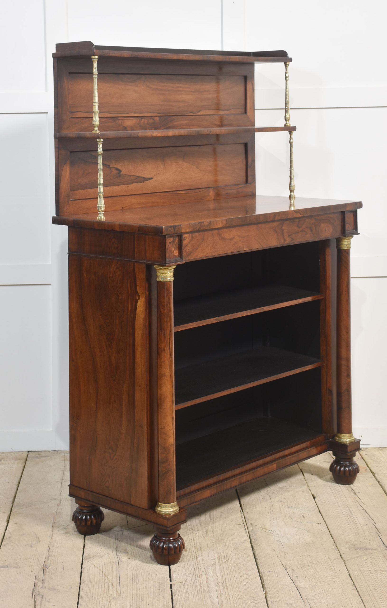19th-century rosewood open bookcase, the unusual two-tier gallery supported on brass turned columns to the well-figured top having a frieze drawer below. Above the adjustable shelved interior flanked by turned columns. All raised up on carved feet.