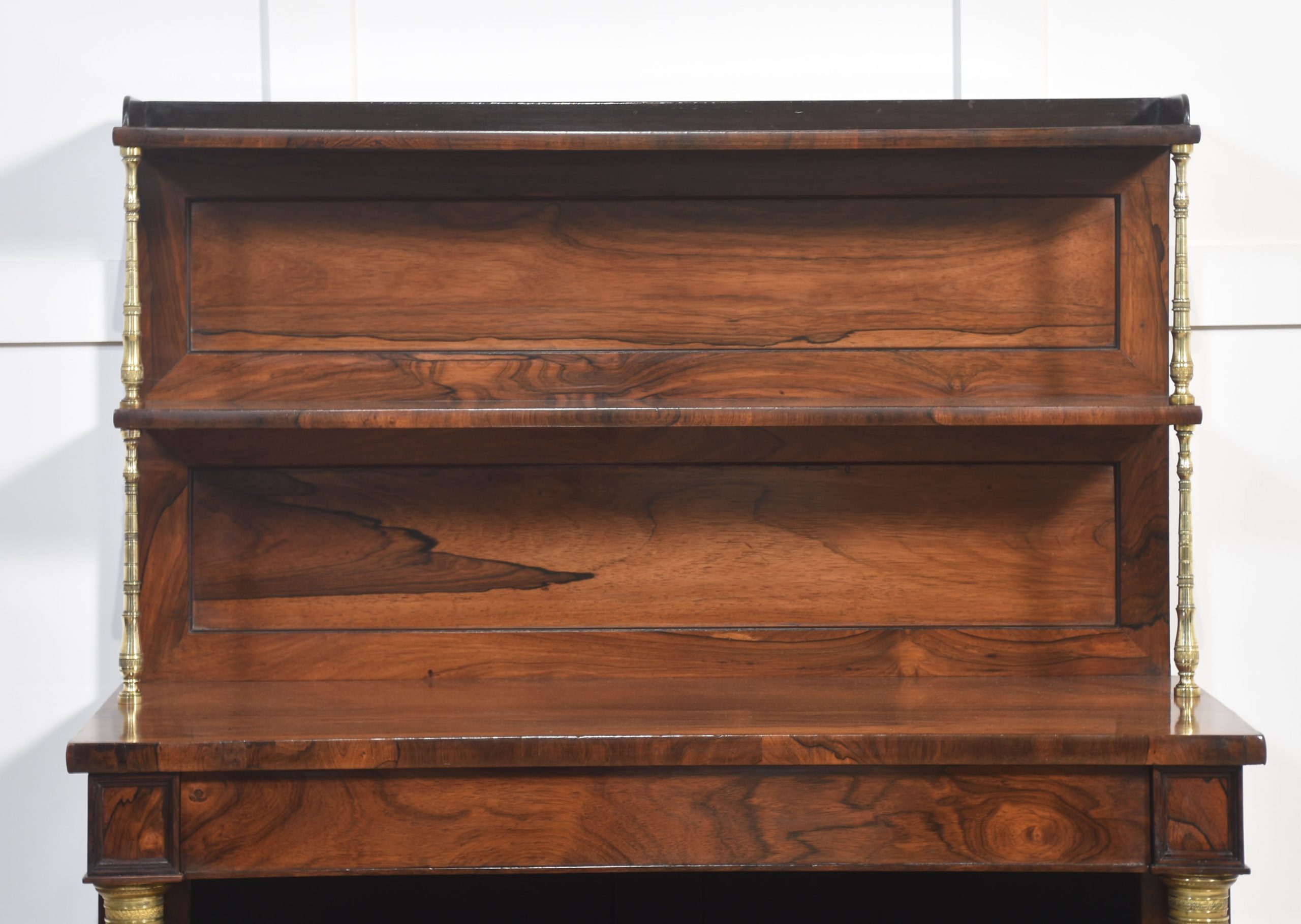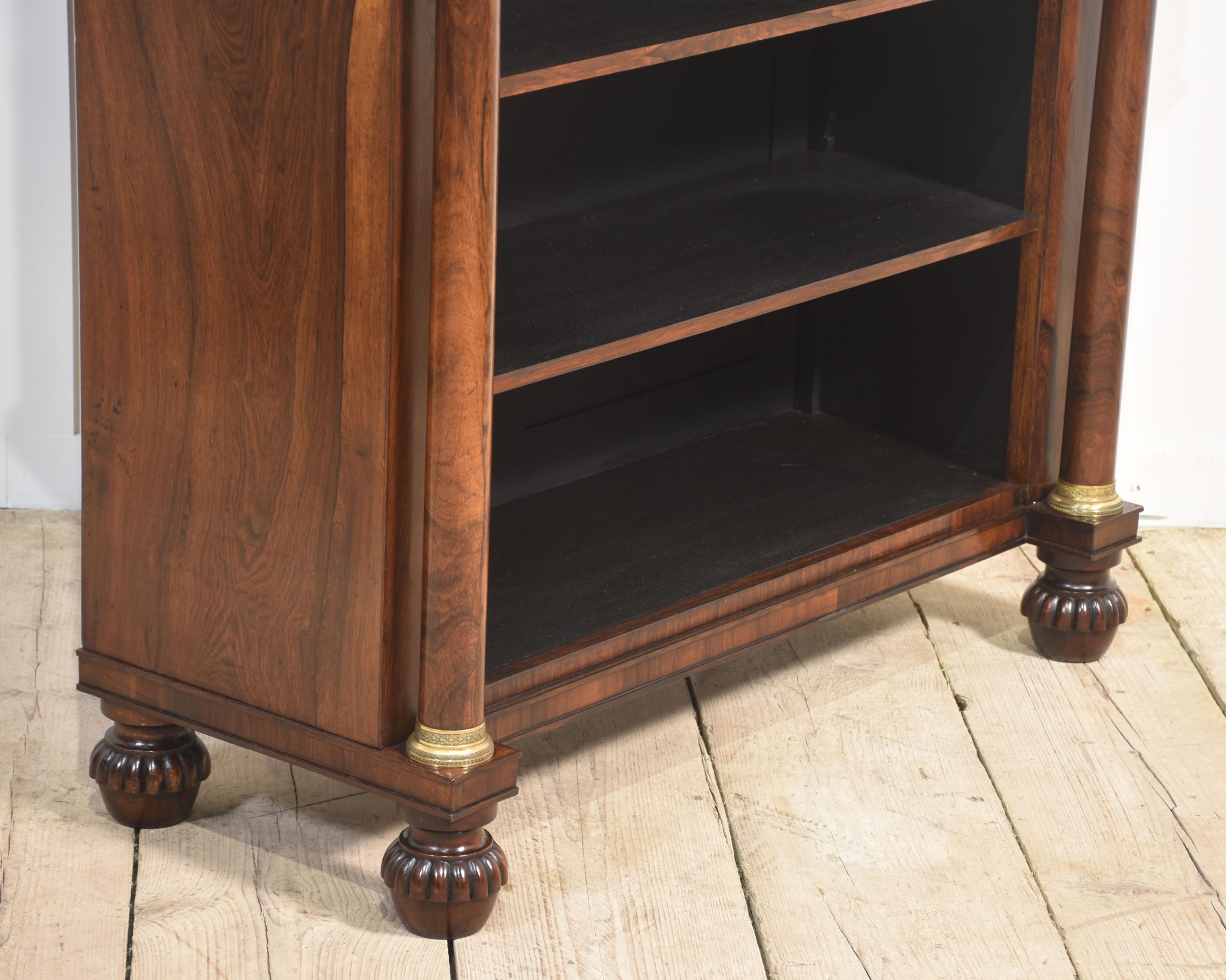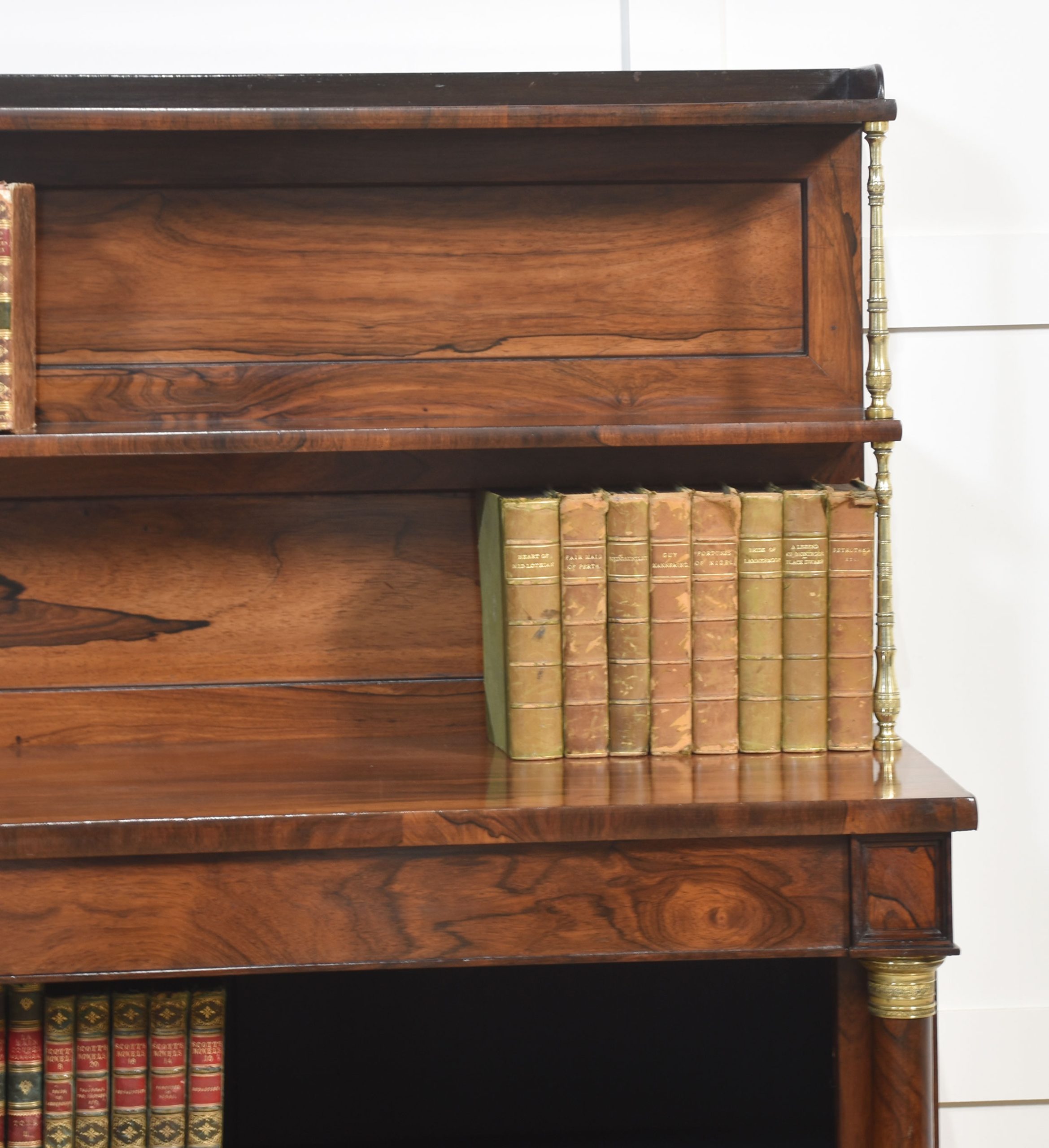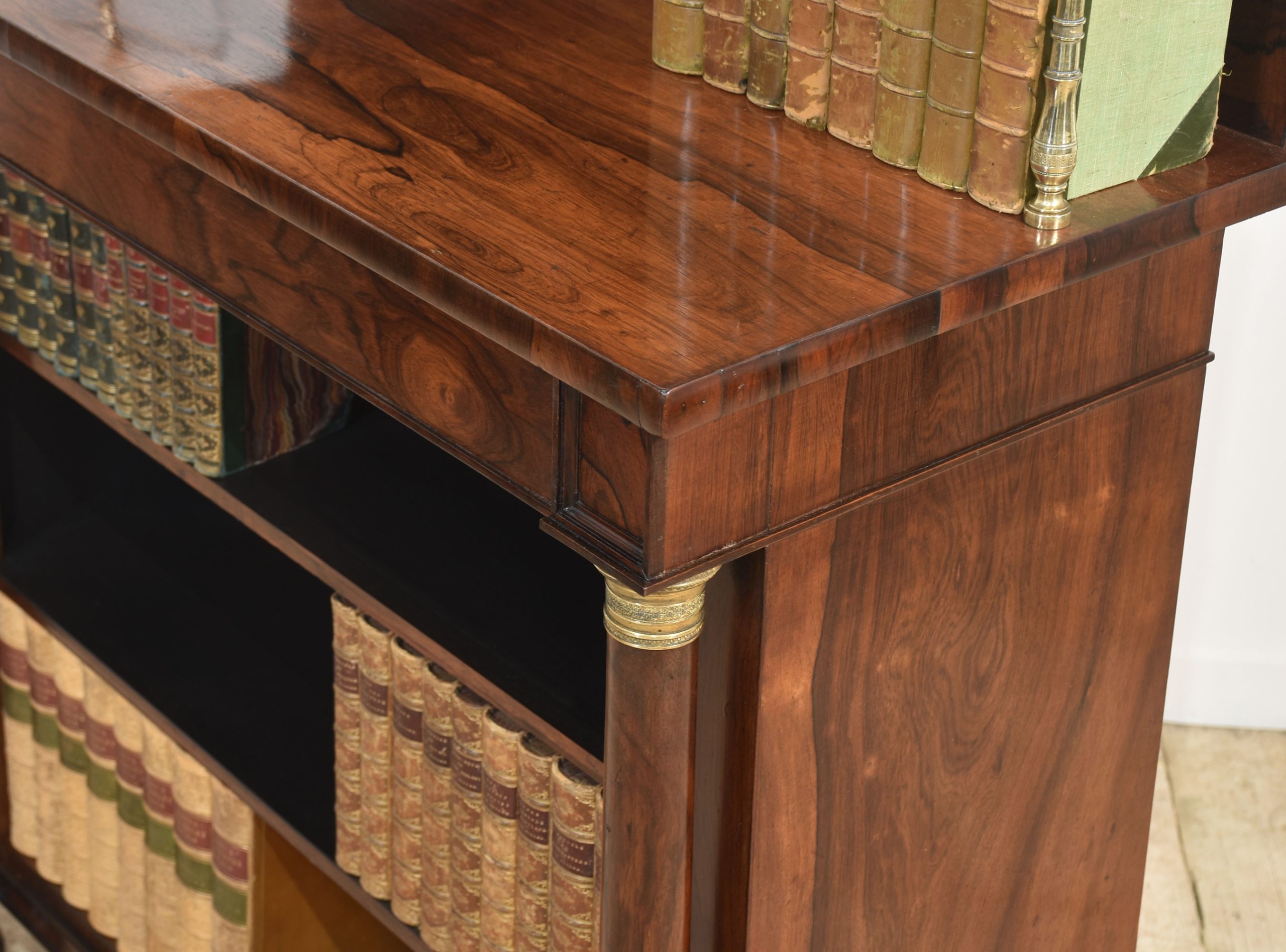 19th-century rosewood open bookcase, the unusual two-tier gallery supported on brass turned columns to the well-figured top having a frieze drawer below. Above the adjustable shelved interior flanked by turned columns. All raised up on carved feet.