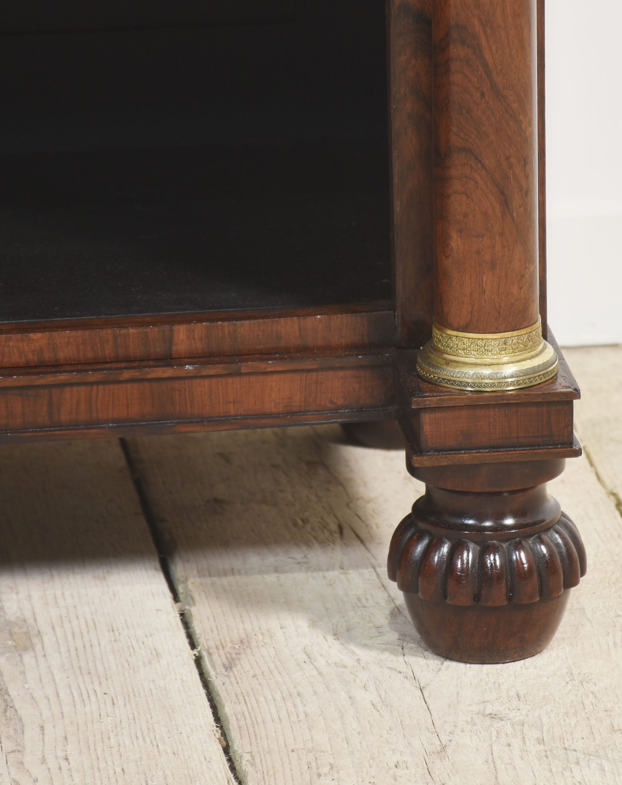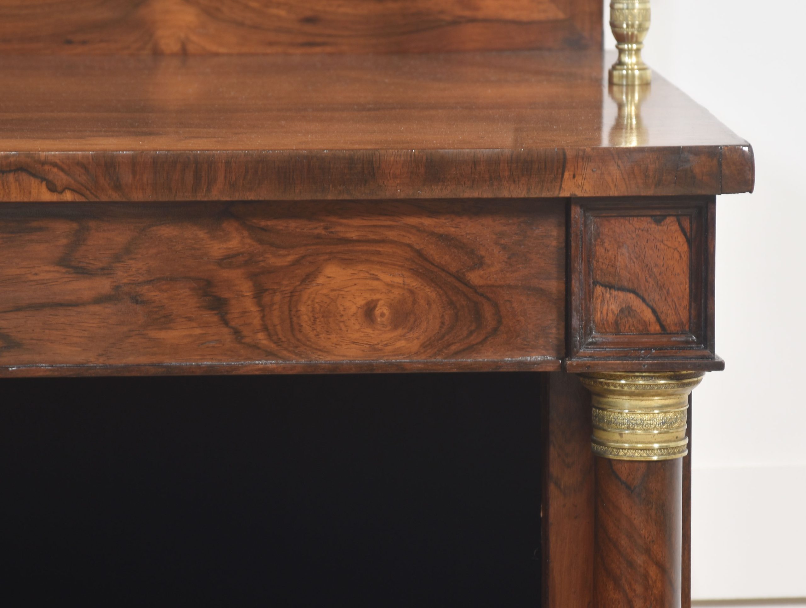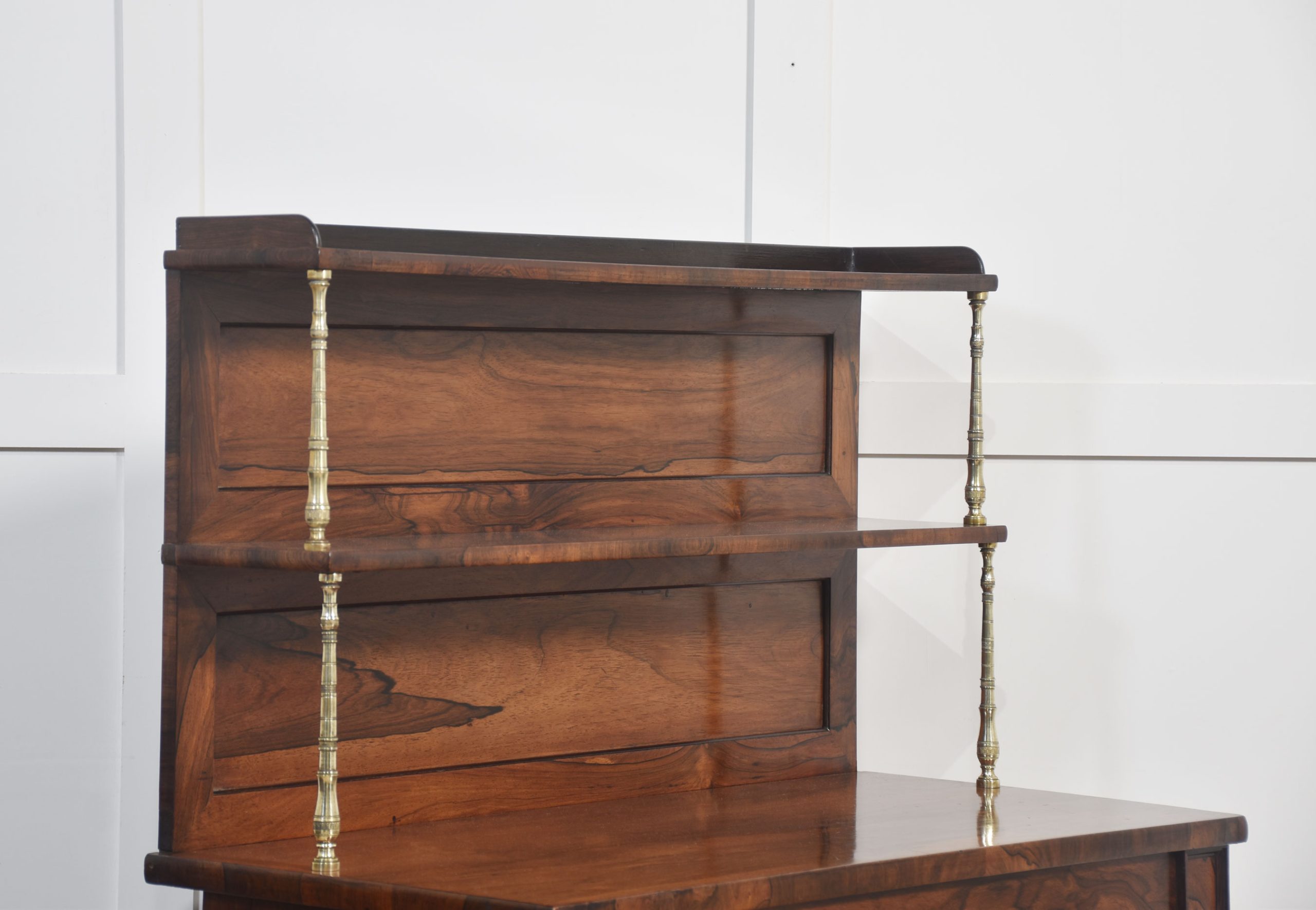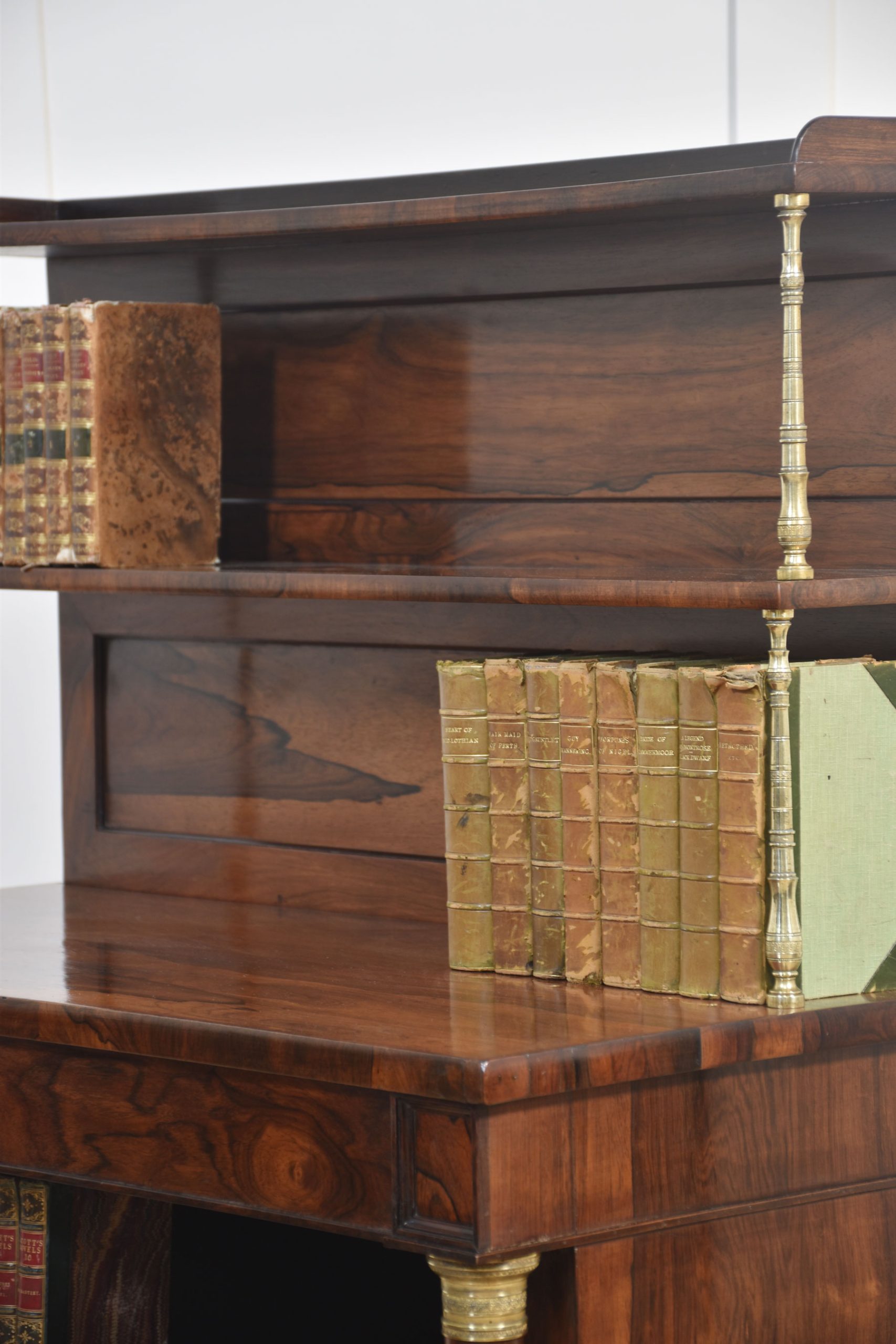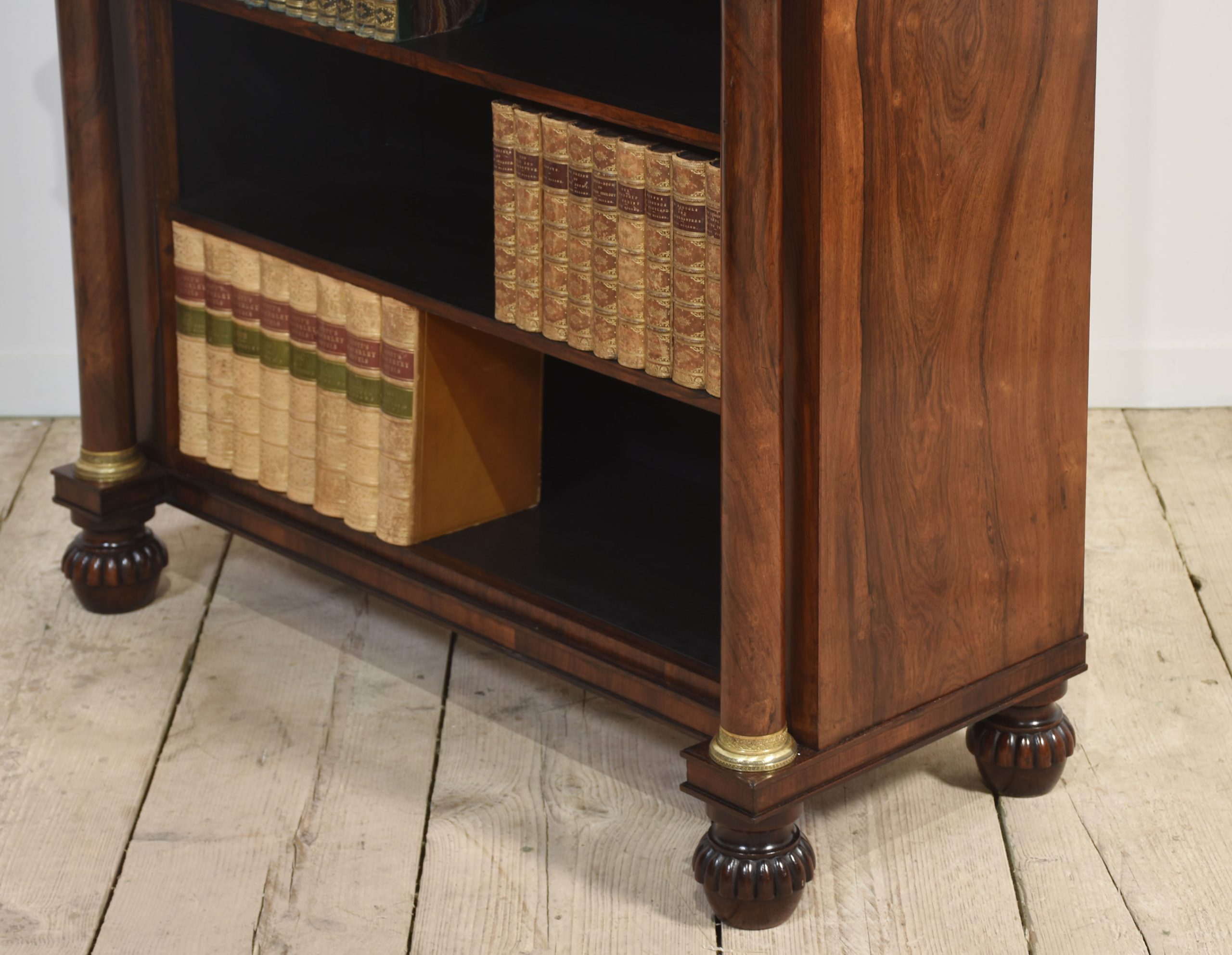 19th-century rosewood open bookcase, the unusual two-tier gallery supported on brass turned columns to the well-figured top having a frieze drawer below. Above the adjustable shelved interior flanked by turned columns. All raised up on carved feet.