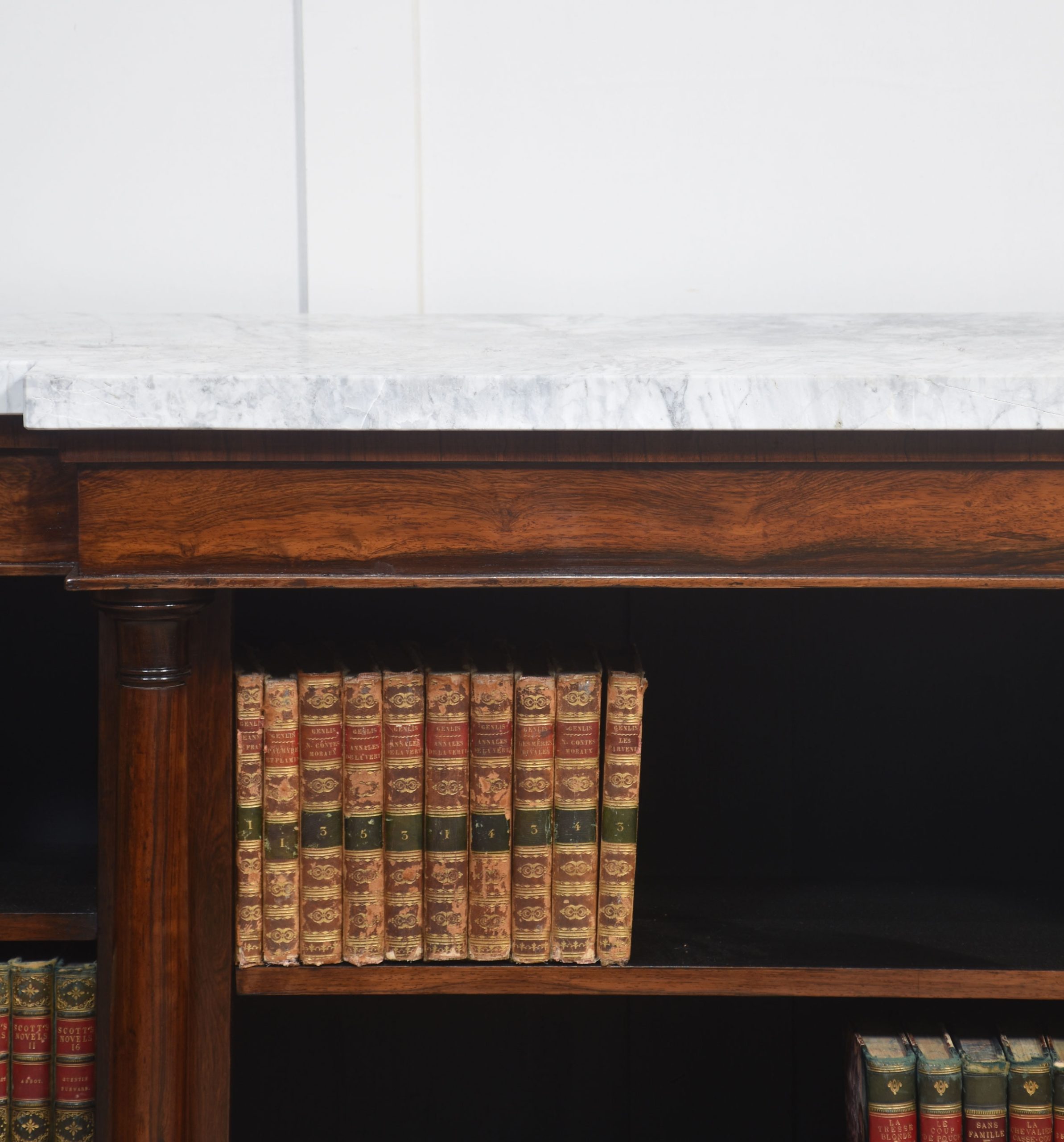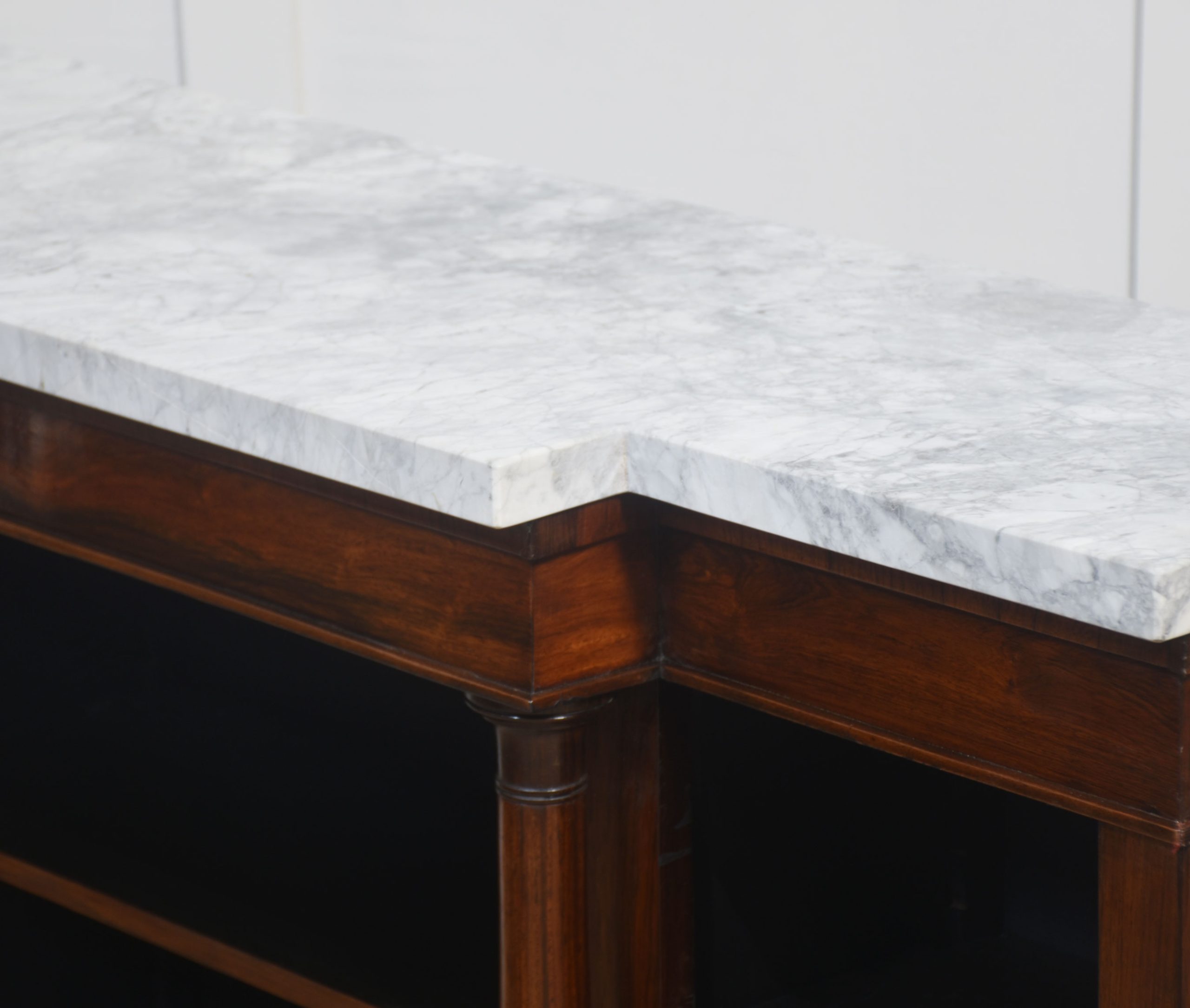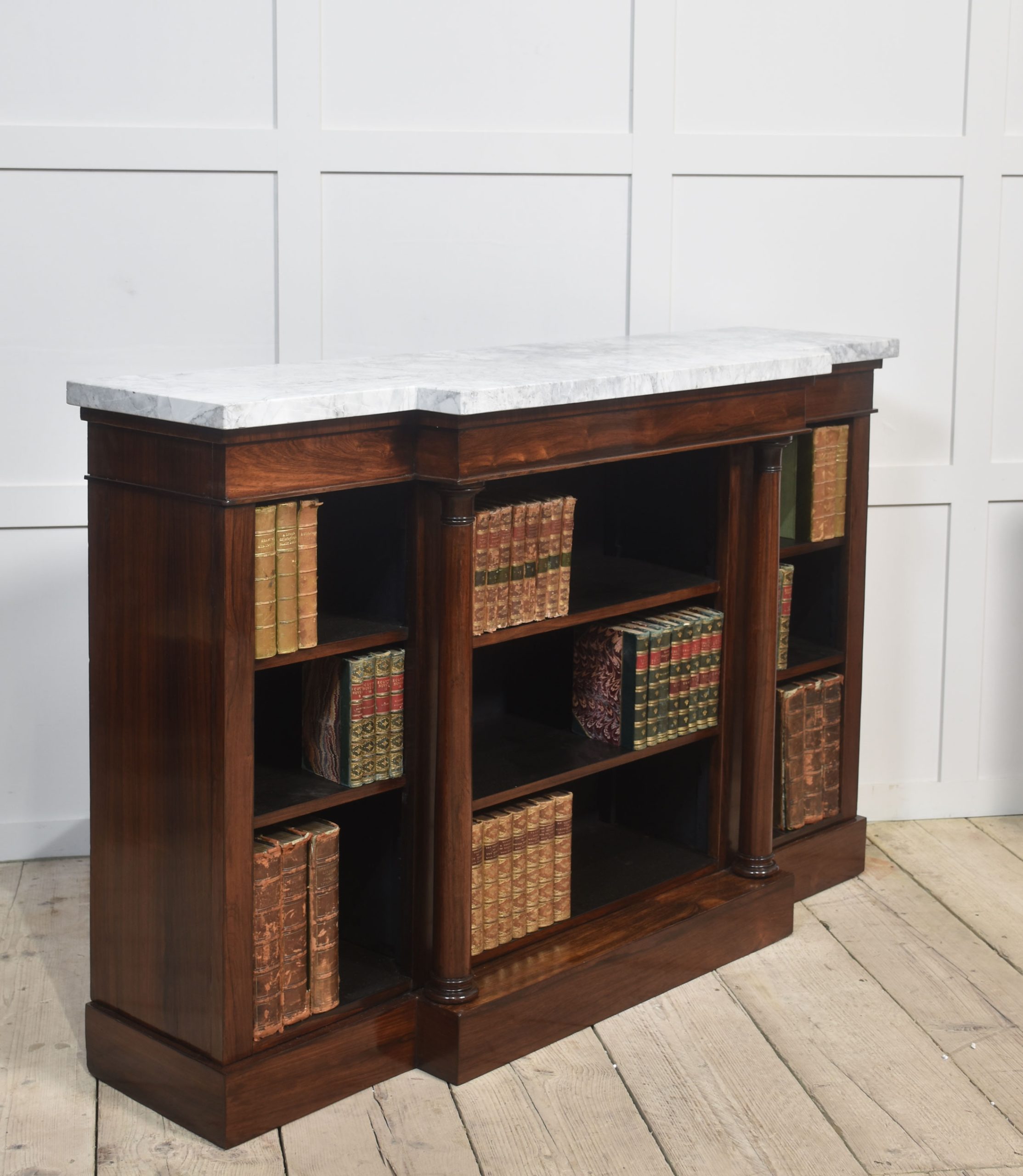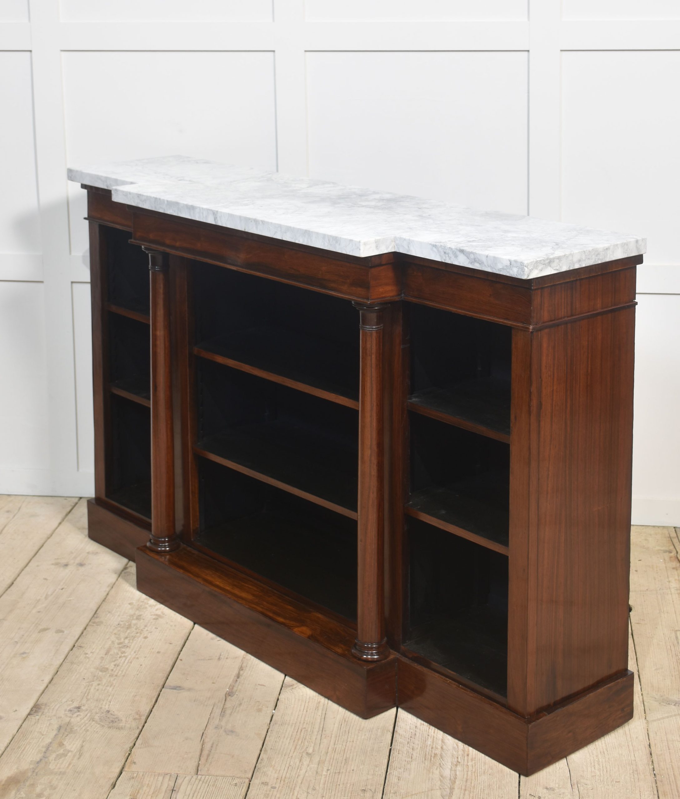 Rosewood open bookcase, the large rectangular well-figured marble breakfront top above three bays of adjustable shelves, divided by circular column pilasters. All raised on a plinth base.