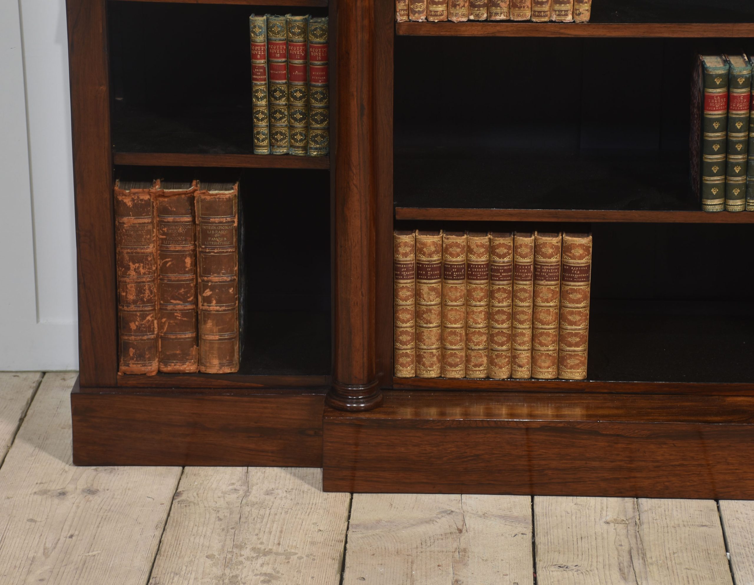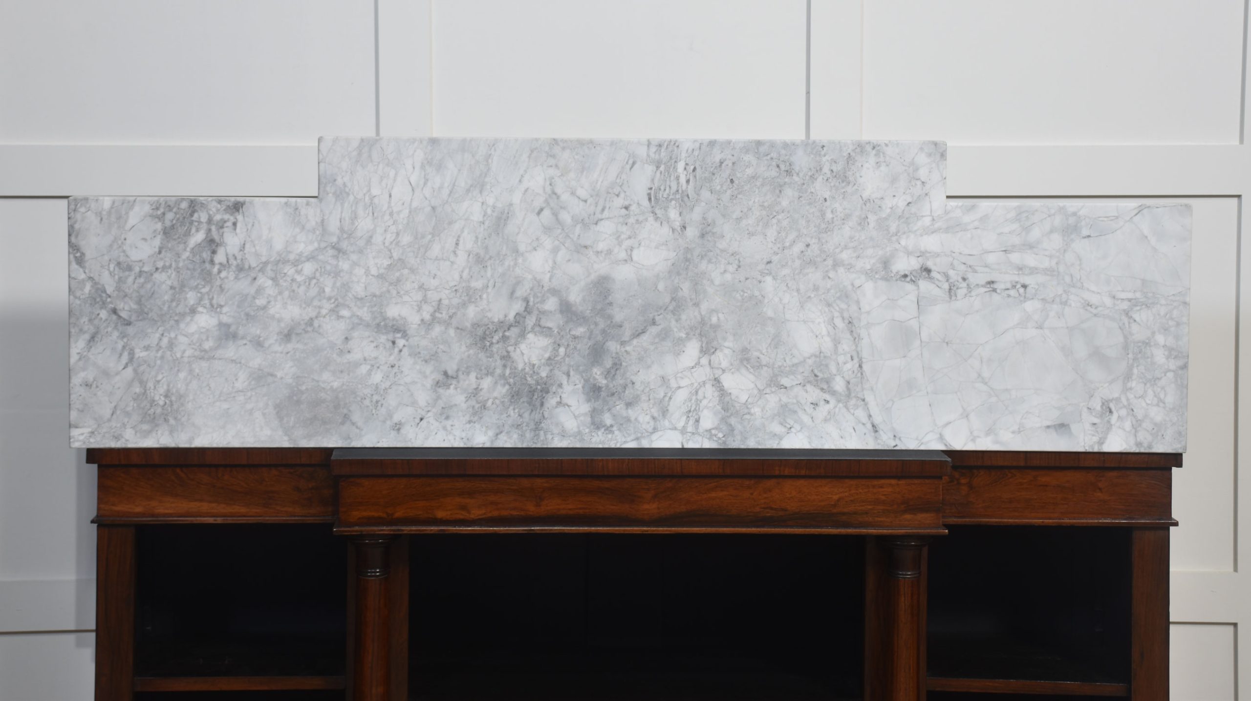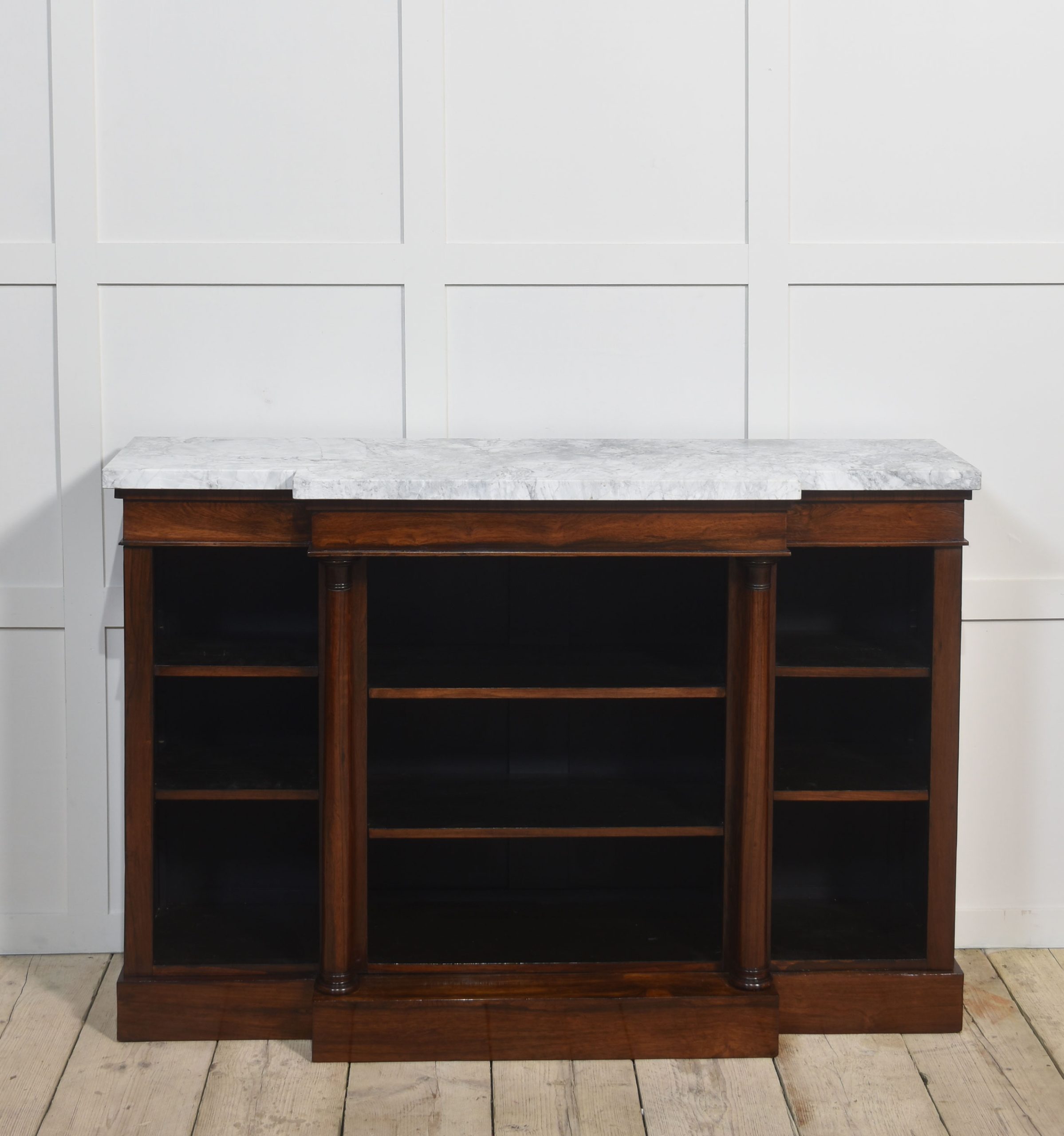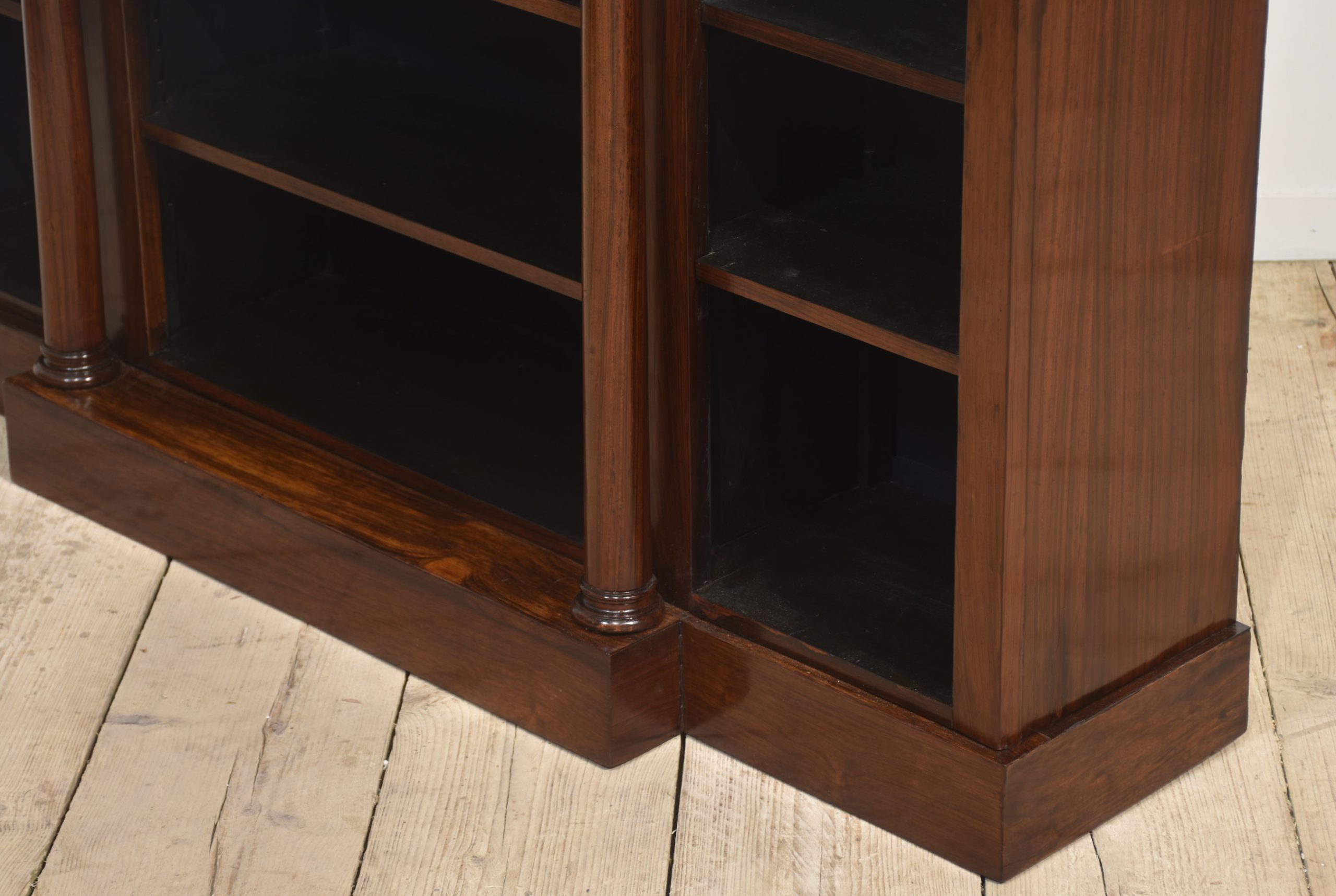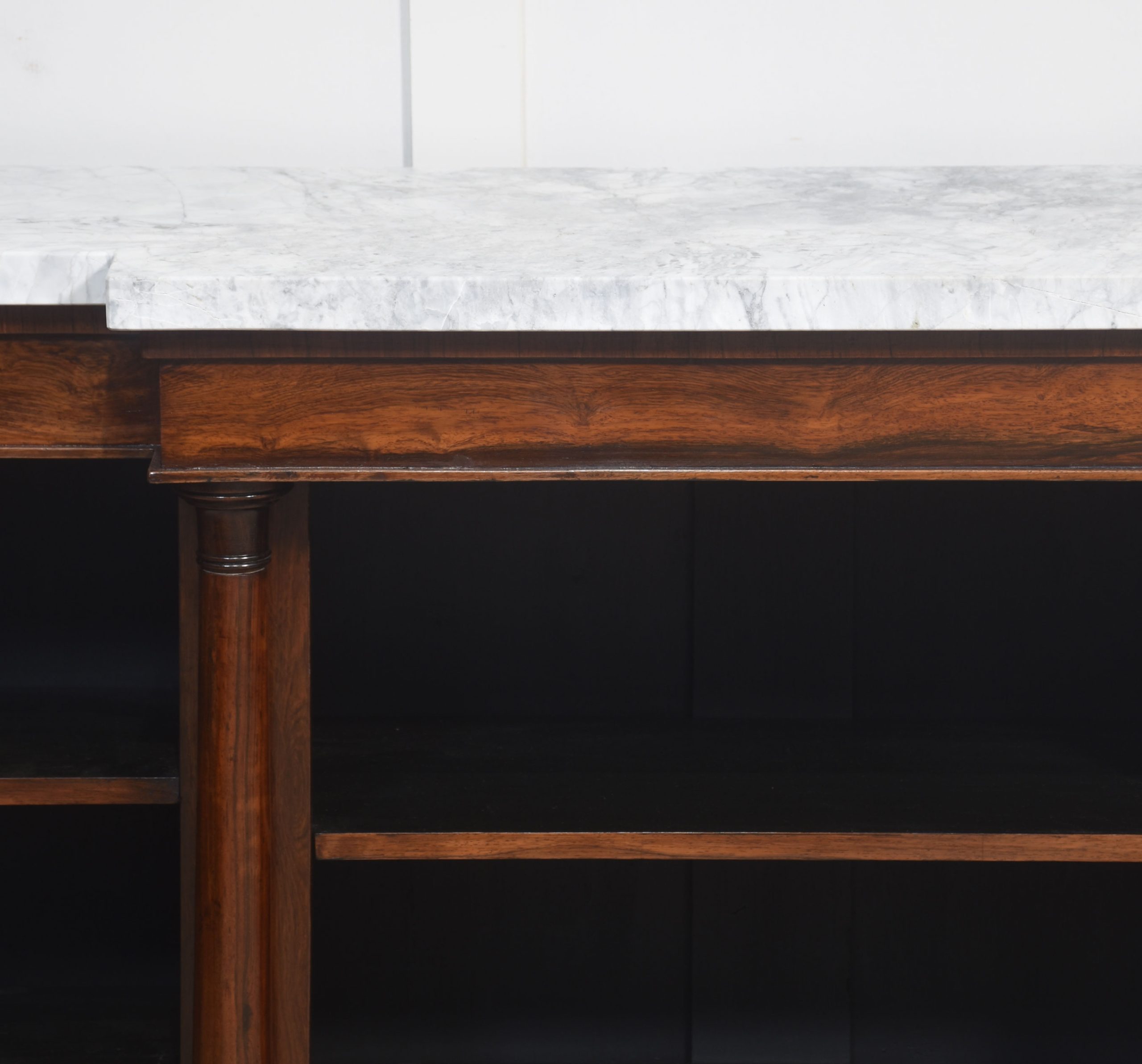 Rosewood open bookcase, the large rectangular well-figured marble breakfront top above three bays of adjustable shelves, divided by circular column pilasters. All raised on a plinth base.