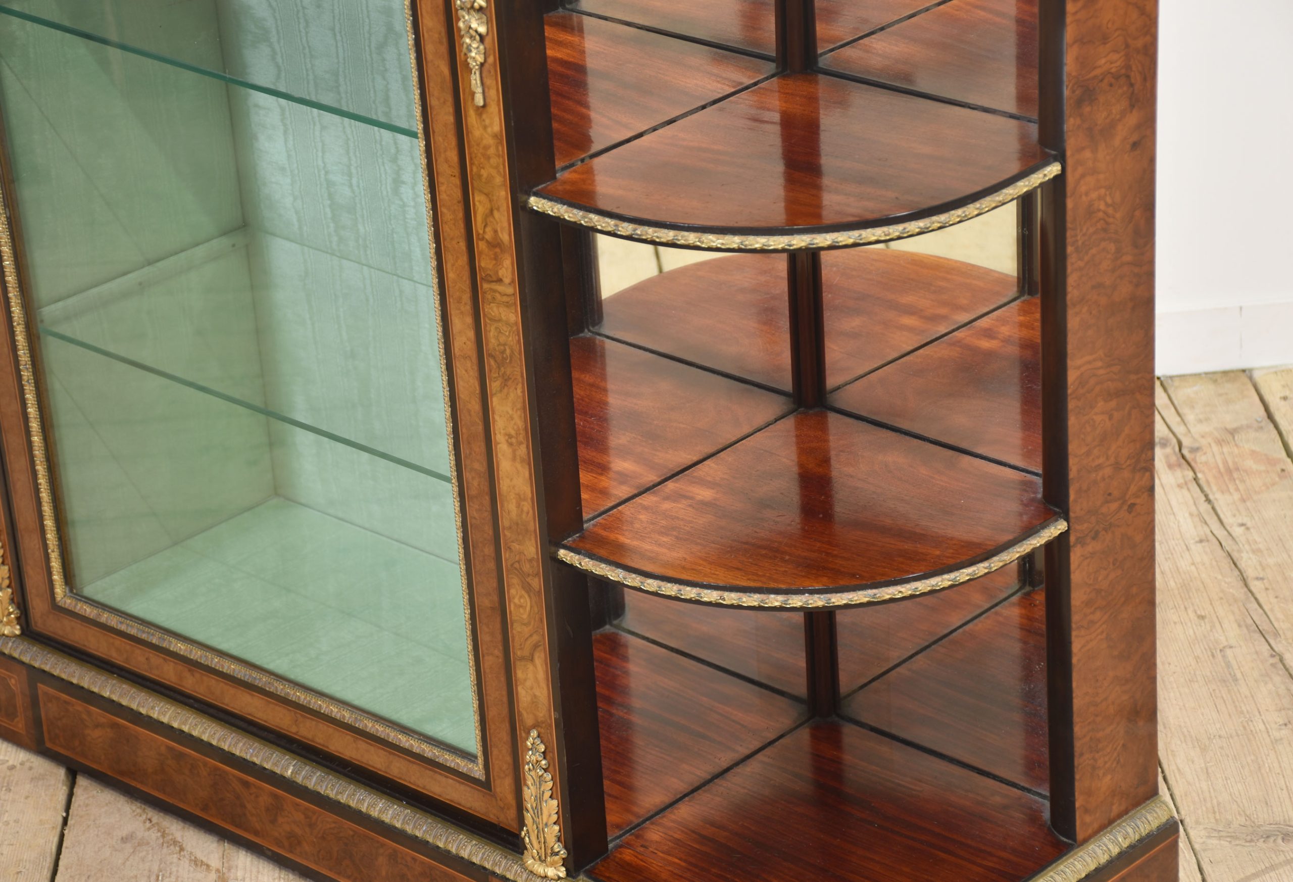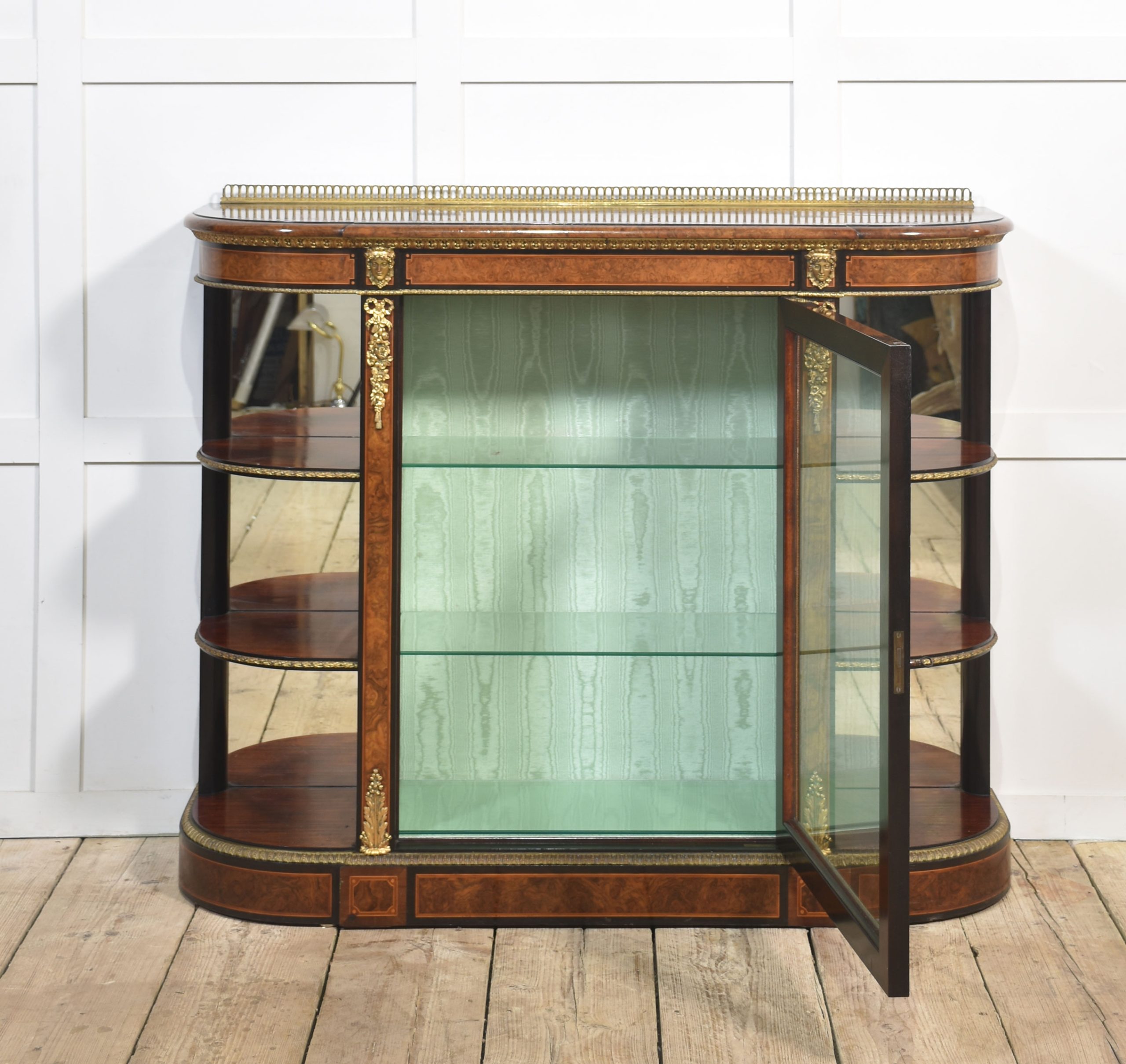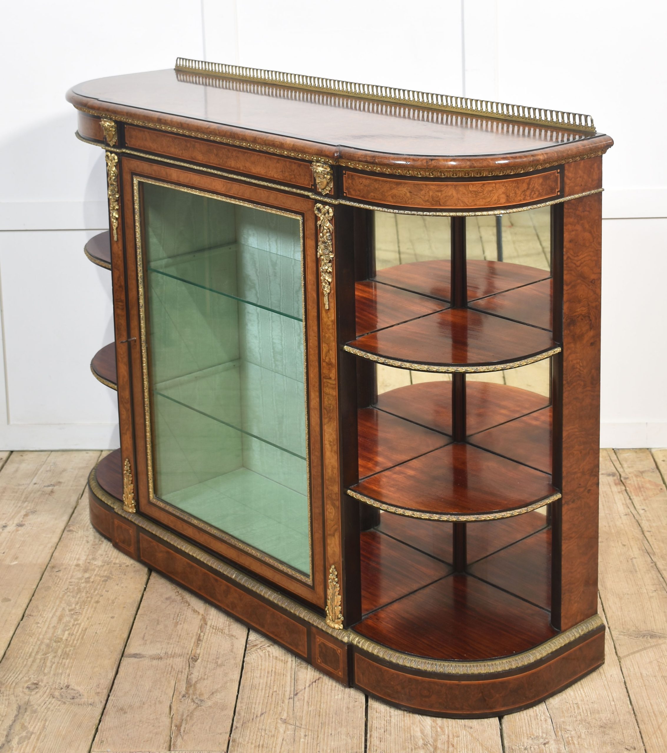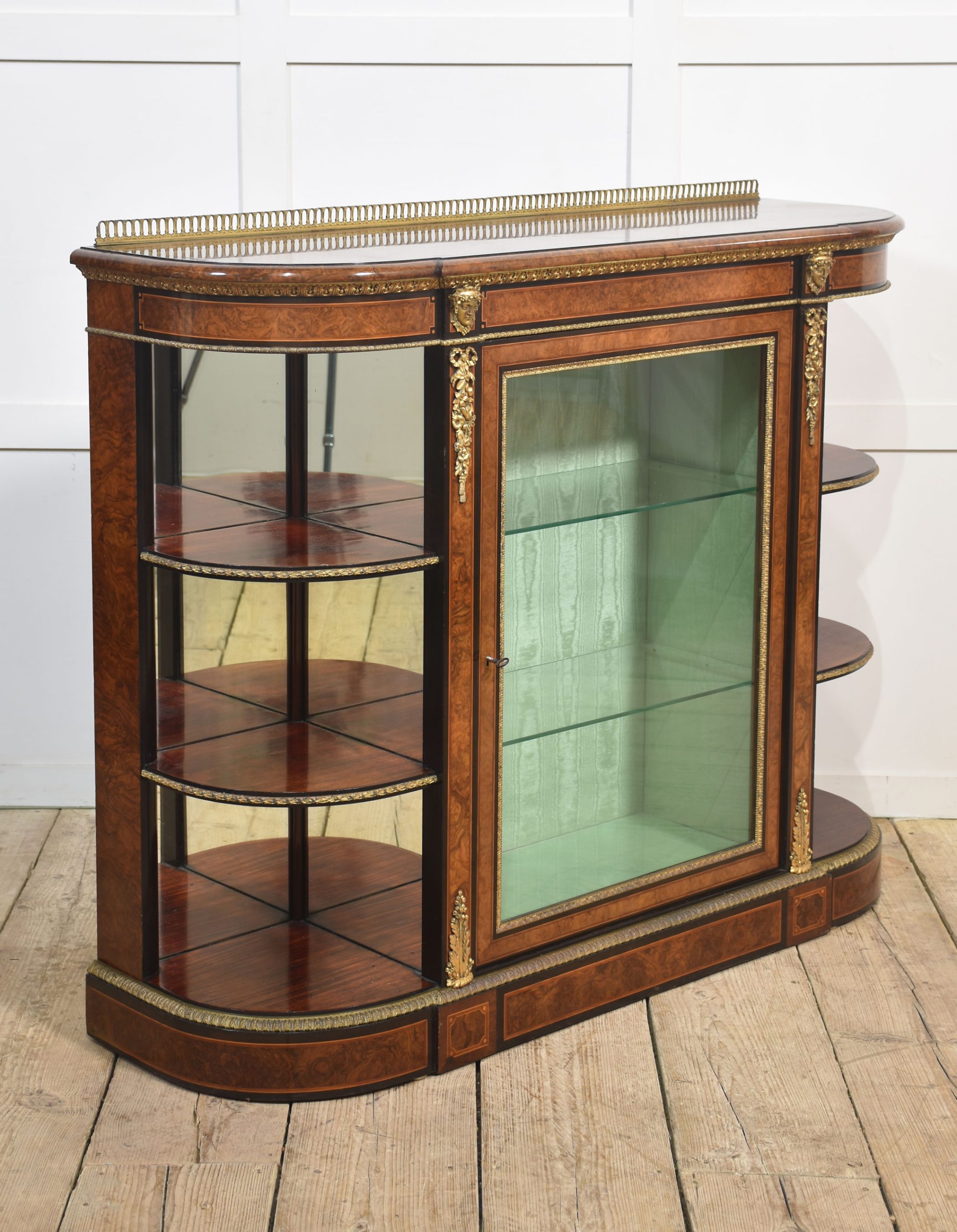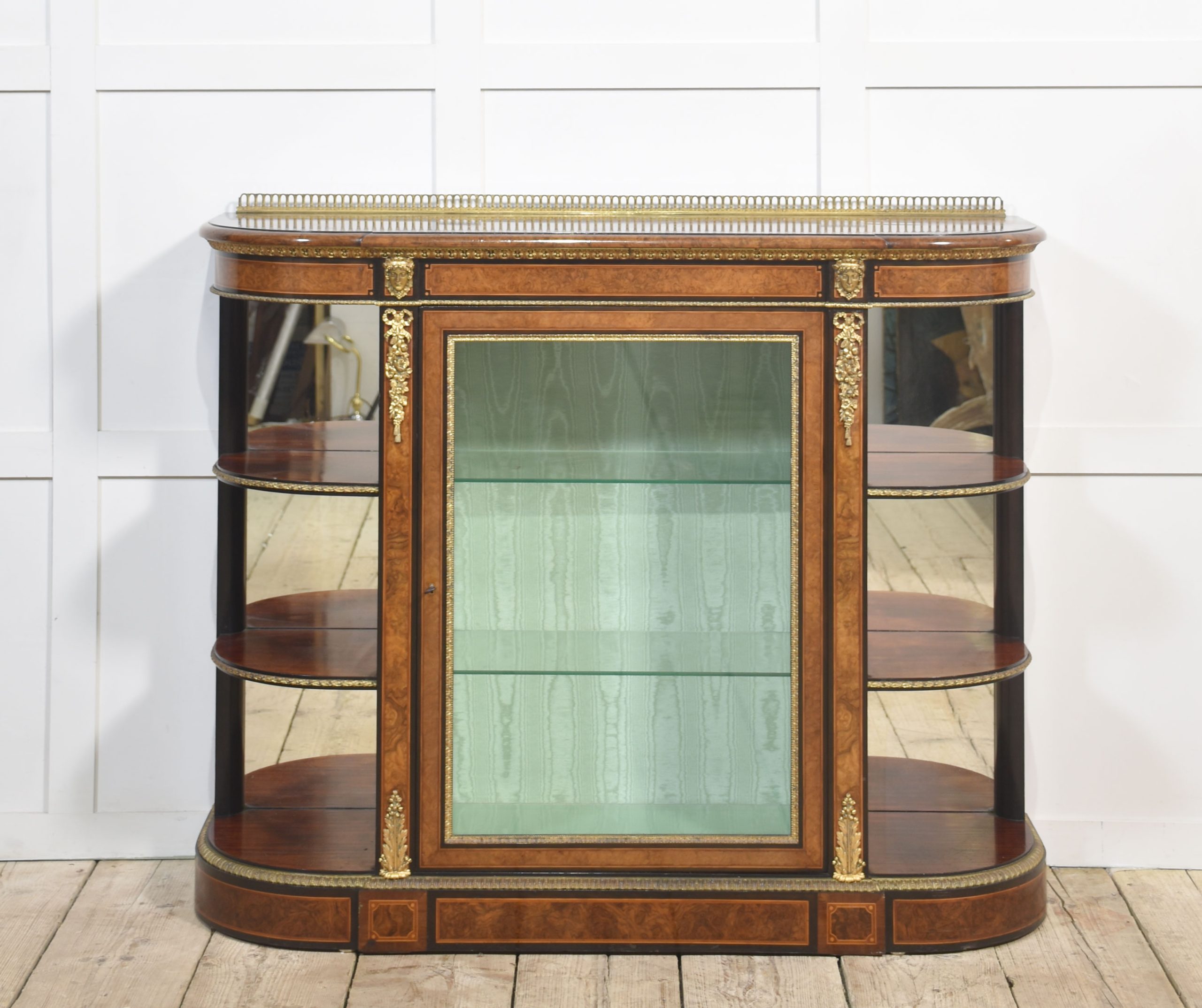 19th-century figured walnut and ormolu-mounted credenza, the well-figured top over ormolu mask mounts and acanthus banding, with a central glass door enclosing watermark silk-lined interior and two glass shelves. Flanked on either side by open shelves with mirrored backs. All raised on a shaped plinth base with ormolu banding.