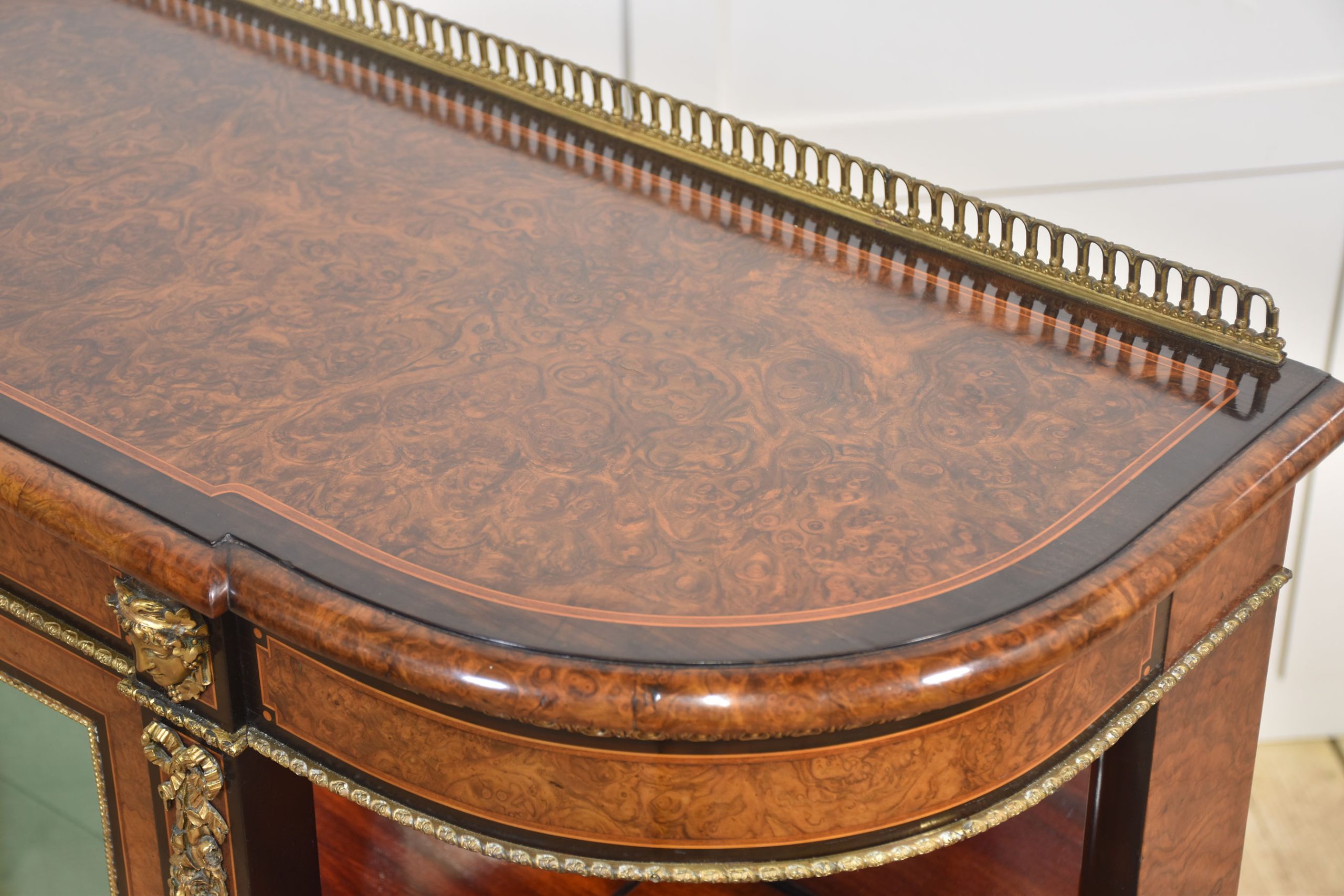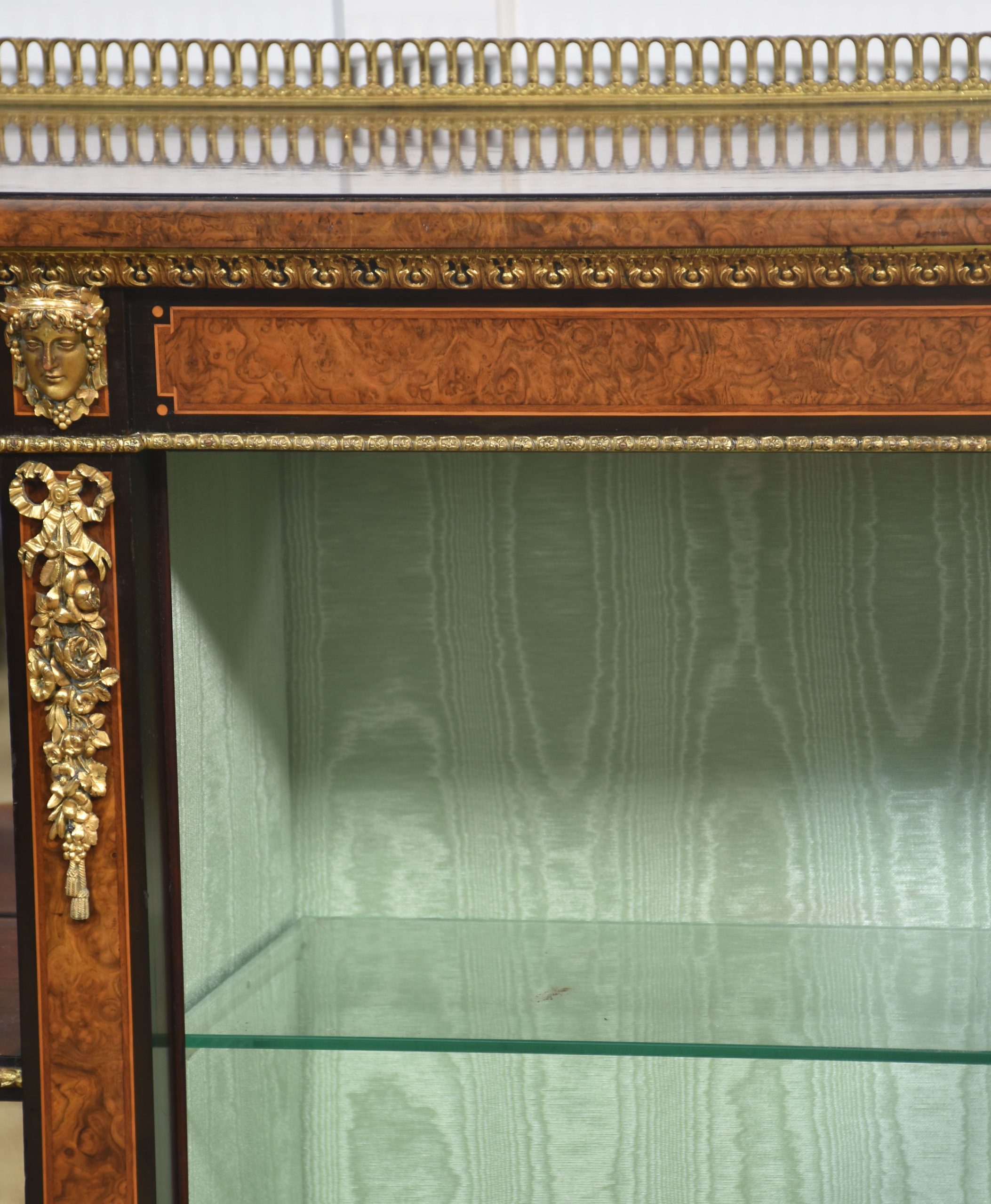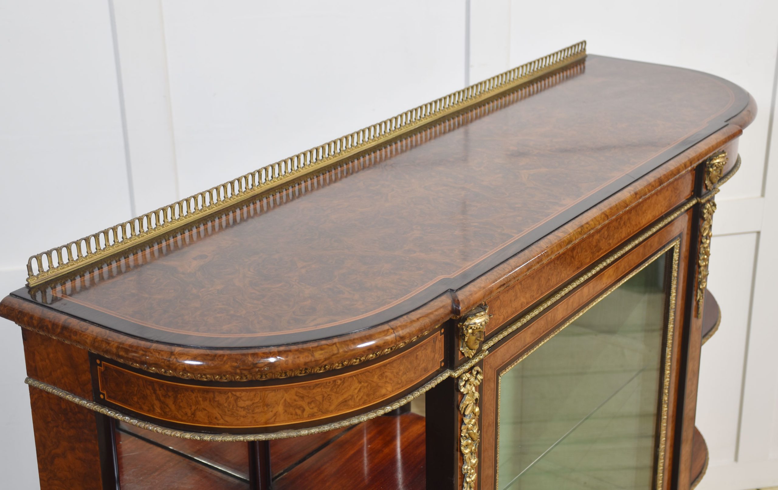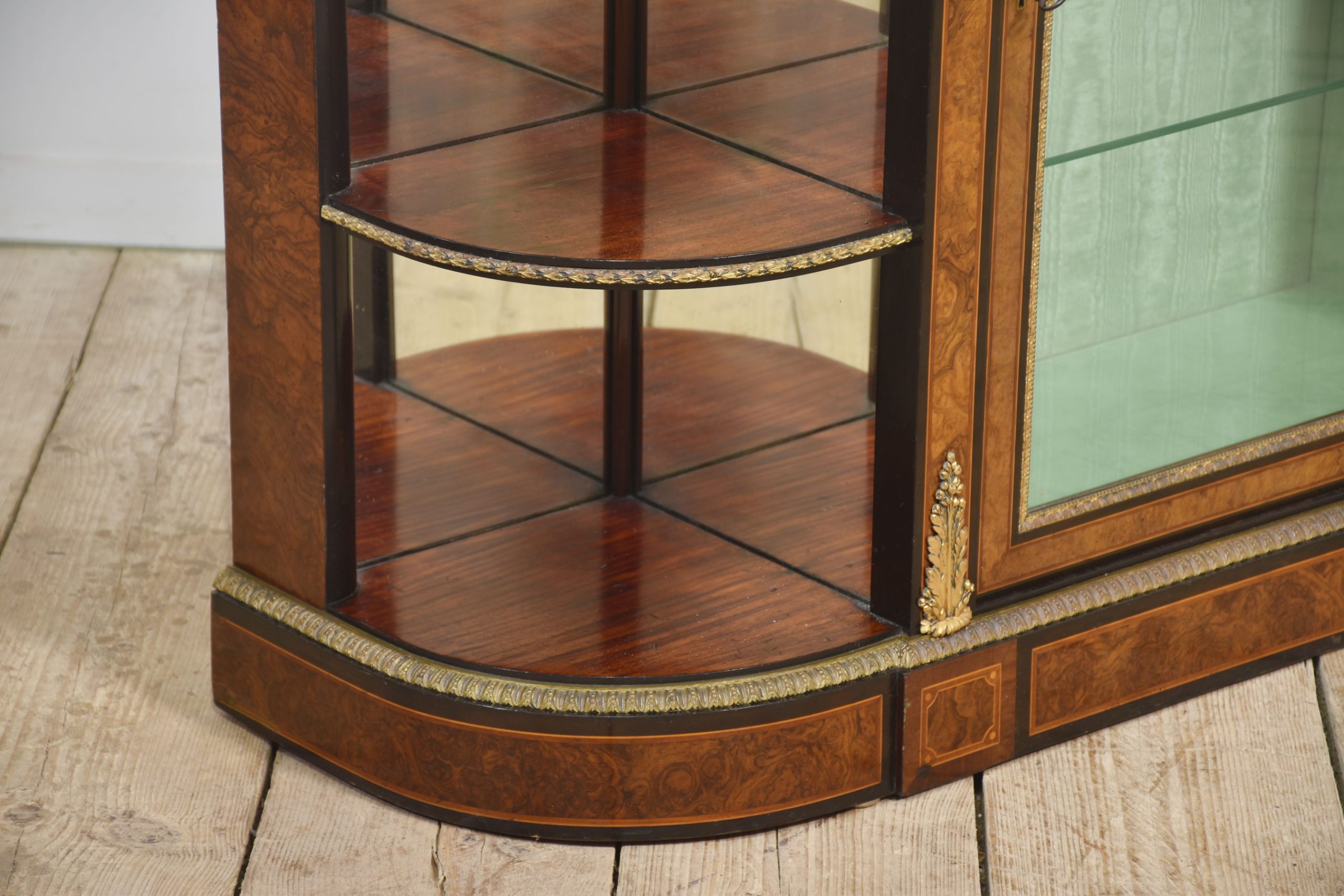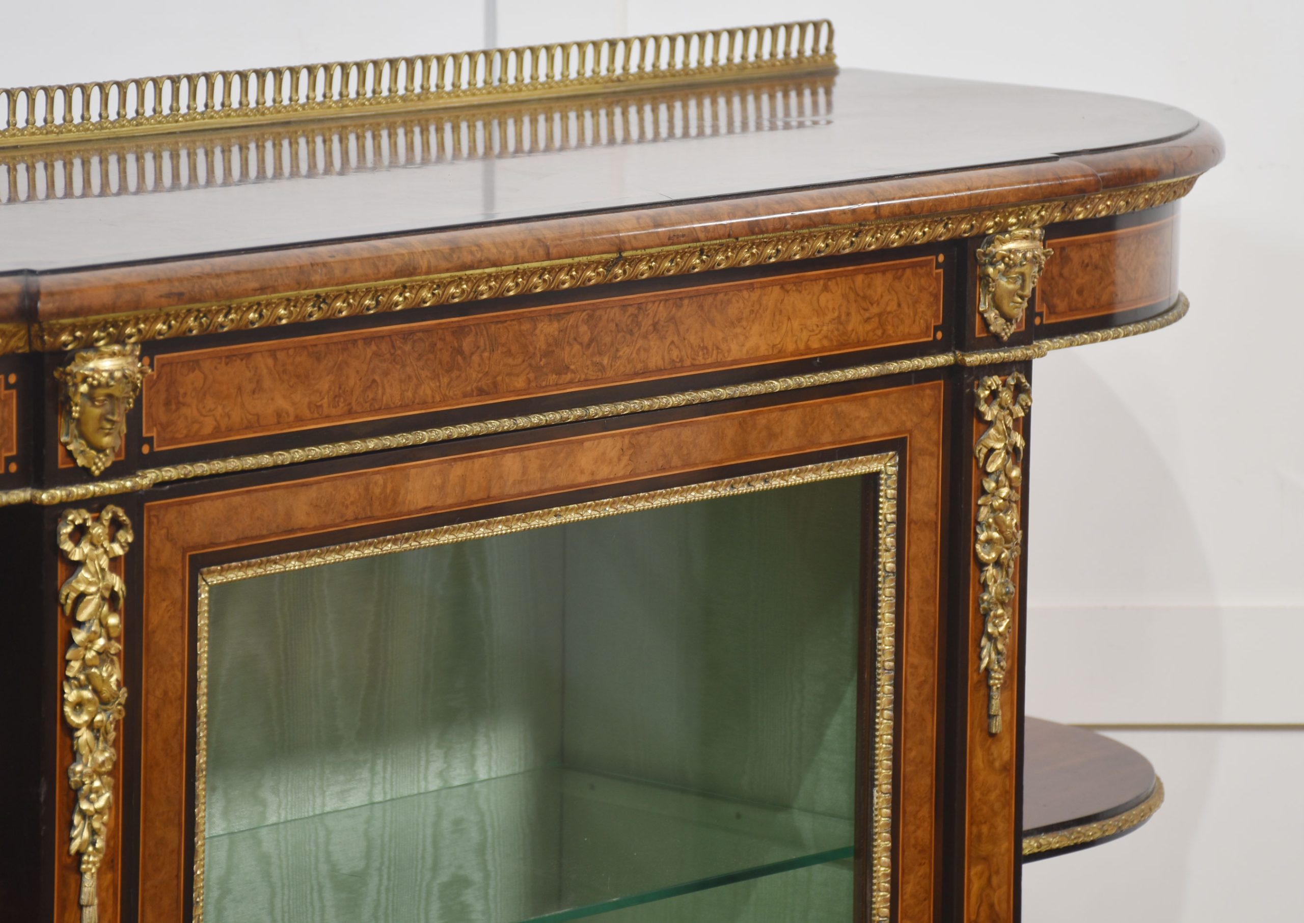 19th-century figured walnut and ormolu-mounted credenza, the well-figured top over ormolu mask mounts and acanthus banding, with a central glass door enclosing watermark silk-lined interior and two glass shelves. Flanked on either side by open shelves with mirrored backs. All raised on a shaped plinth base with ormolu banding.
