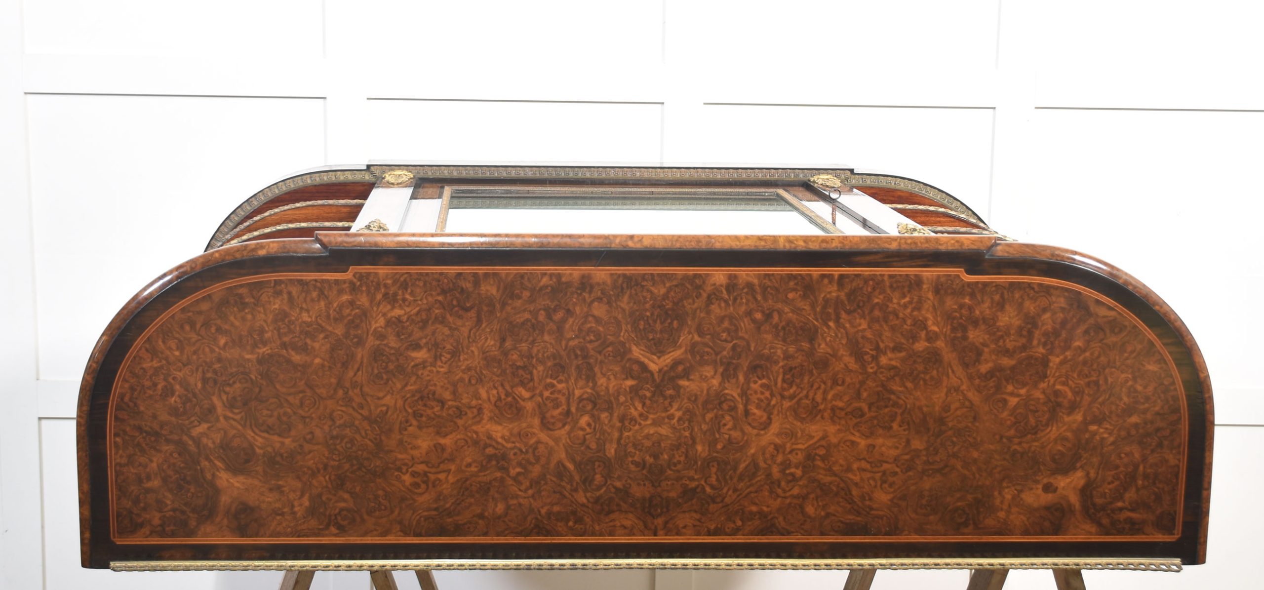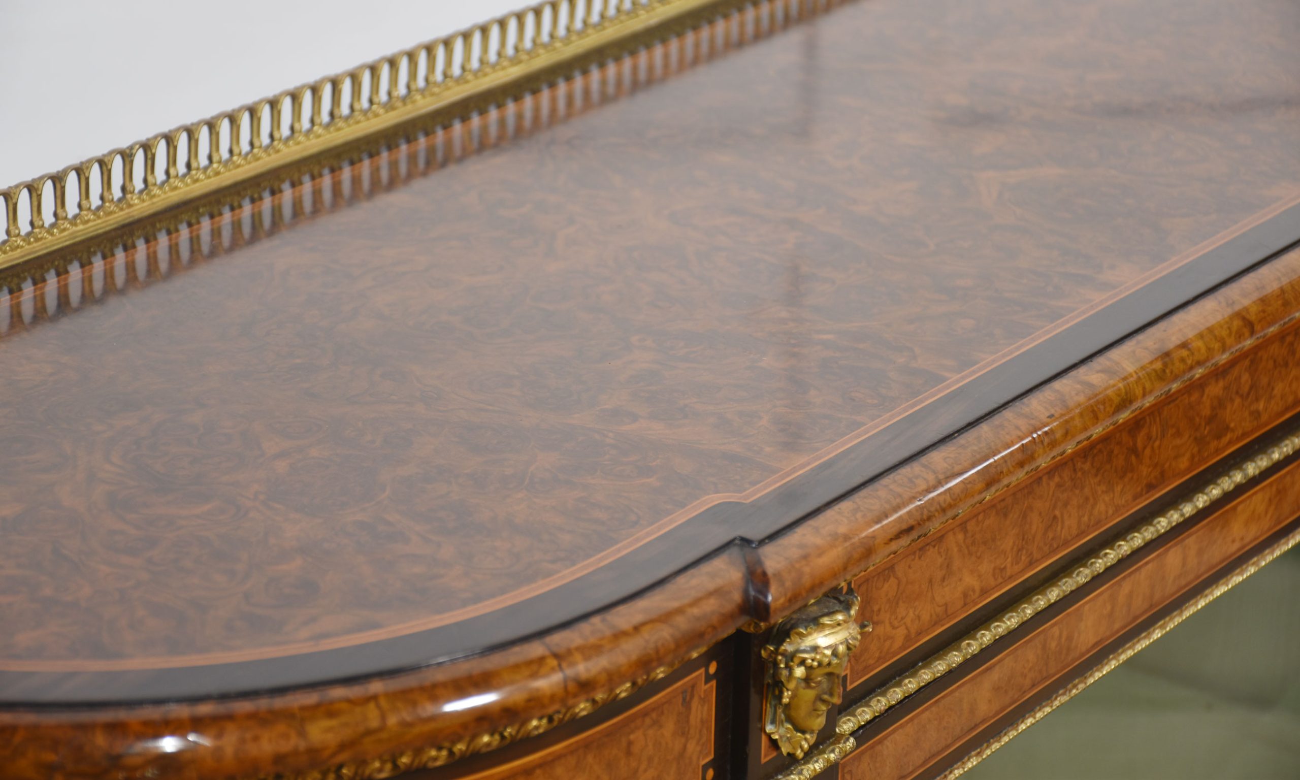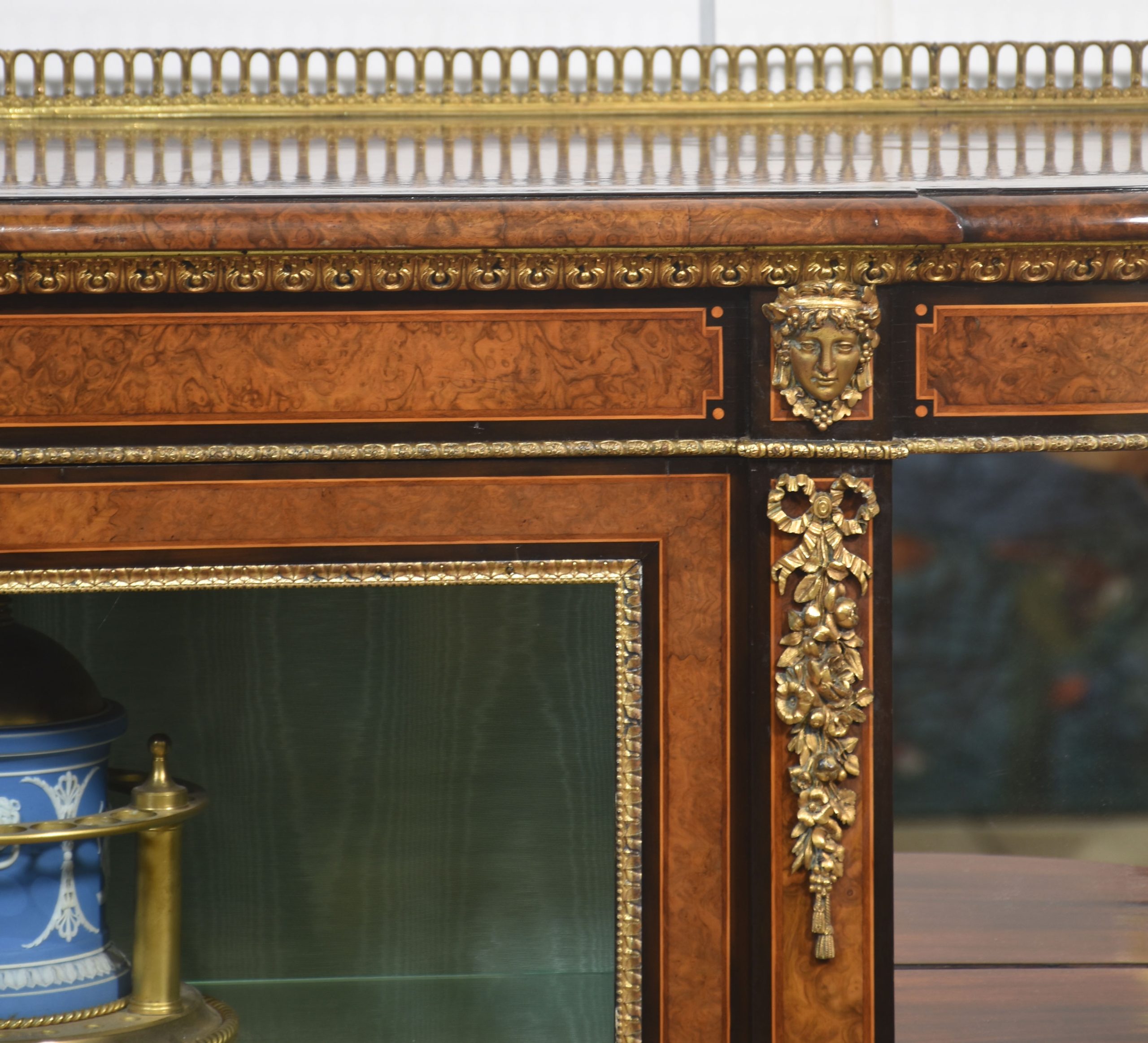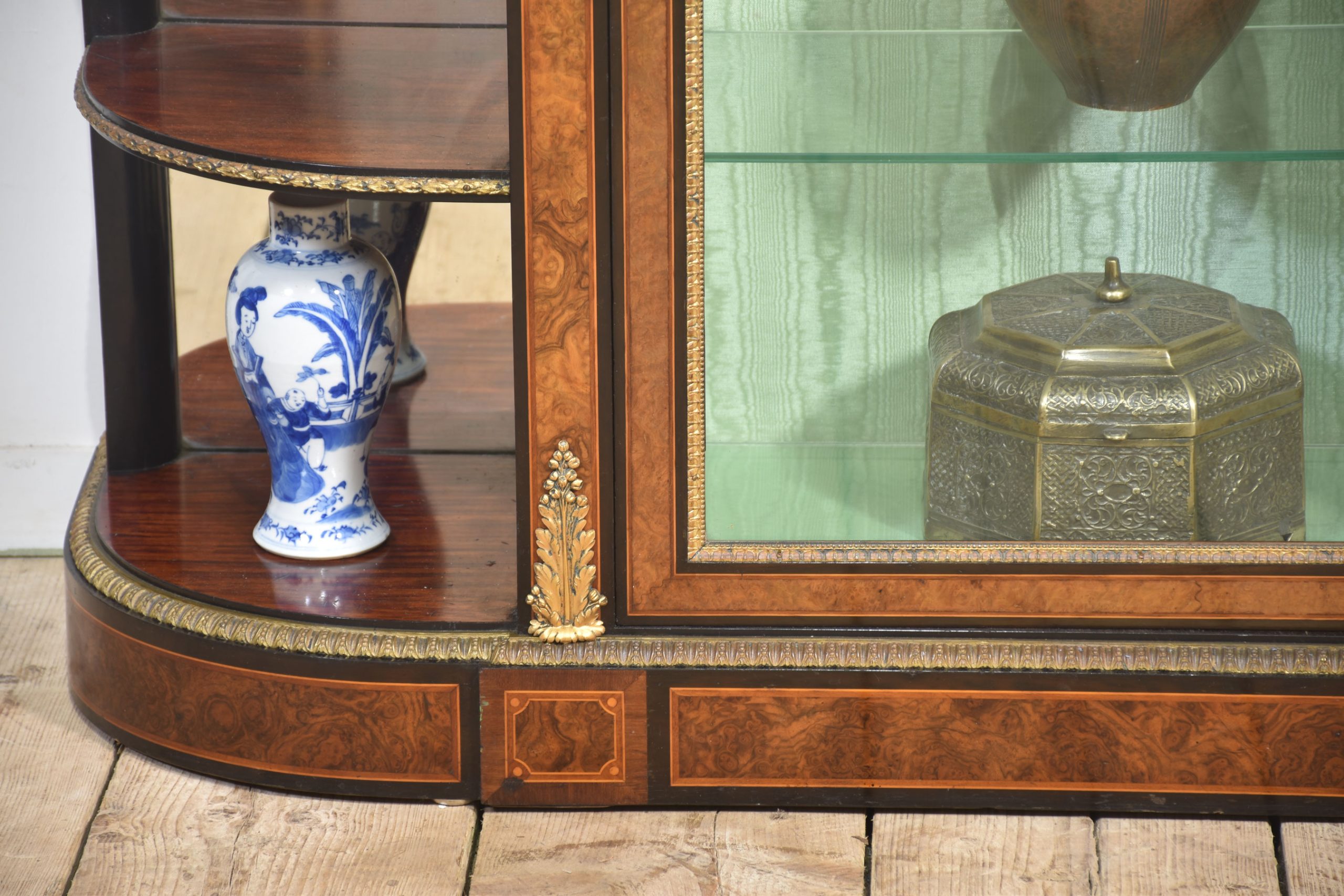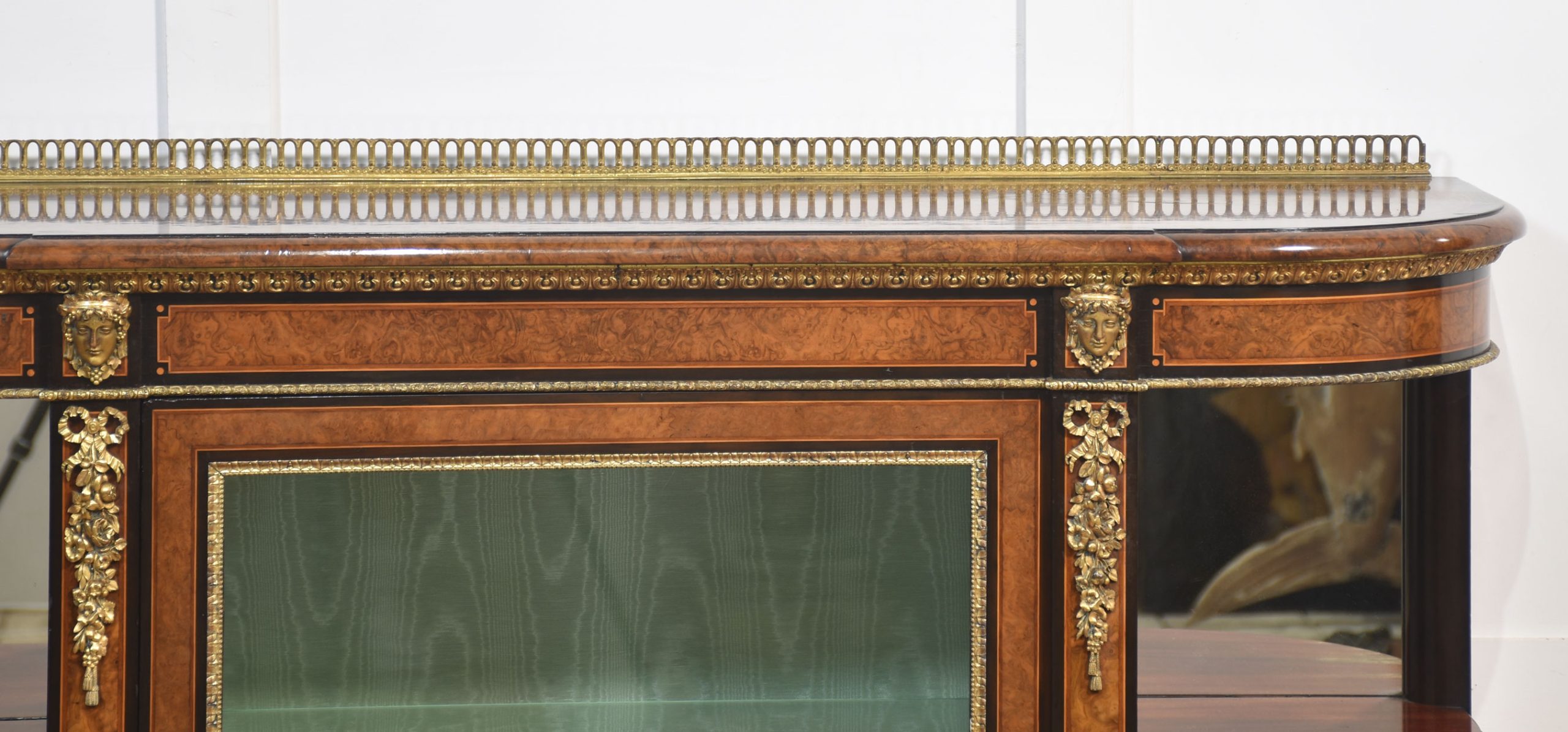 19th-century figured walnut and ormolu-mounted credenza, the well-figured top over ormolu mask mounts and acanthus banding, with a central glass door enclosing watermark silk-lined interior and two glass shelves. Flanked on either side by open shelves with mirrored backs. All raised on a shaped plinth base with ormolu banding.