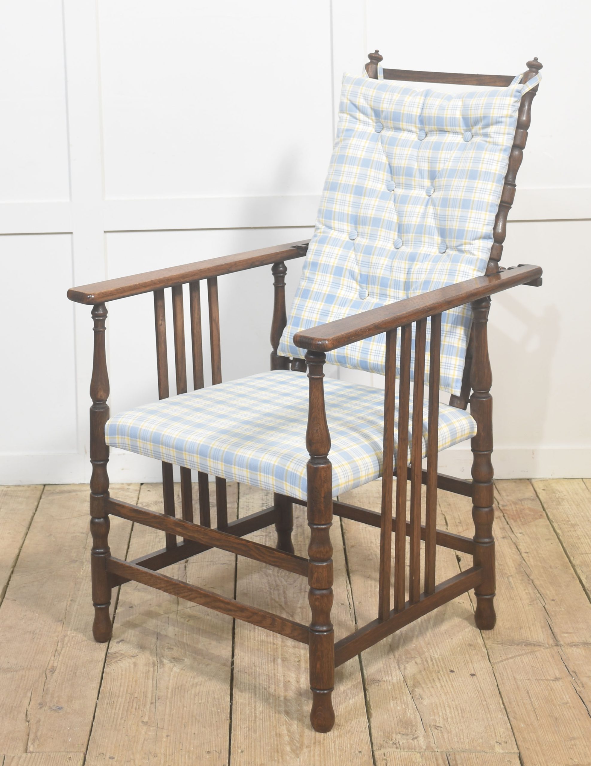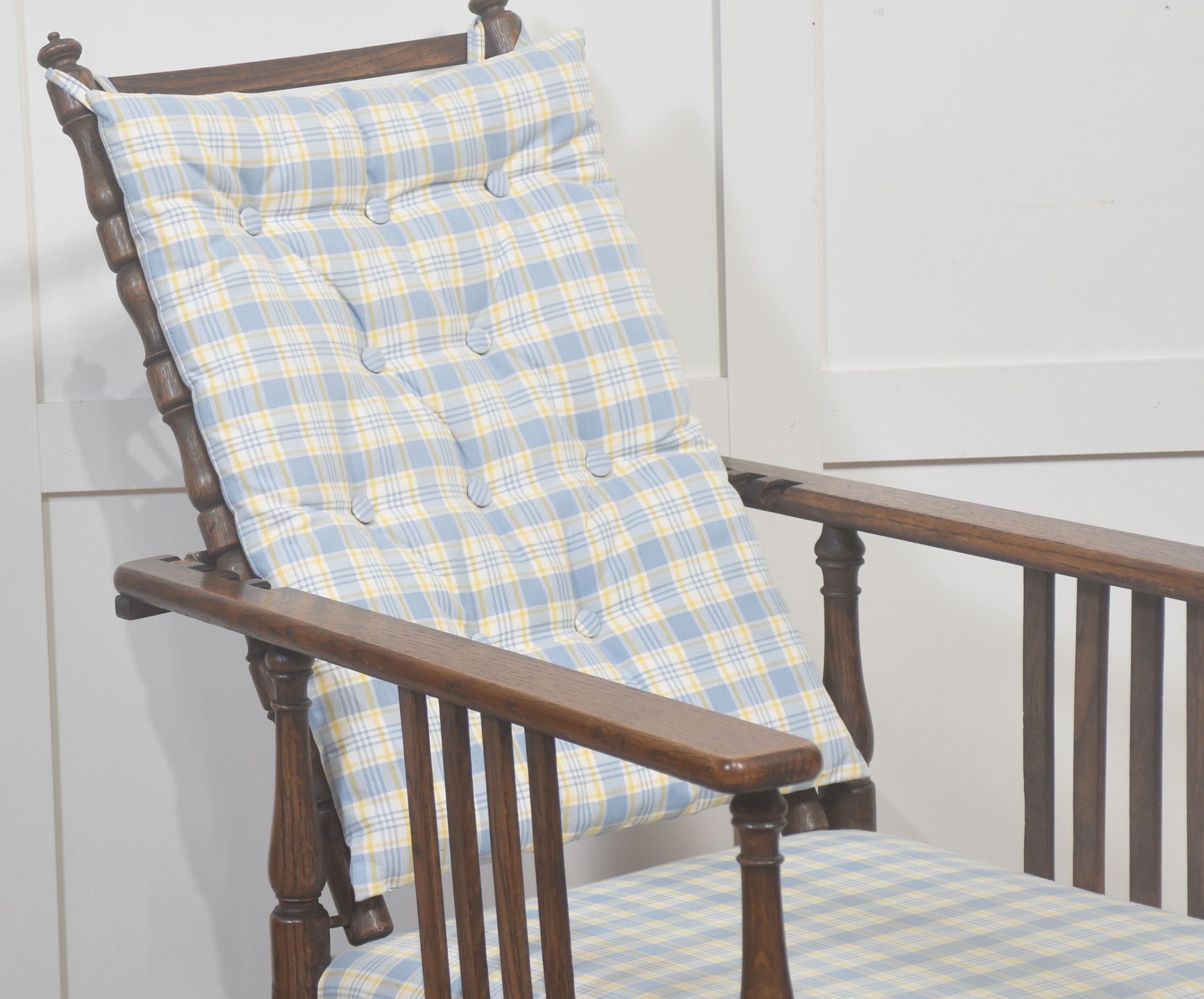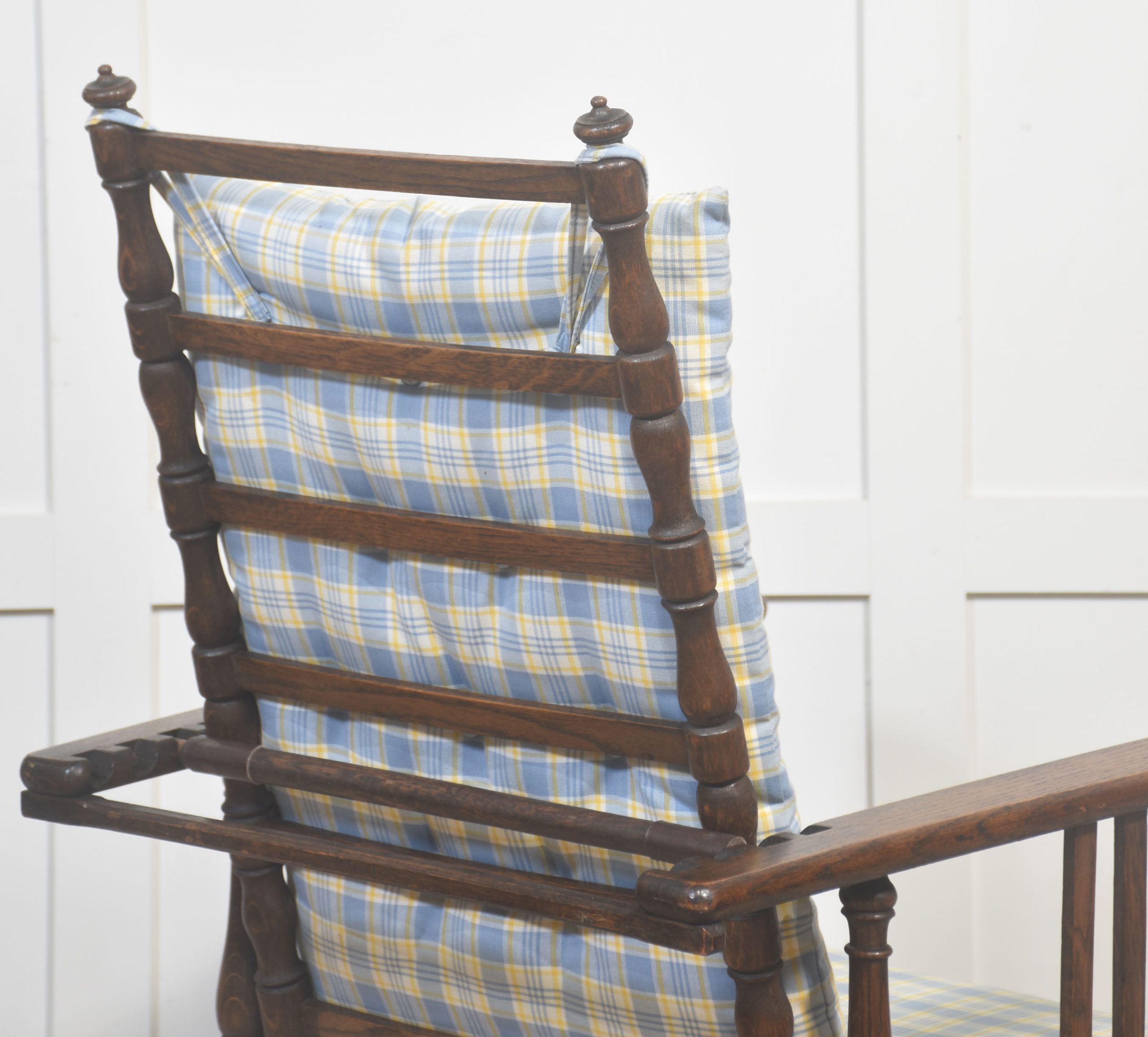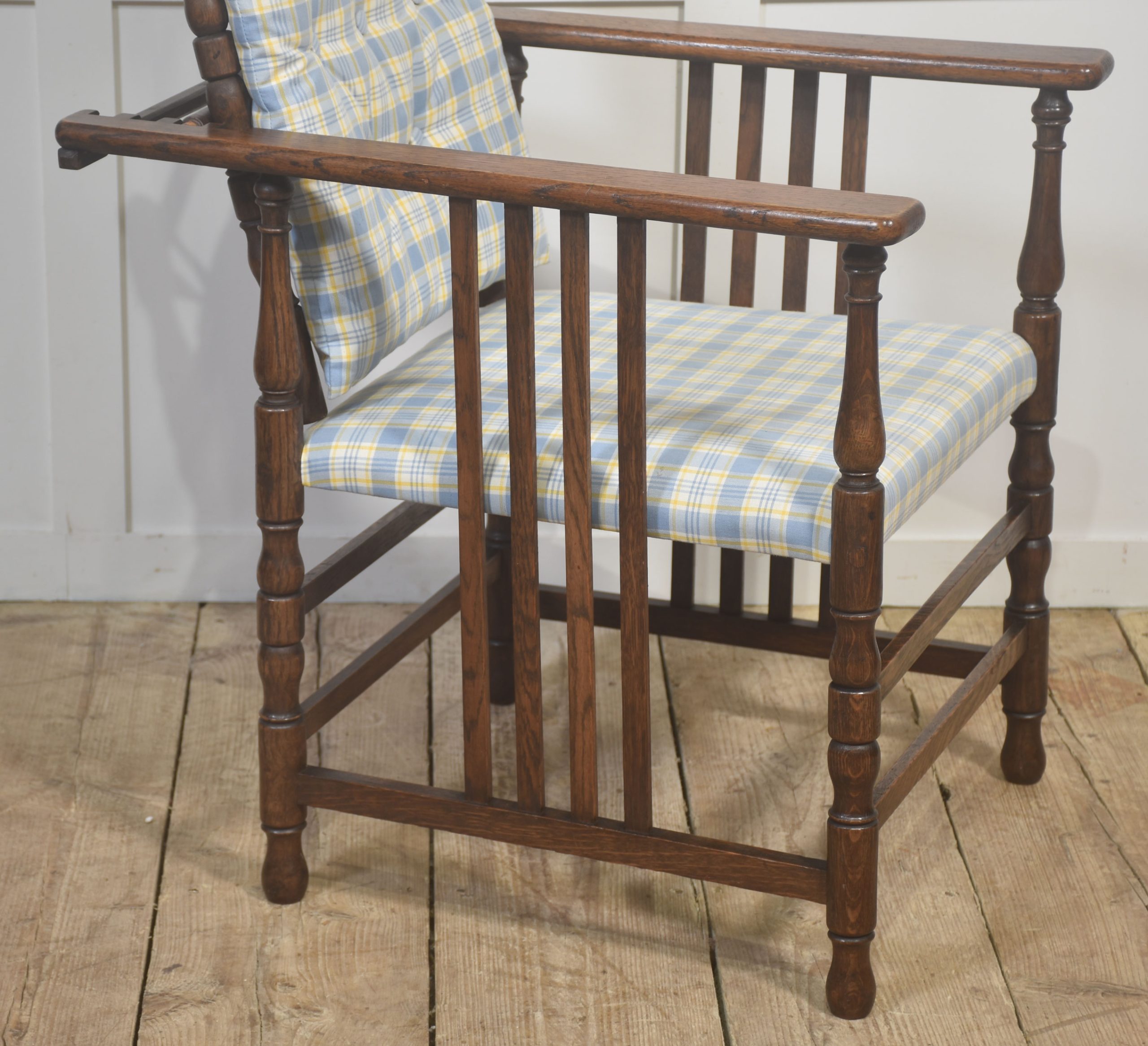 An upholstered oak armchair of traditional design, raised on turned legs with vertical spindle side panels and shaped armrests, finished in a warm medium-brown tone. The chair features a manually adjustable reclining back, allowing the angle to be set for comfort, and is fitted with a loose, button-tufted back cushion. The padded seat and back are upholstered in a blue, cream, and yellow plaid fabric. Sturdy in construction and well proportioned, this chair combines classic craftsmanship with practical adjustability.