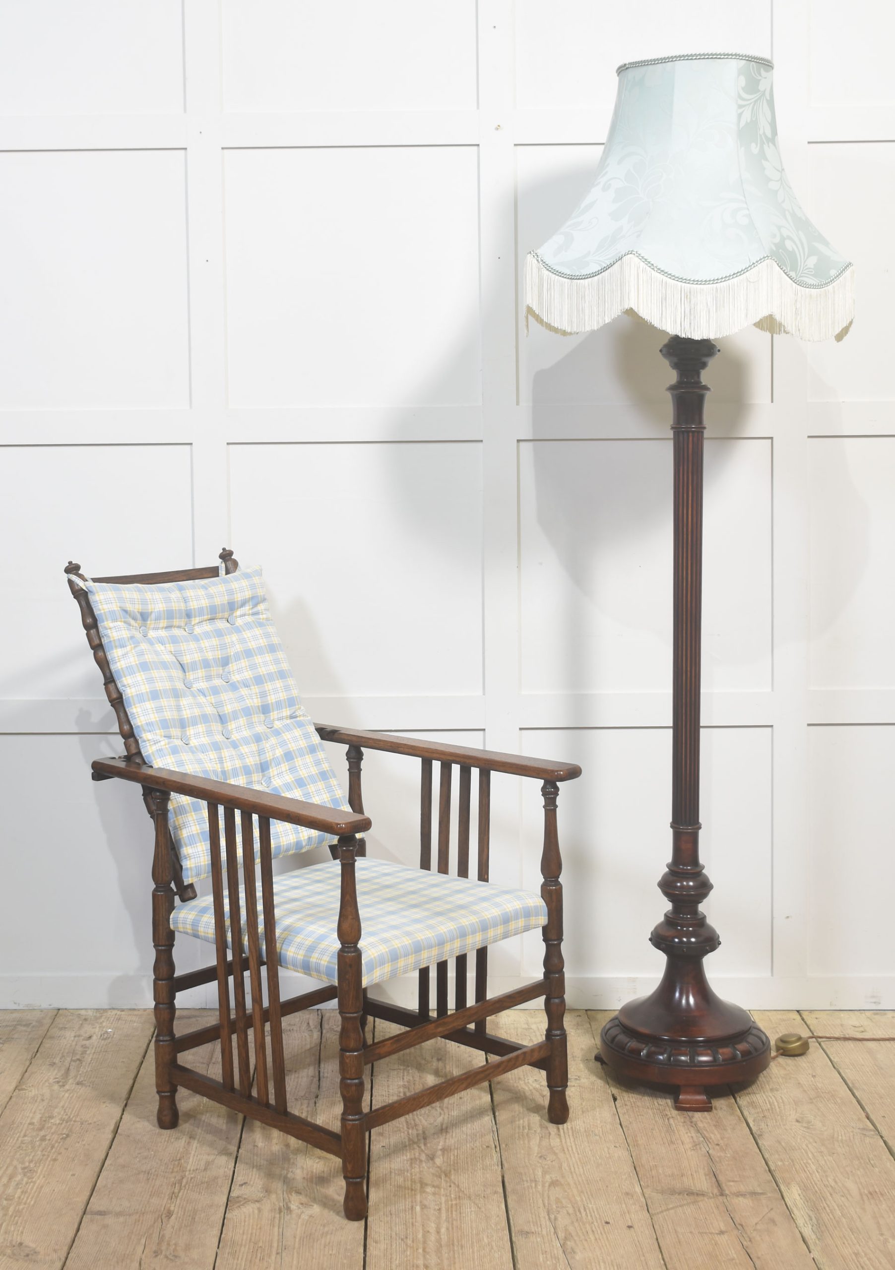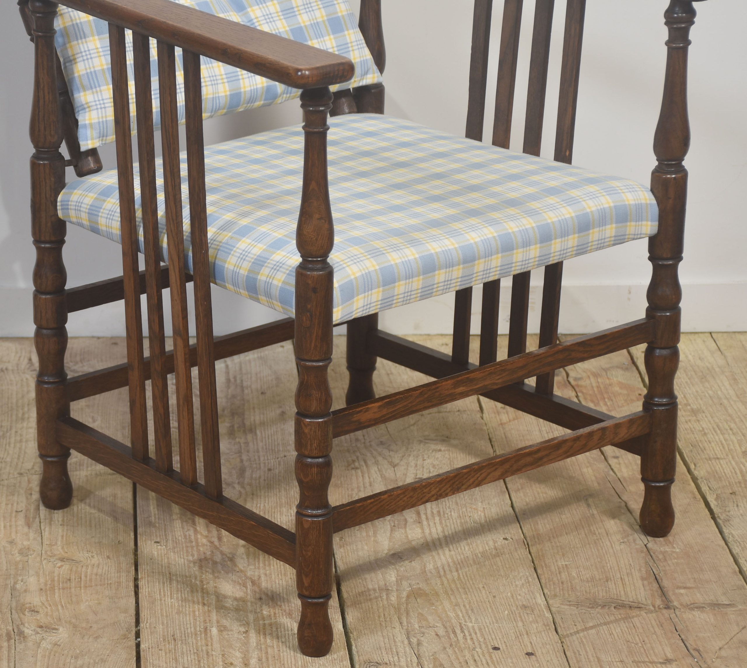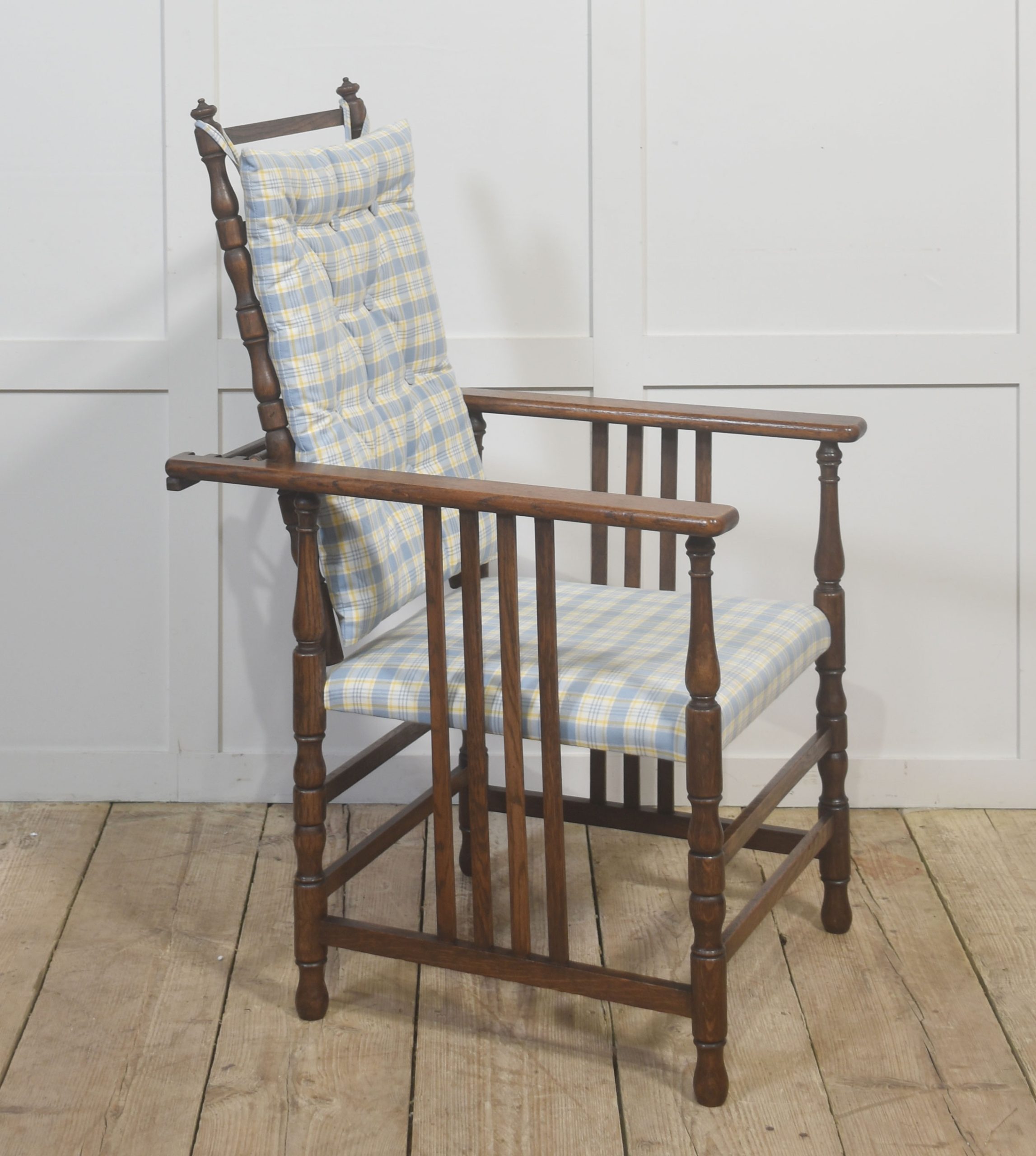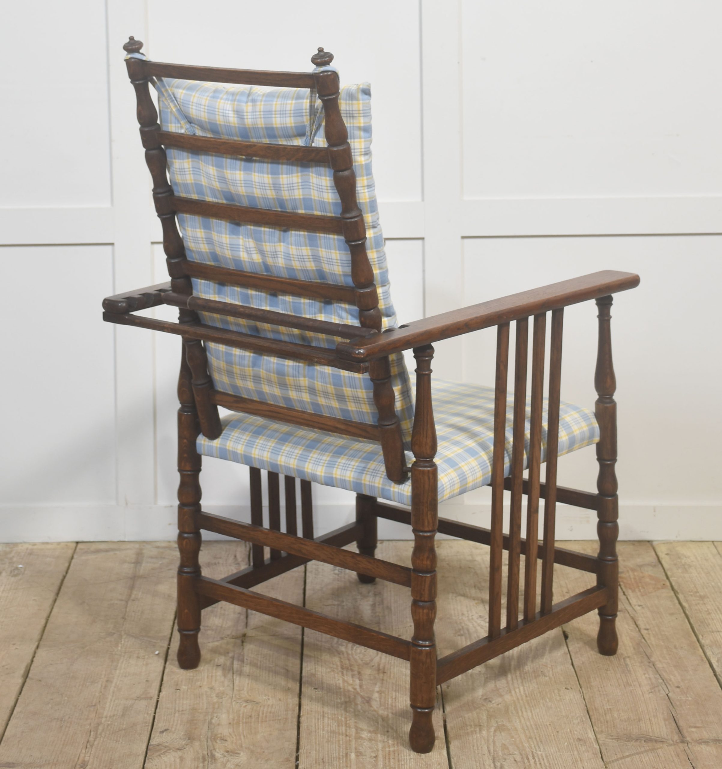 An upholstered oak armchair of traditional design, raised on turned legs with vertical spindle side panels and shaped armrests, finished in a warm medium-brown tone. The chair features a manually adjustable reclining back, allowing the angle to be set for comfort, and is fitted with a loose, button-tufted back cushion. The padded seat and back are upholstered in a blue, cream, and yellow plaid fabric. Sturdy in construction and well proportioned, this chair combines classic craftsmanship with practical adjustability.