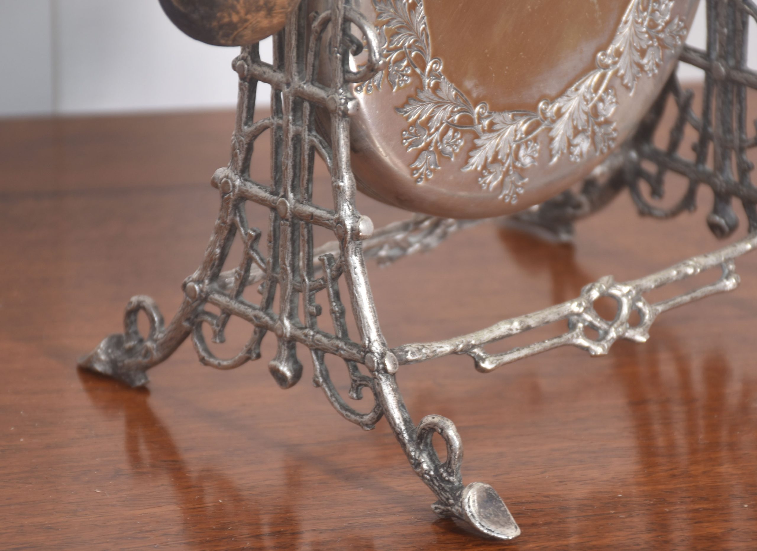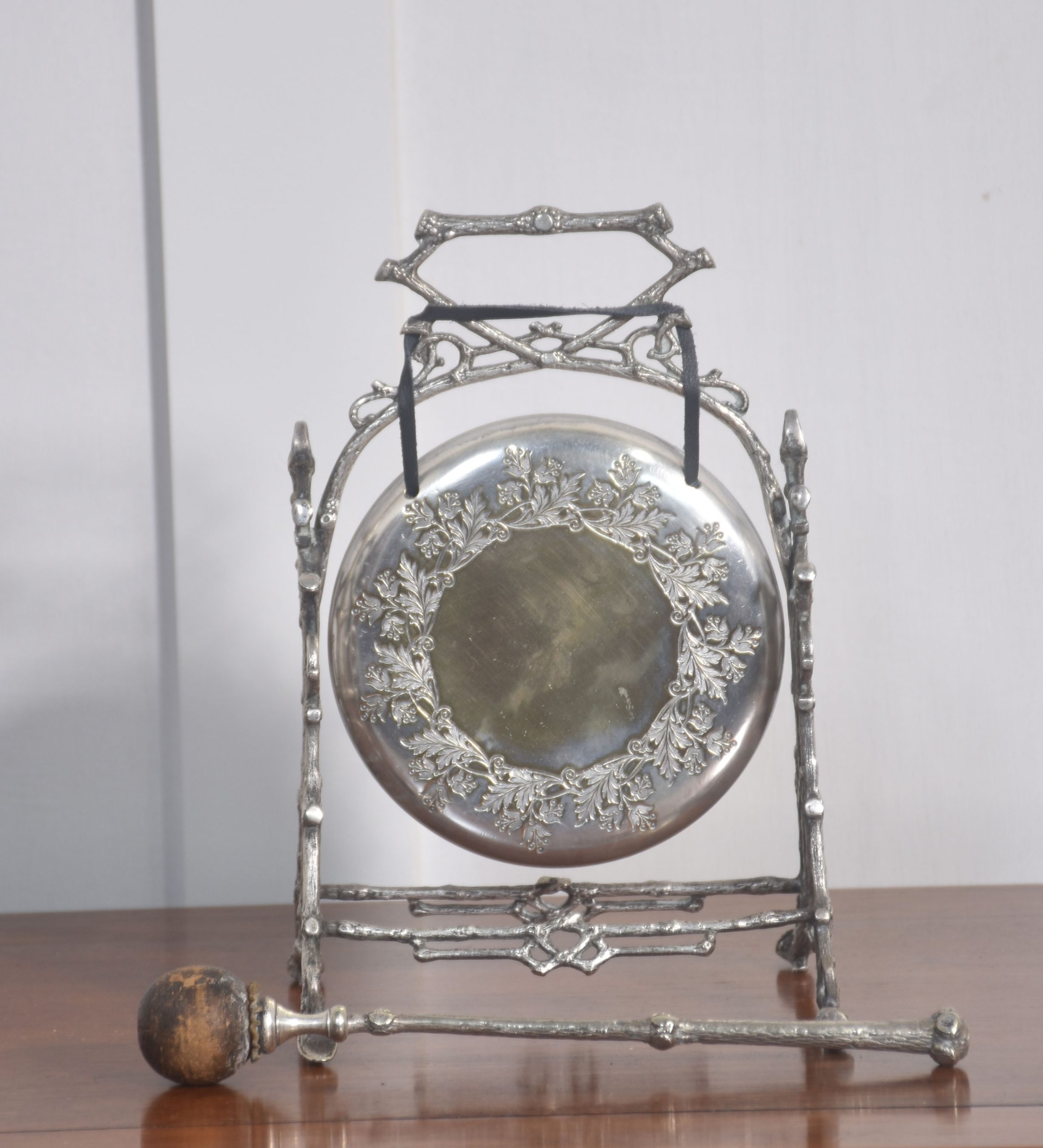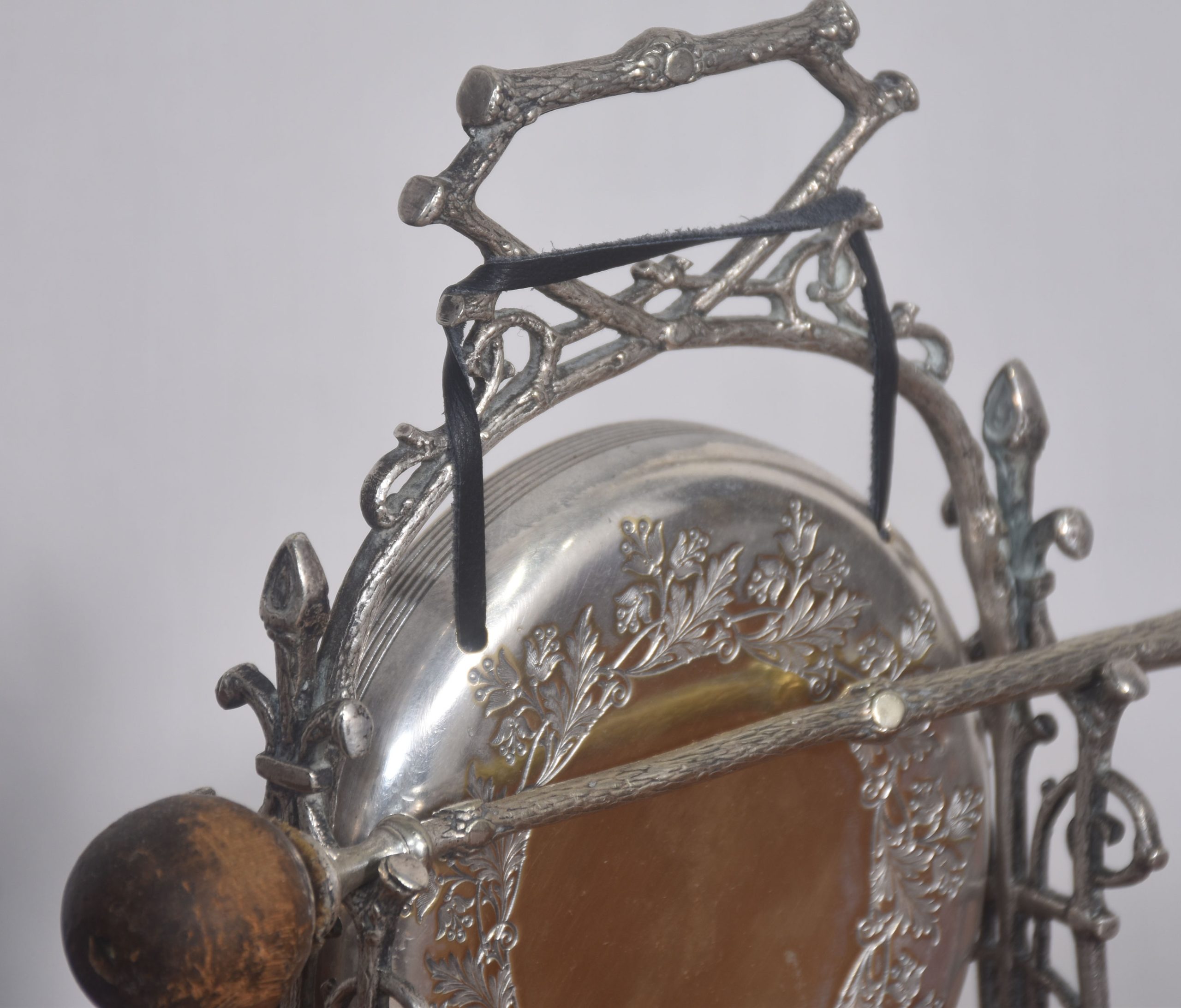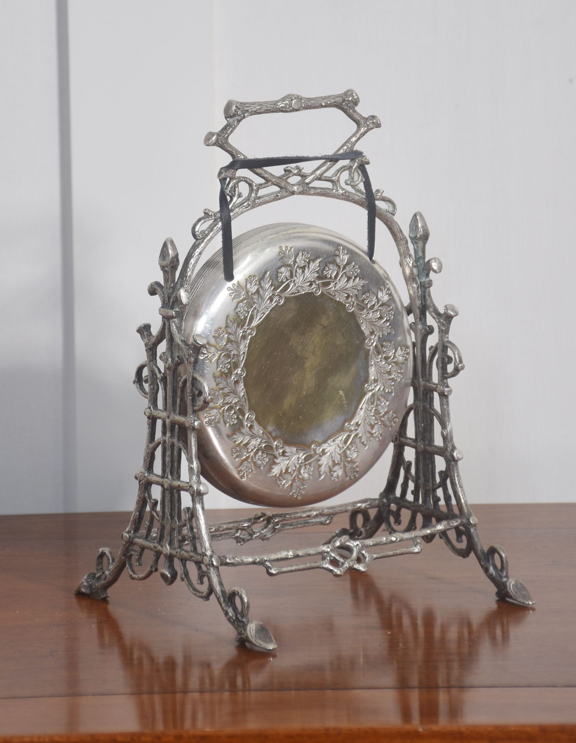 Aesthetic silver plated table gong, the well cast frame supporting the tooled gong, retaining the original beater.