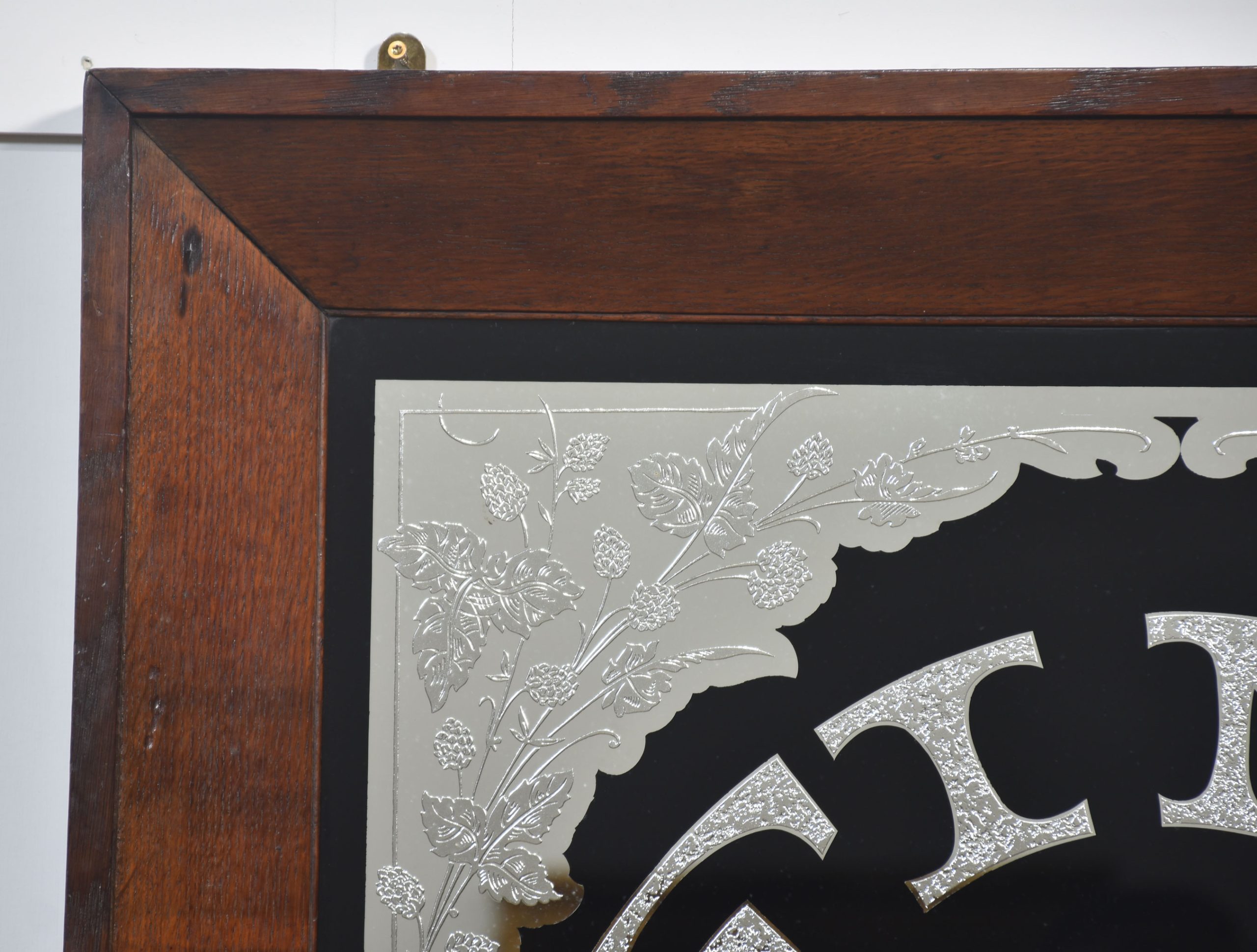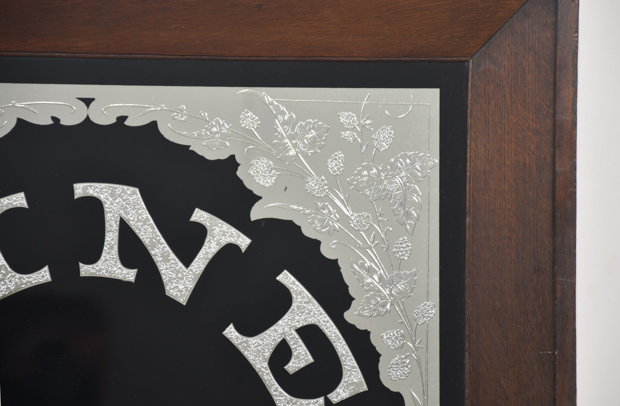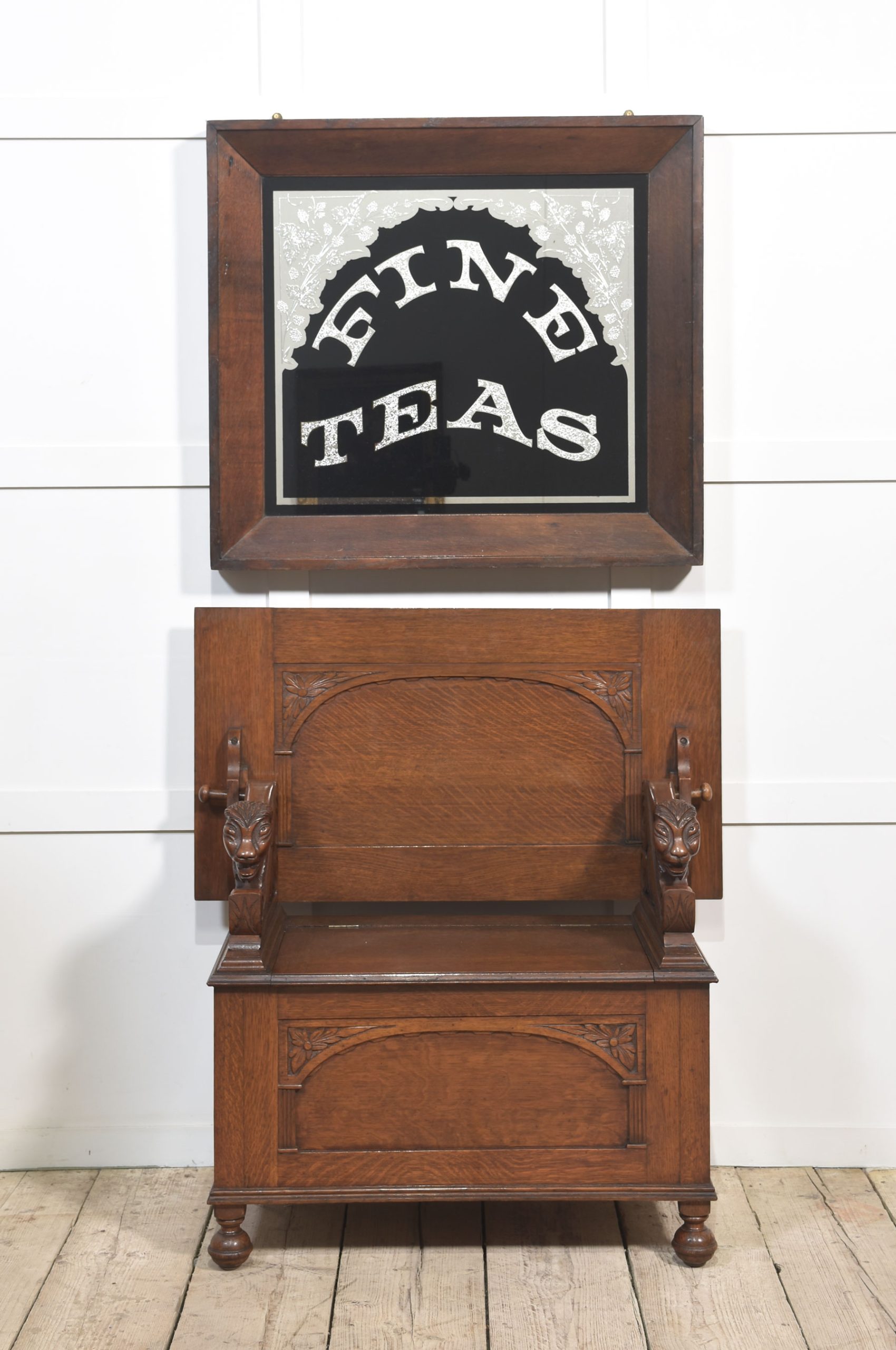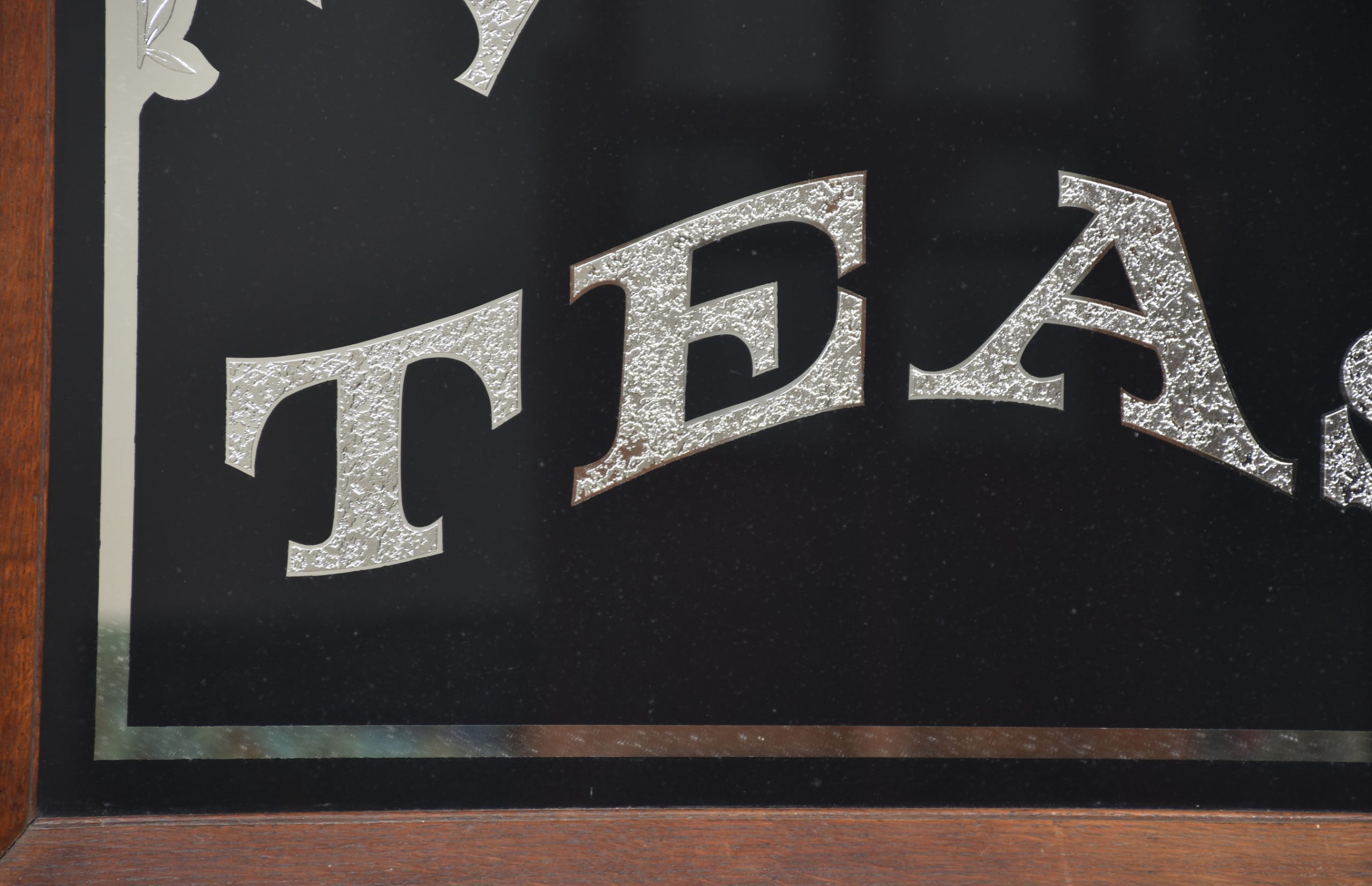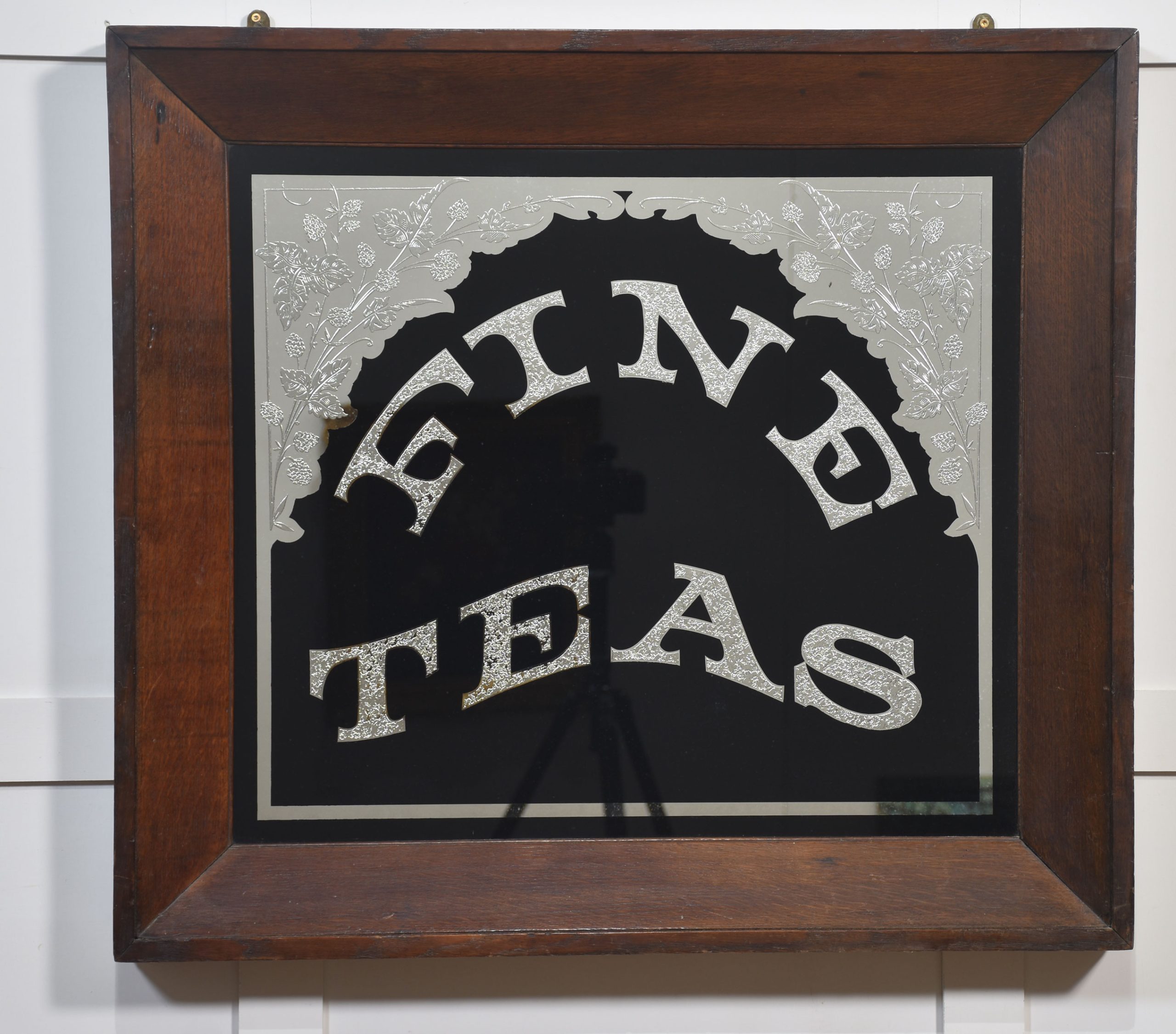 Oak framed advertising mirror encased in oak frame, inscribed Fine Teas on a black background decorated with floral relief.