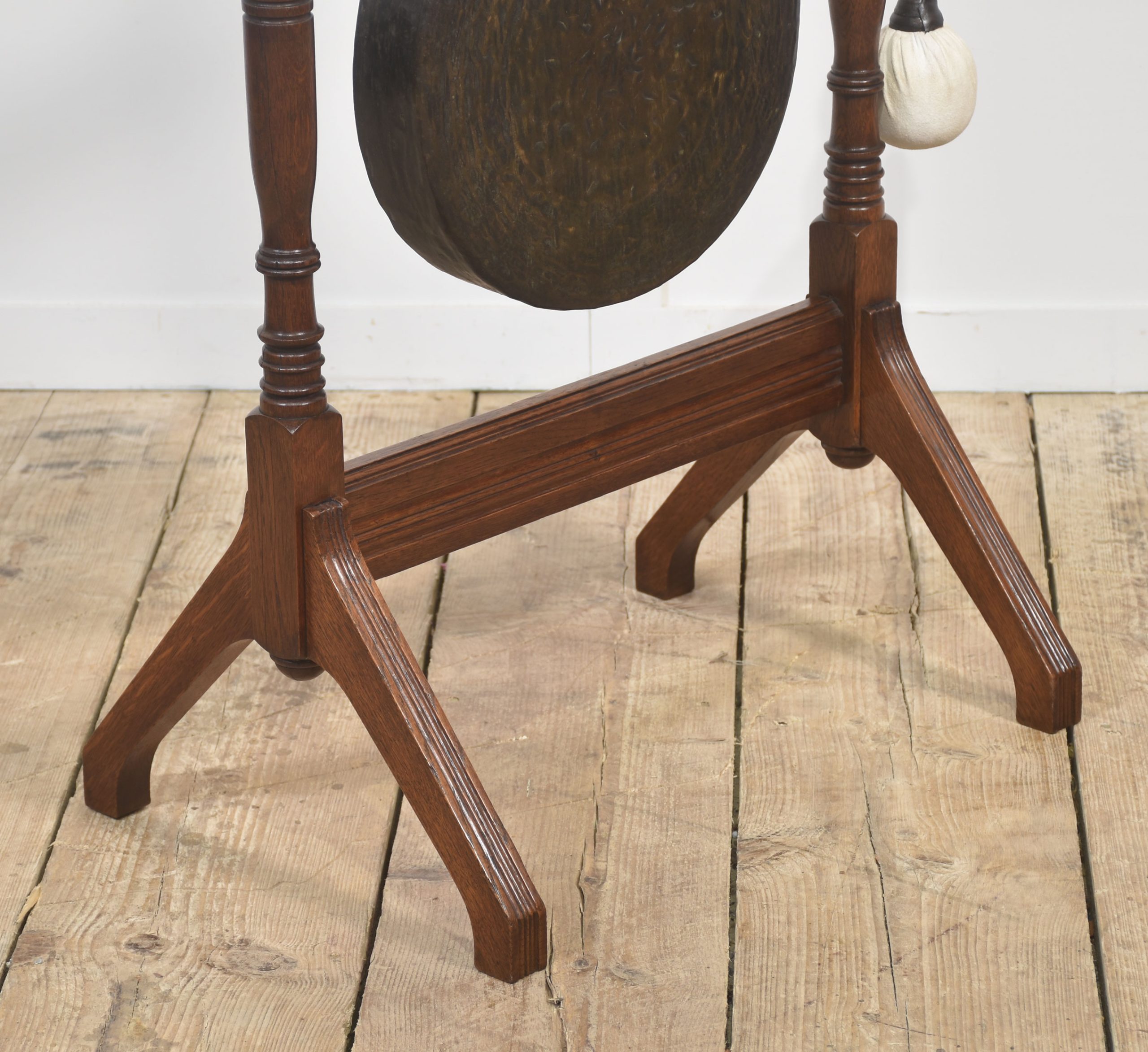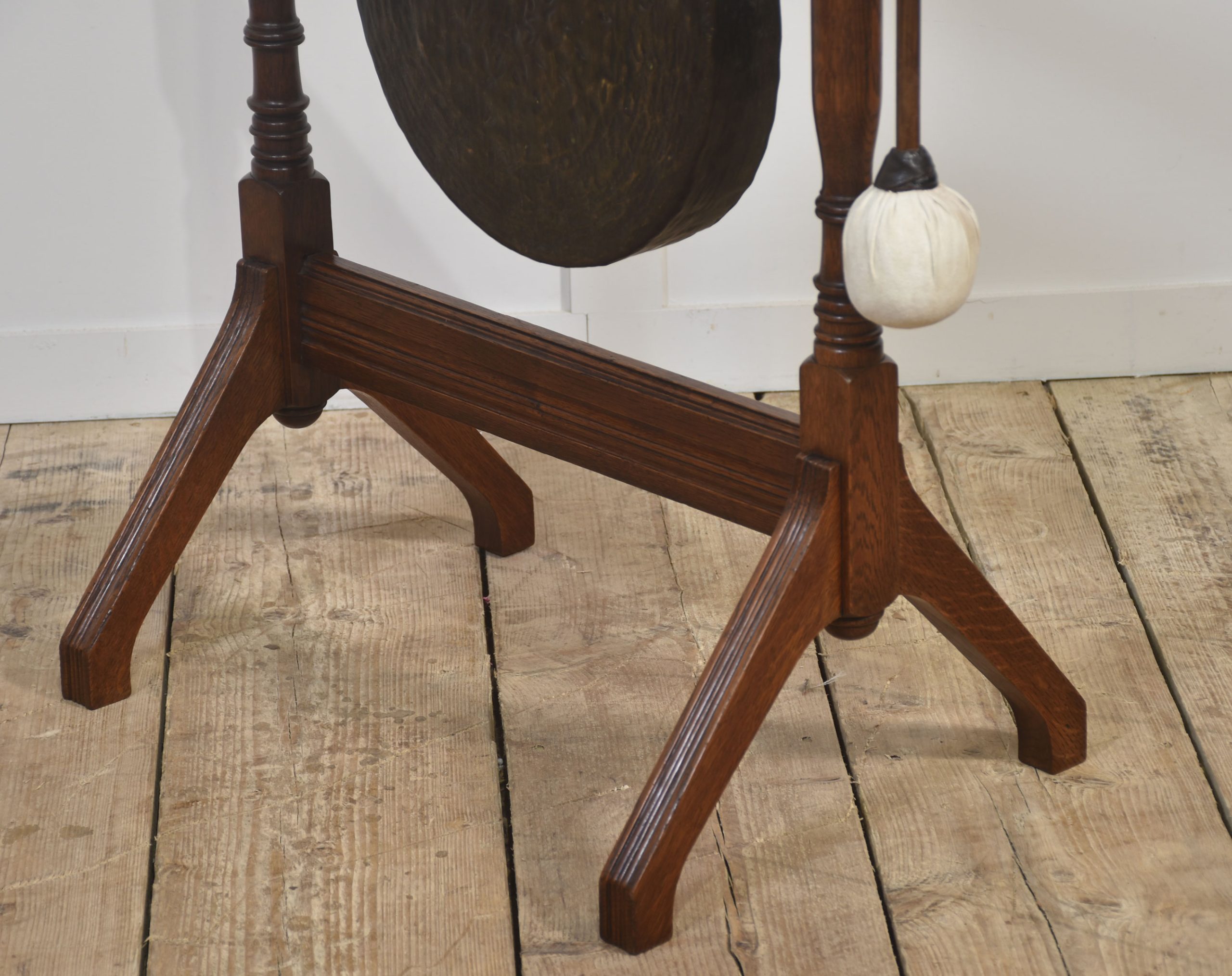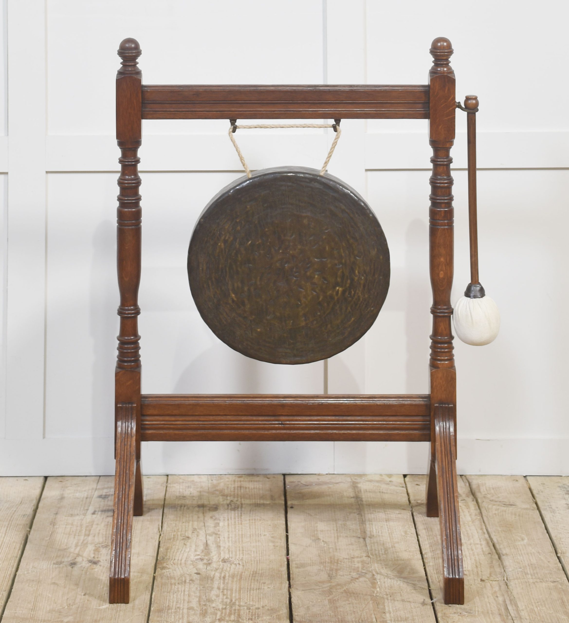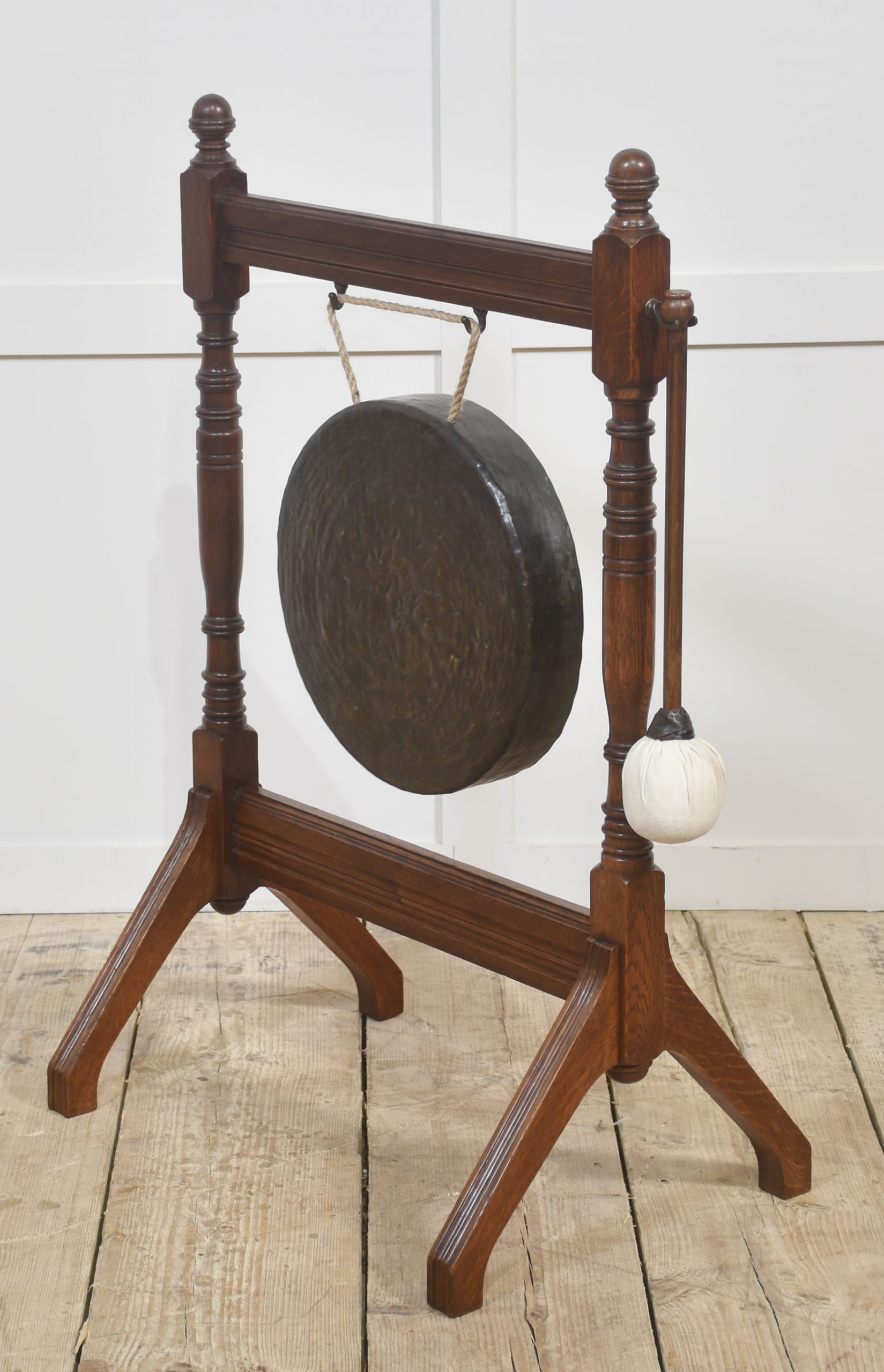A fine antique oak dinner gong, complete with its original turned oak stand and padded striker. The circular gong is suspended from a rope cord and produces a rich, resonant tone when struck, perfect for its traditional use of announcing mealtimes or simply as a decorative statement piece.