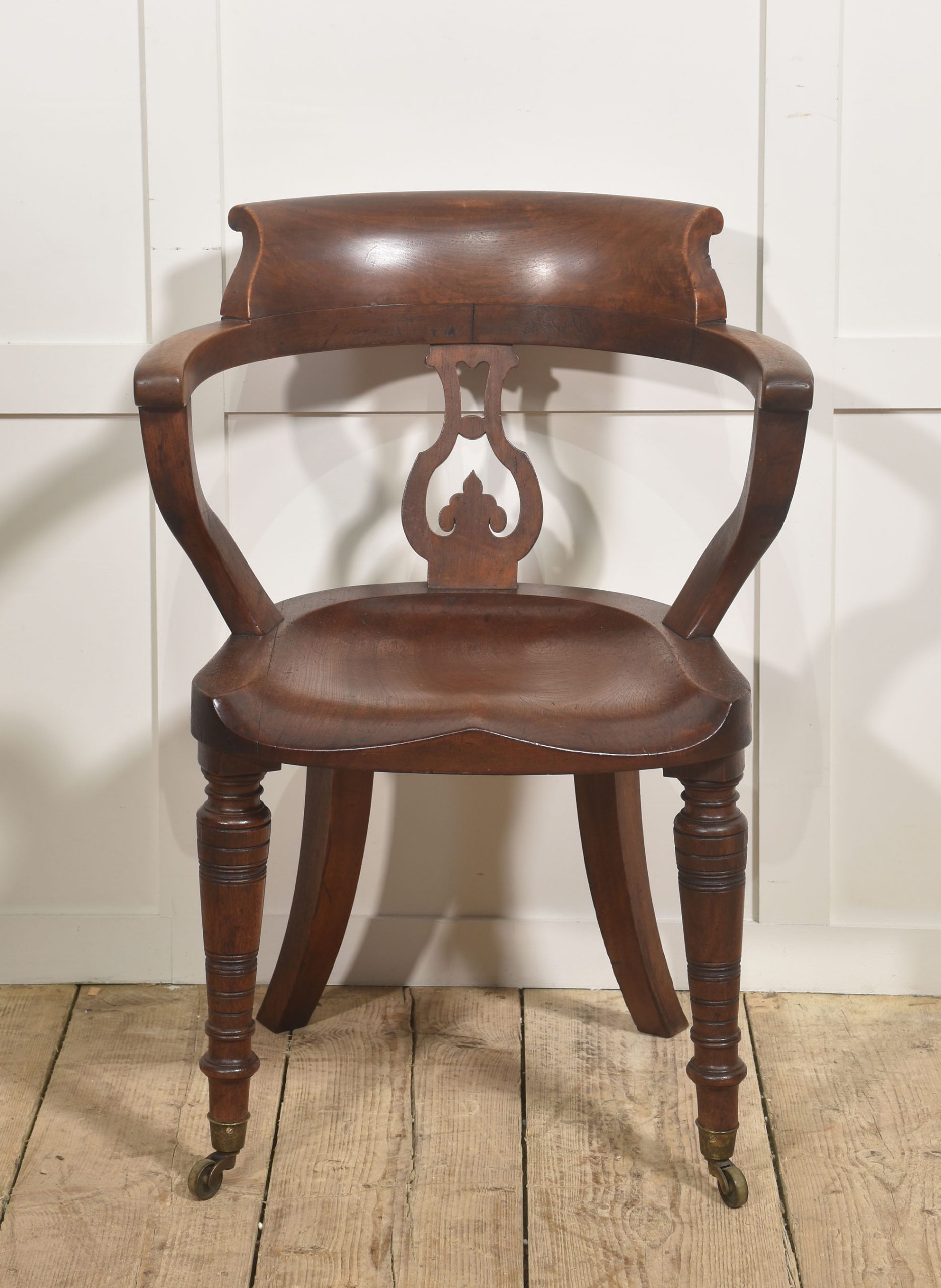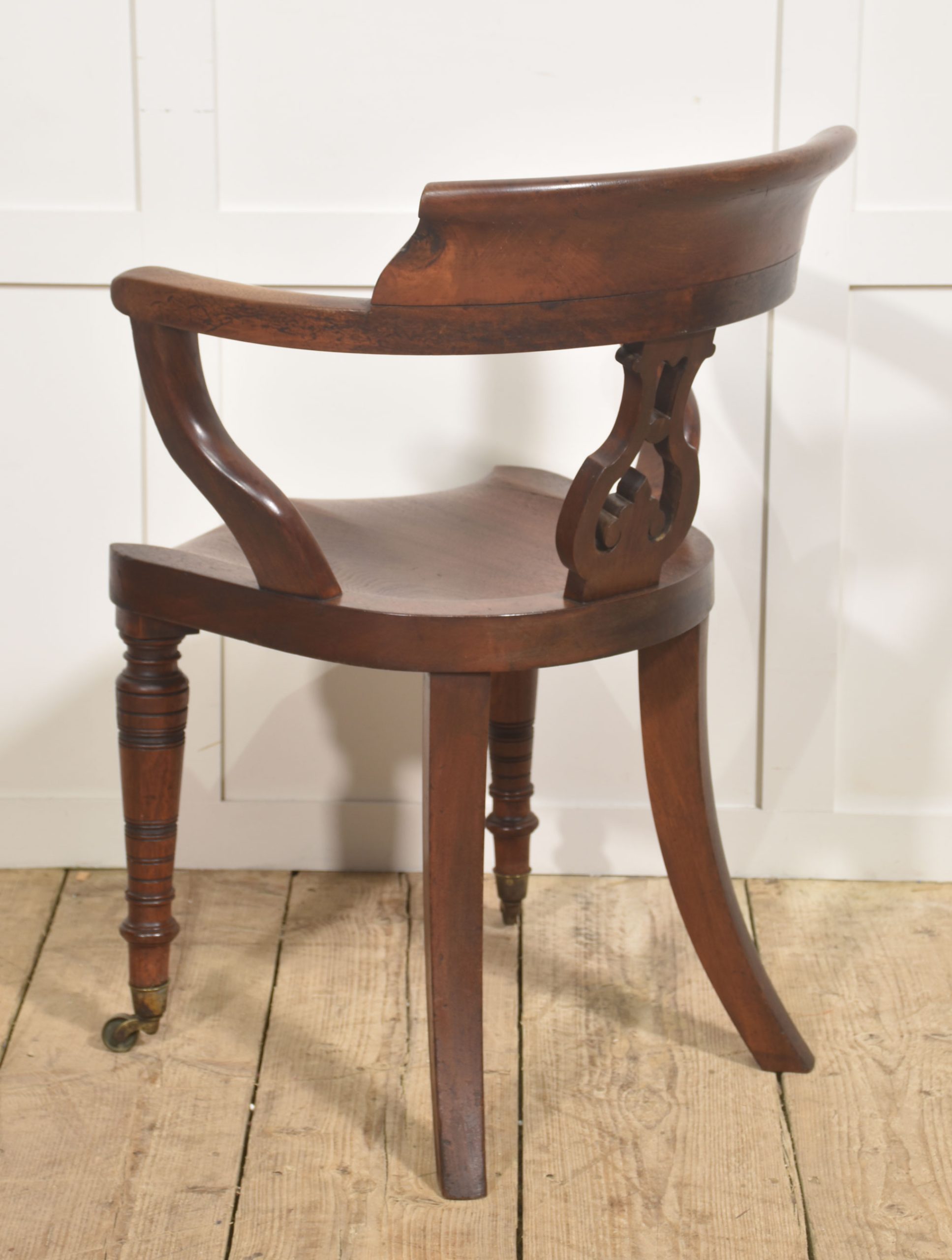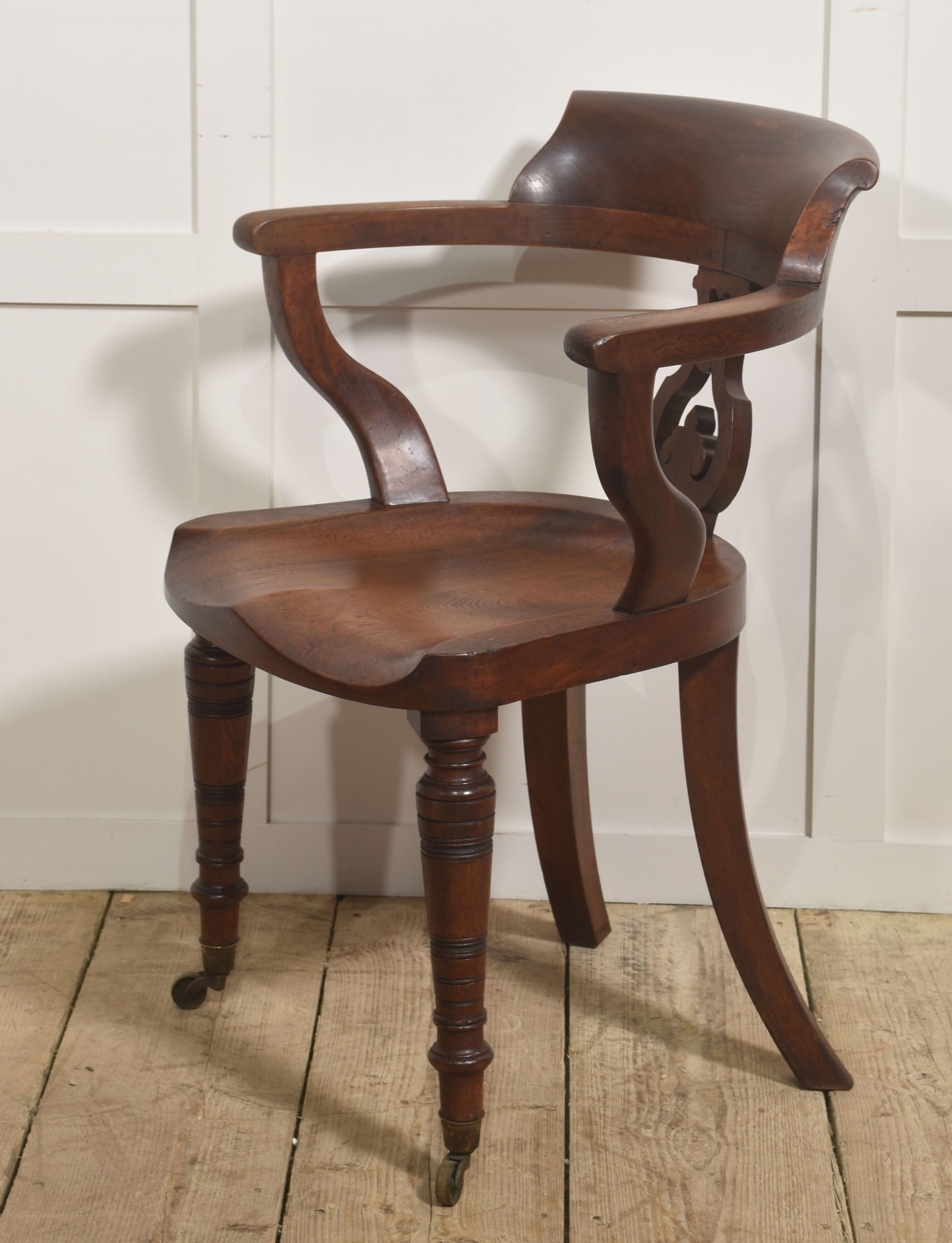 The chair stands on three turned front legs fitted with original brass caps and castors, while the rear is supported by distinctive swept sabre legs that give the piece both stability and a graceful profile. The warm walnut tone and well-proportioned design make it a characterful example of 19th-century craftsmanship, suitable for use as a desk chair, library chair, or occasional seating.