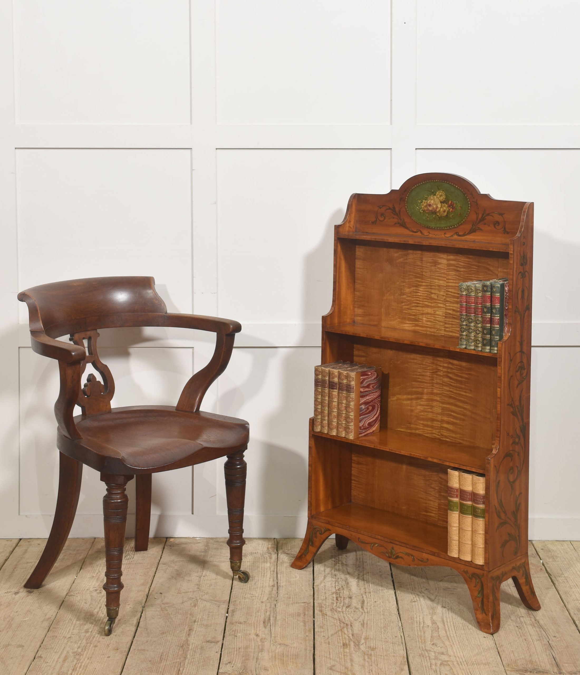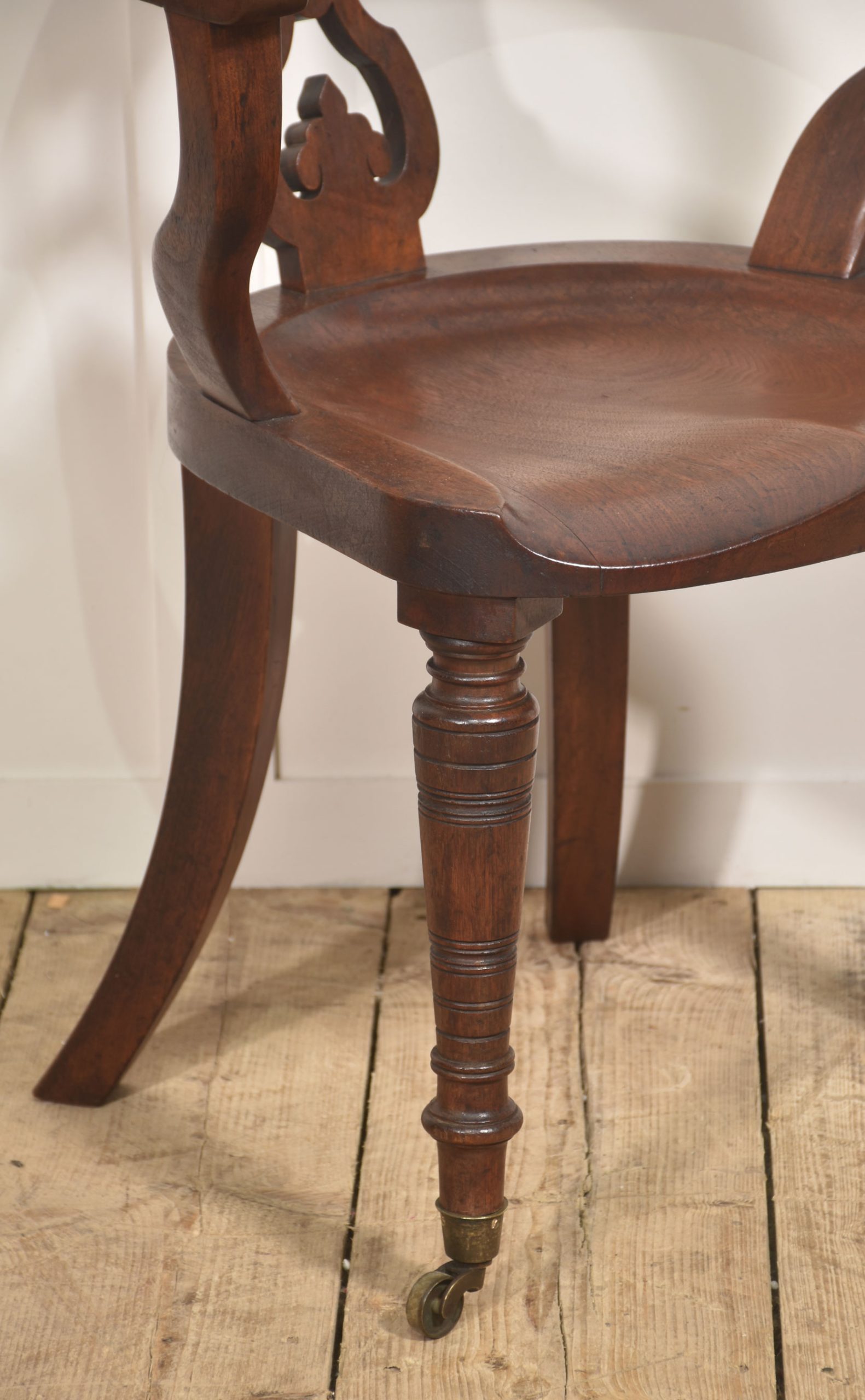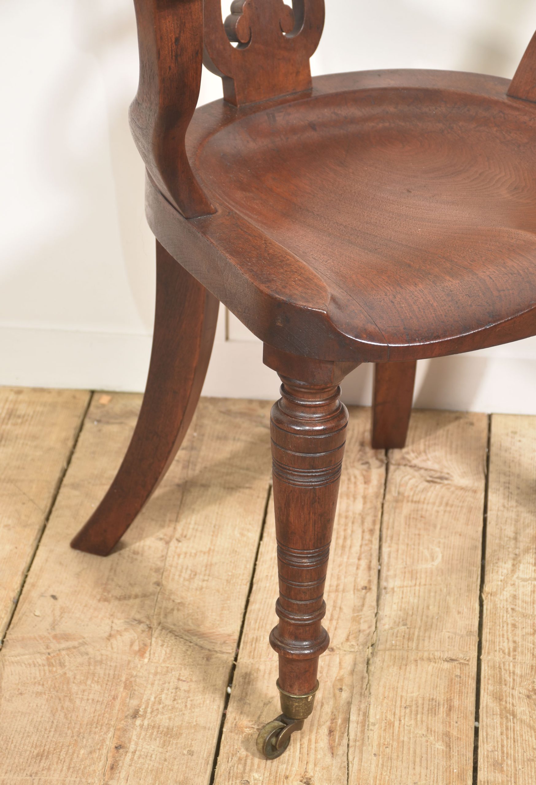 The chair stands on three turned front legs fitted with original brass caps and castors, while the rear is supported by distinctive swept sabre legs that give the piece both stability and a graceful profile. The warm walnut tone and well-proportioned design make it a characterful example of 19th-century craftsmanship, suitable for use as a desk chair, library chair, or occasional seating.