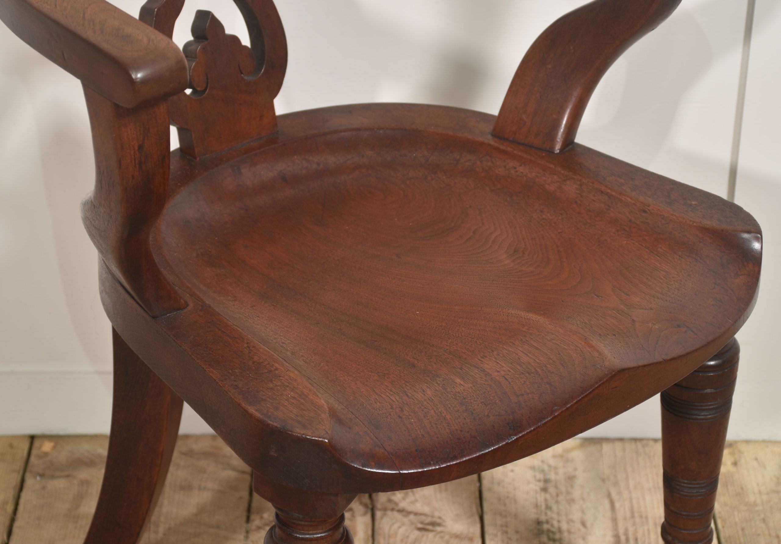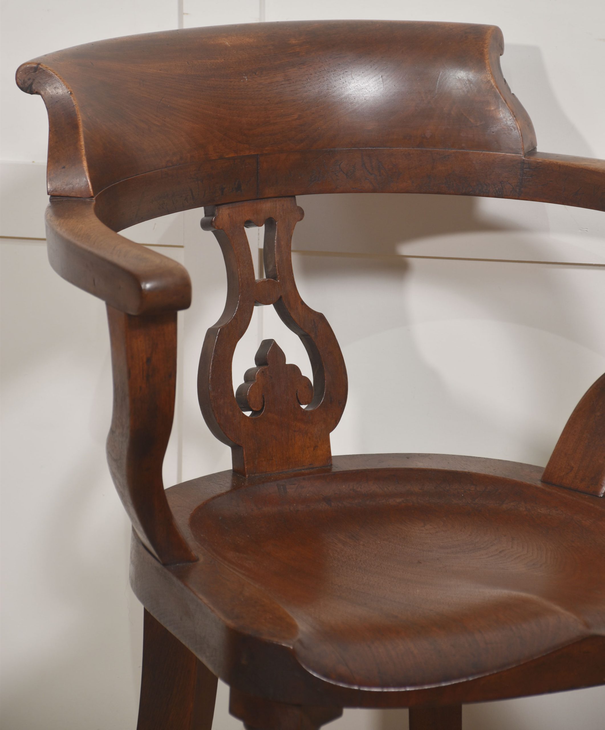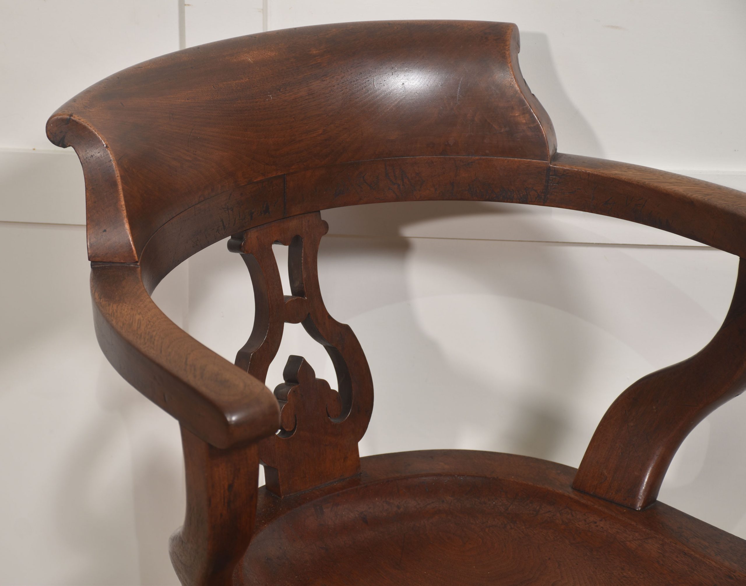 A finely crafted 19th-century walnut desk or library armchair of elegant and sculptural form. The chair features a shaped, wrap-around back with a broad curved crest rail flowing seamlessly into open arms, supported by a decorative pierced splat with stylised foliate detail. The seat is solid and dished for comfort, displaying attractive grain and rich patina consistent with age and use.