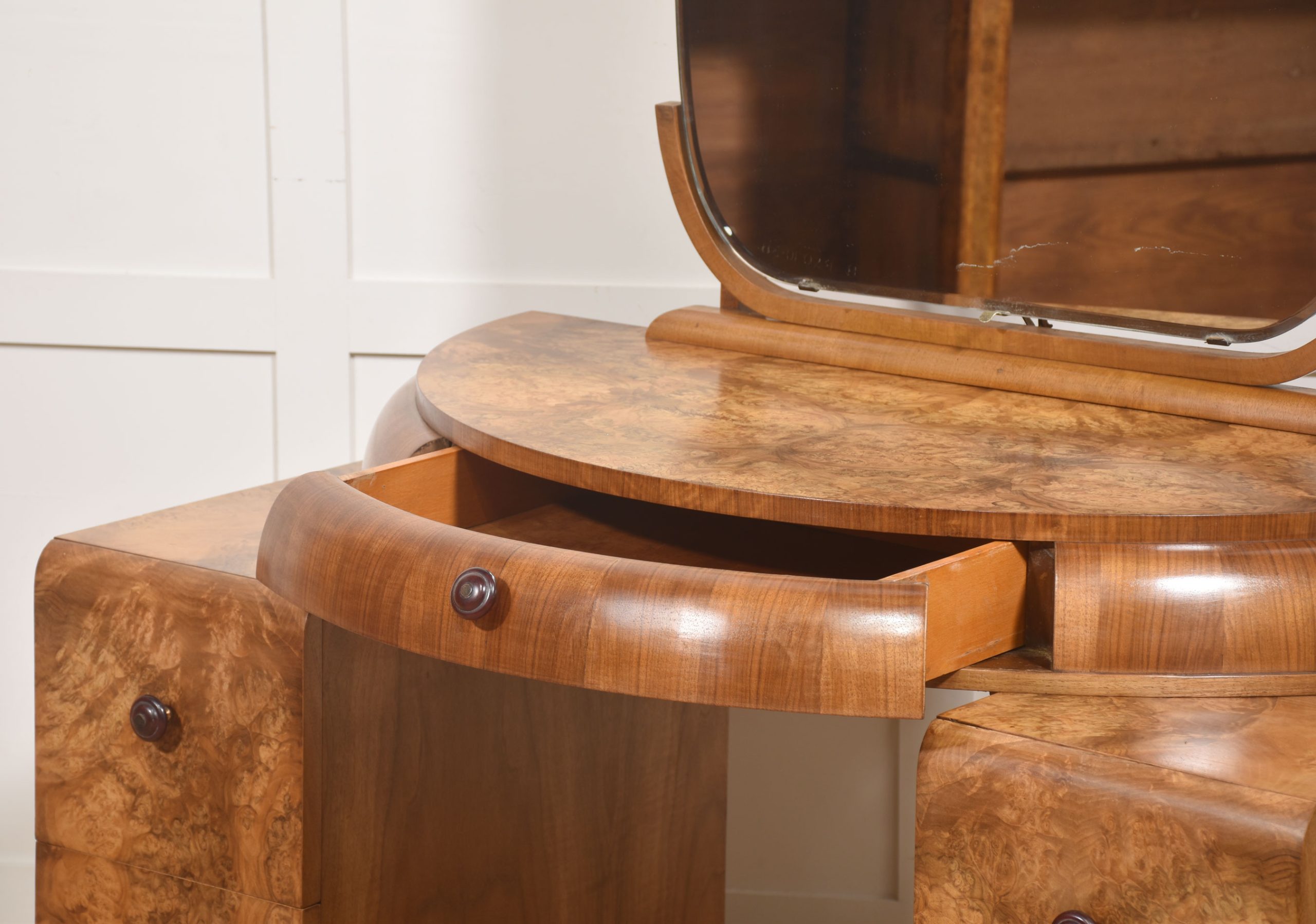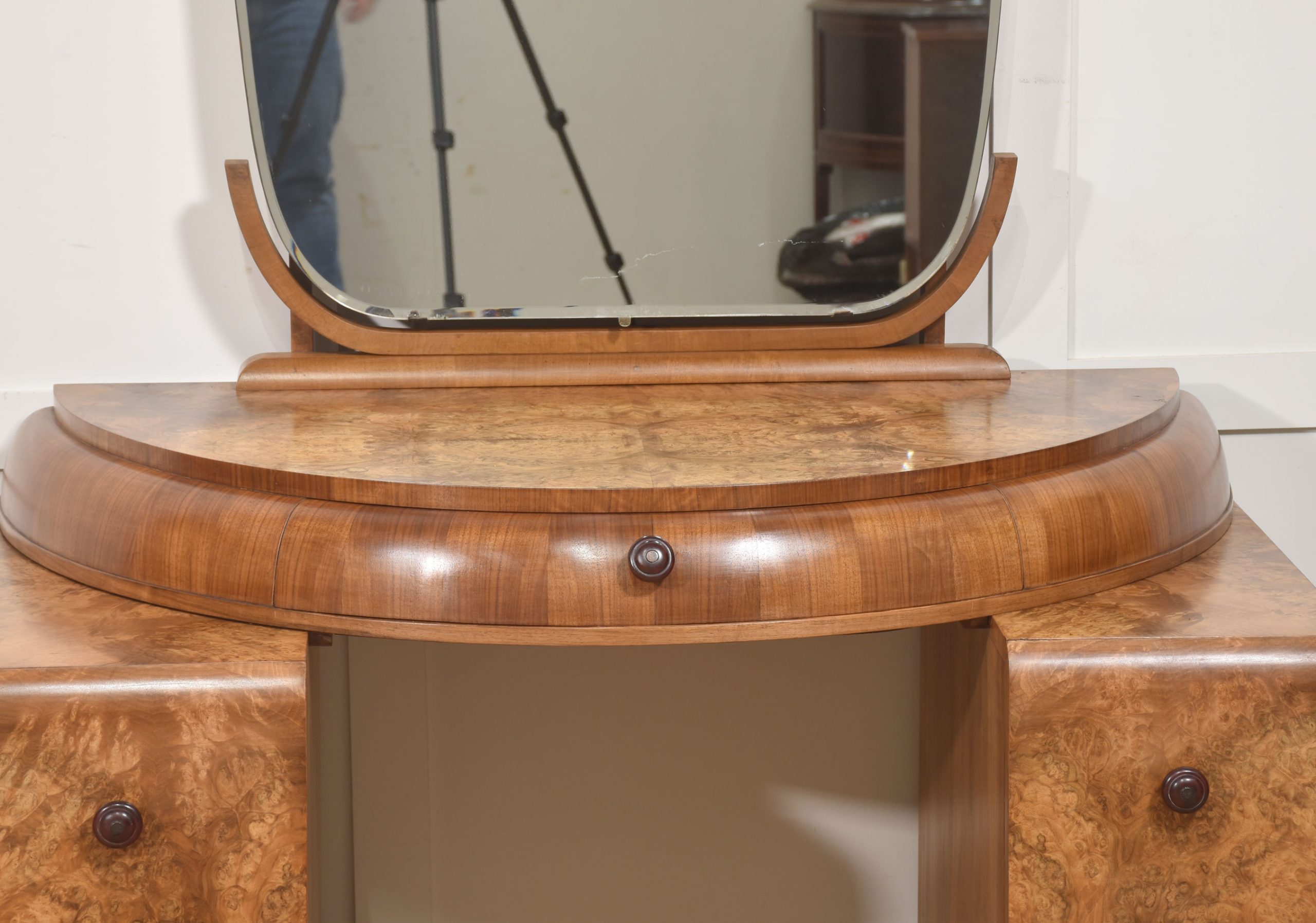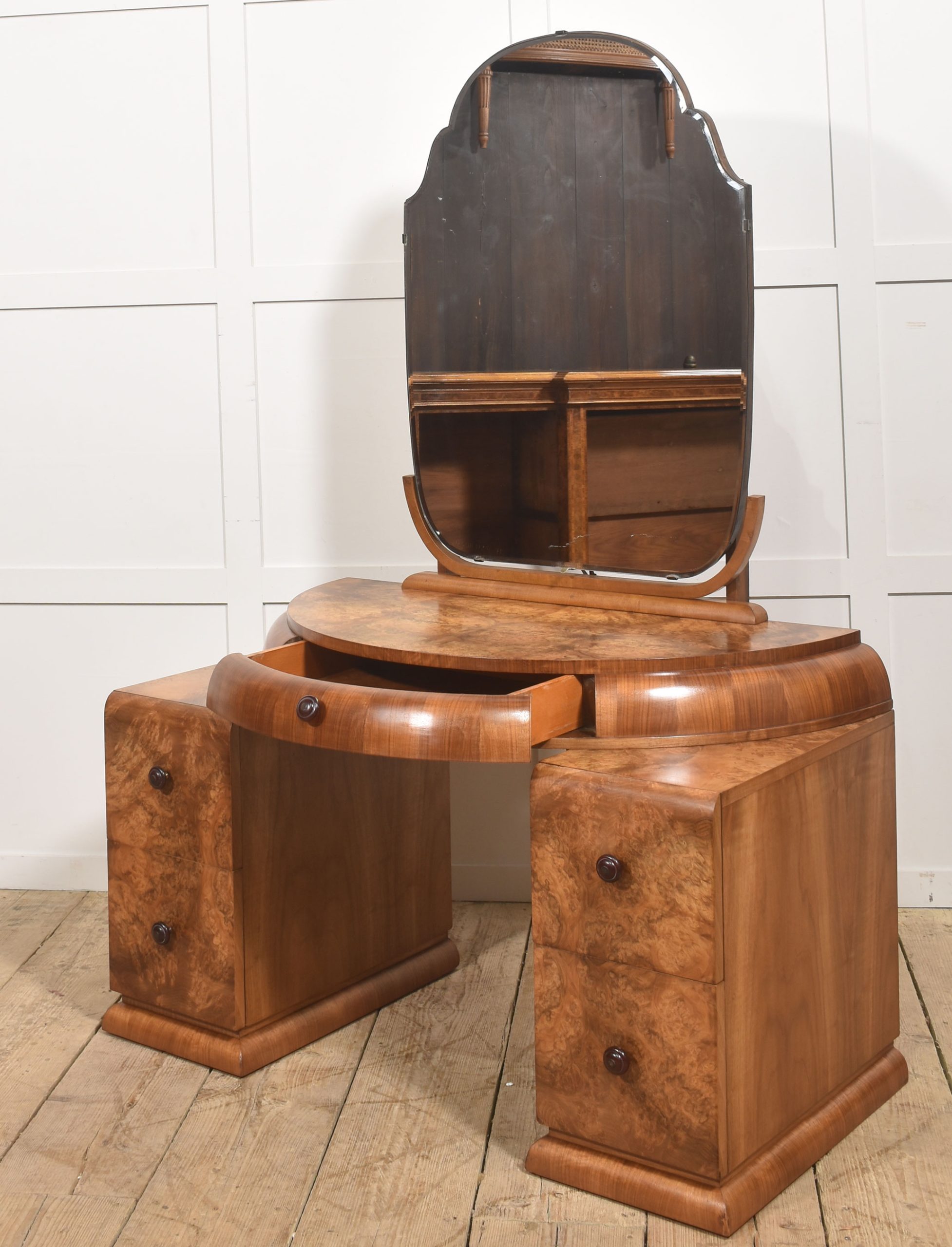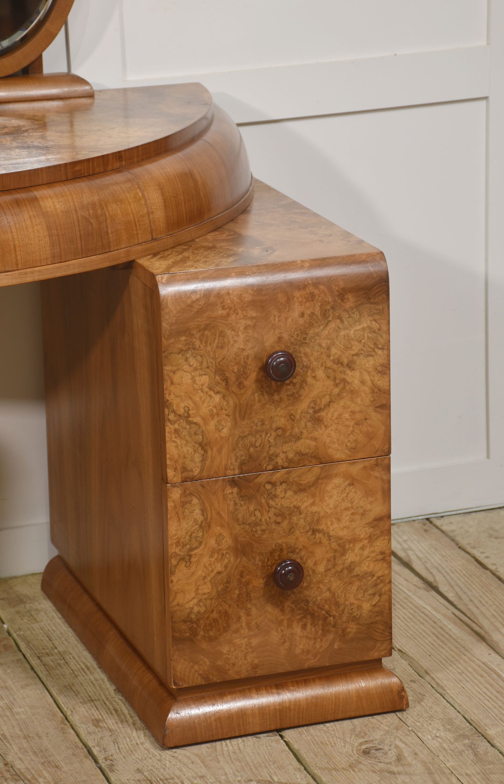 A well-figured burr walnut dressing table in the Art Deco manner, the rich veneers displaying lively swirling grain and warm honeyed tones throughout. The kidney-shaped top is raised above a central frieze drawer, flanked symmetrically by twin pedestal cupboards, each fitted with two drawers and finished with dark Bakelite knob handles, characteristic of the period. The rounded edges and stepped plinth bases emphasise the streamlined, modernist aesthetic associated with 1930s design.