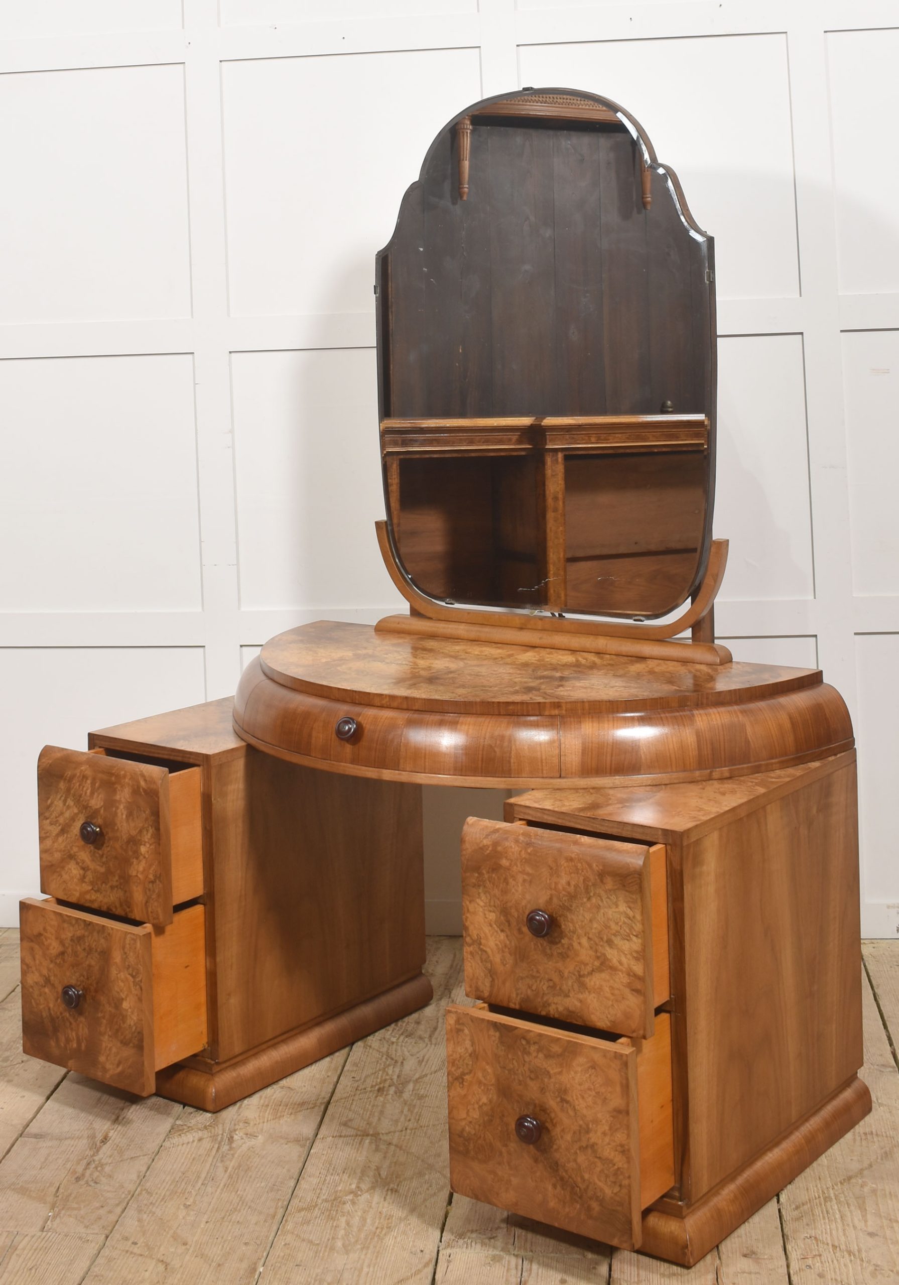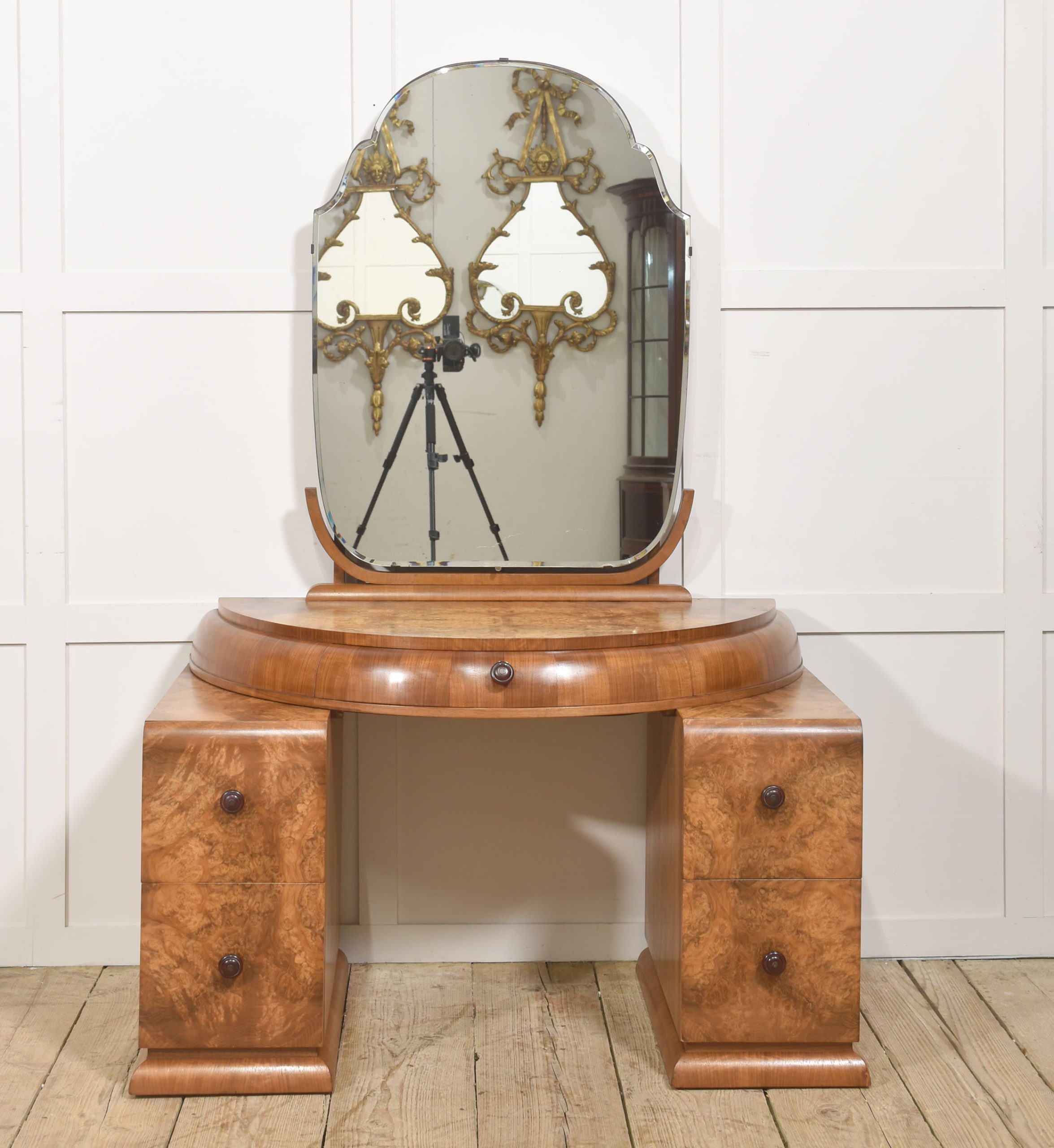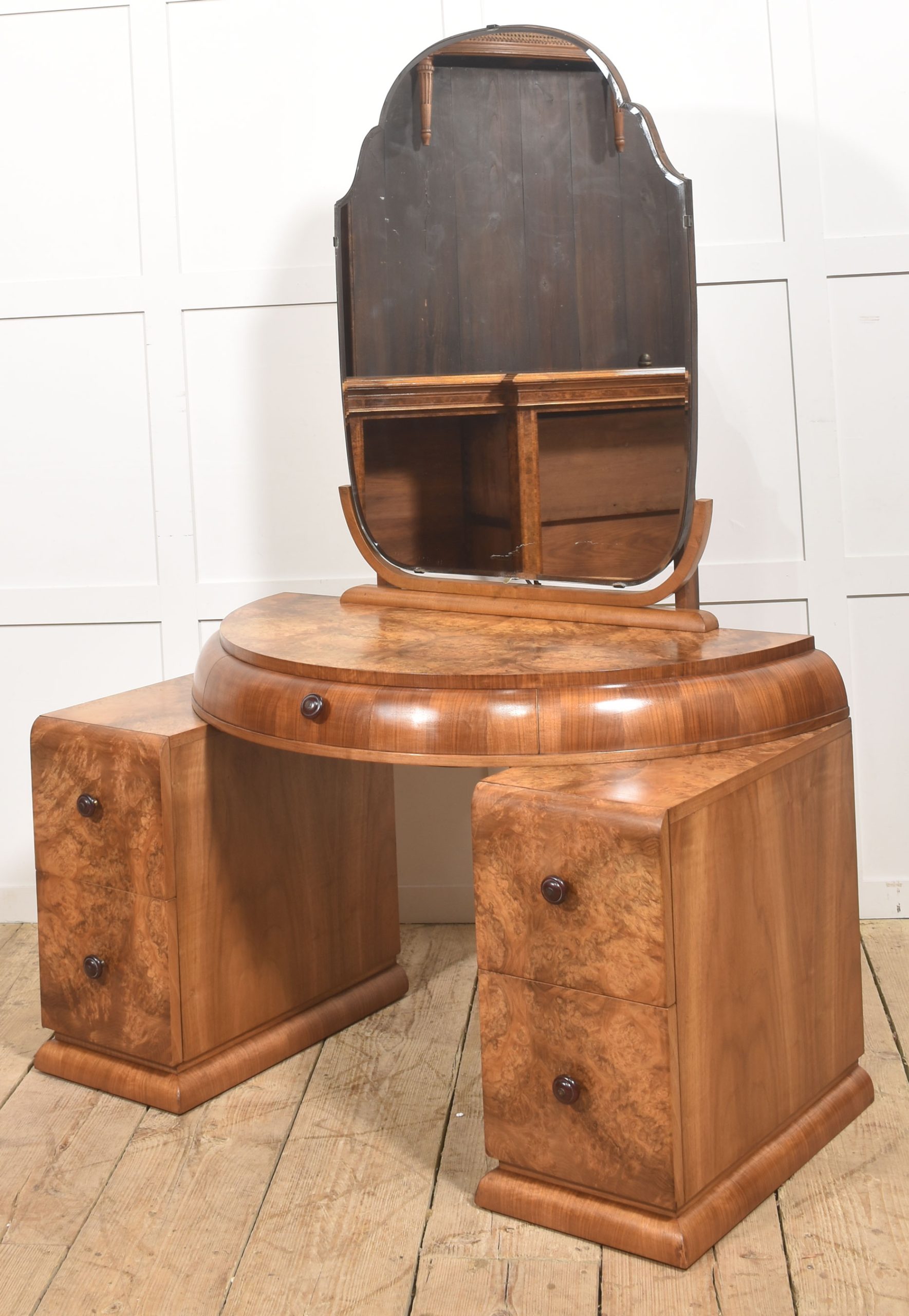 A well-figured burr walnut dressing table in the Art Deco manner, the rich veneers displaying lively swirling grain and warm honeyed tones throughout. The kidney-shaped top is raised above a central frieze drawer, flanked symmetrically by twin pedestal cupboards, each fitted with two drawers and finished with dark Bakelite knob handles, characteristic of the period. The rounded edges and stepped plinth bases emphasise the streamlined, modernist aesthetic associated with 1930s design.