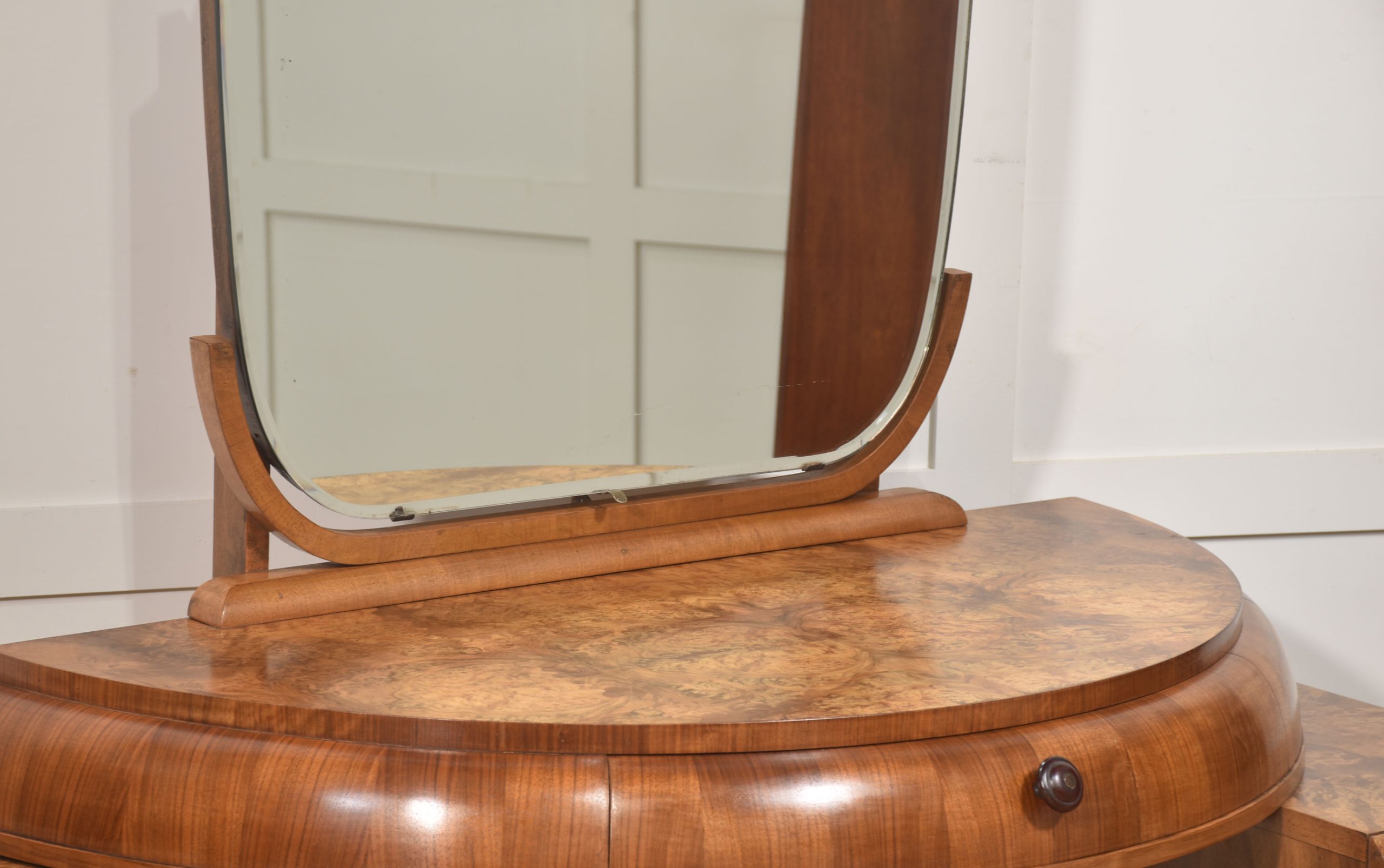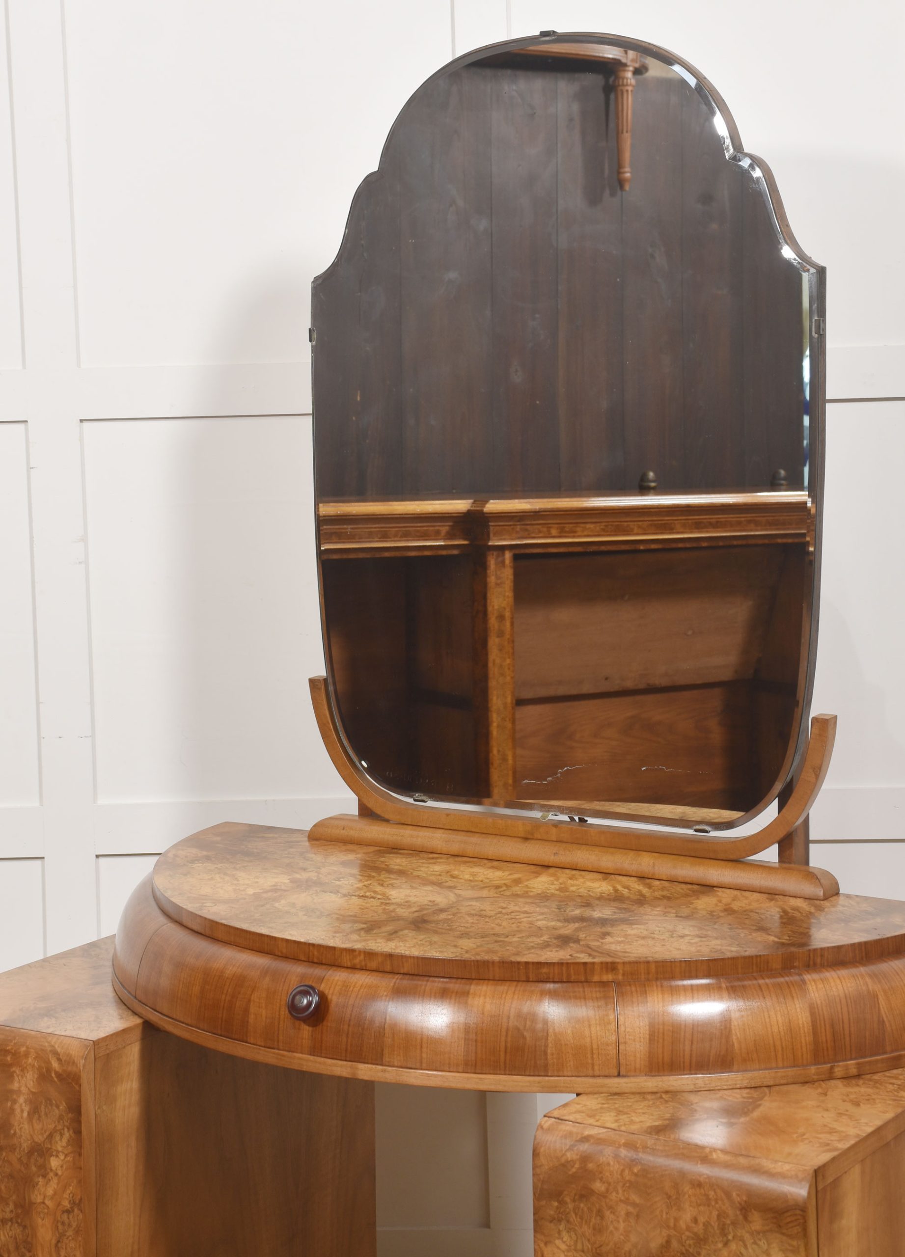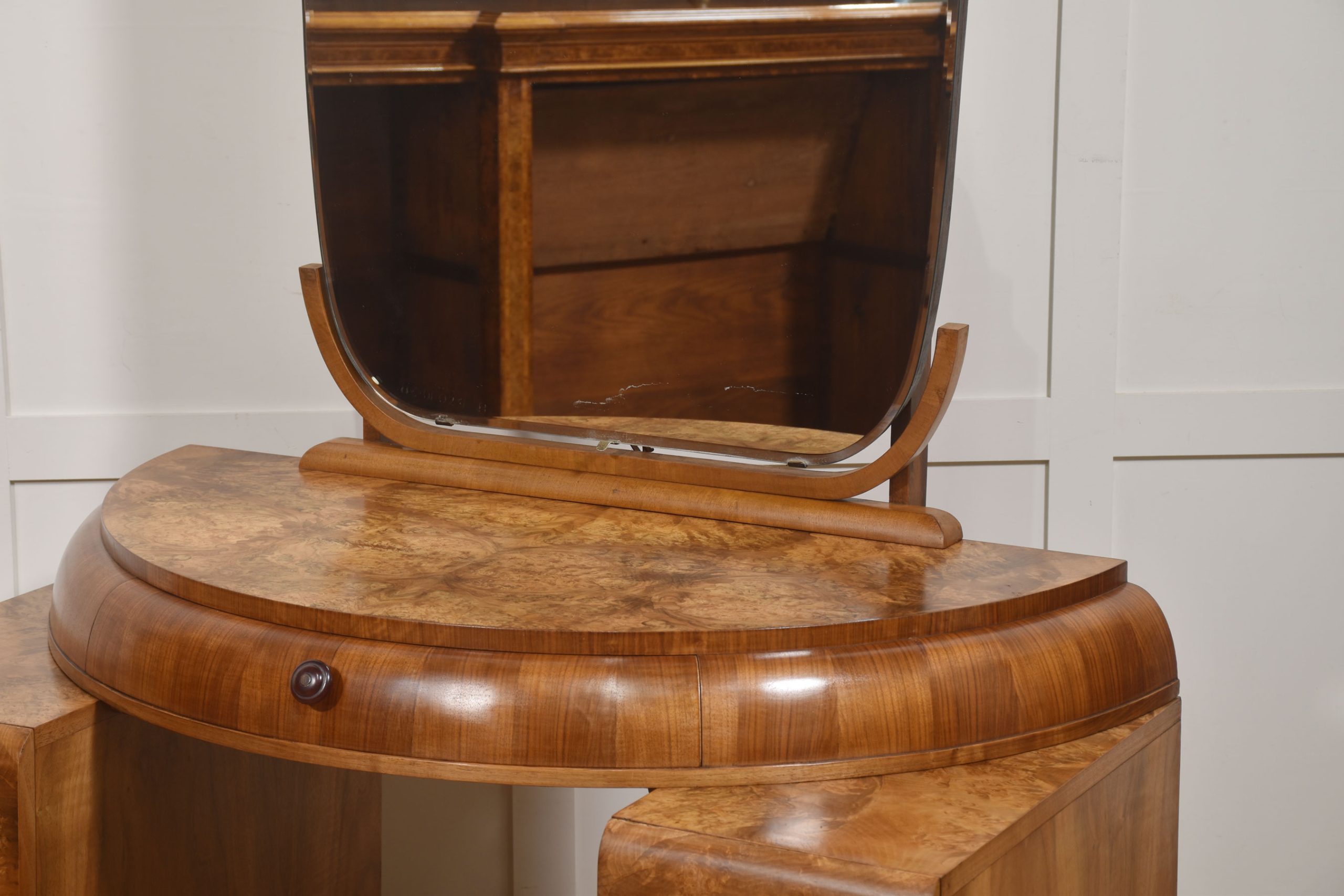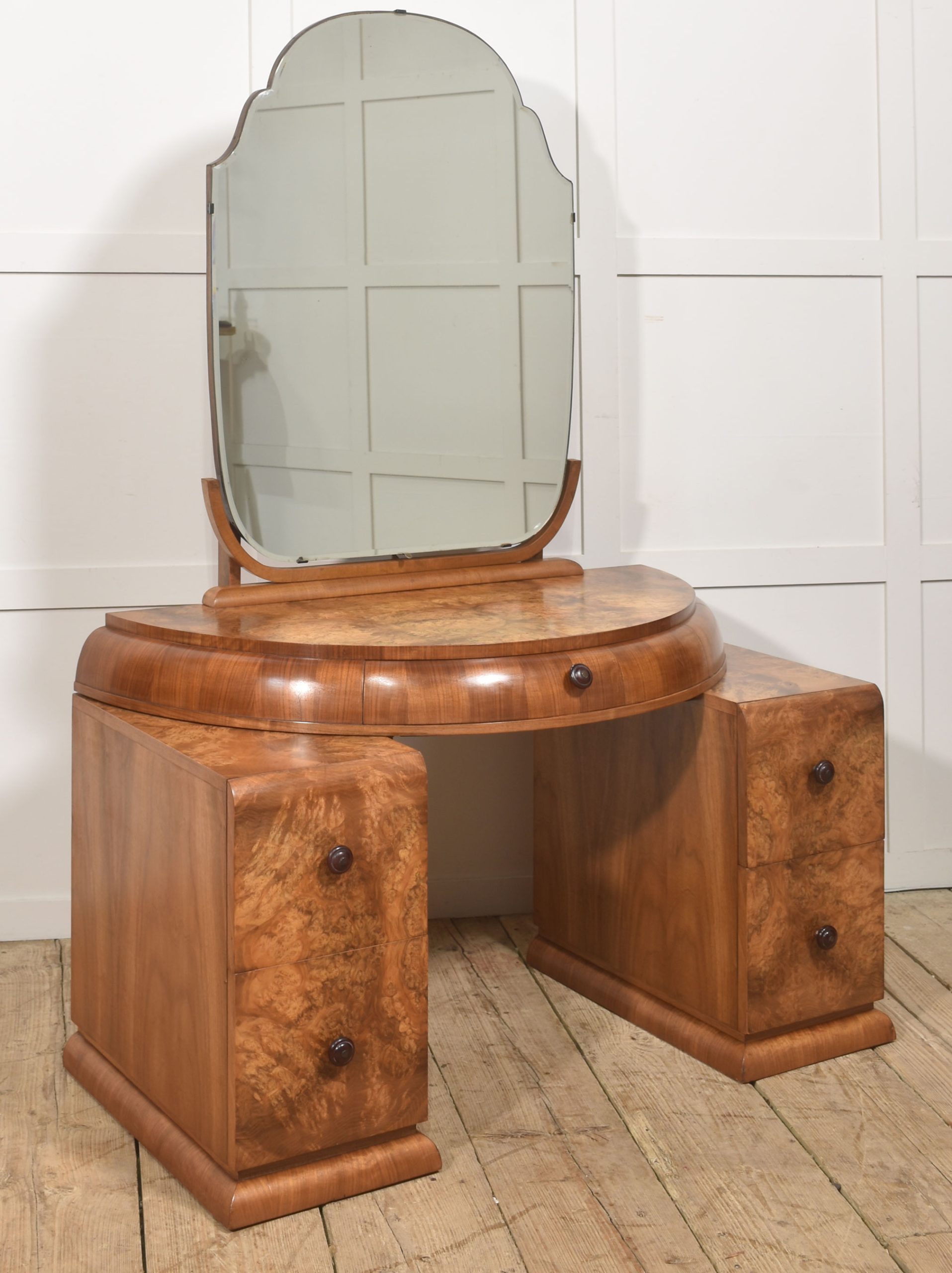 A well-figured burr walnut dressing table in the Art Deco manner, the rich veneers displaying lively swirling grain and warm honeyed tones throughout. The kidney-shaped top is raised above a central frieze drawer, flanked symmetrically by twin pedestal cupboards, each fitted with two drawers and finished with dark Bakelite knob handles, characteristic of the period. The rounded edges and stepped plinth bases emphasise the streamlined, modernist aesthetic associated with 1930s design.