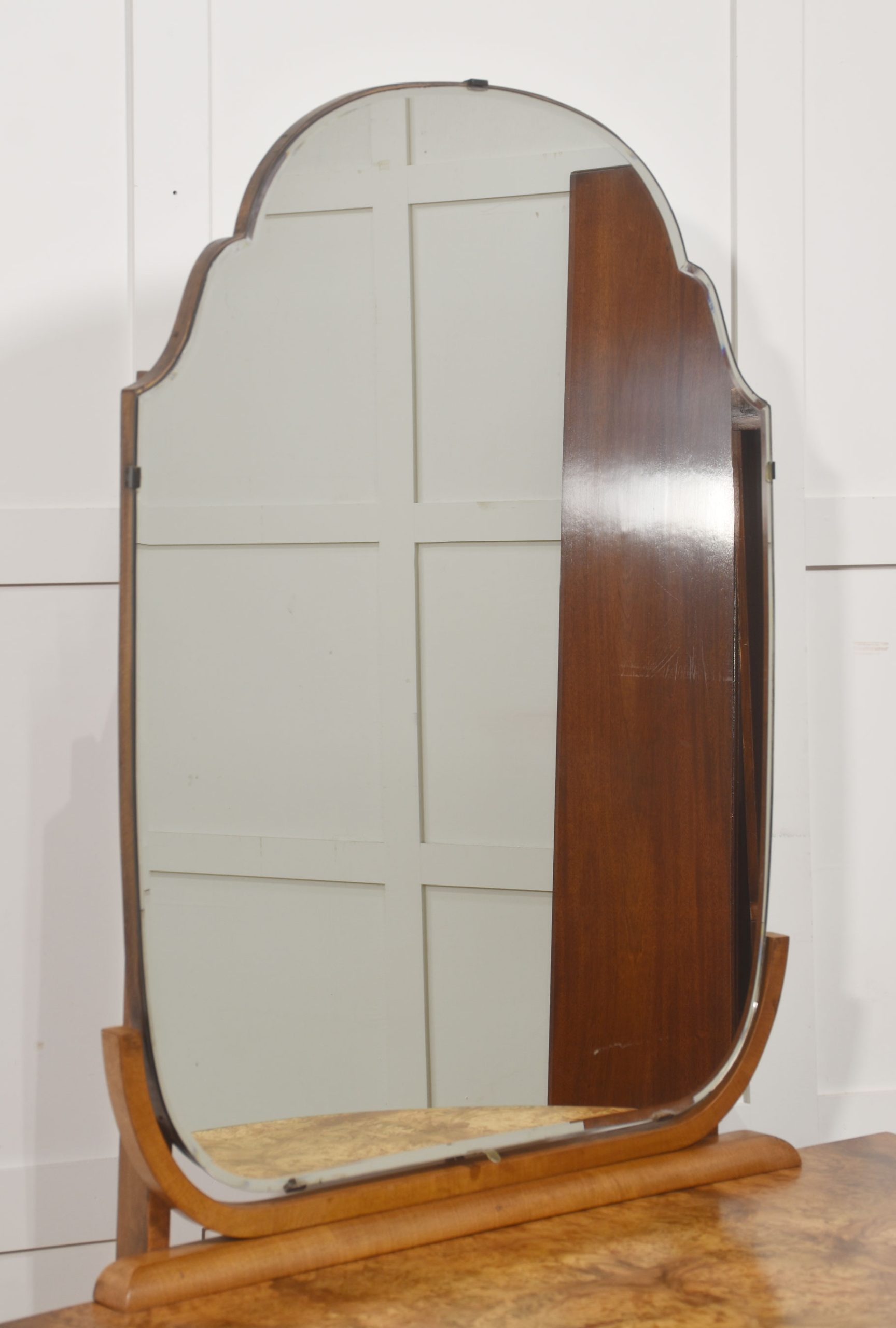 The original mirror plate, of shaped rectangular form with softened shoulders, is mounted within a simple stand and retains its subtle bevelled edge. The table surface and drawer fronts are particularly striking, showcasing carefully matched burr walnut veneers, while the sides are finished in a complementary straight grain, enhancing the contrast of textures.