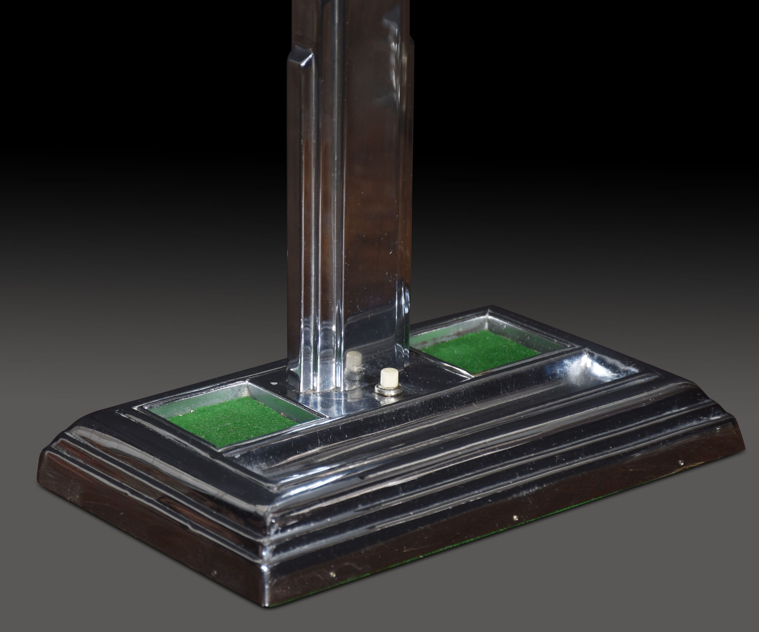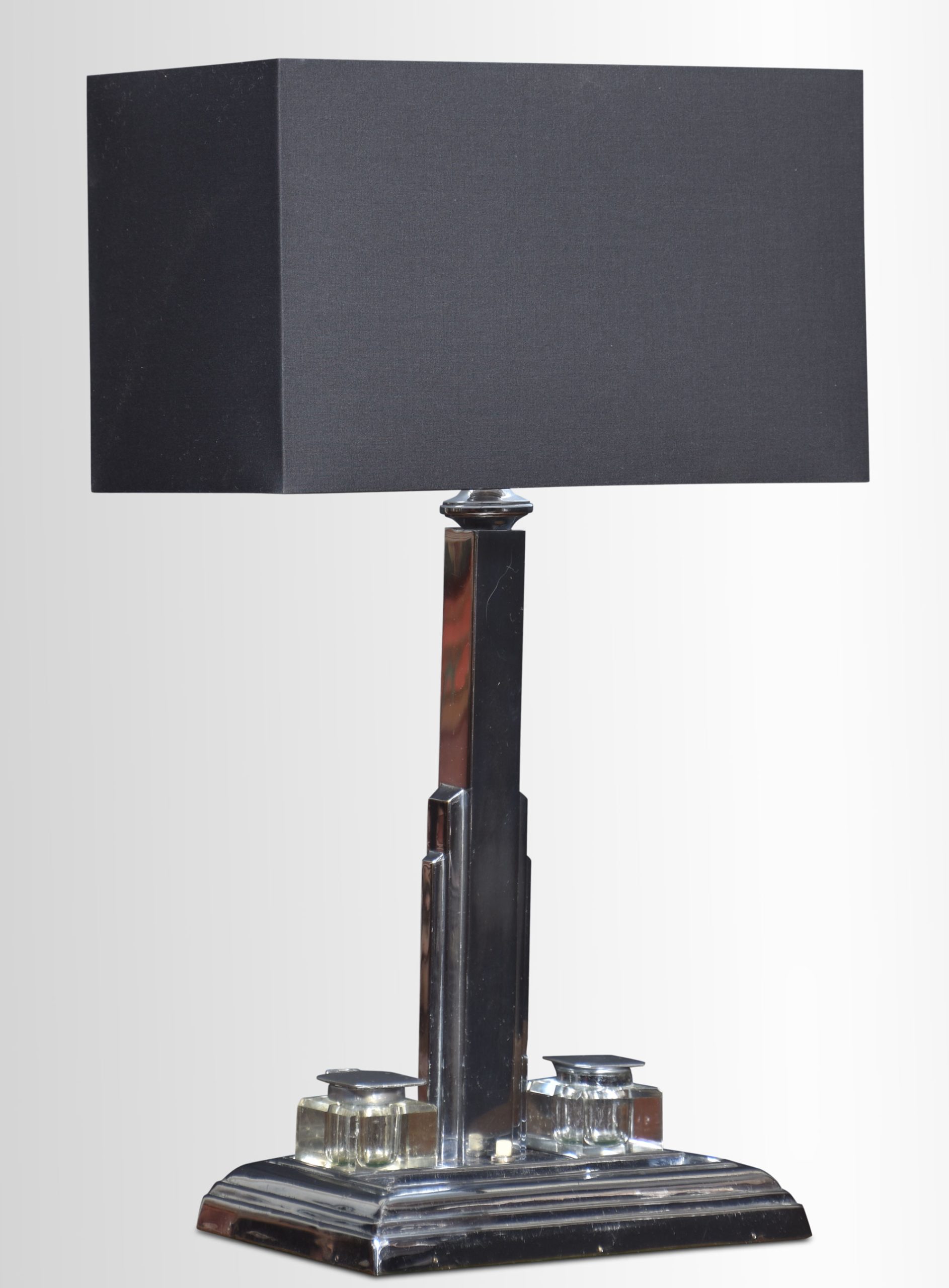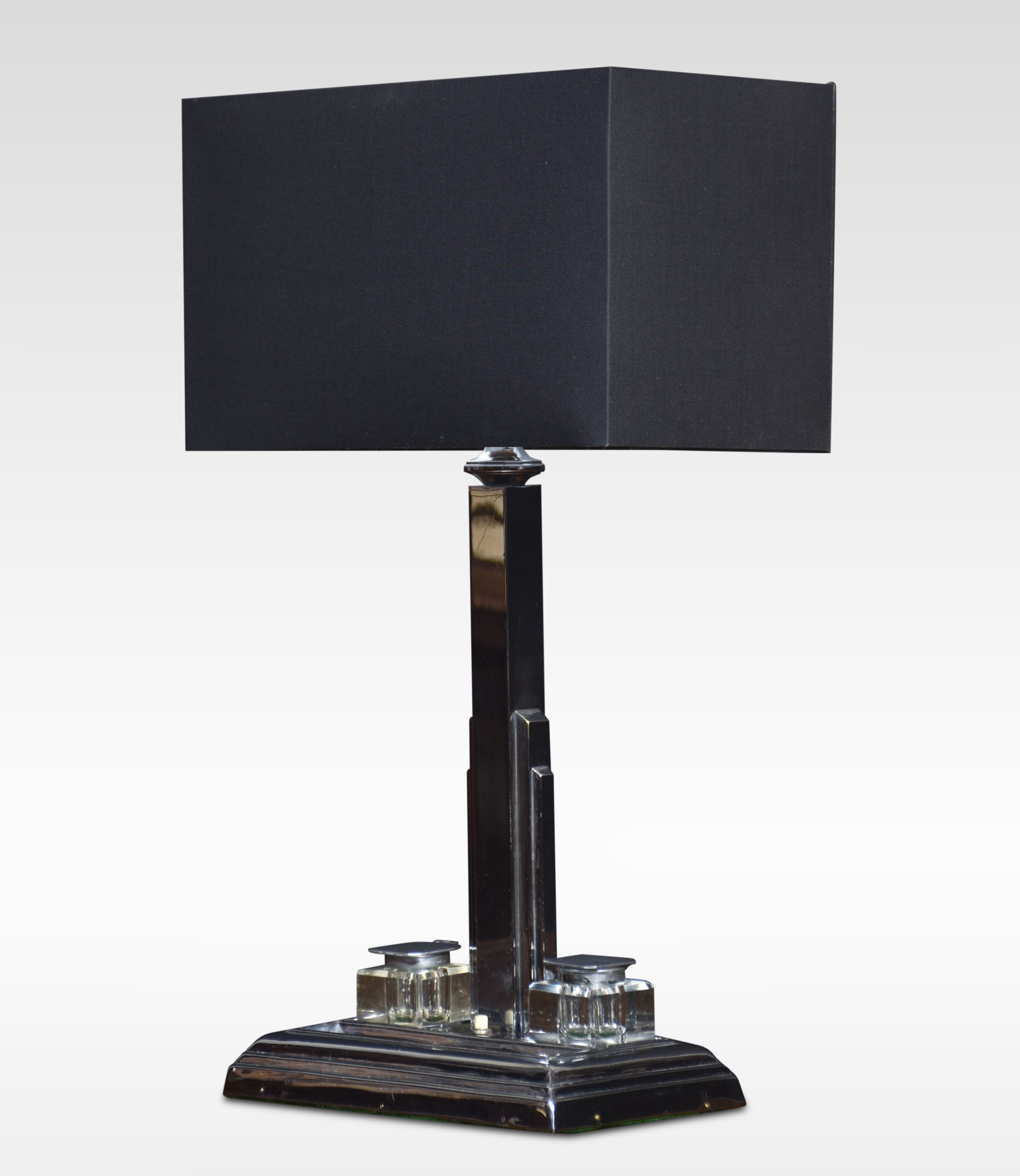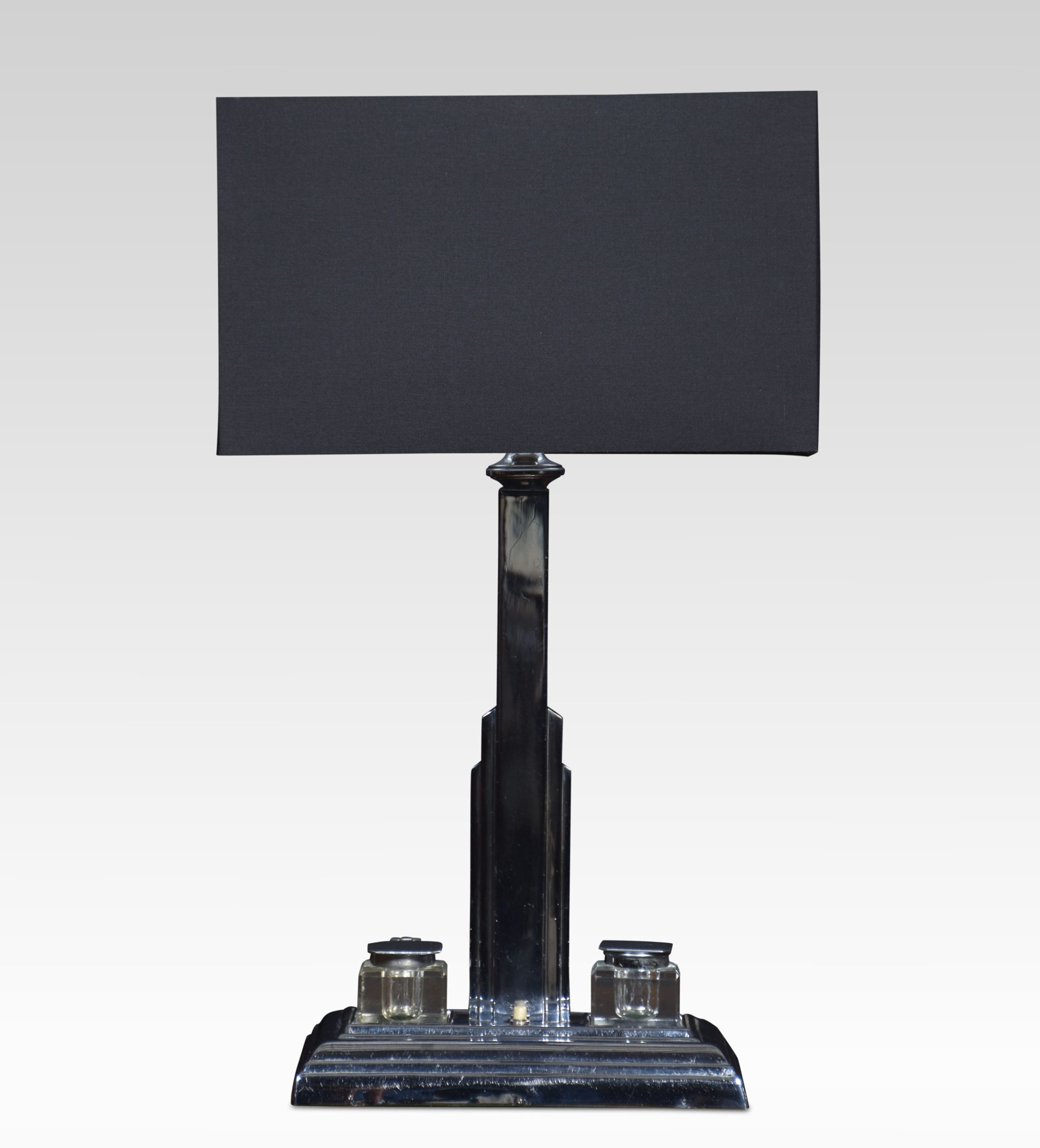 Art Deco chrome desk lamp with the square stepped stem supported on a rectangular base with inset inkwells and pen rest.