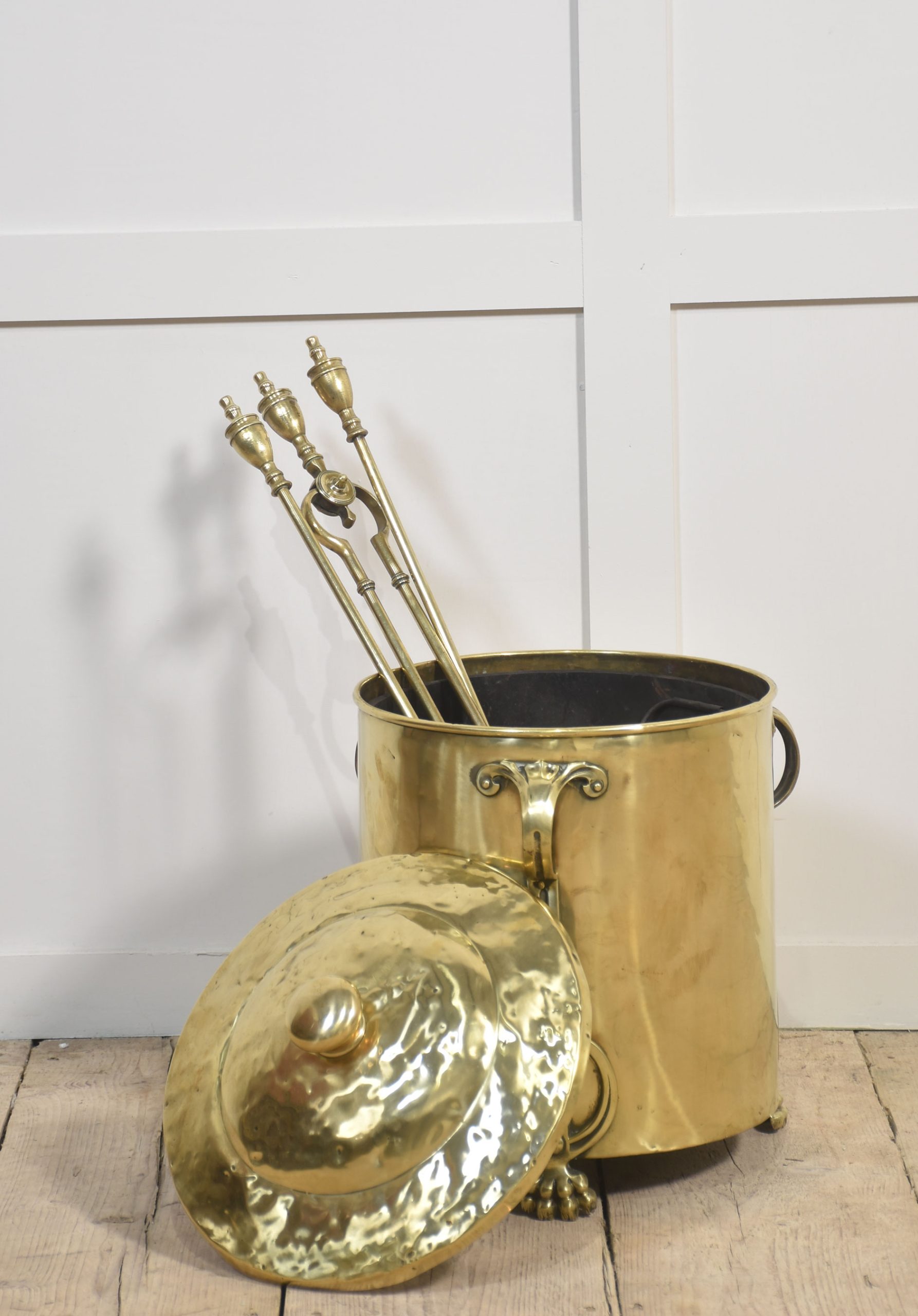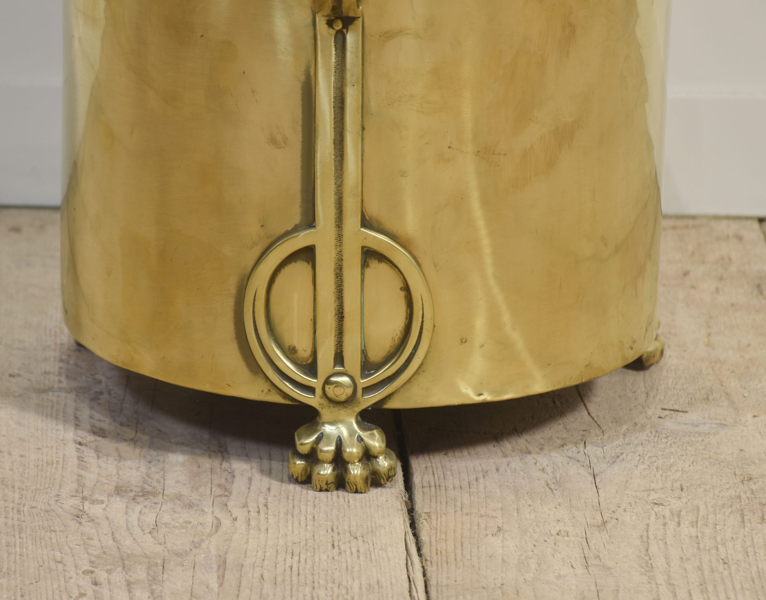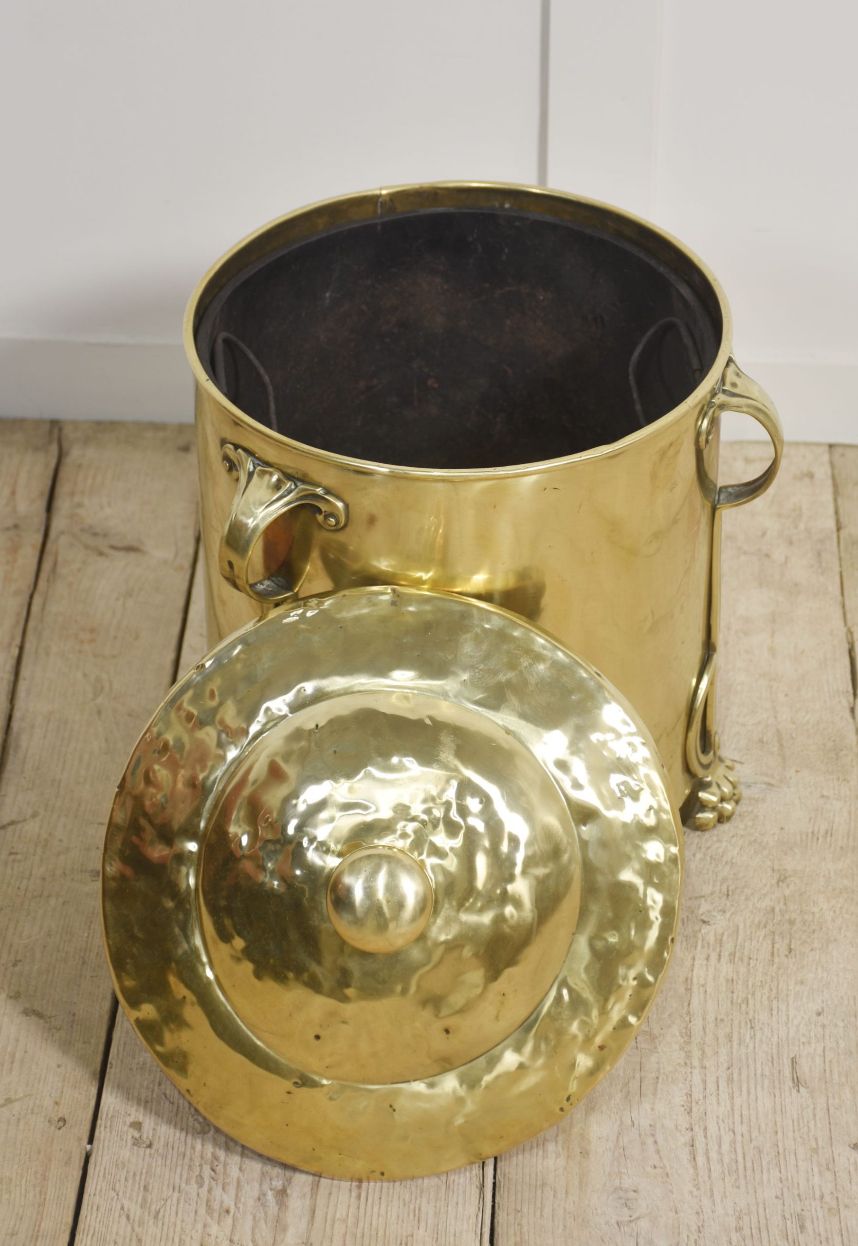 Art Nouveau brass coal bin of cylindrical form, the removable lid opening to reveal the original tin liner. Above three strap-work handles, all raised up on paw feet.
