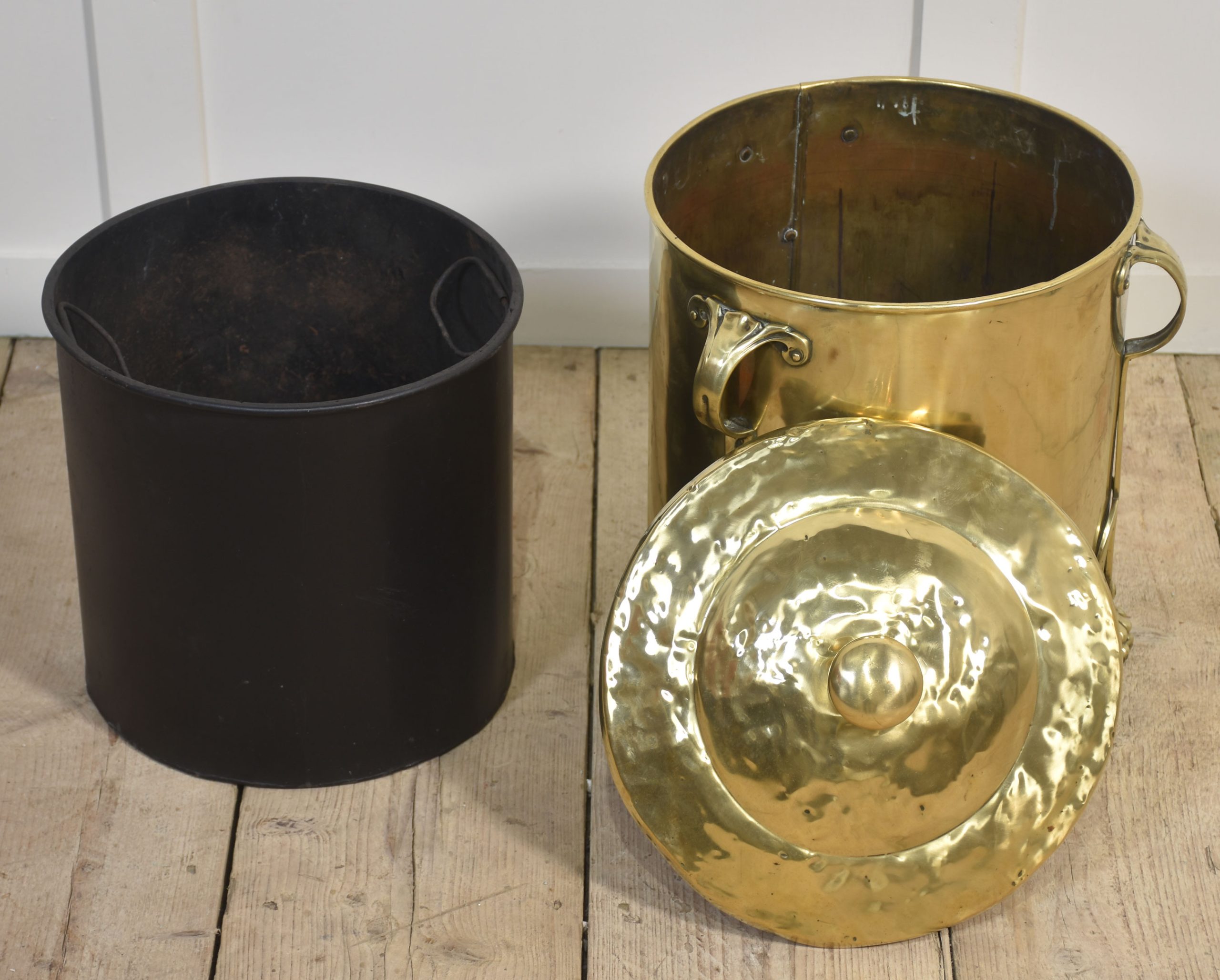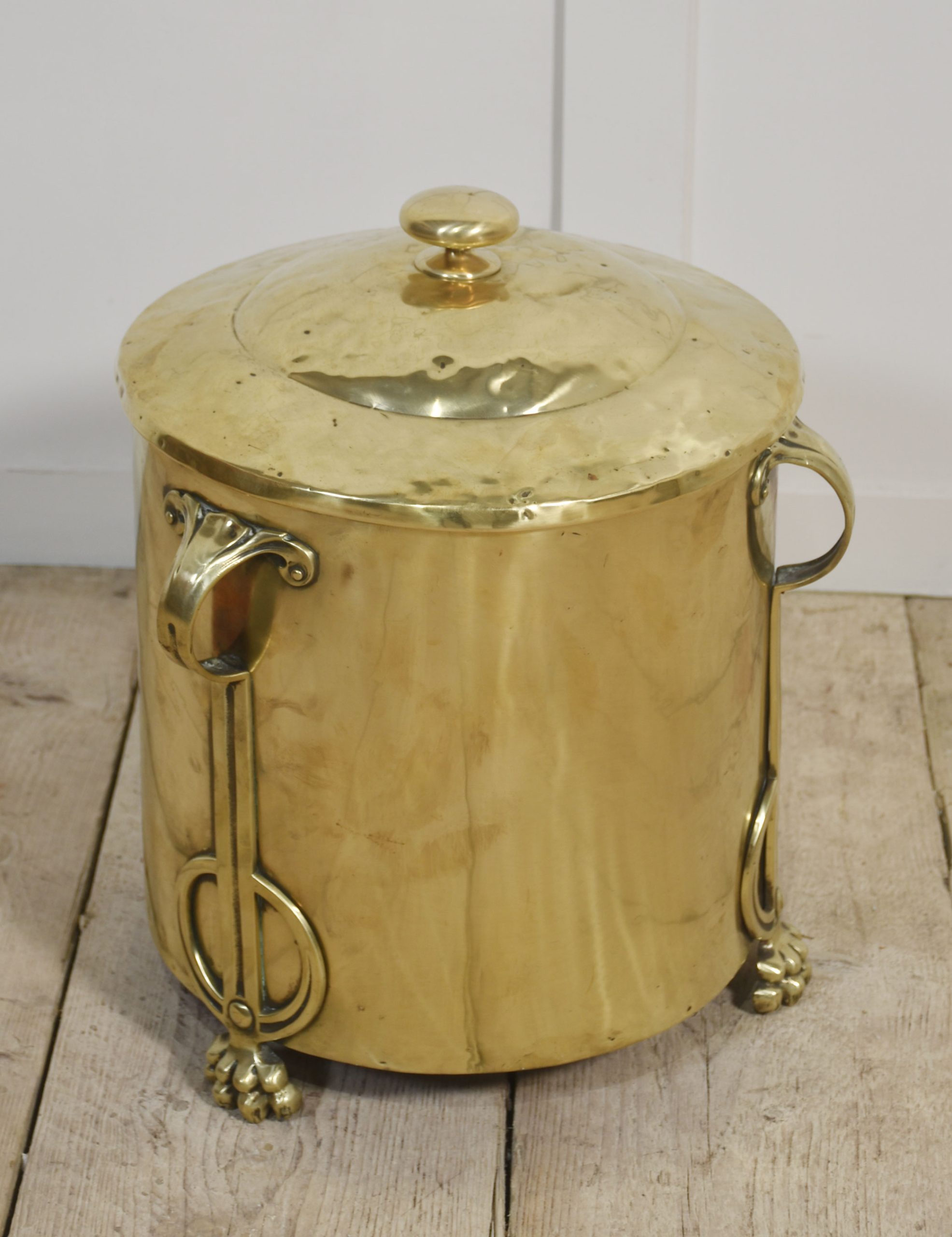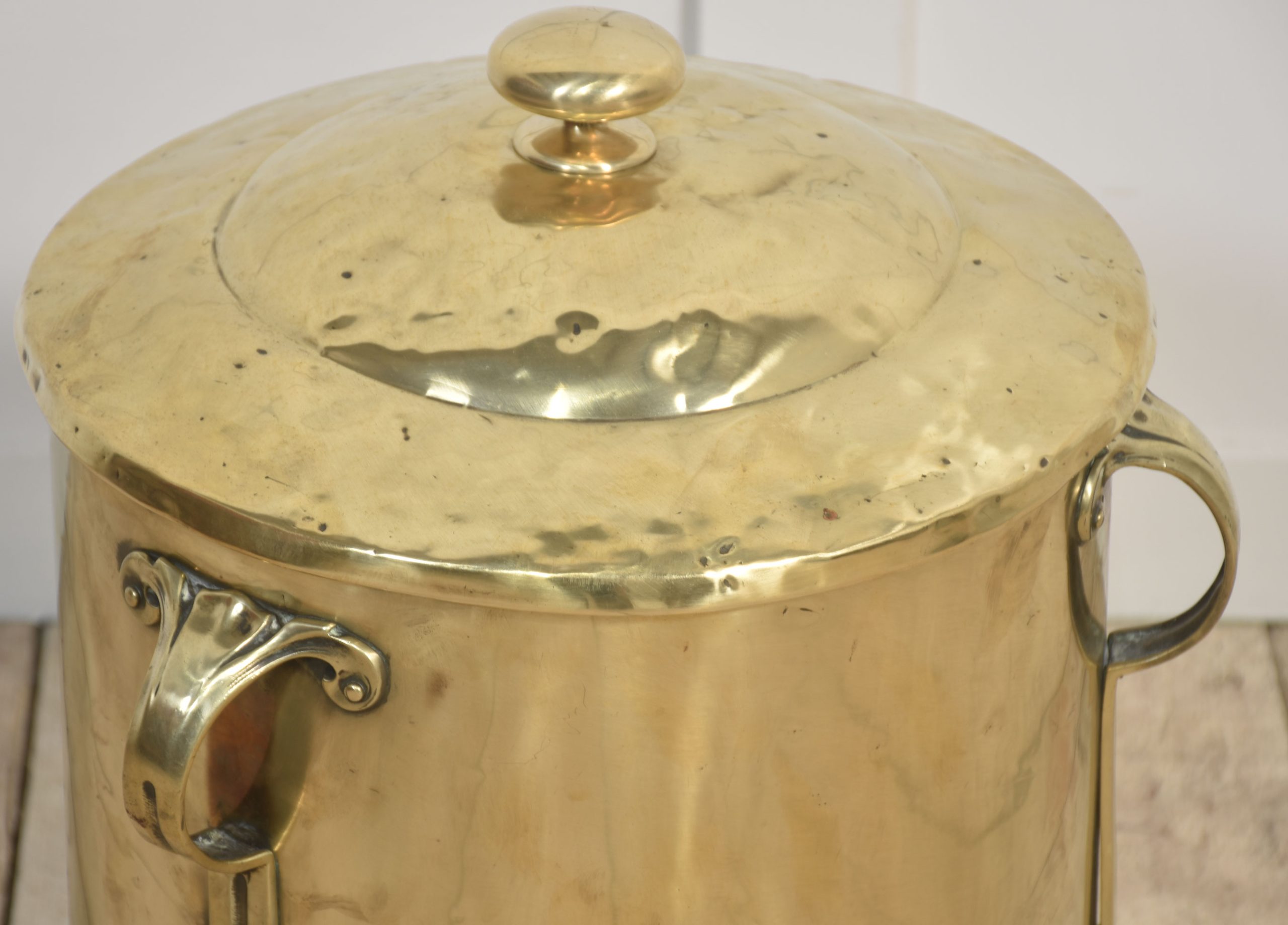 Art Nouveau brass coal bin of cylindrical form, the removable lid opening to reveal the original tin liner. Above three strap-work handles, all raised up on paw feet.