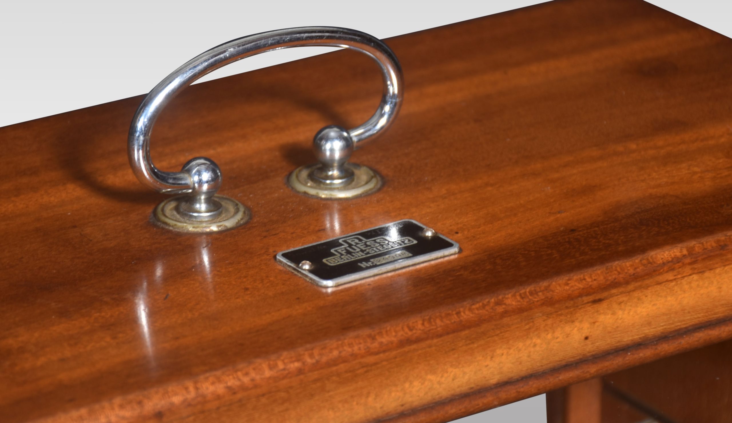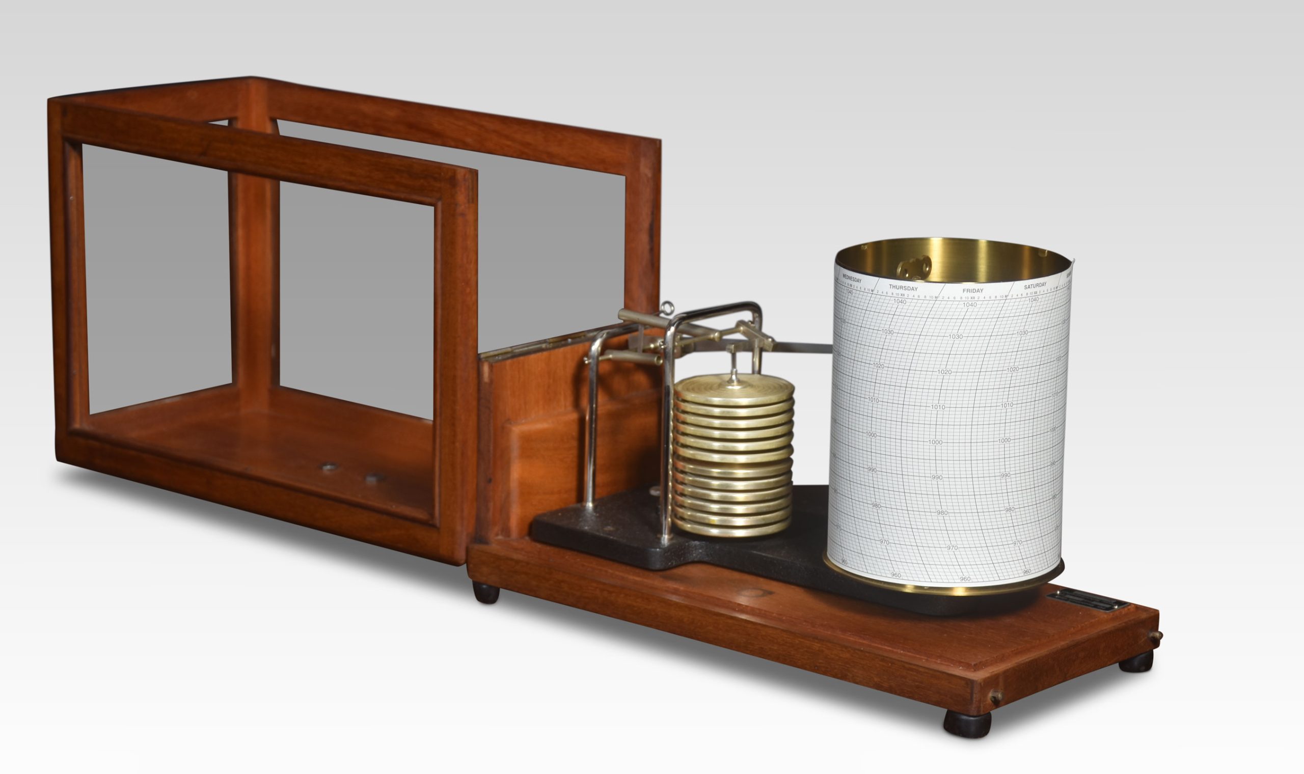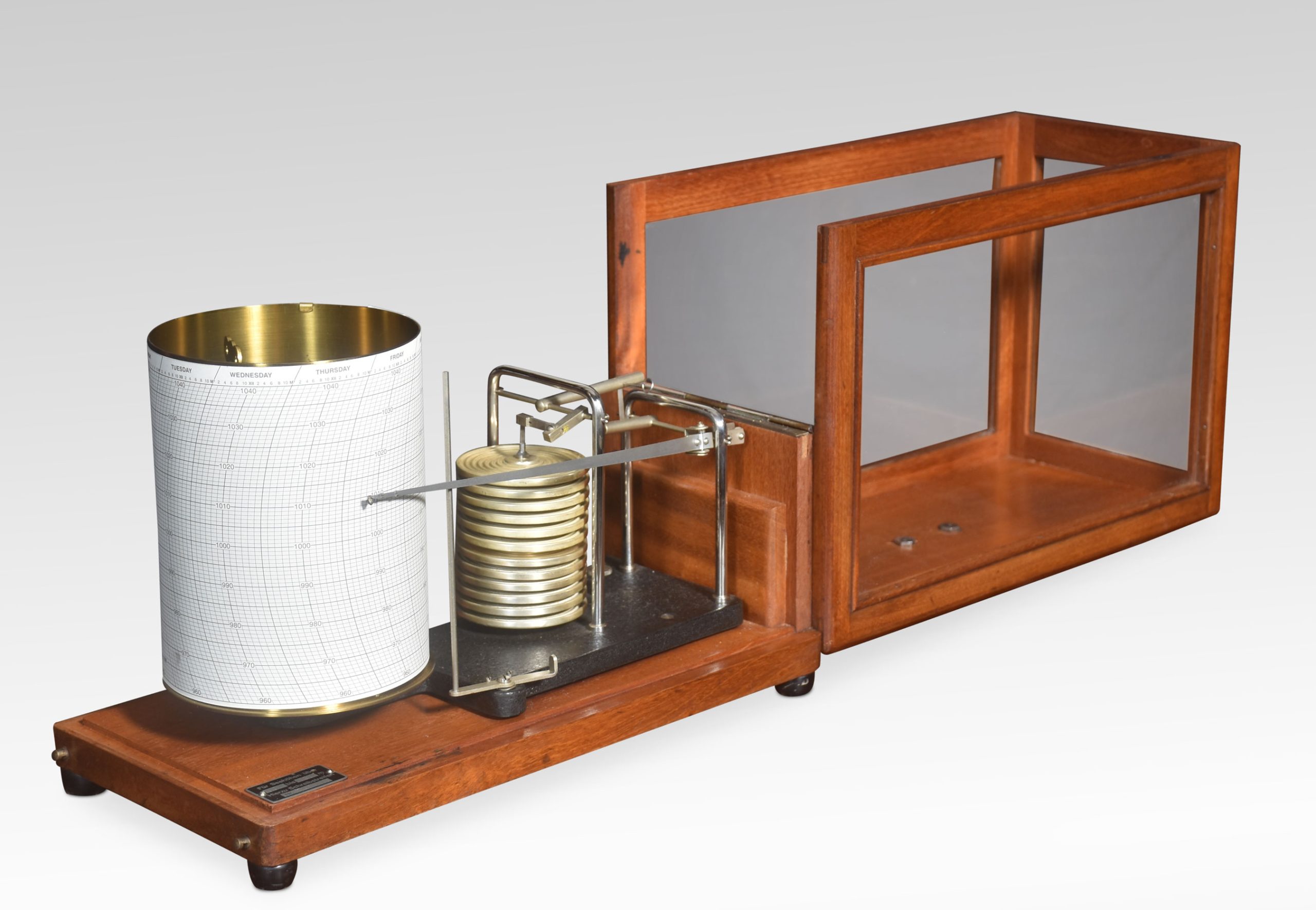 Mahogany cased barograph by R Fuess Berlin. The mechanical eight-day movement is housed in the drum, fitted with a seven-day chart which covers one full rotation of the drum. The ink trace, or barogram, on the recording paper, is a visual record of changes in pressure.