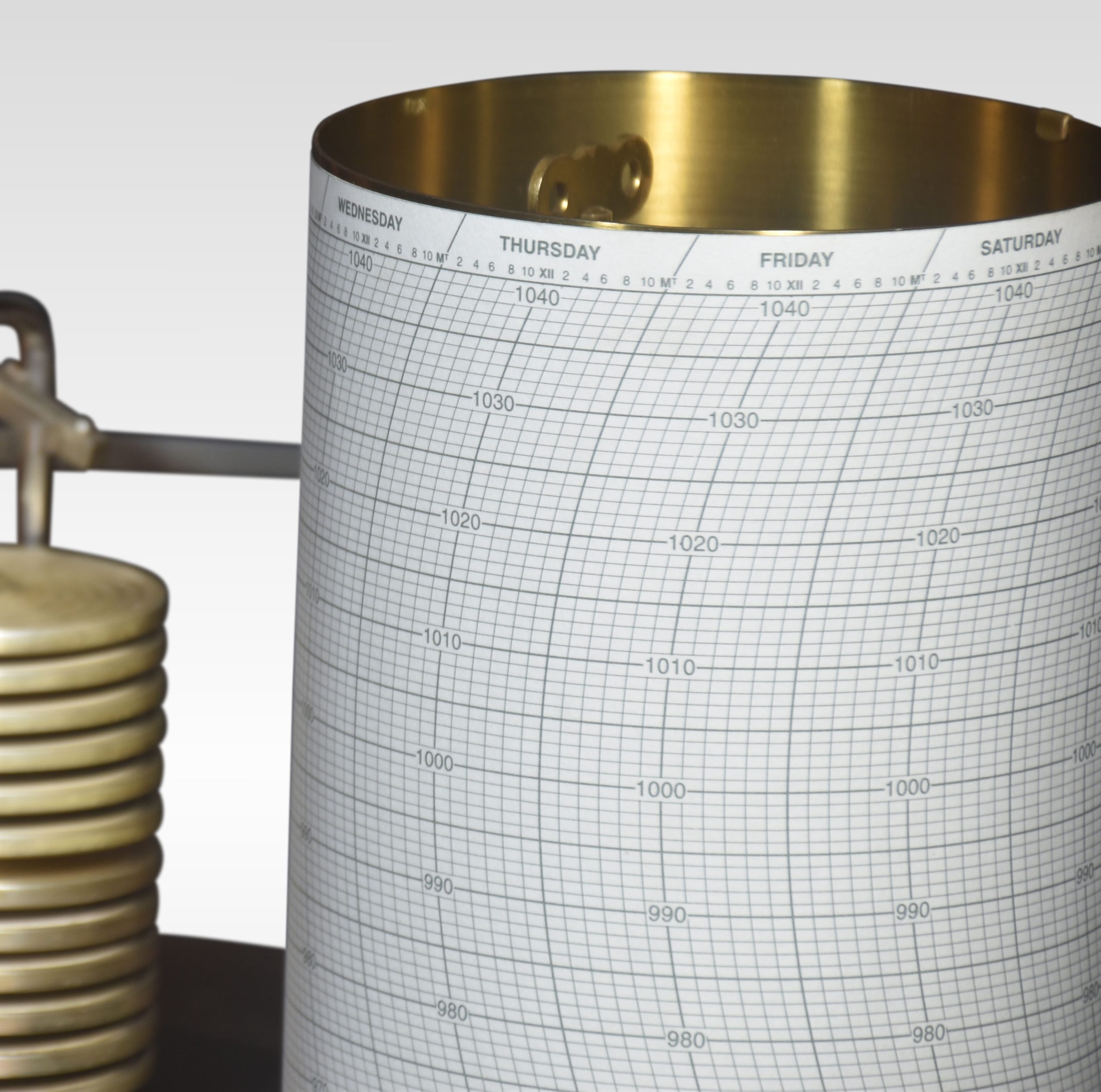 The aneroid barometer mechanism has twelve stacked vacuum capsules and utilises a gate suspension, a refinement developed to improve sensitivity. The barograph with hinged lid with a silvered carry handle.