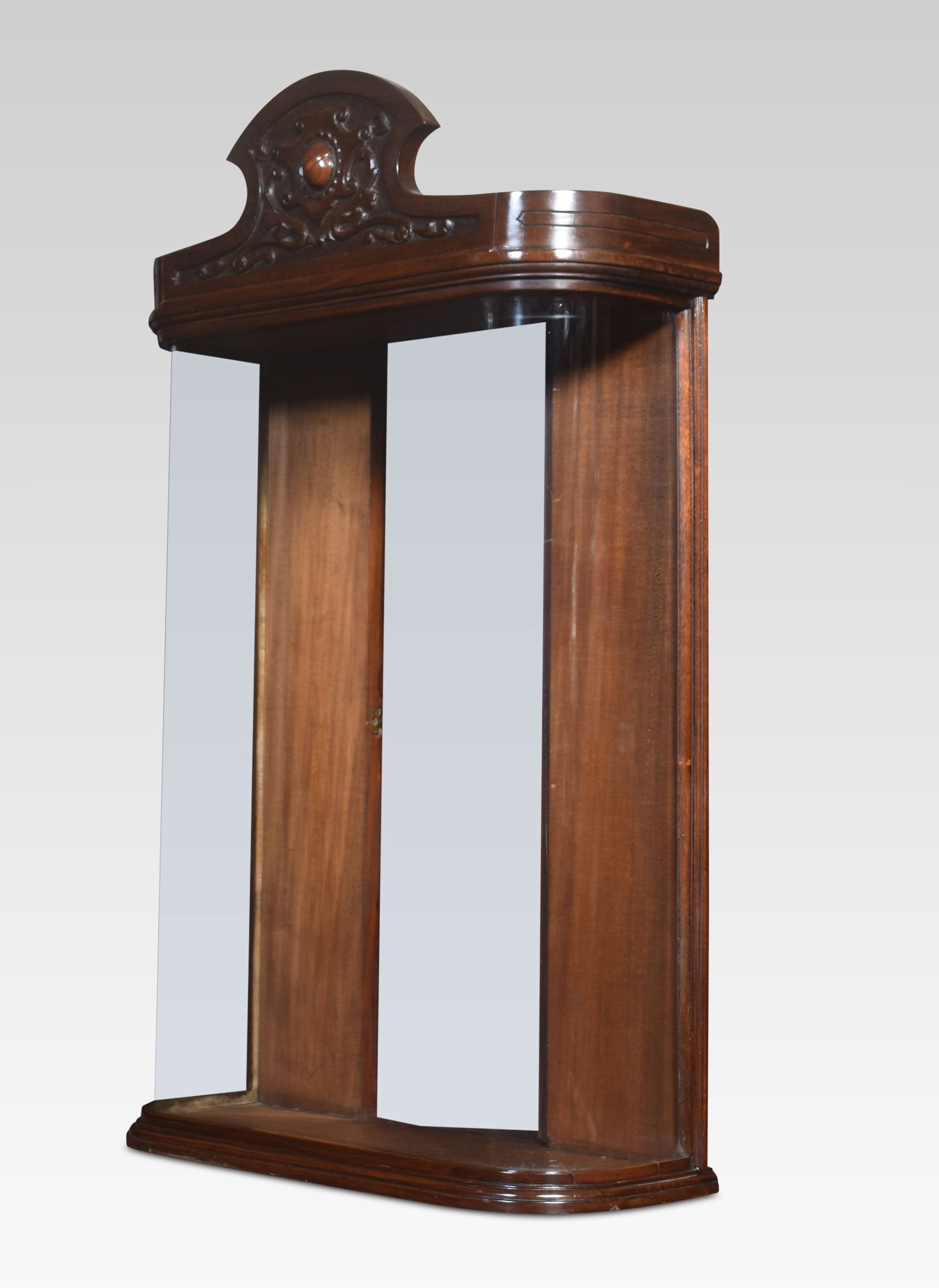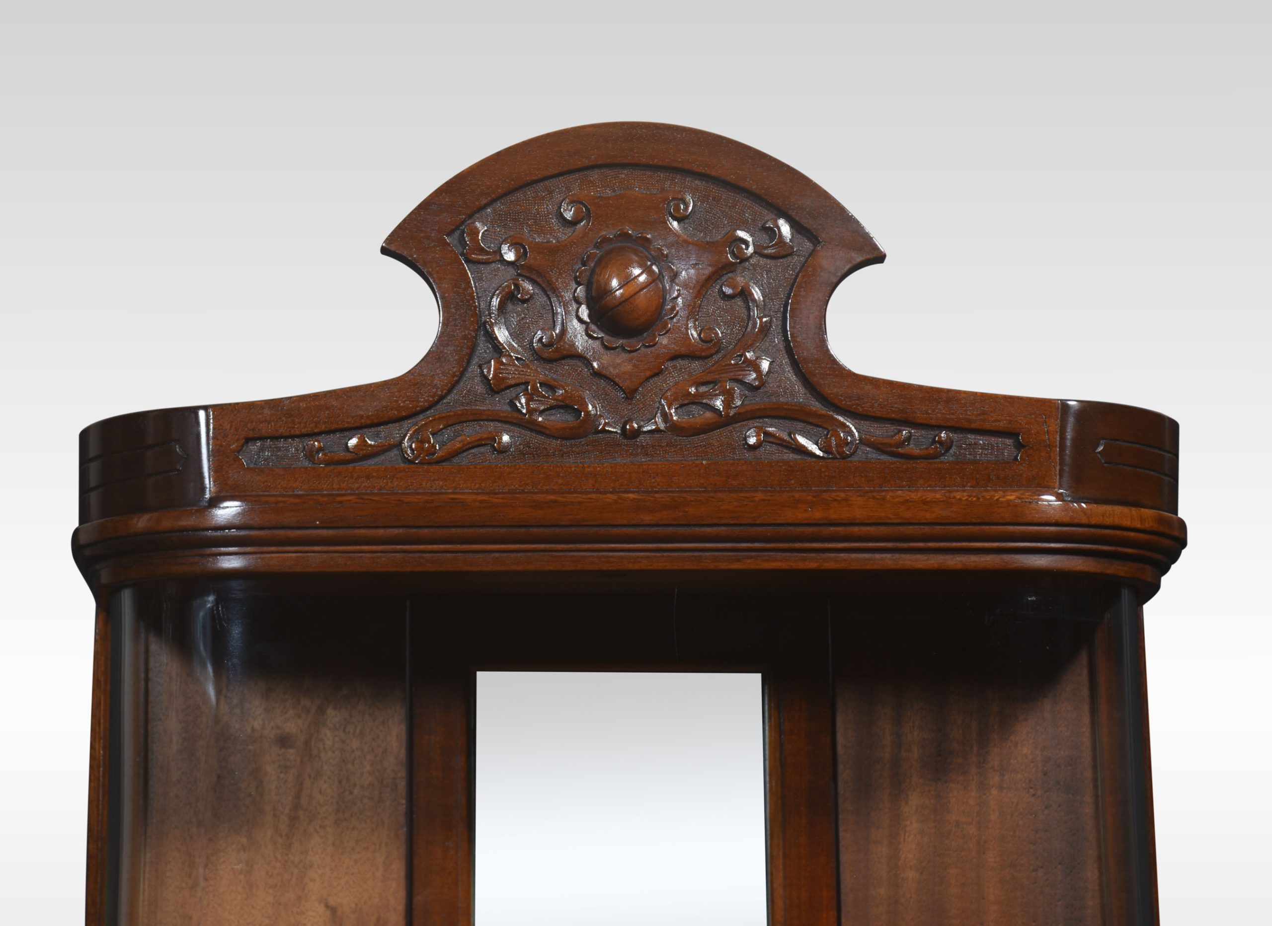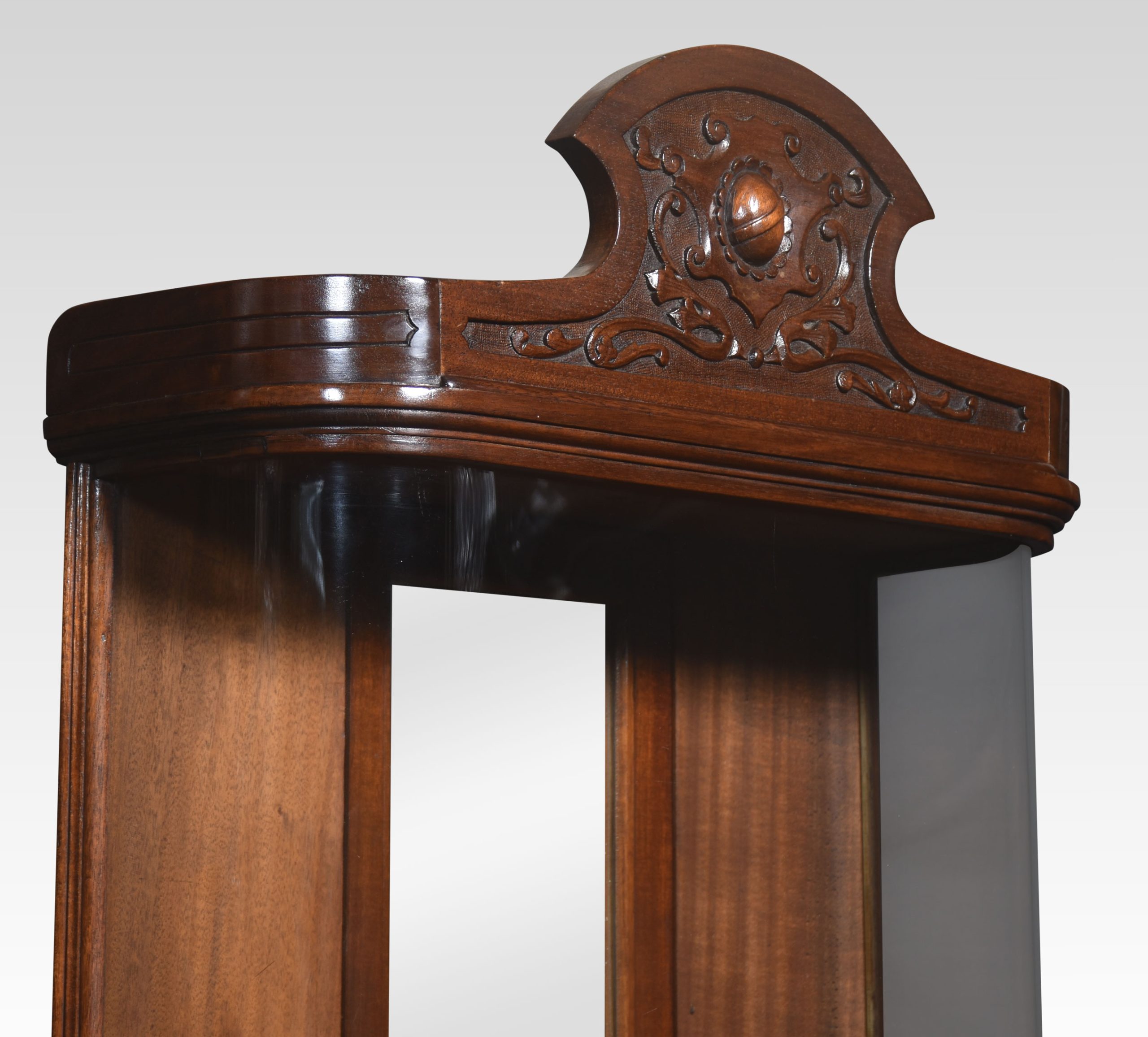 Bow-fronted glass cabinet the shaped top with carved detail above bow-fronted glazed display case with mirrored door to the rear, all raised up on a plinth base.