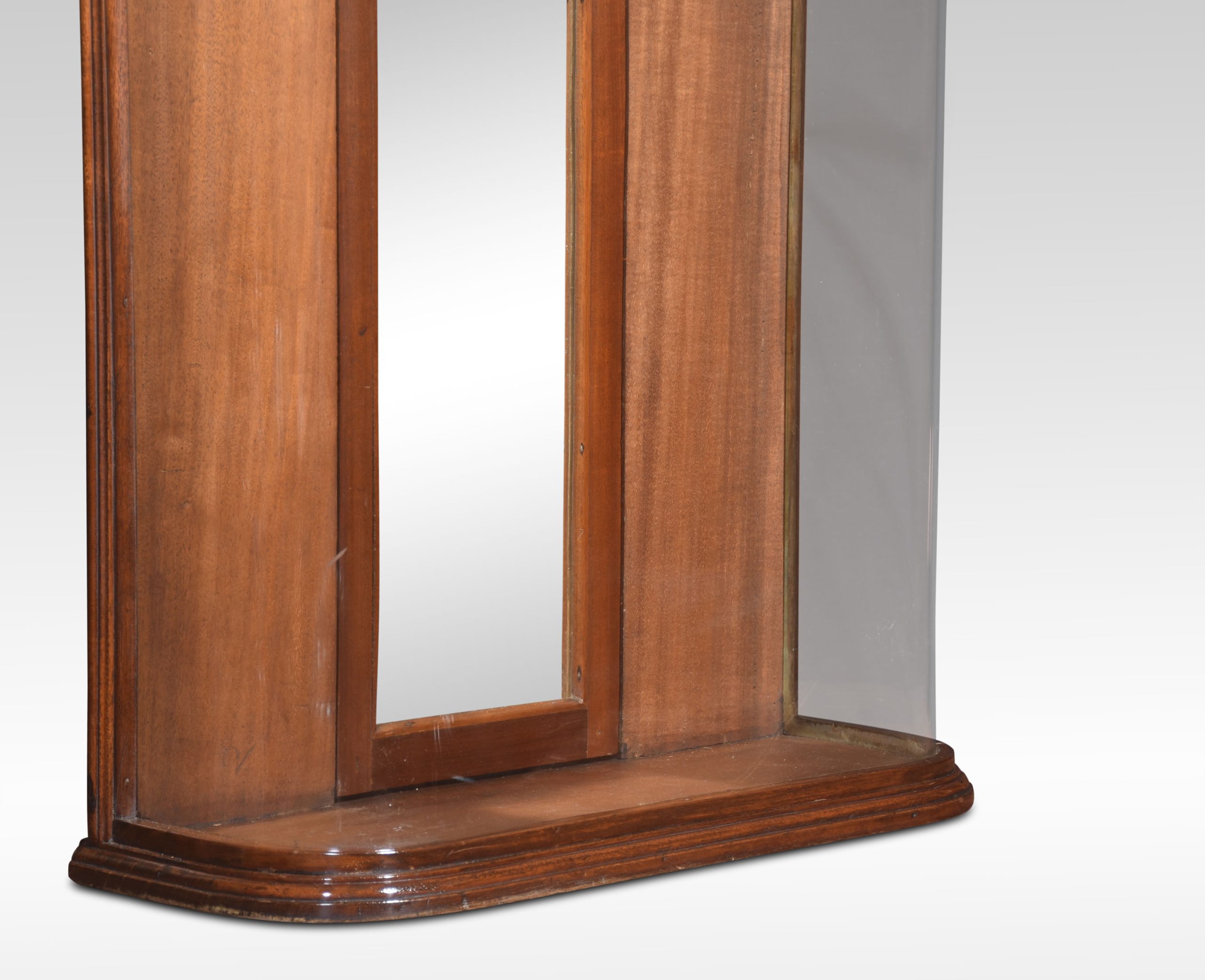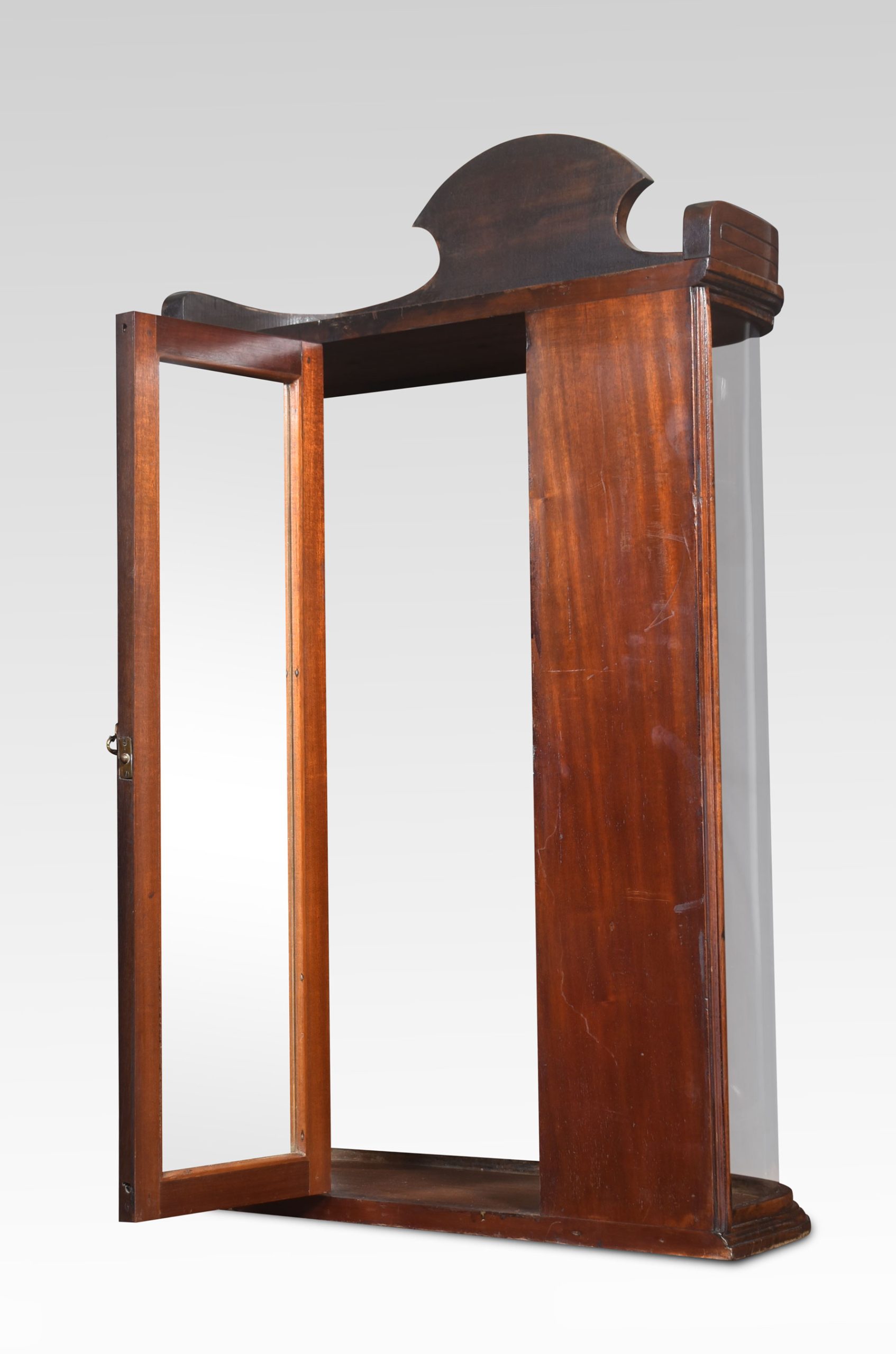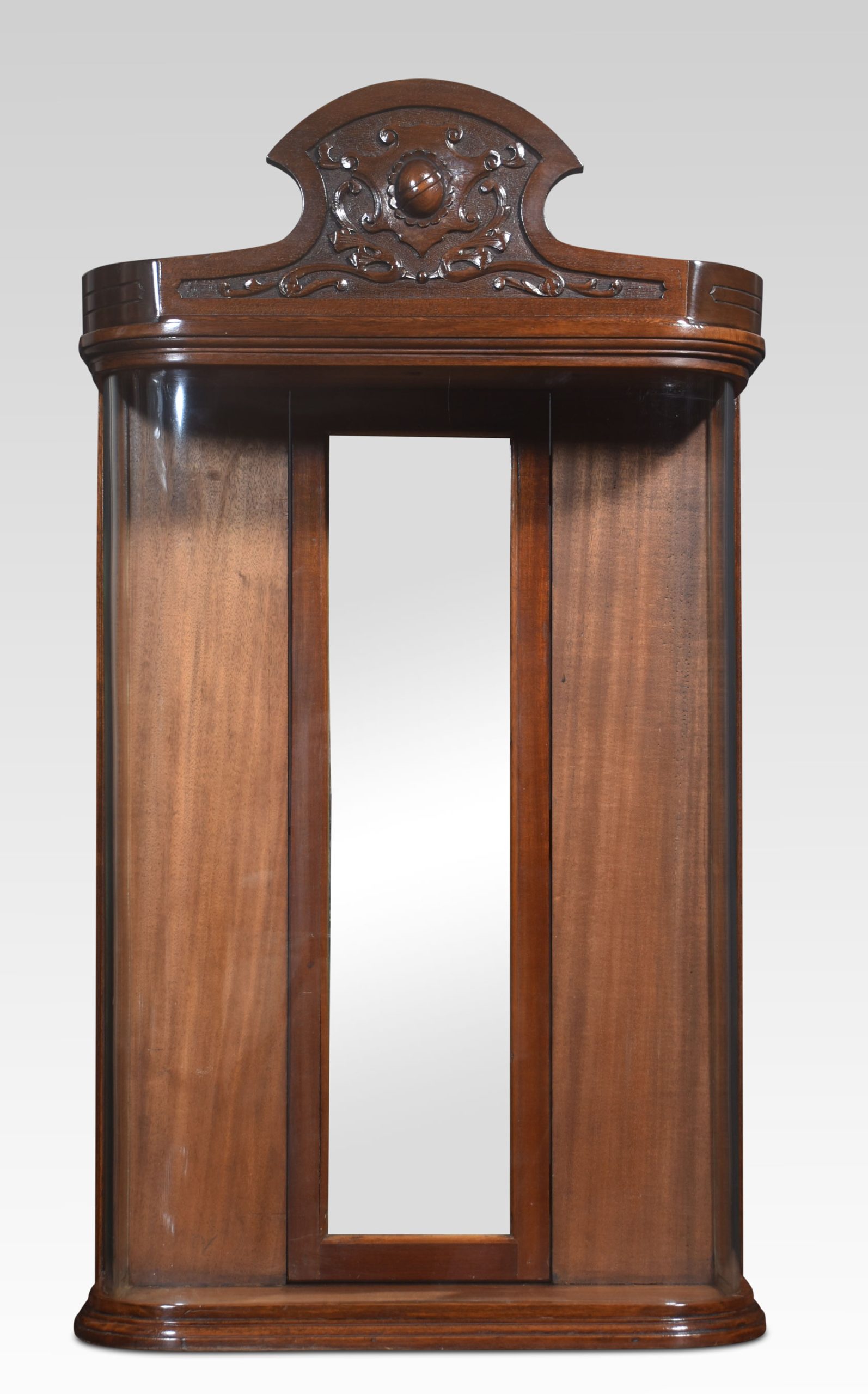 Bow-fronted glass cabinet the shaped top with carved detail above bow-fronted glazed display case with mirrored door to the rear, all raised up on a plinth base.