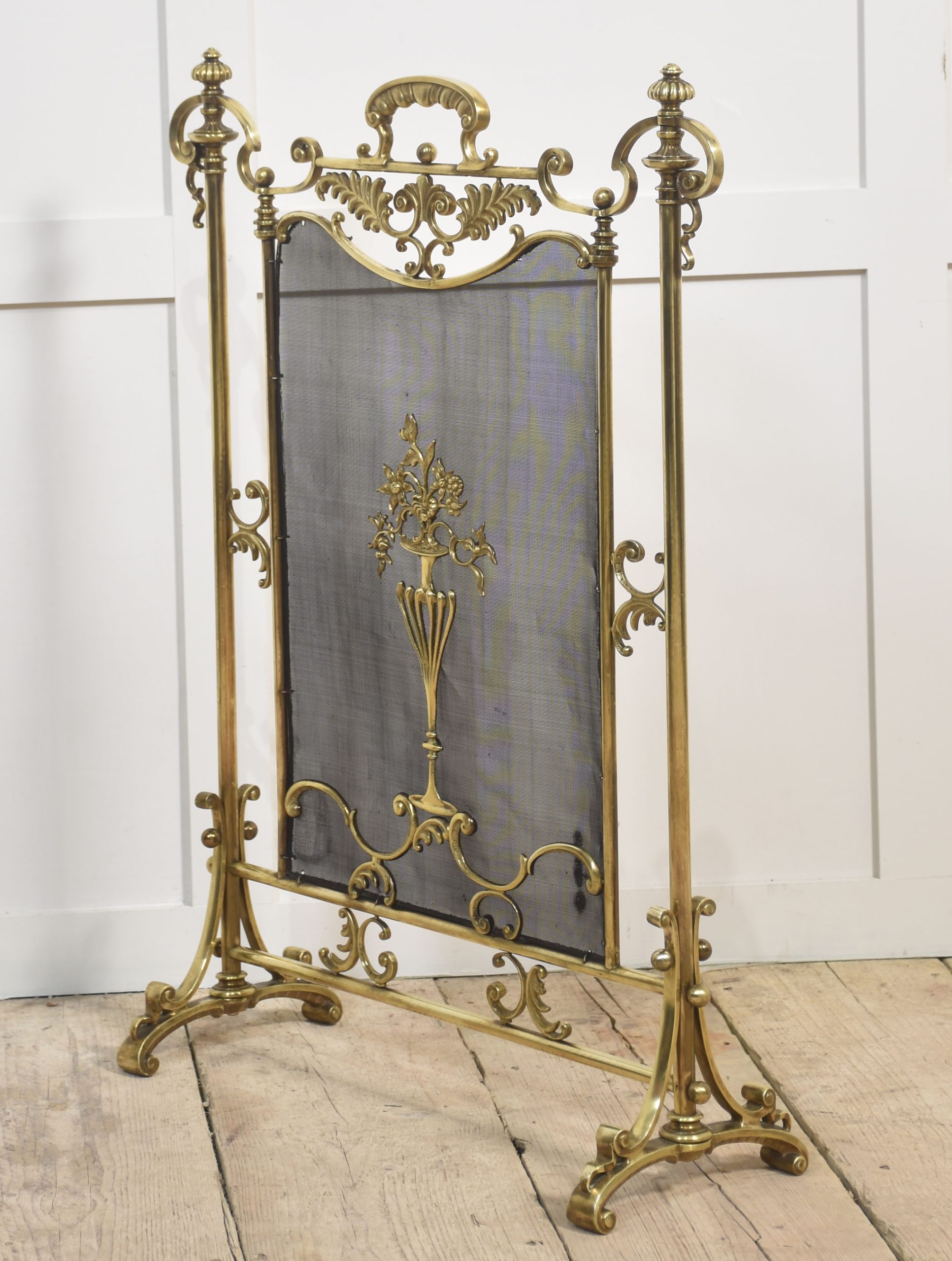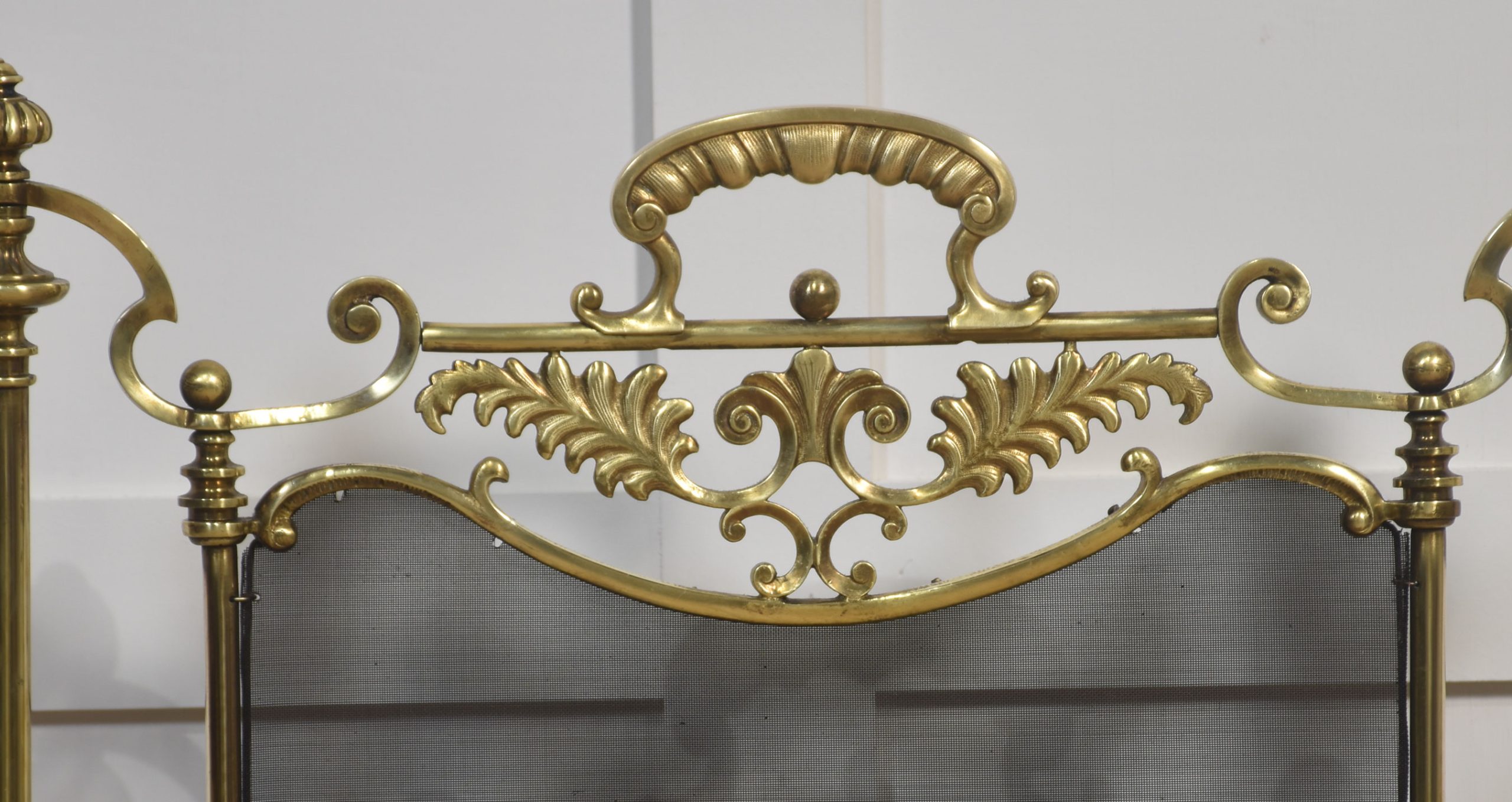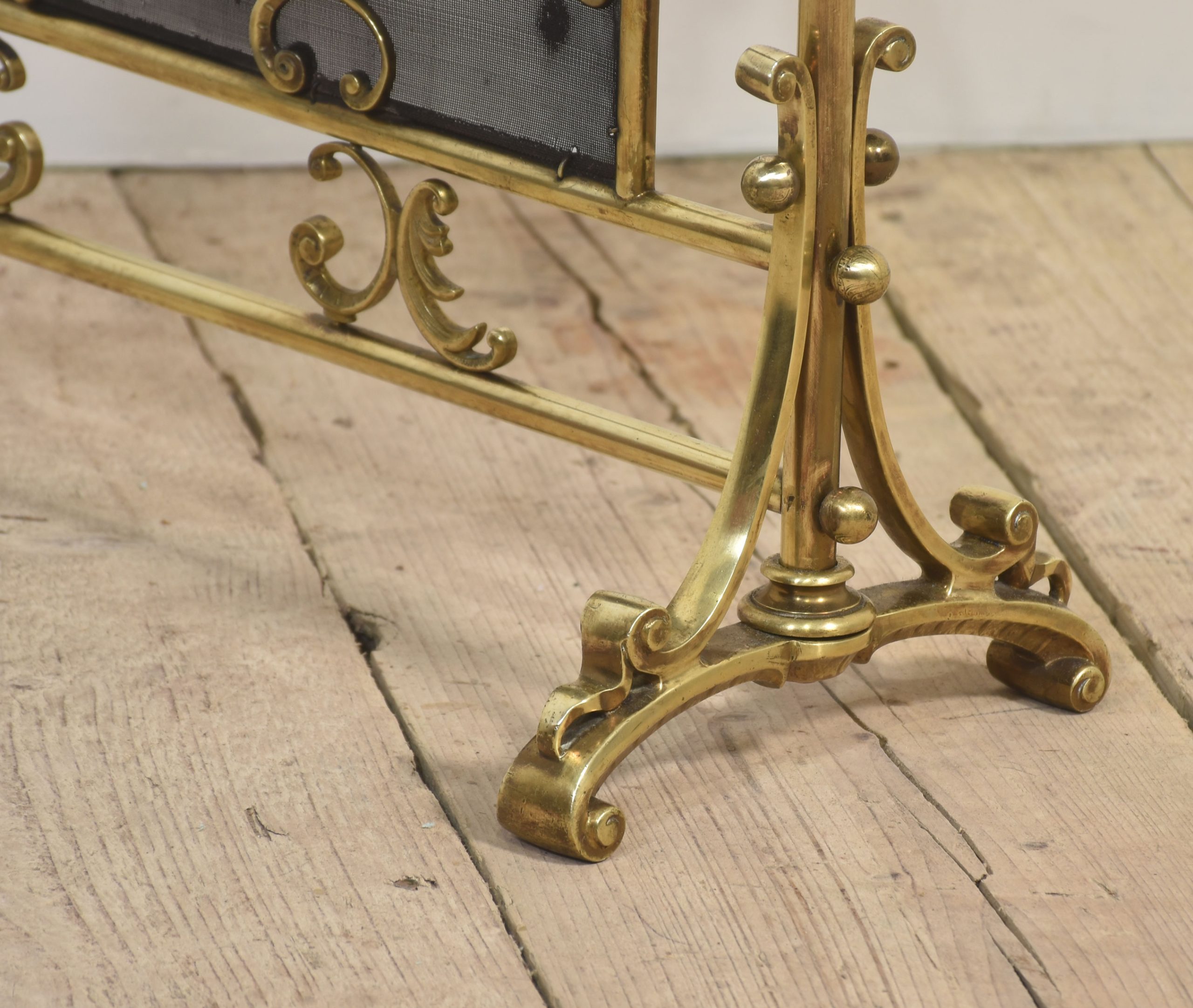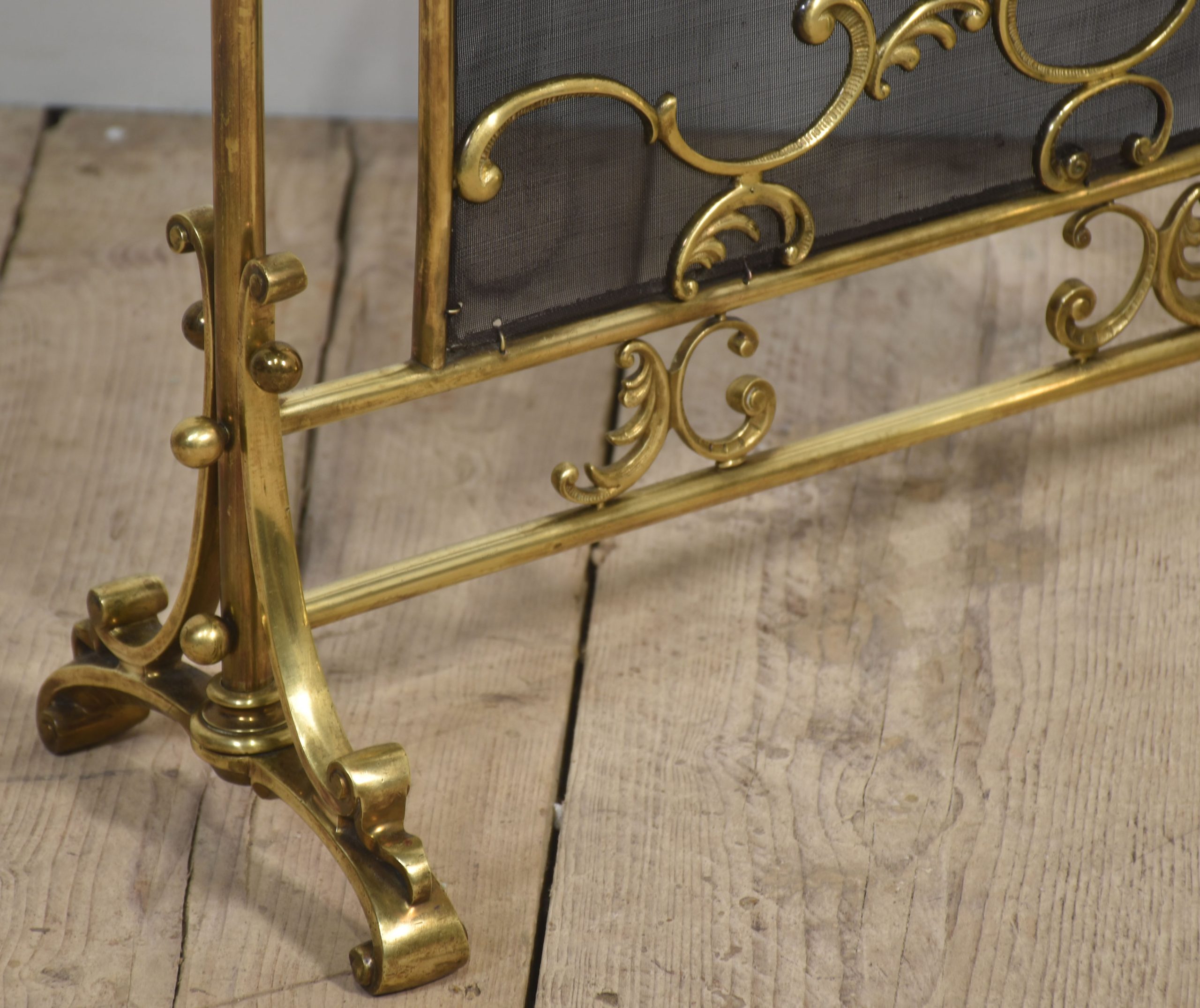 Brass fire screen the turned finials above the large central mesh screen with a scrolling foliate design. All raised on shaped supports.