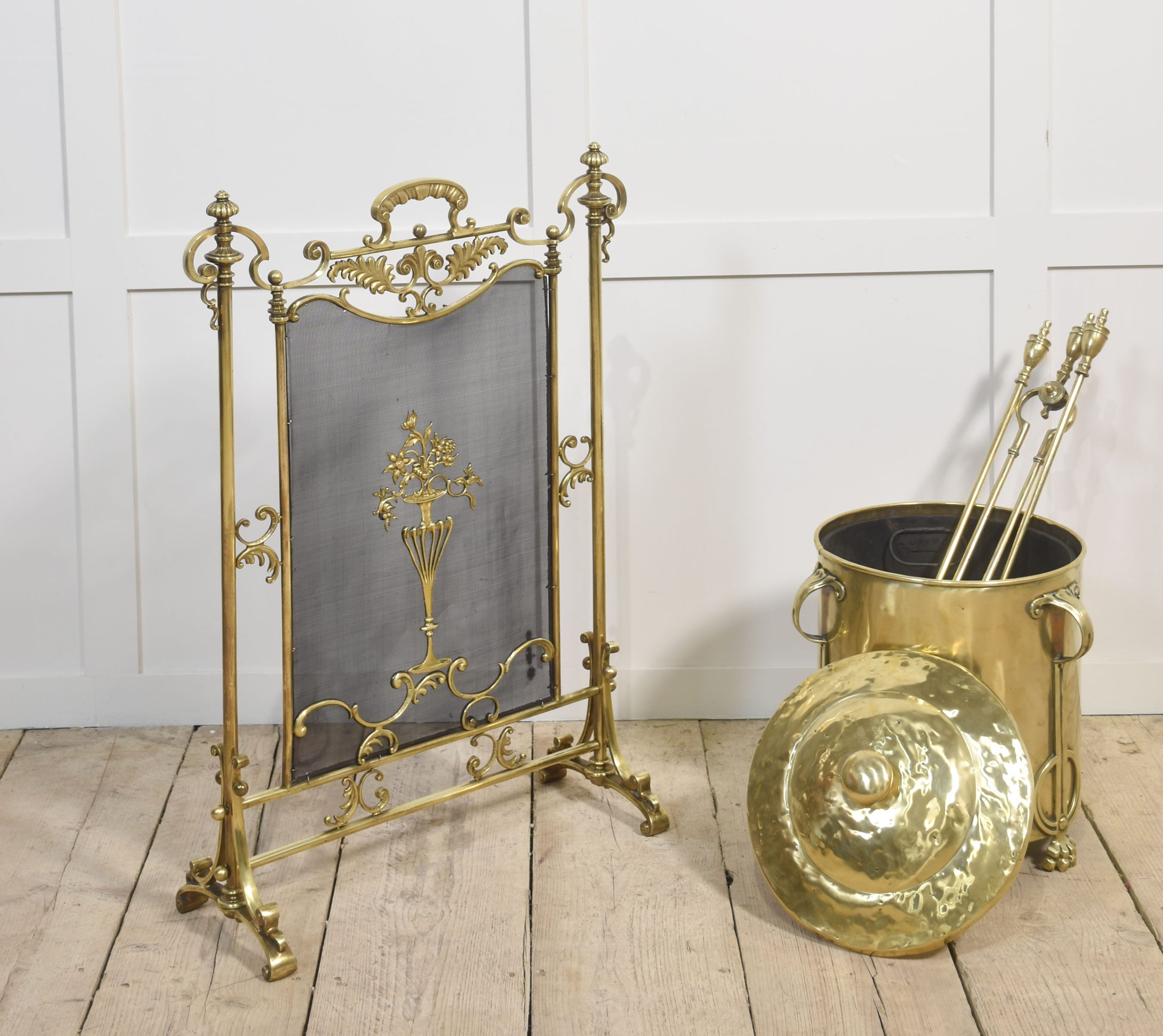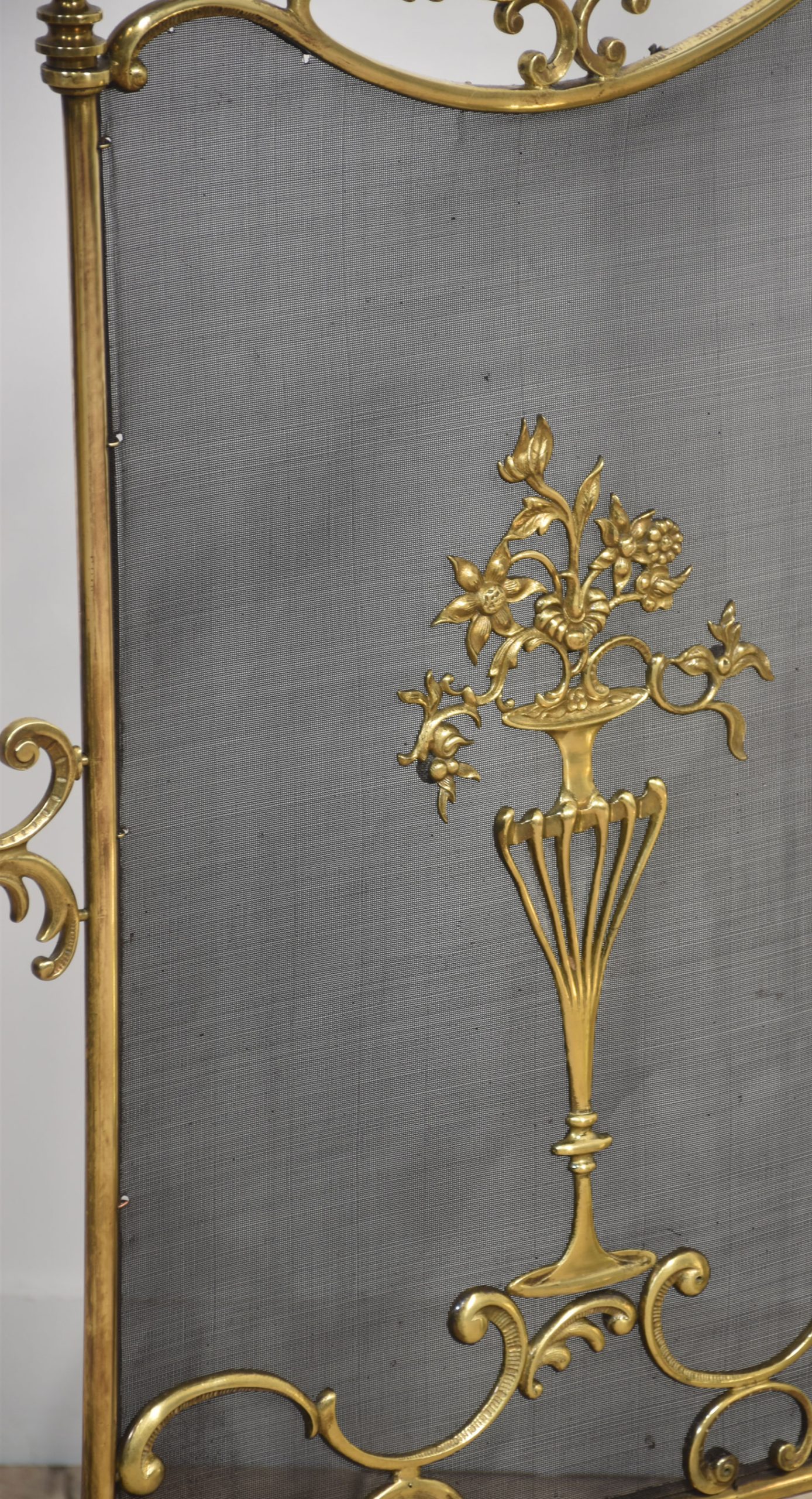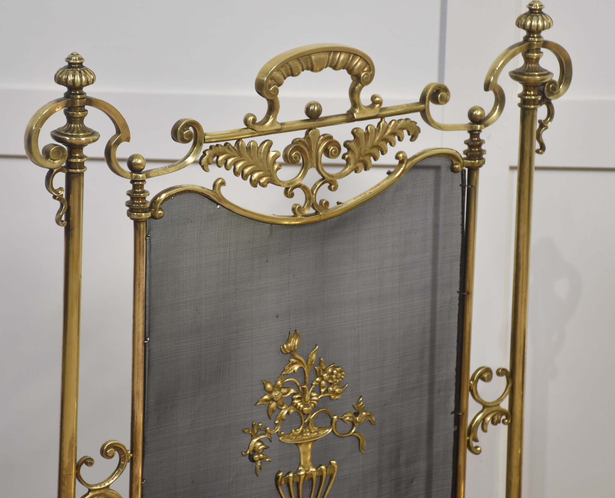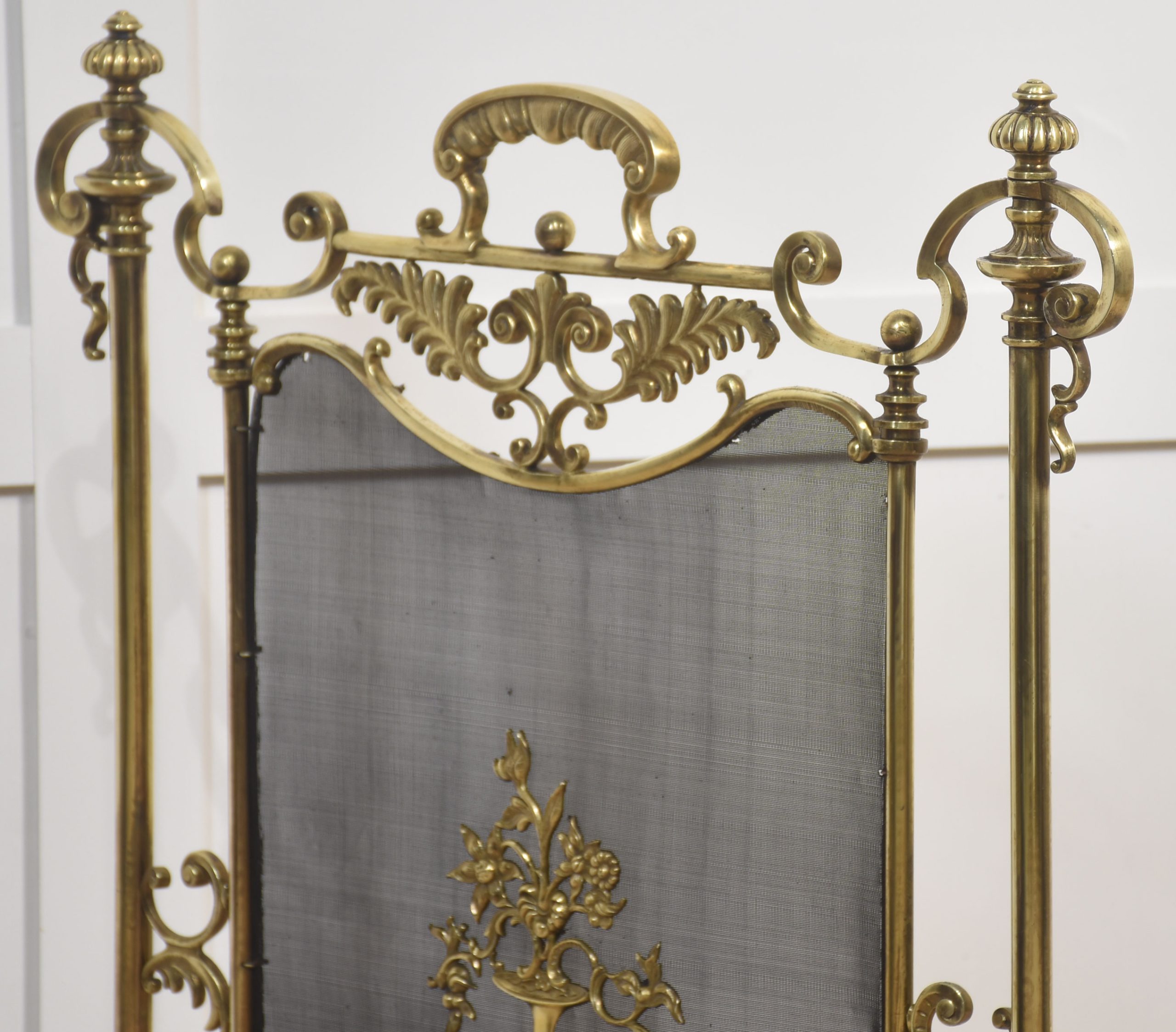 Brass fire screen the turned finials above the large central mesh screen with a scrolling foliate design. All raised on shaped supports.
