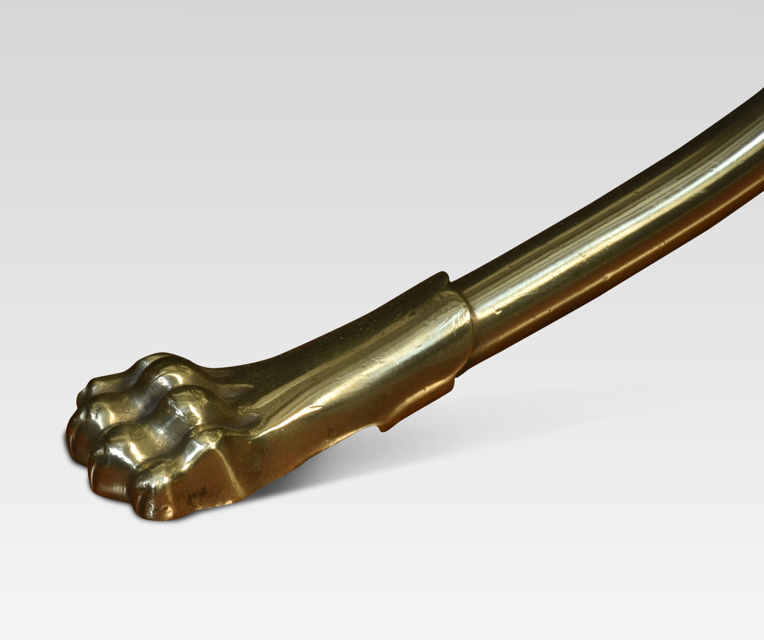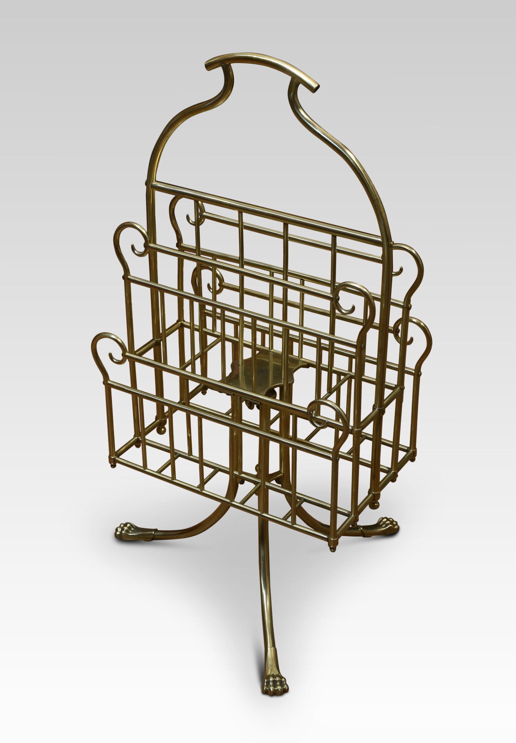 Brass music / magazine rack with scrolled and railed divisions, on three out splayed supports termanating in paw feet.