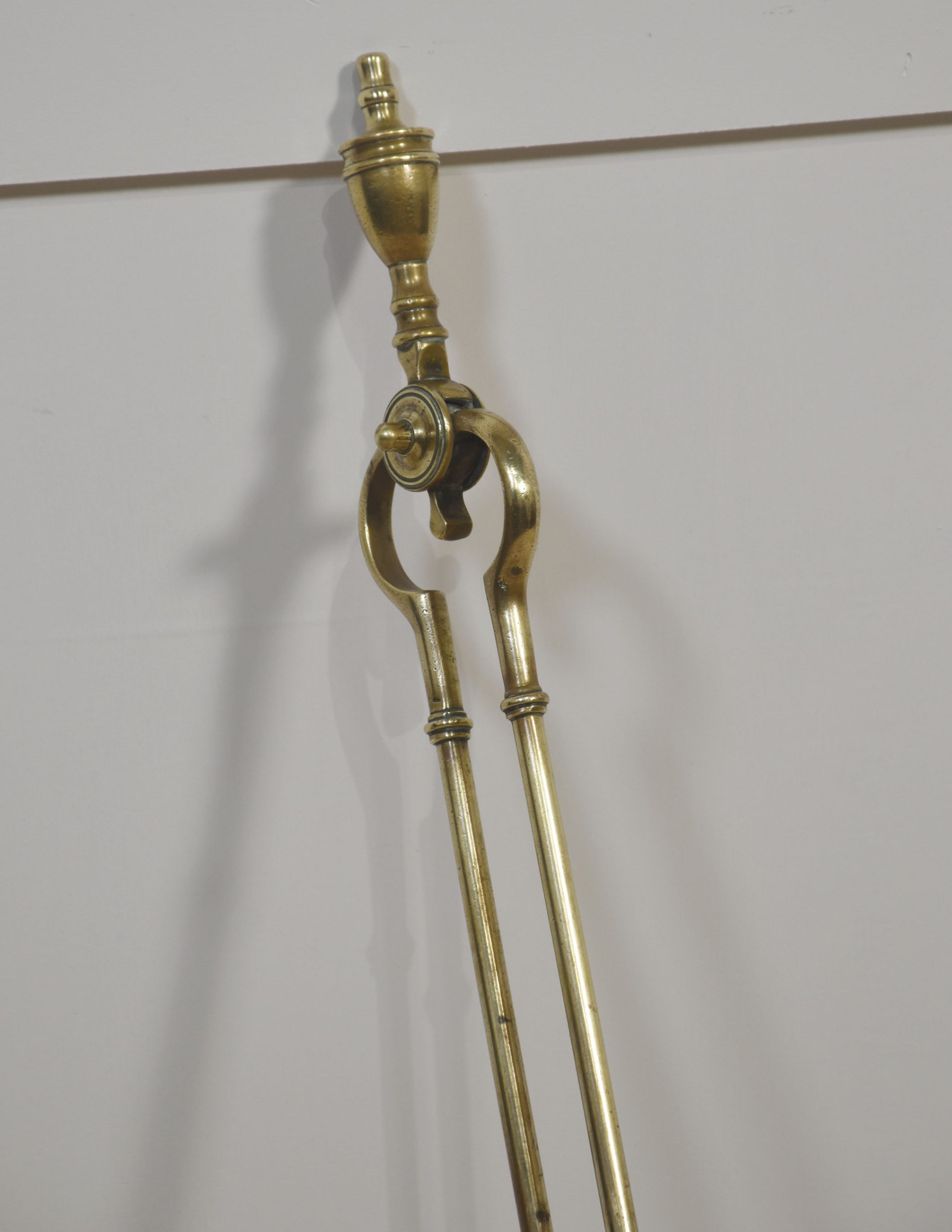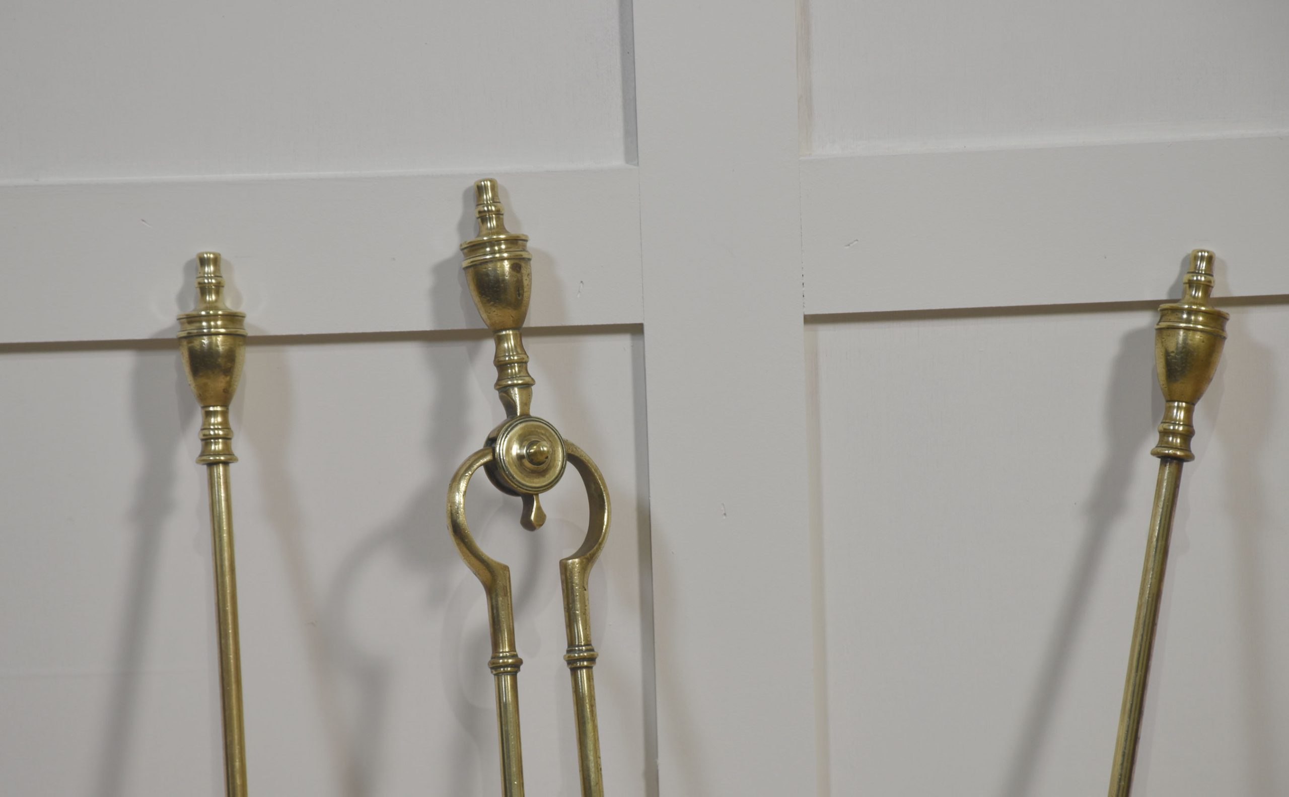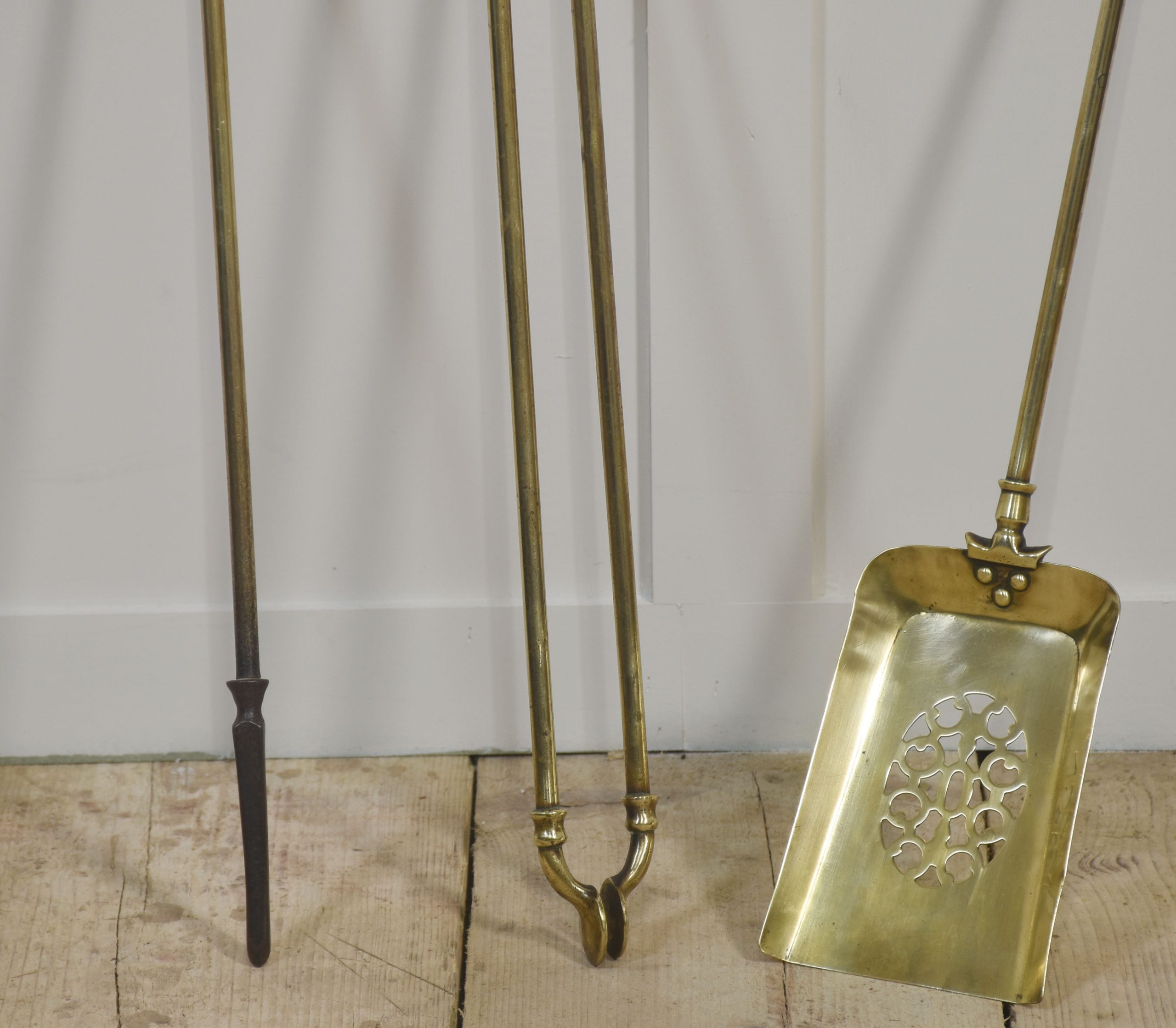 Set of three brass fire tools, consisting of poker, tongs and shovel with well-casted handles.