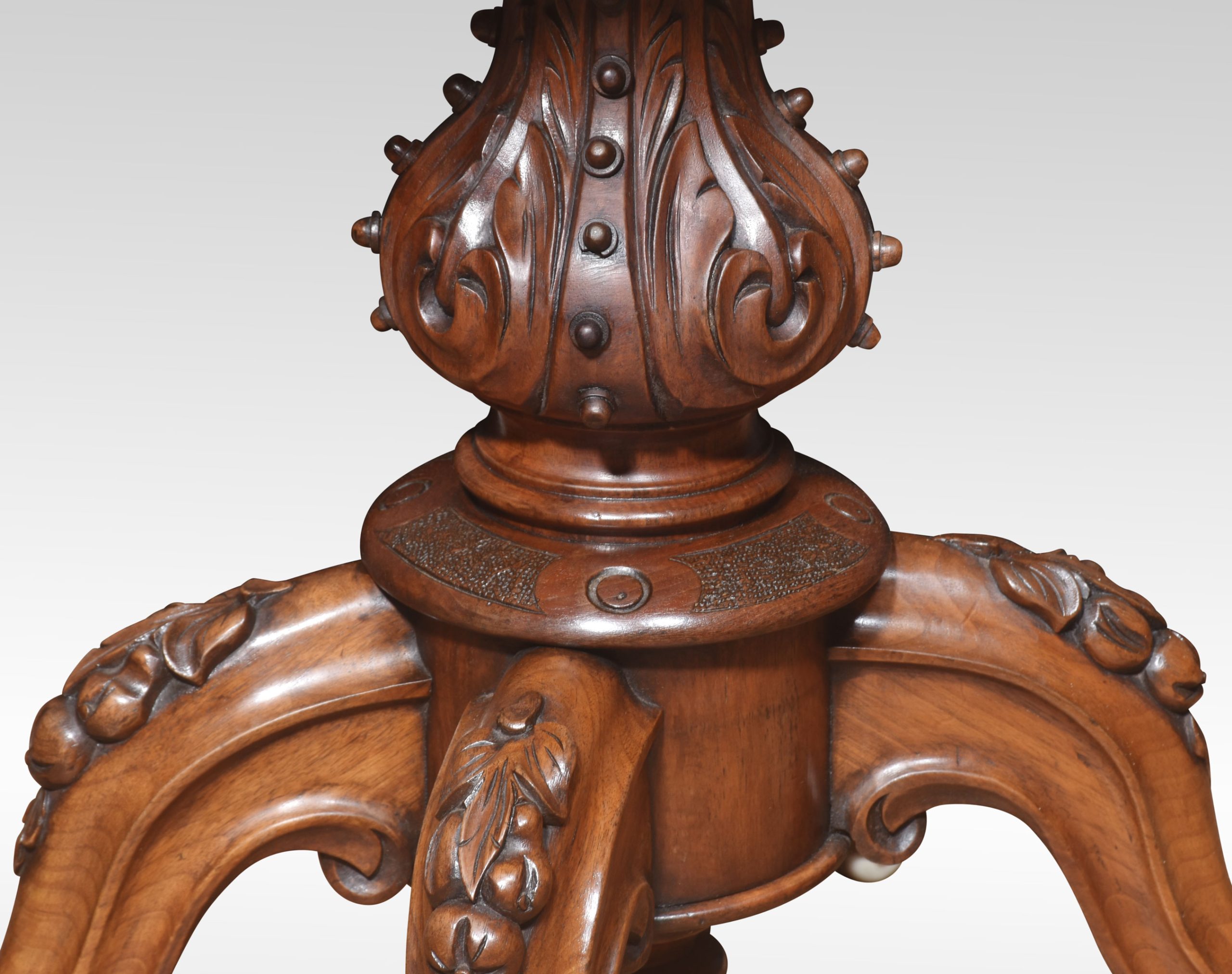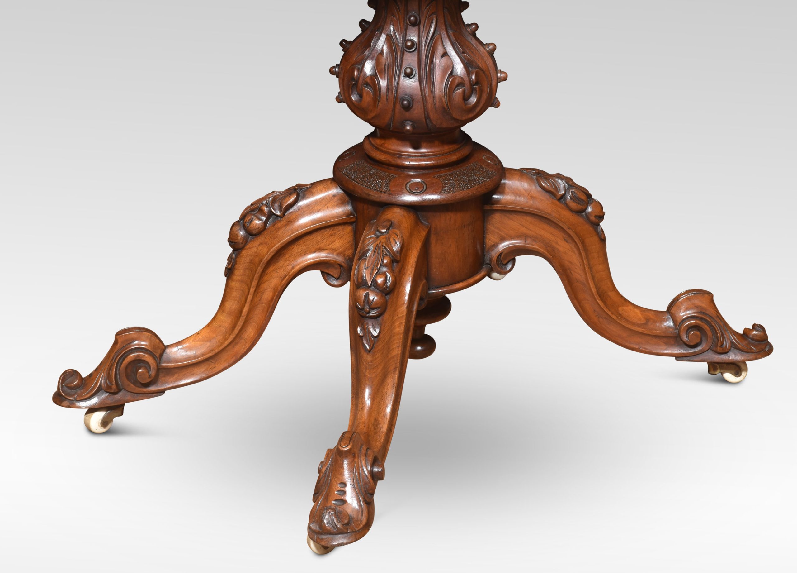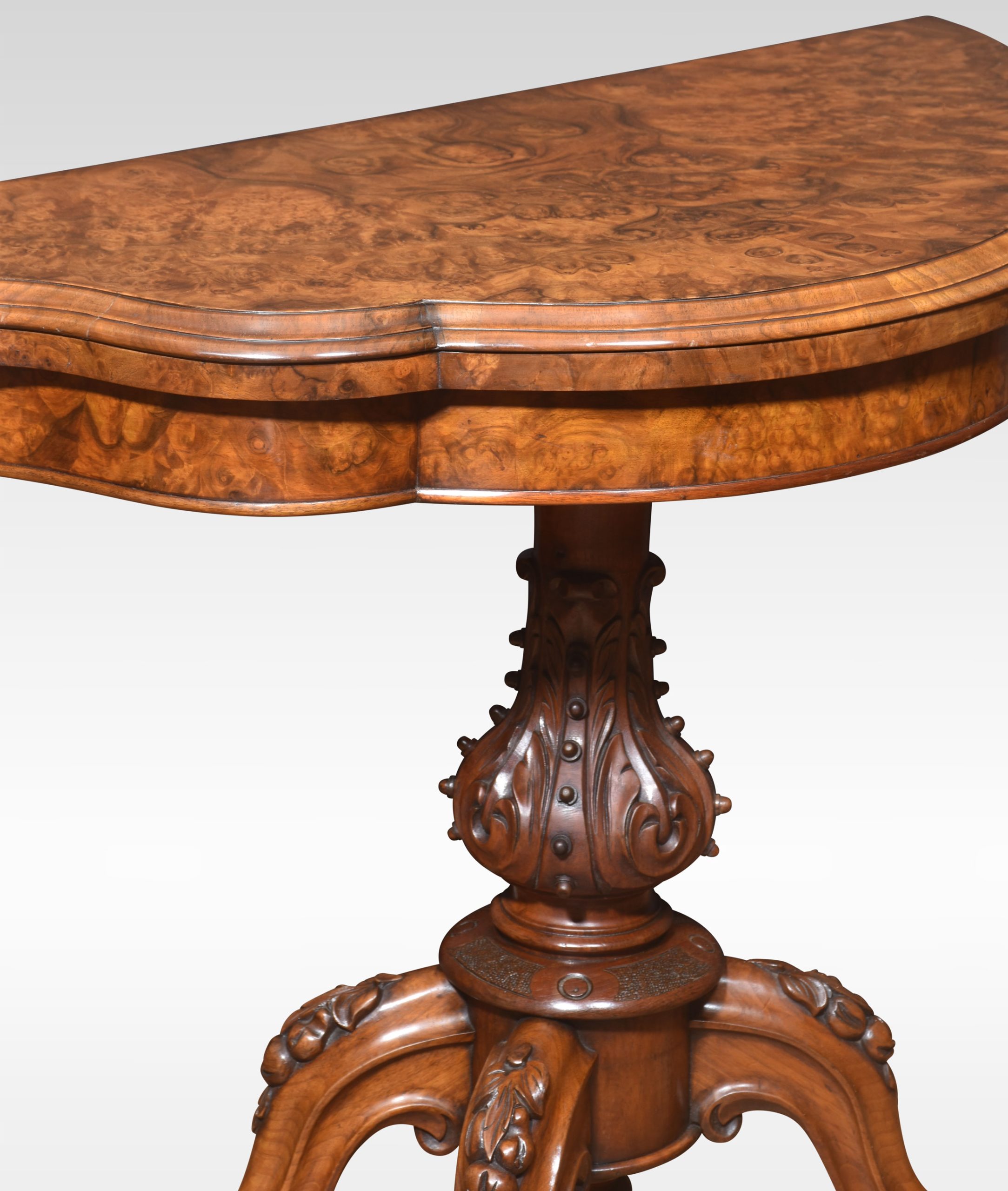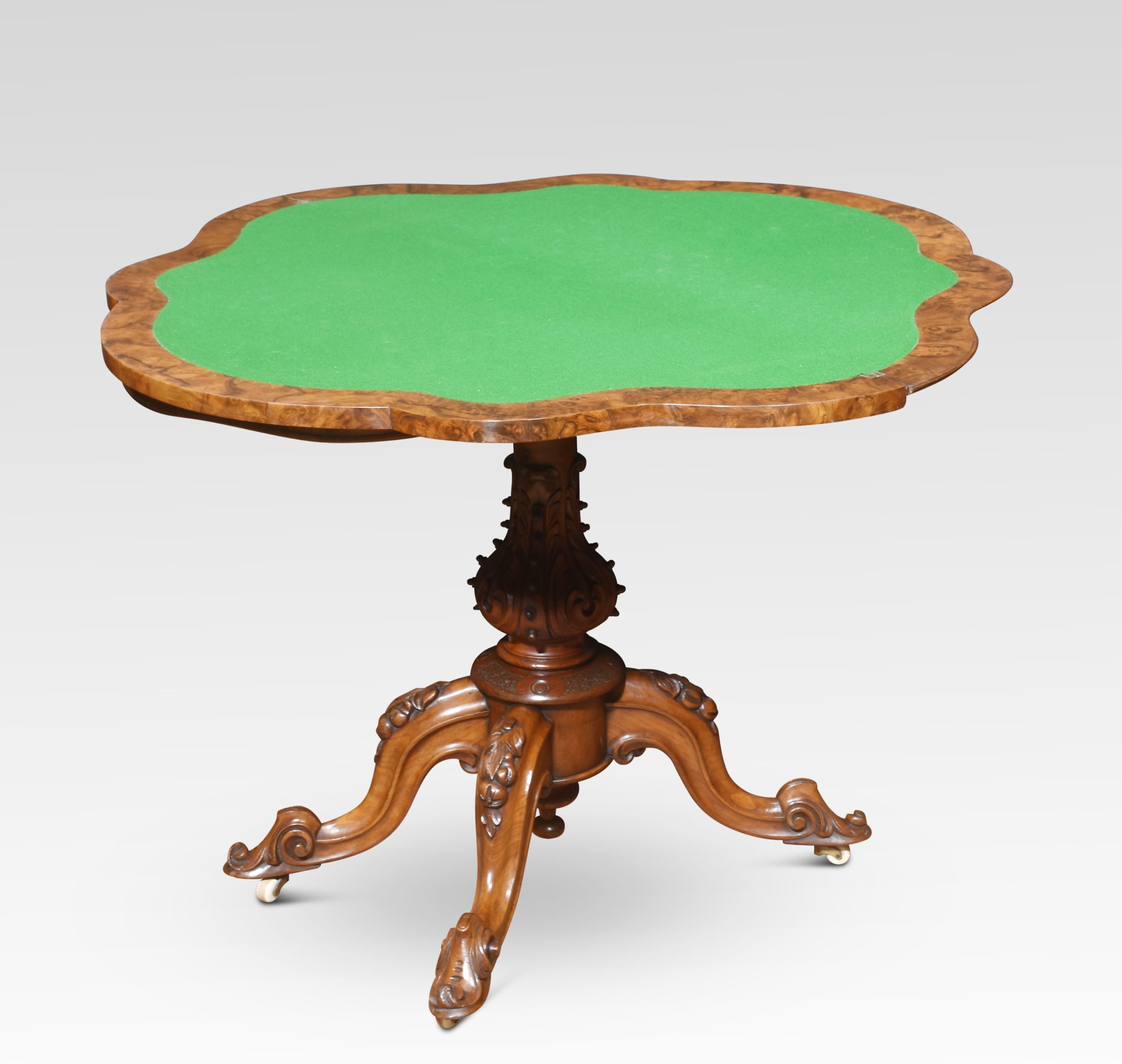 Walnut serpentine front card table. The folding and swivel burr walnut top opening to reveal an inset baize-lined interior with tooled border. Raised up on a turned and carved stem and conforming scroll legs to the original ceramic castors.