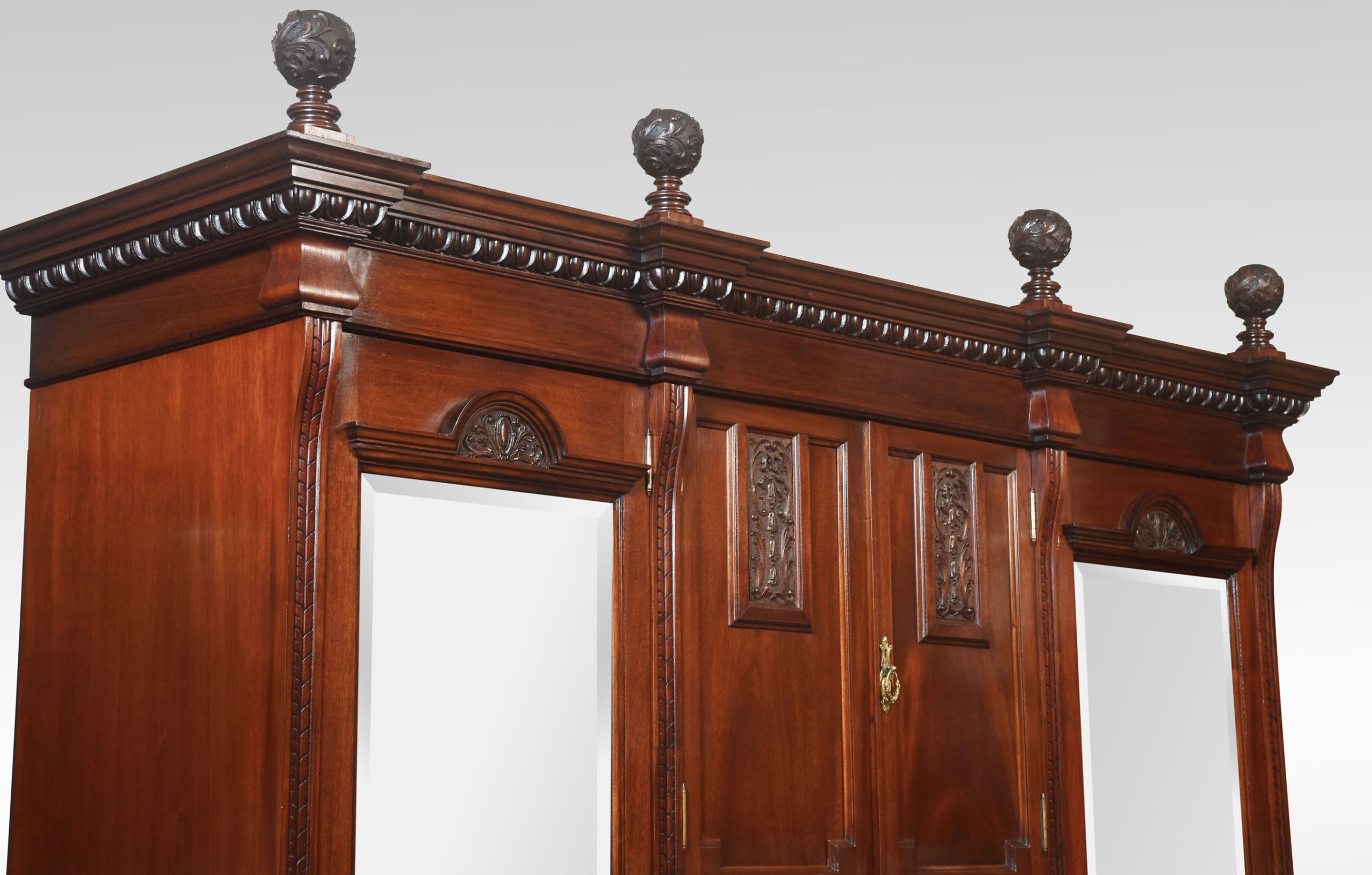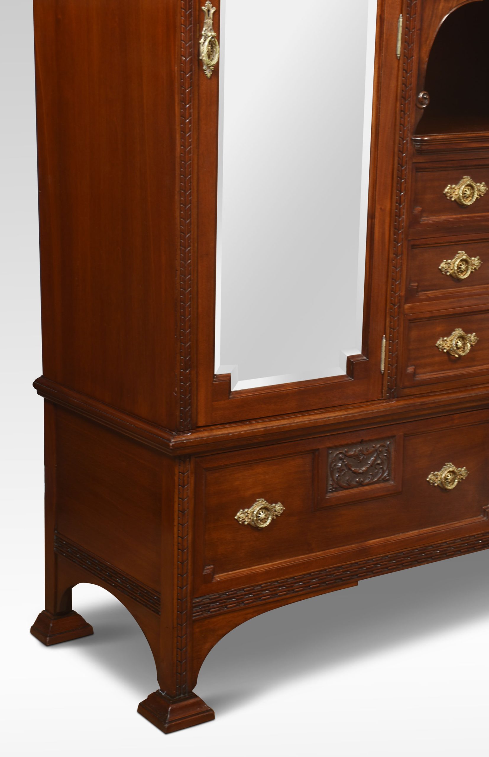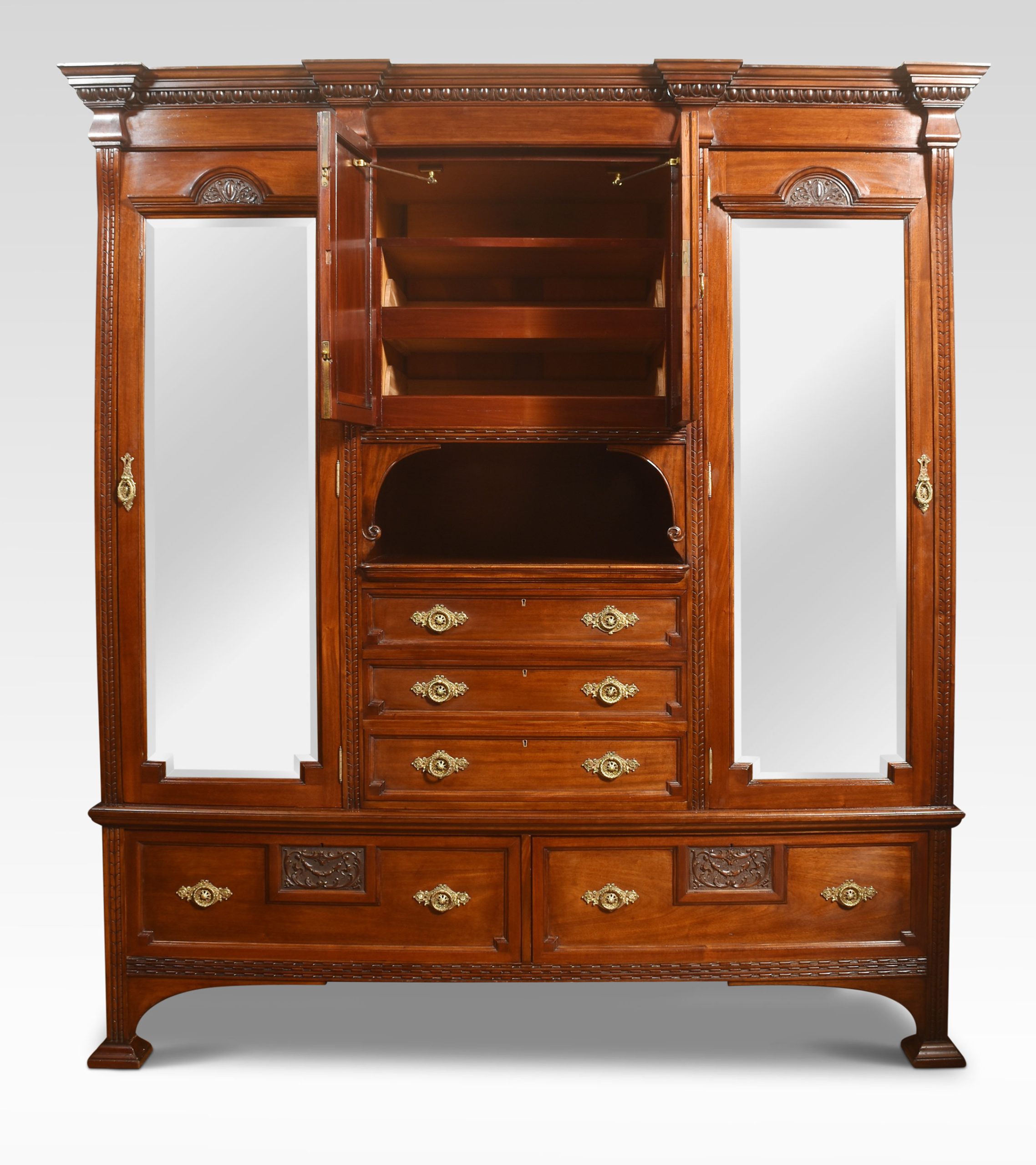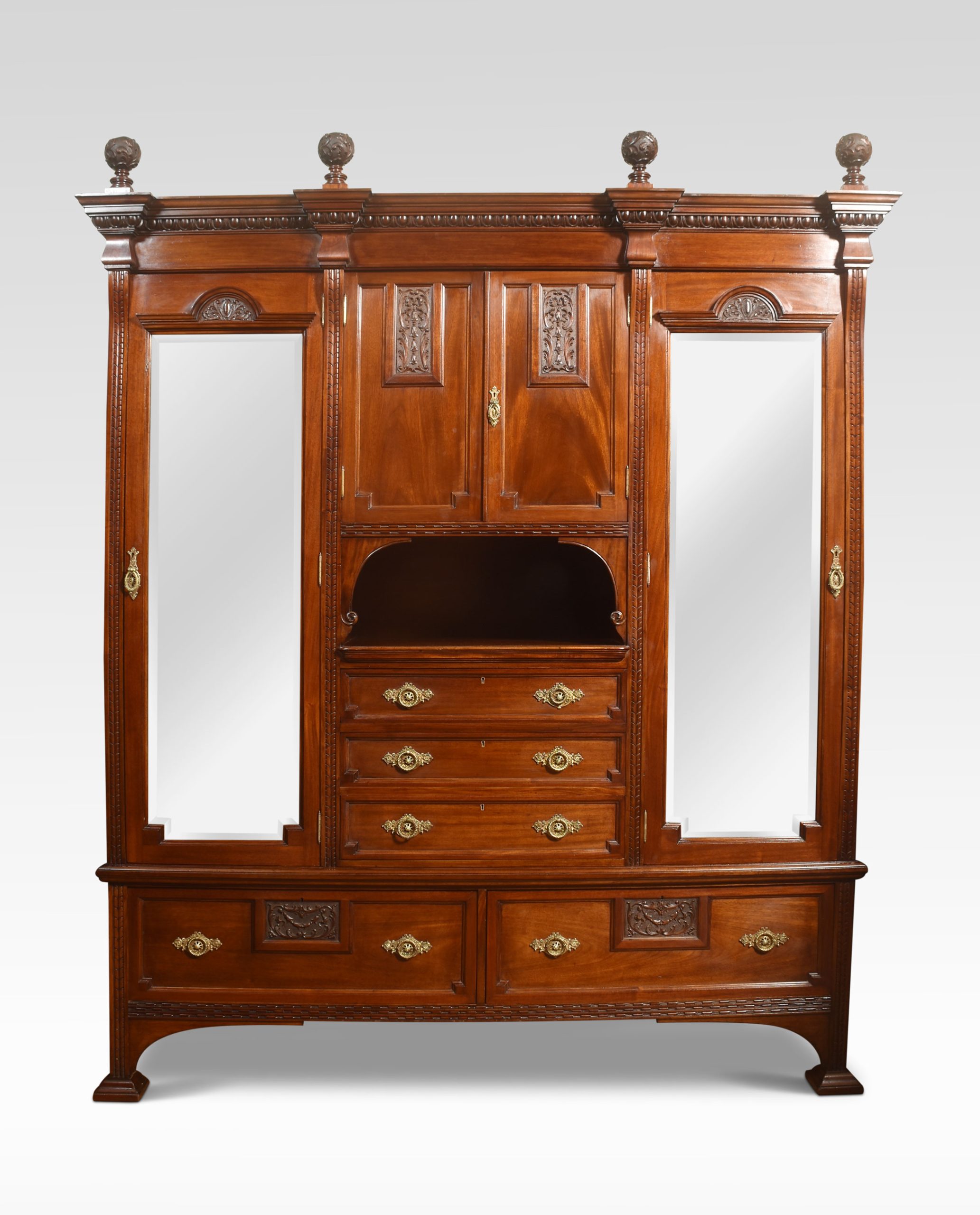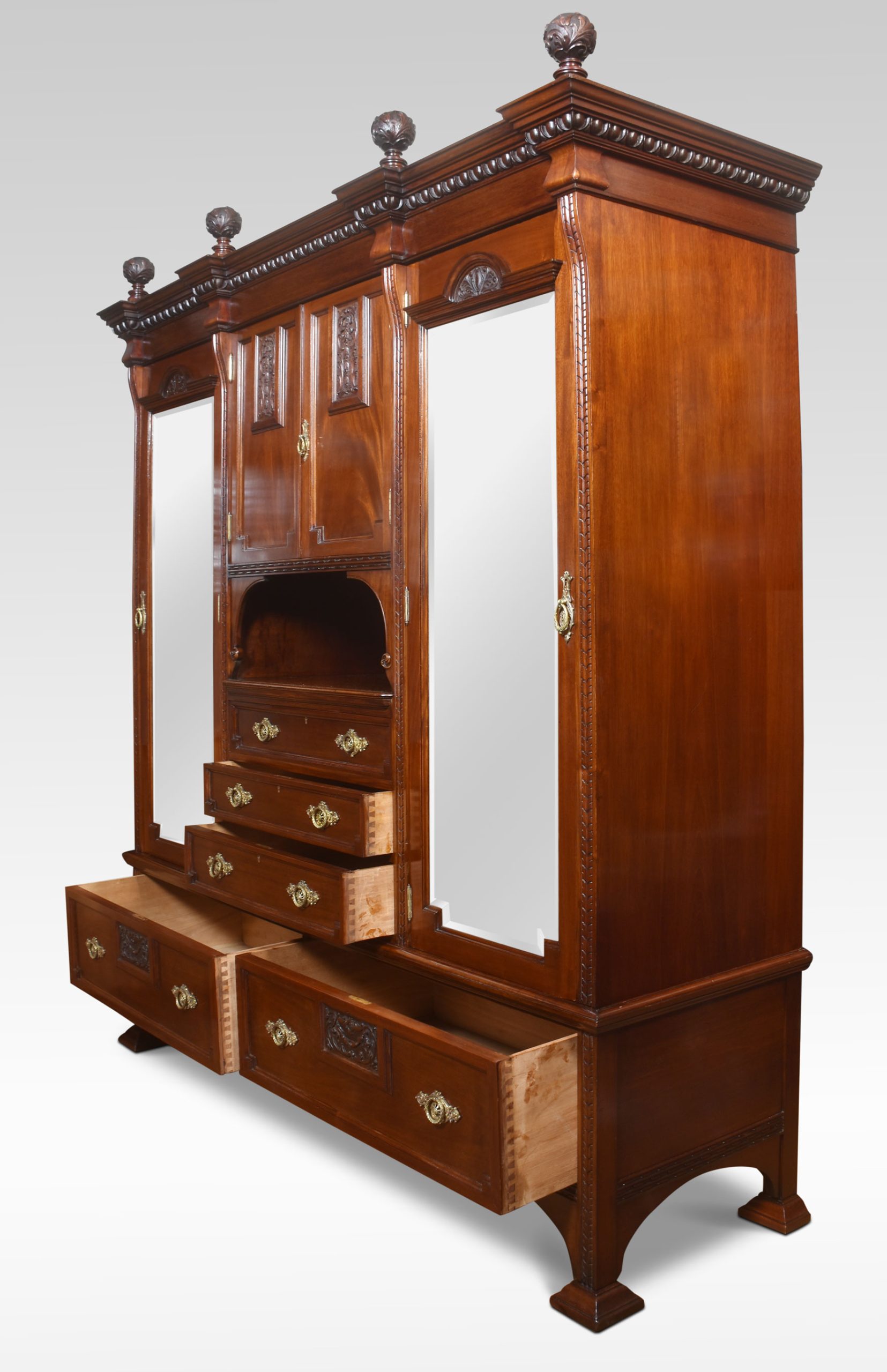 Carved mahogany compactum wardrobe having carved removable finials, above two long mirror doors flanking the centre fitted with a pair of carved panelled doors and three drawers below. To the base section fitted with two large drawers having brass handles. All raised up on square supports.