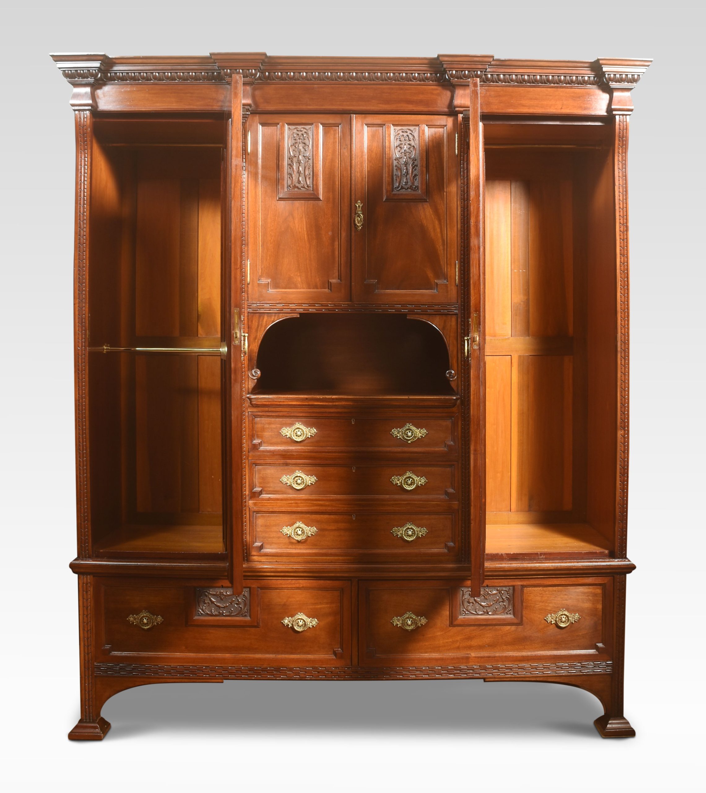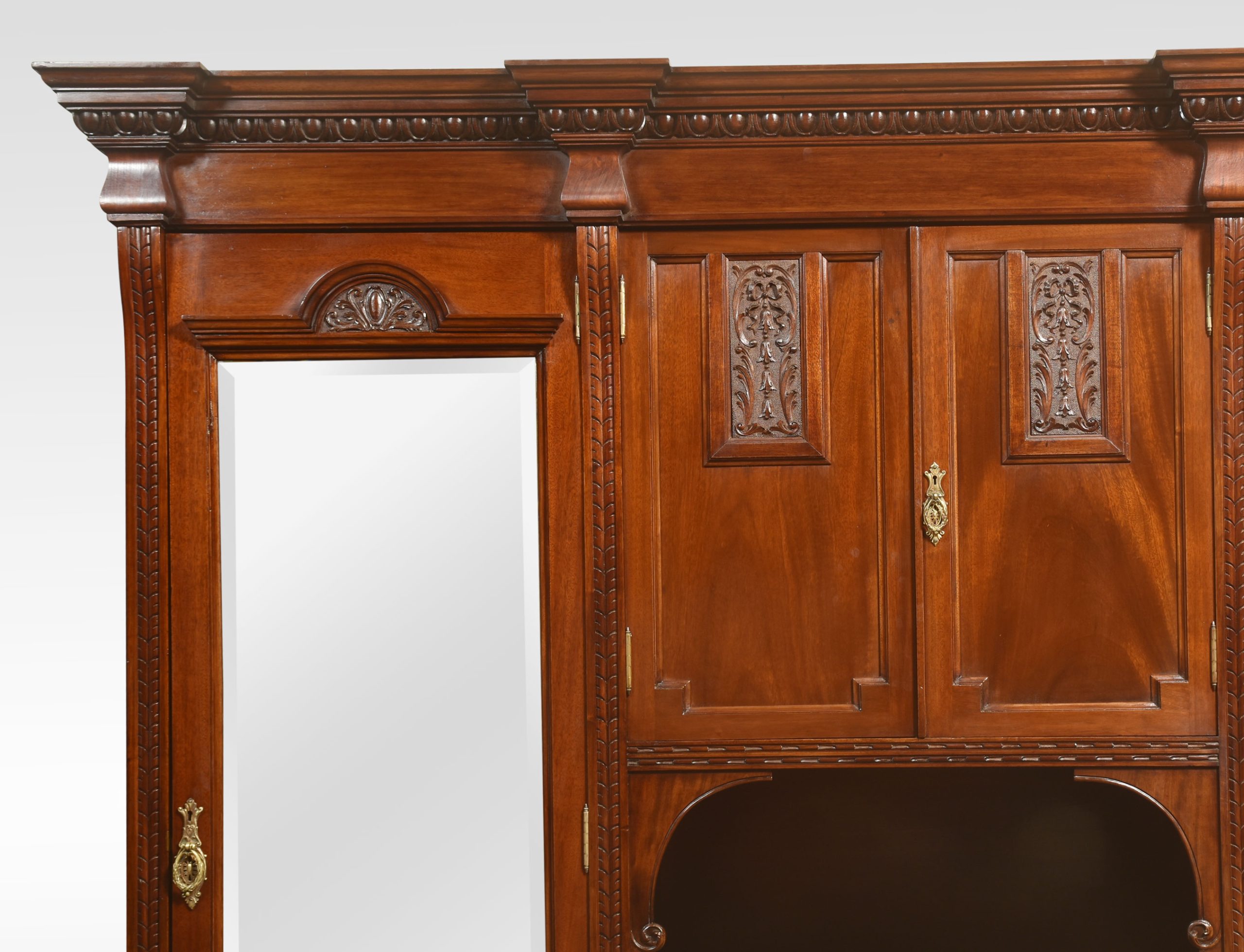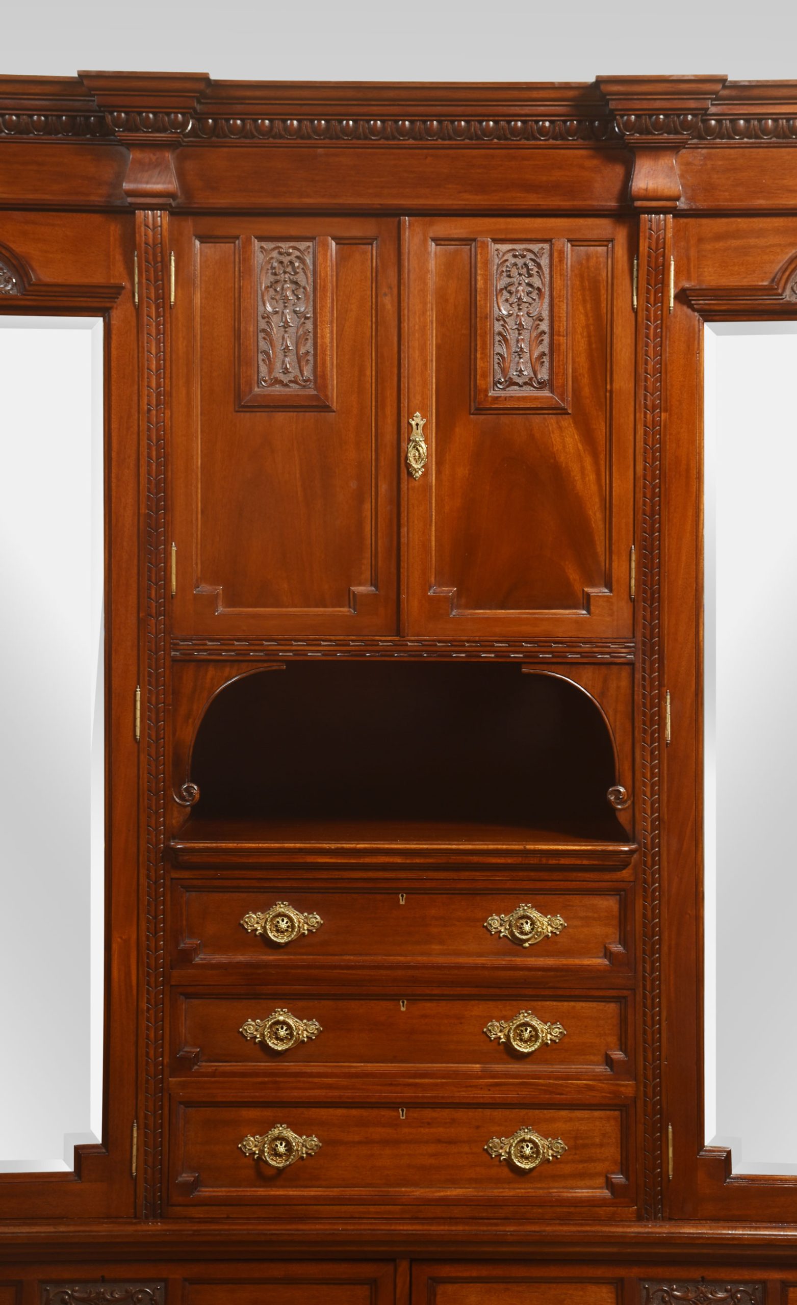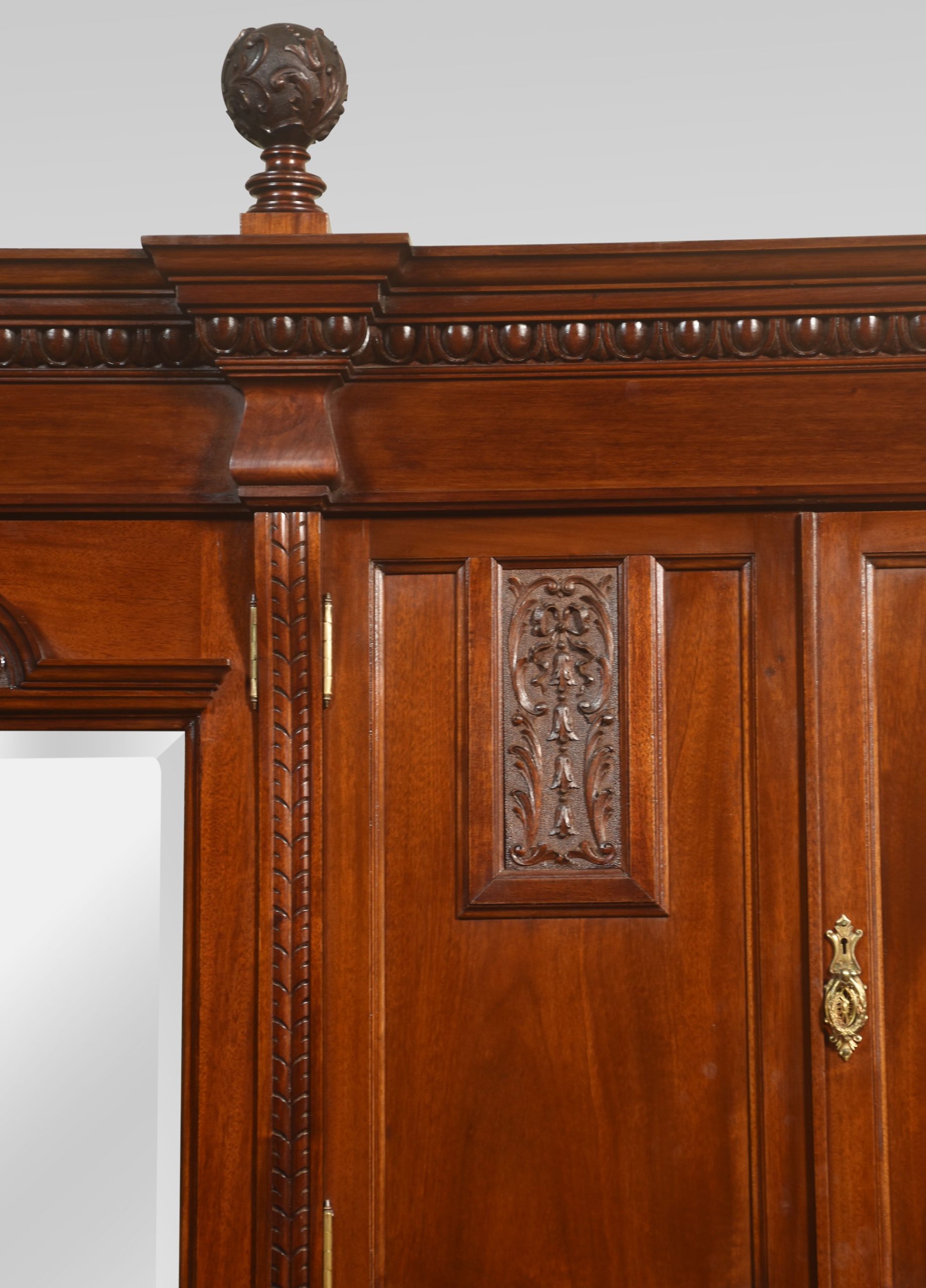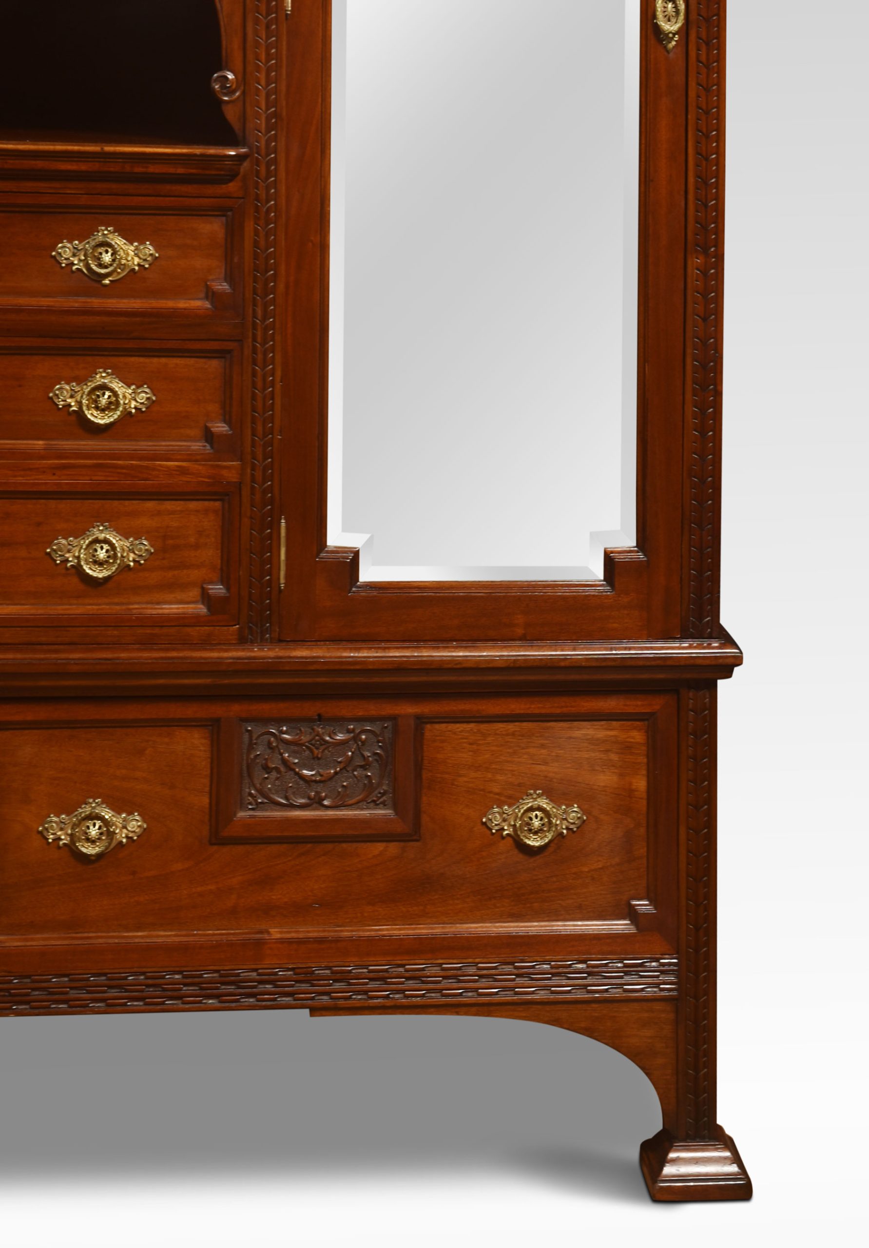 Carved mahogany compactum wardrobe having carved removable finials, above two long mirror doors flanking the centre fitted with a pair of carved panelled doors and three drawers below. To the base section fitted with two large drawers having brass handles. All raised up on square supports.